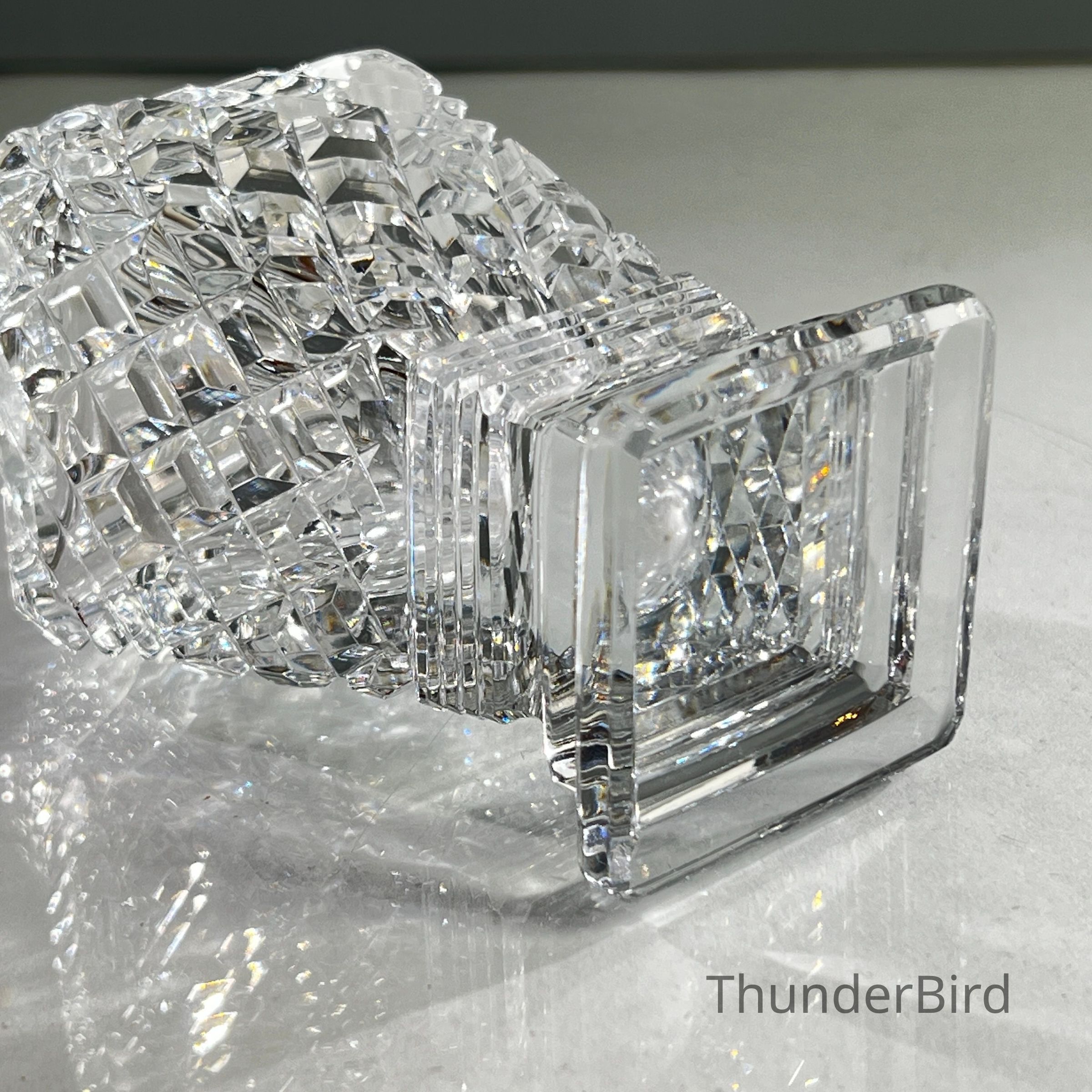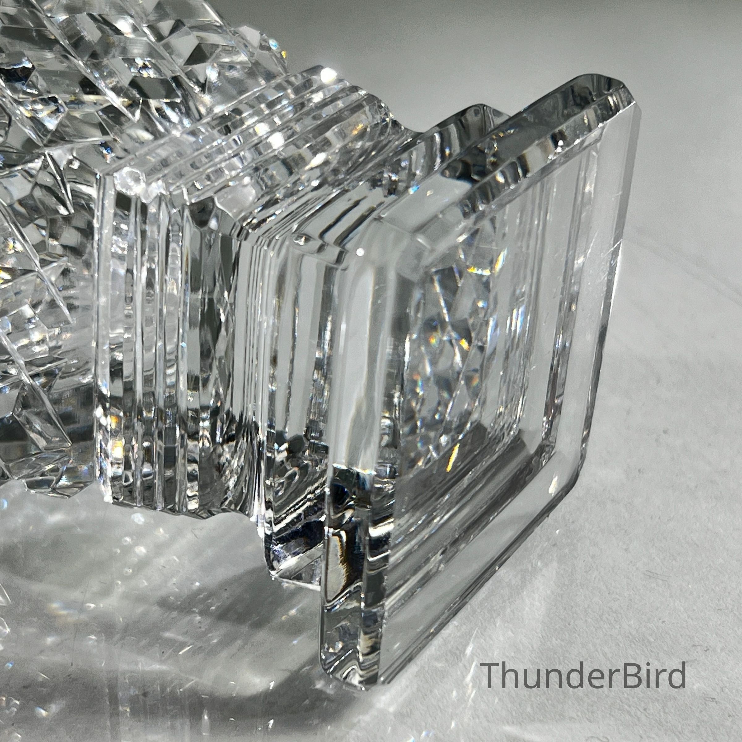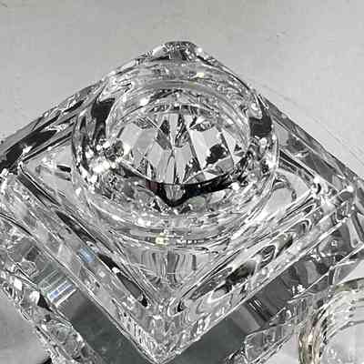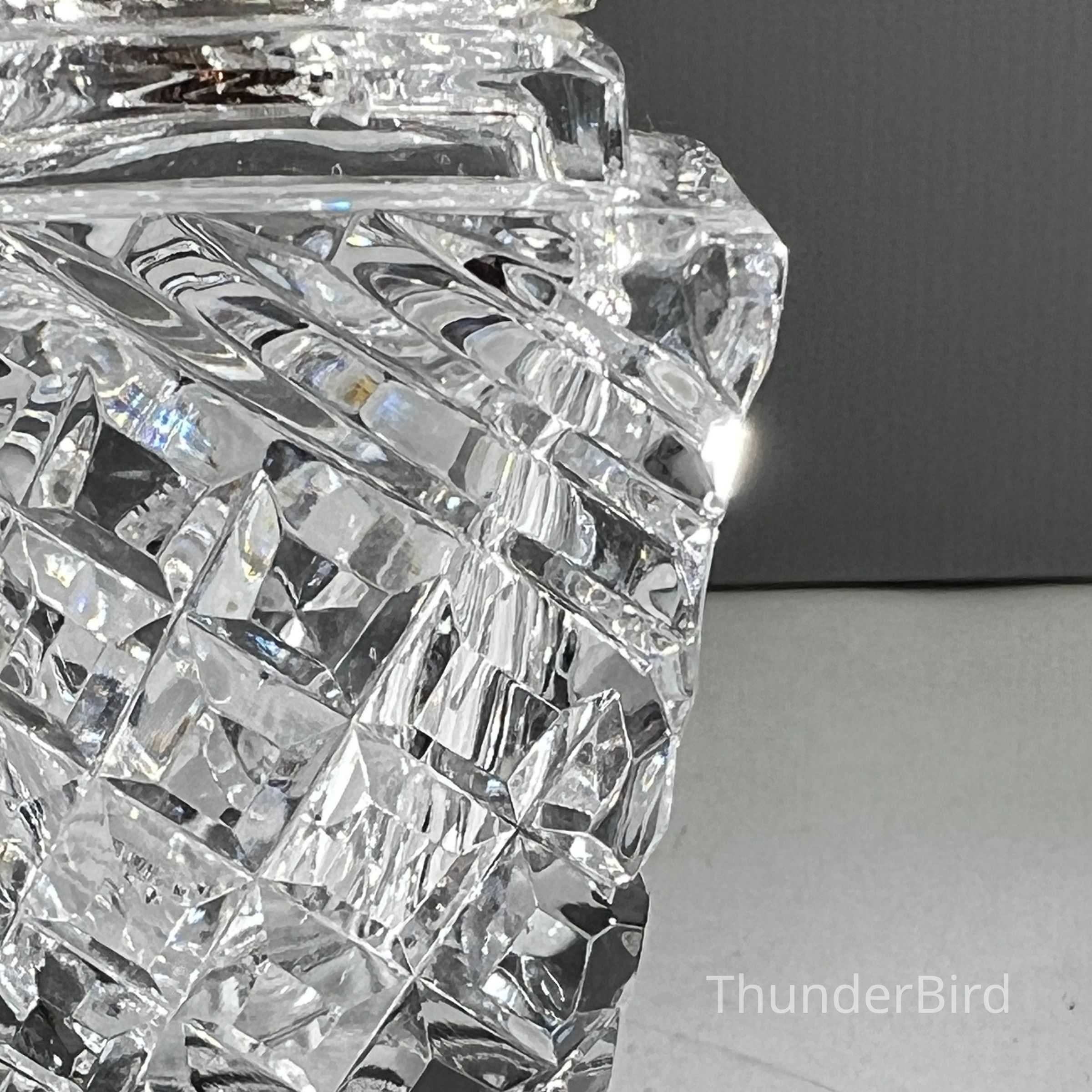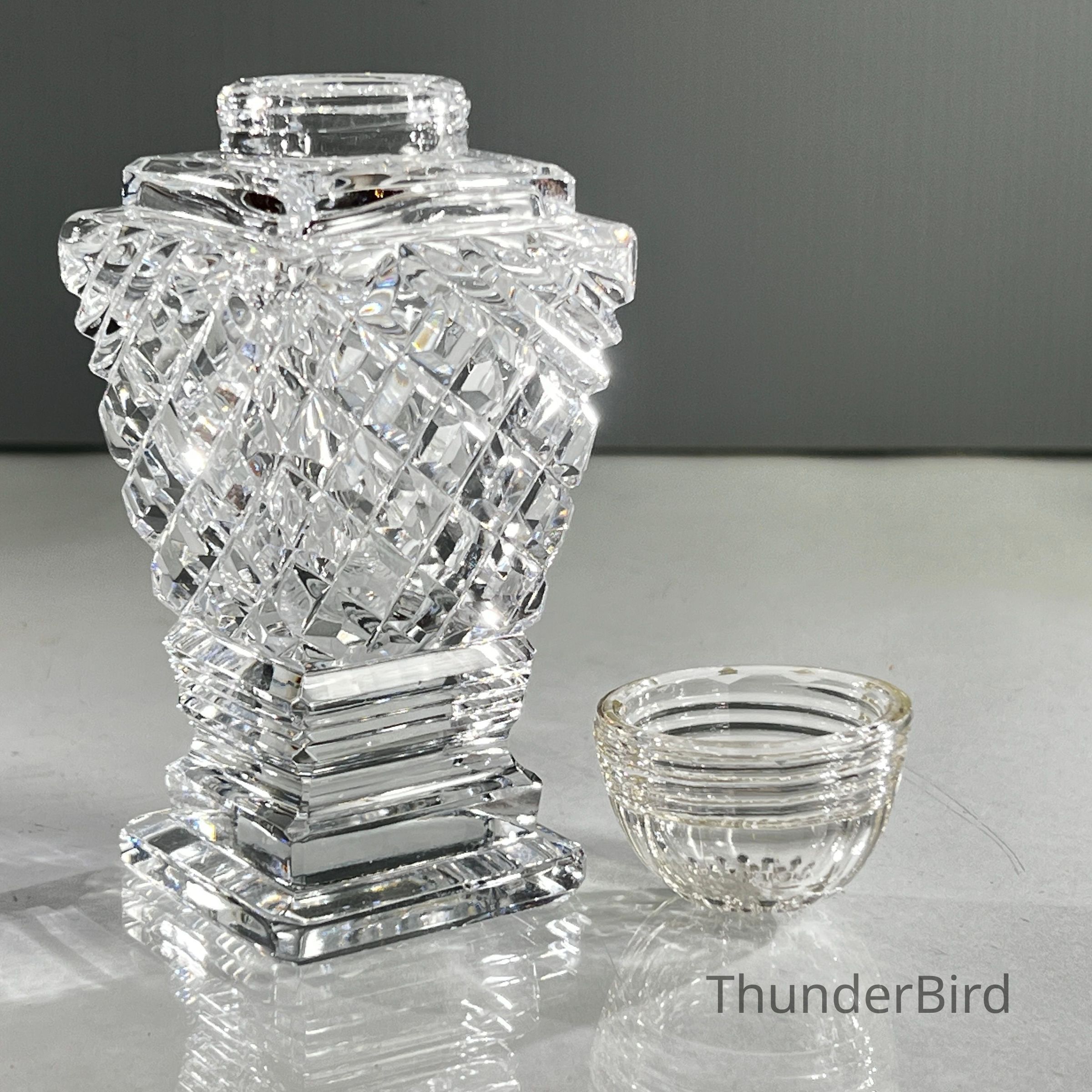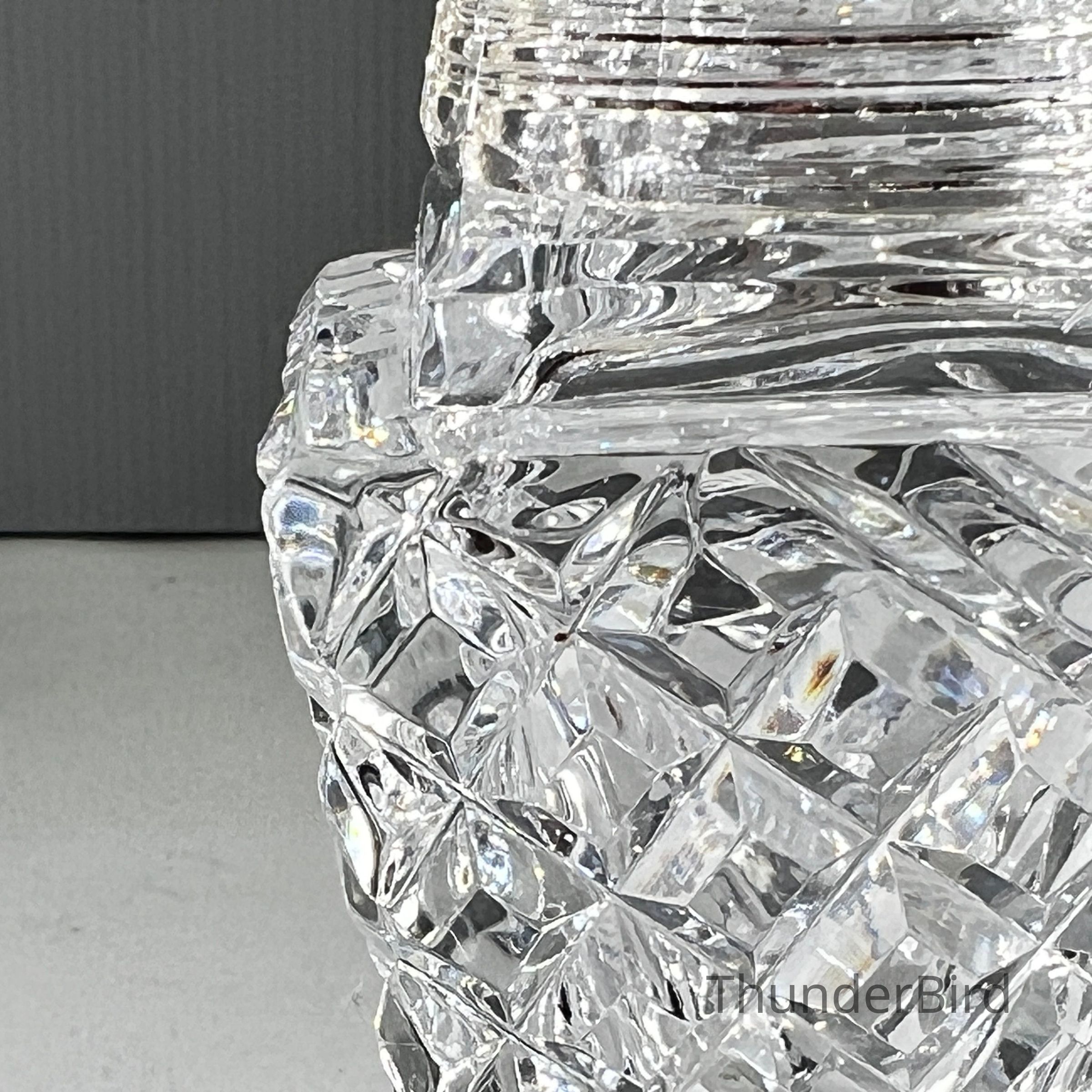 A striking Art Deco crystal muffineer featuring a stepped pedestal base, characteristic of the modernist design trends of the 1920s and 1930s. The removable domed top with concentric ring detailing reflects period craftsmanship and allows the piece to function as a sugar shaker or decorative table accessory. The clarity and weight of the crystal suggest good quality production, likely European.
