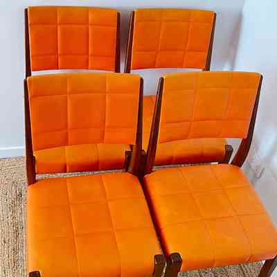 A beautifully presented set of four authentic mid century Fler 64 dining chairs (ref Webbs auctions), an iconic model produced by Fler Furniture in the late 1960s to early 1970s. These feature sculpted teak frames with the distinctive square-panelled seat and back, a hallmark of the Fler 64 design. The vivid orange vinyl upholstery is original in style and highly sought after, offering a bold and classic mid century aesthetic. Fler chairs are known for their comfort, craftsmanship and elegant form, making them ideal for both period interiors and contemporary spaces seeking a standout retro accent.