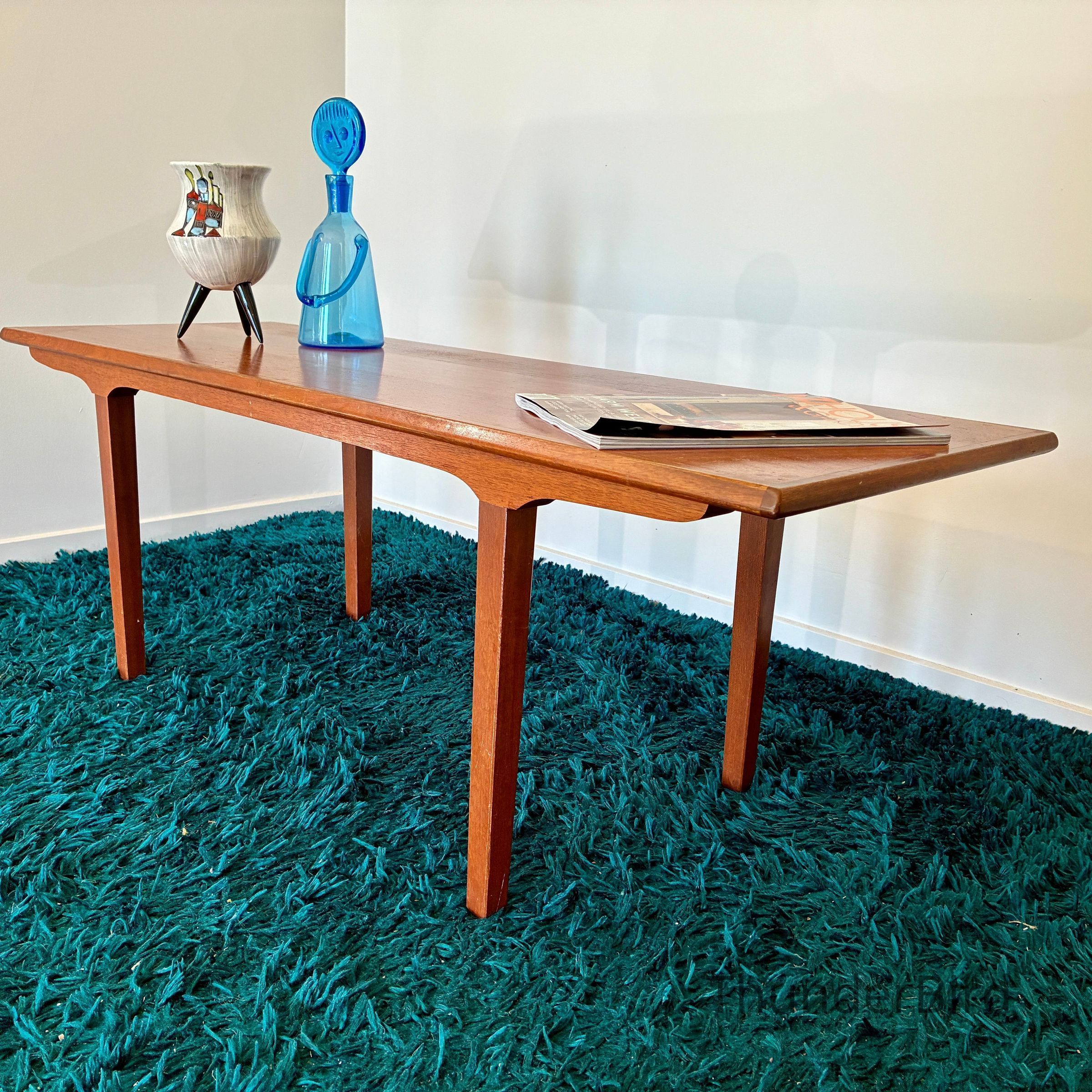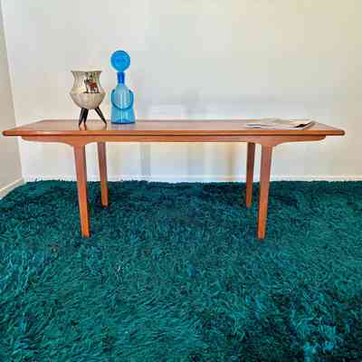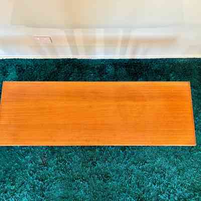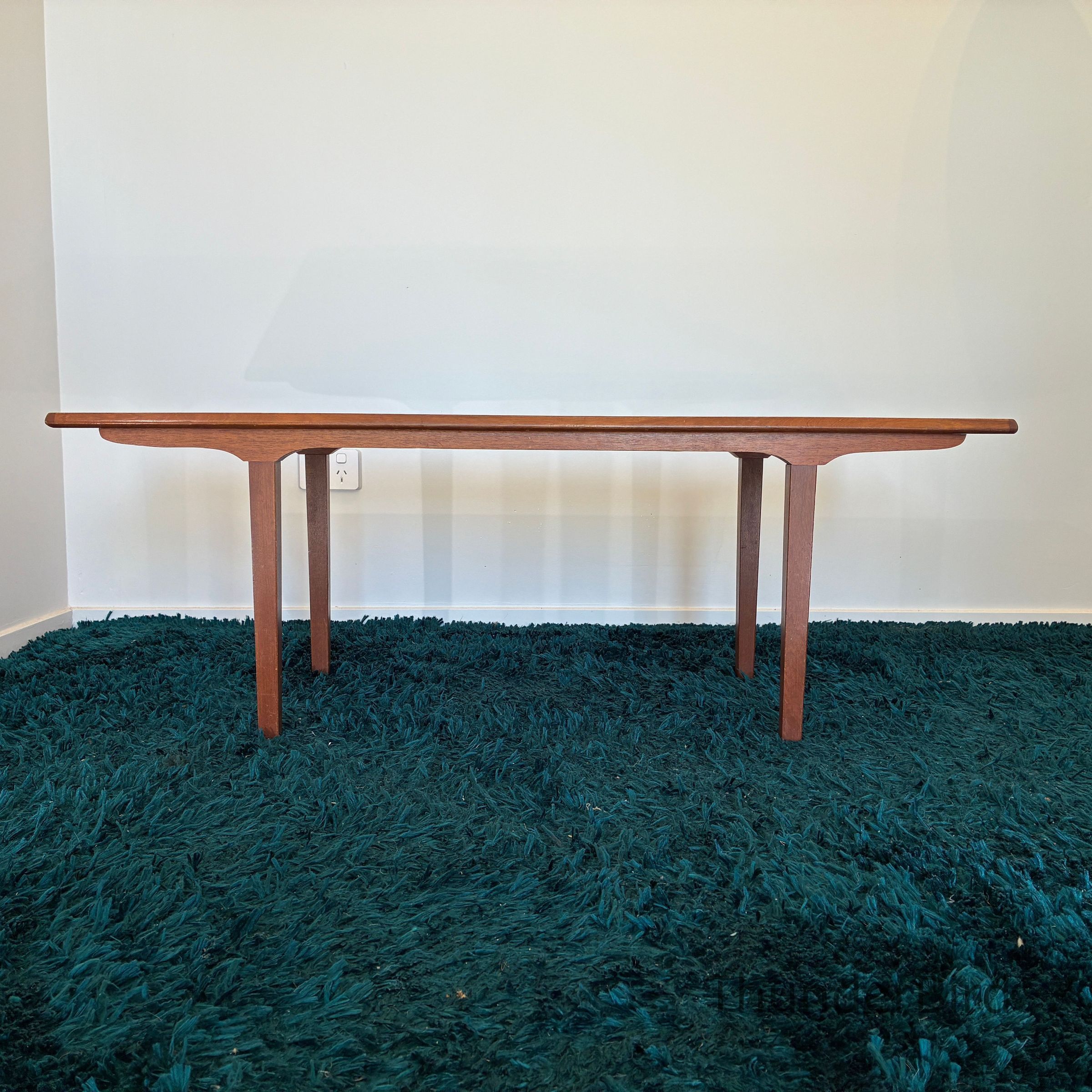 This elegant piece features a mahogany top with softly rounded edges, sculpted under-frame details, and tapered legs—exemplifying the clean, functional aesthetic of mid-century design. Its narrow, elongated proportions make it ideal for use in front of a sofa or as a statement bench-style surface in interiors.