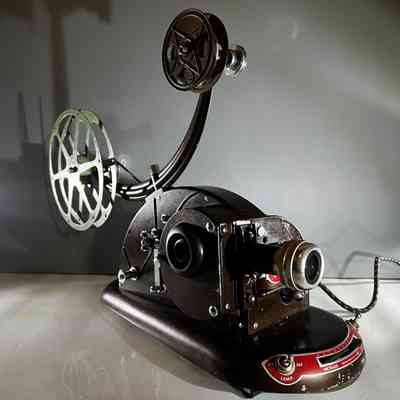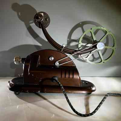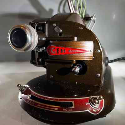 A rare vintage 16mm Pathescope Gem projector manufactured in England by Pathescope Ltd during the late 1940s to 1950s. Designed as a compact home-cinema projector, the Gem was produced in several small-gauge formats, this model says on the plate 16mm. Its die-cast metal casing, curved silhouette and streamlined mid-century styling reflect the post-war push for modern domestic technology. Introduced in 1948 after pre-war development was delayed, the Gem became a popular silent projector for home movie viewing and is now sought after as a decorative historical piece. This example showcases the iconic “atomic-age” design that characterised Pathescope’s post-war products and remains an appealing collectible for film enthusiasts and vintage décor settings.