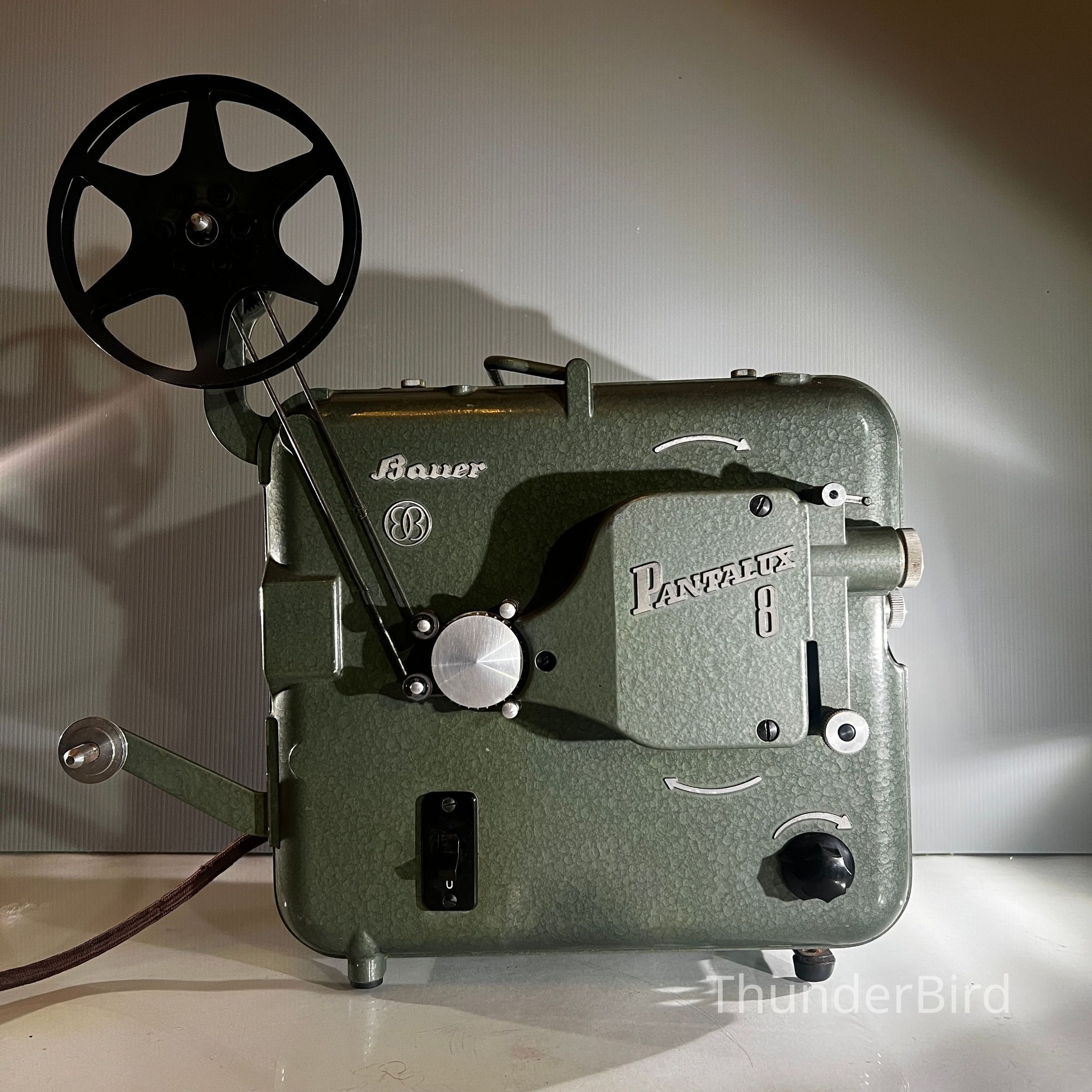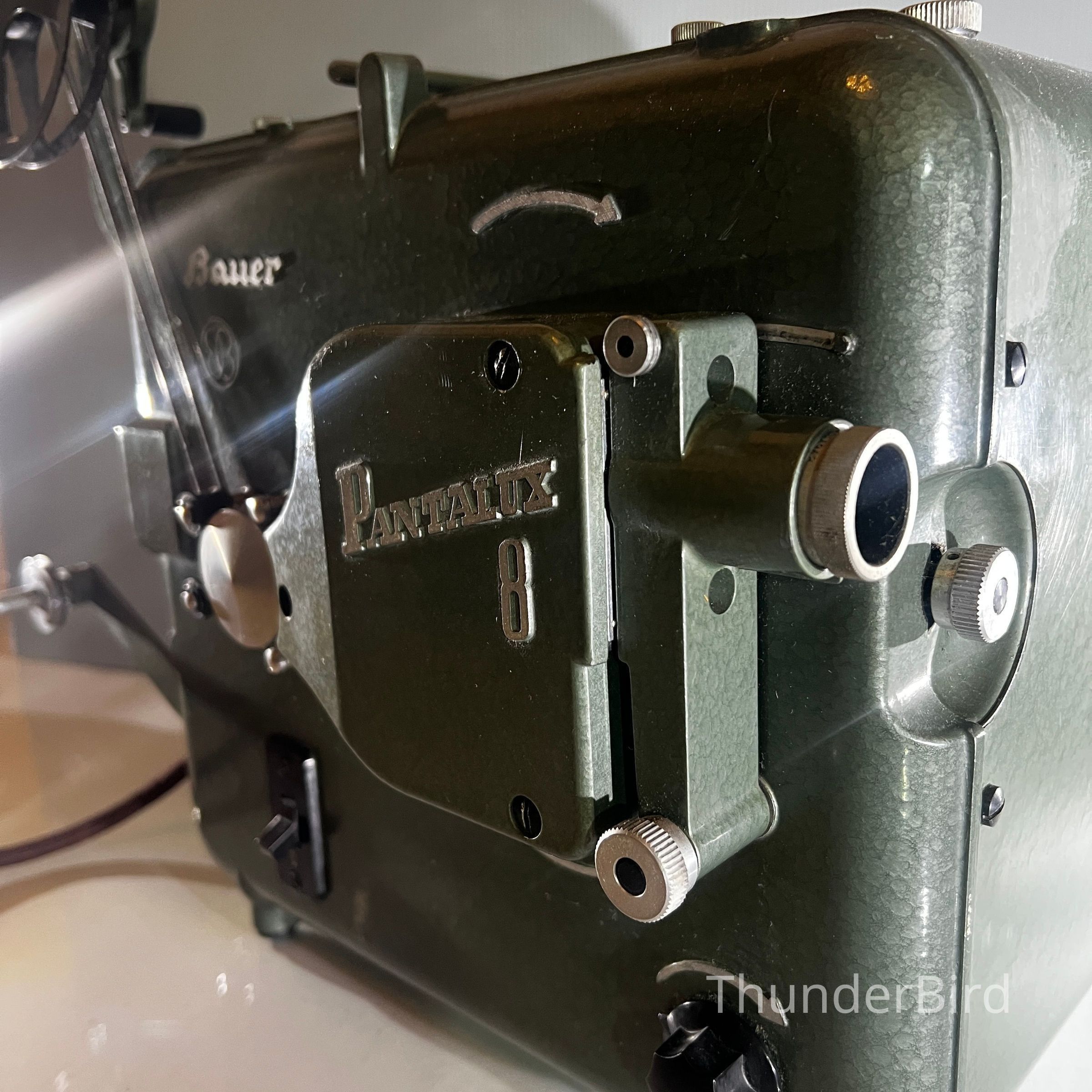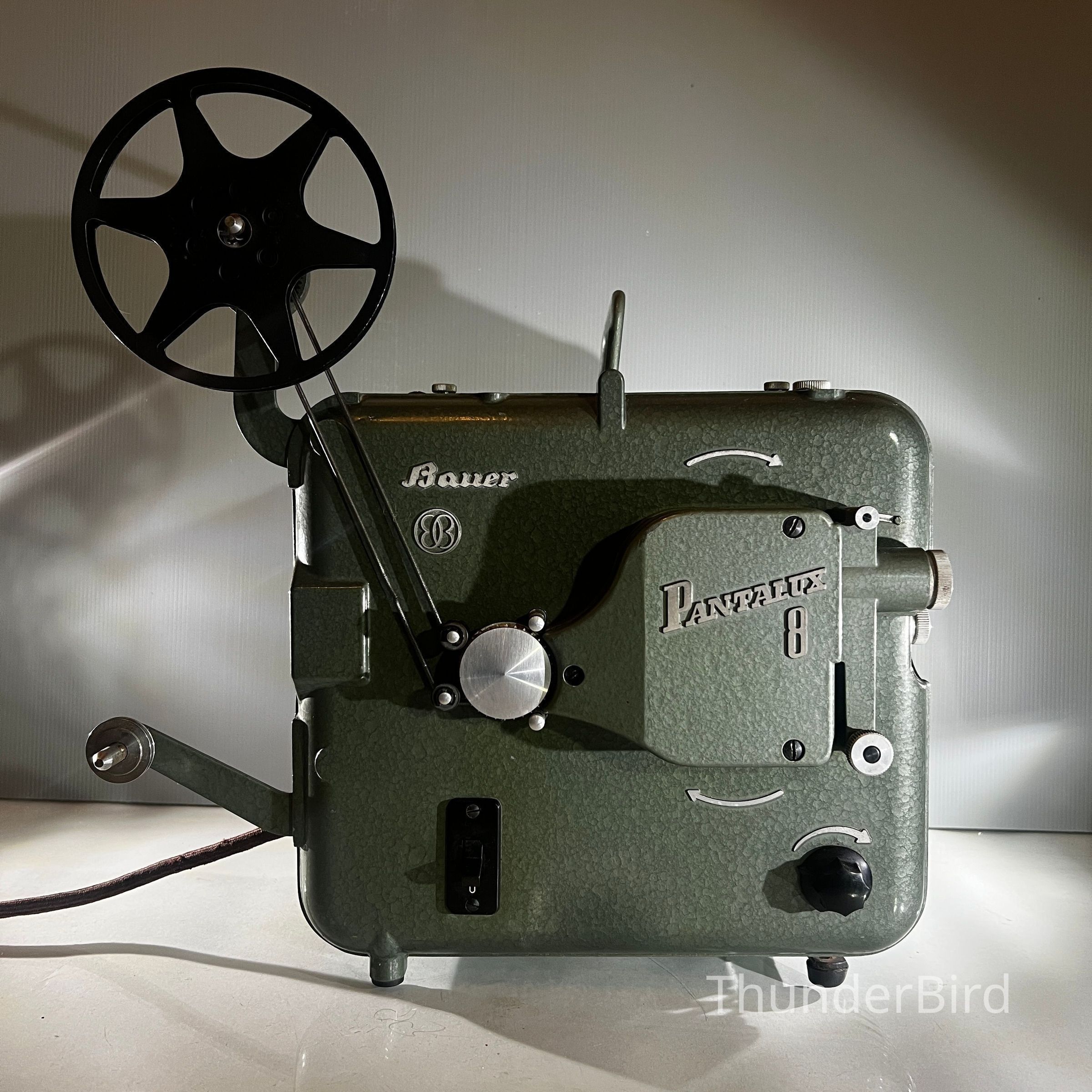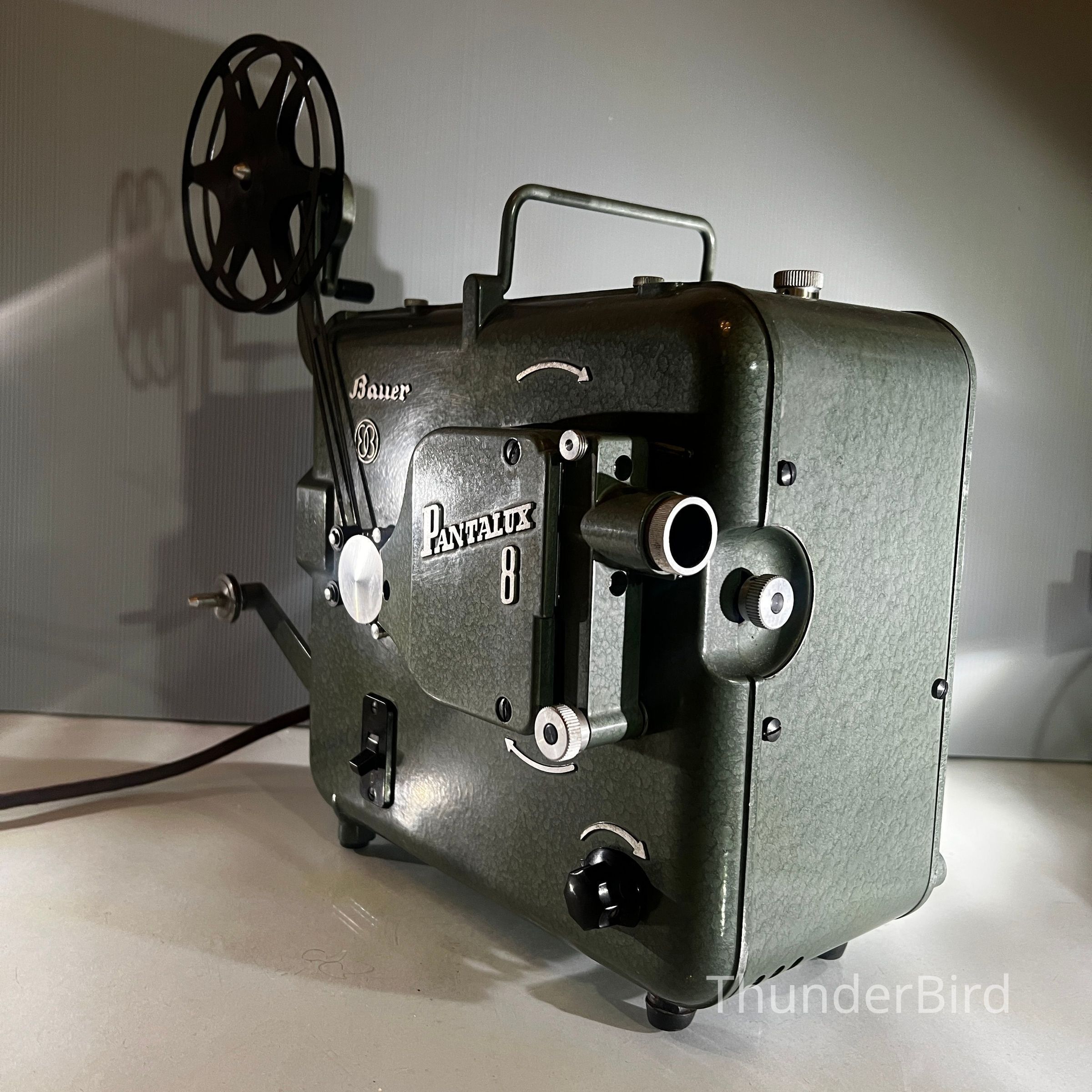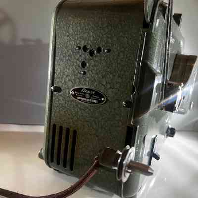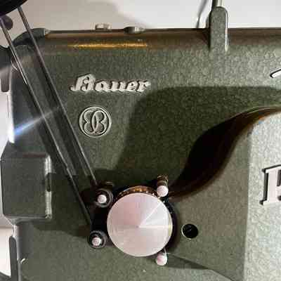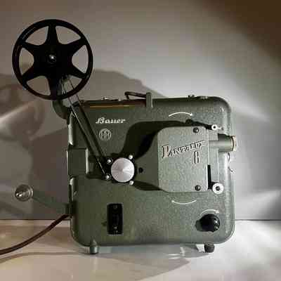 A mid century Bauer Pantalux 8 projector manufactured in Stuttgart Untertürkheim, Germany by Eugen Bauer G.m.b.H during the early to mid 1950s. Built for Standard 8 mm silent film, the Pantalux series was known for its precision German engineering, heavy cast metal construction and hammered enamel finish. This example features the classic textured green housing, side mounted reel arm and the distinctive Bauer control layout that defined their post war projectors. With its sculptural industrial form, exposed film path and robust build quality, it makes an exceptional vintage display piece and is ideal for décor, film themed interiors or collectors of historical technology.
