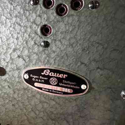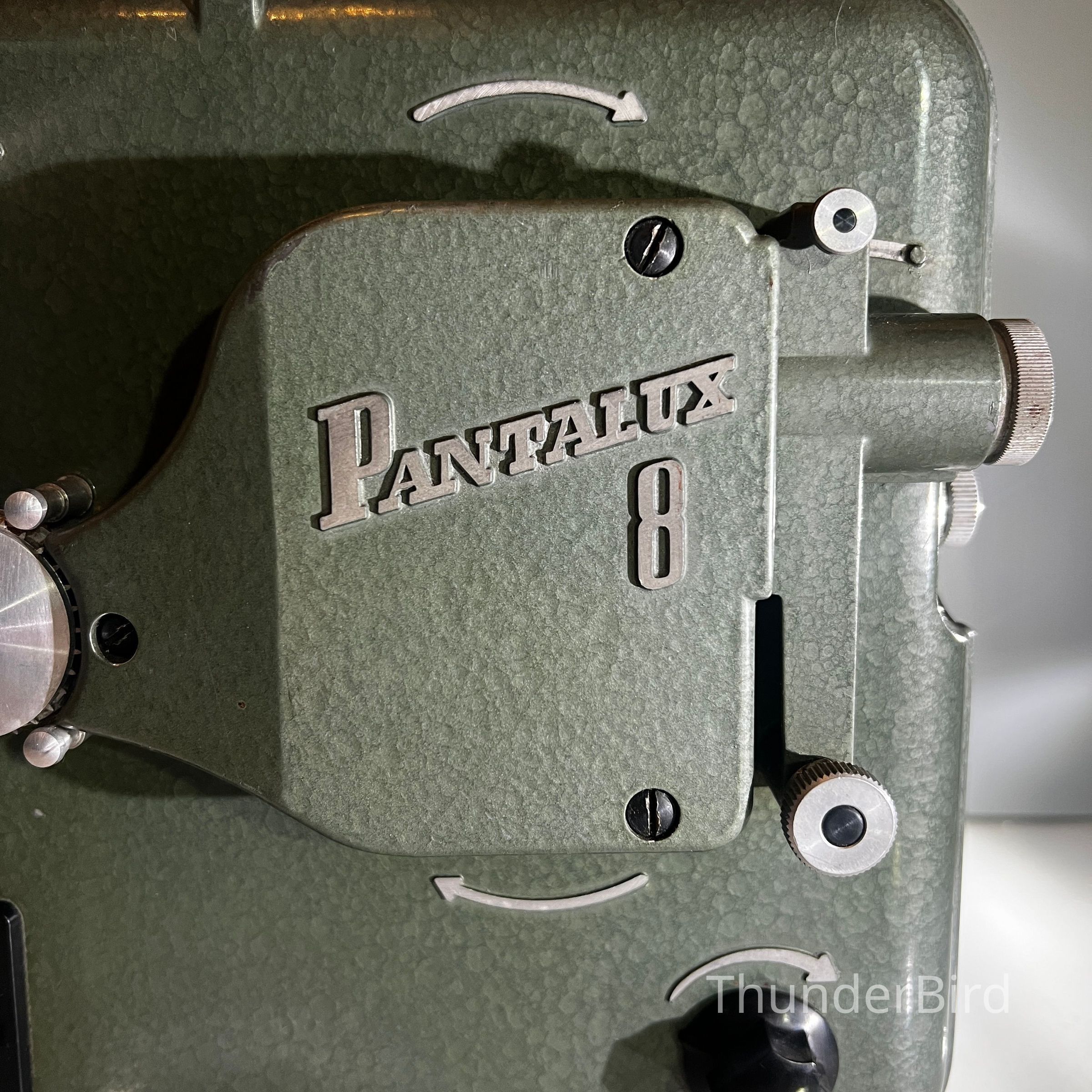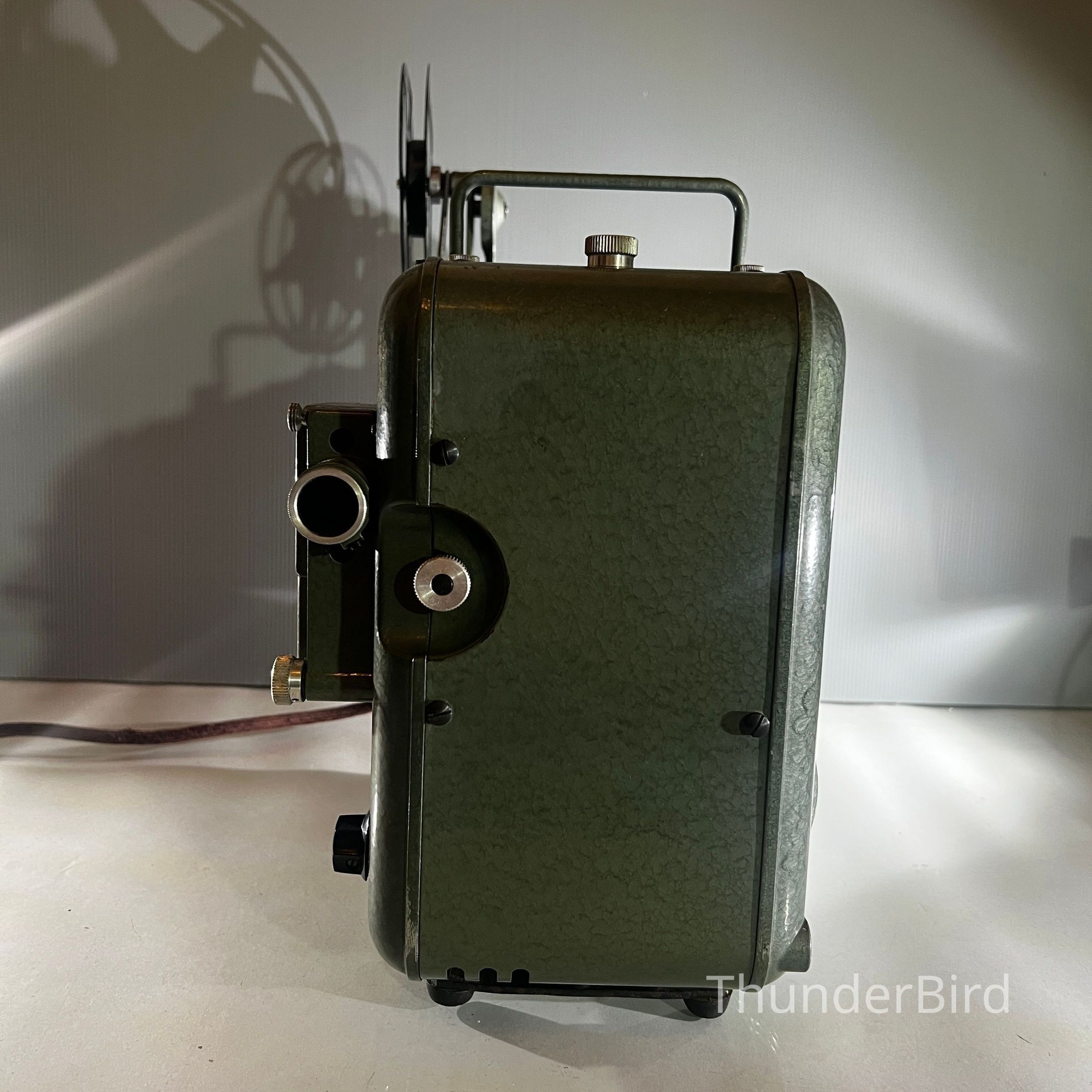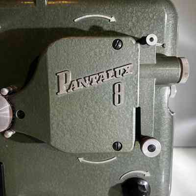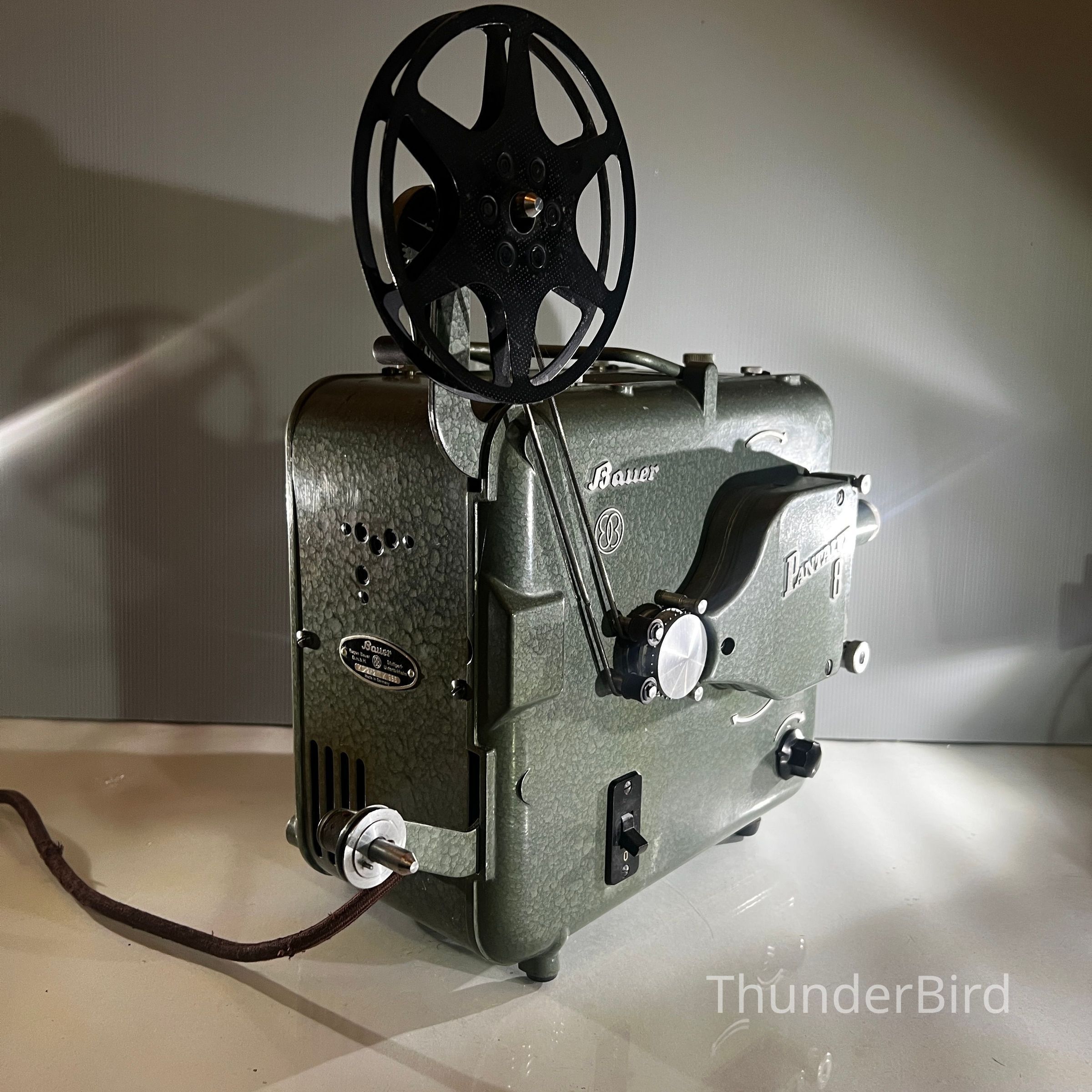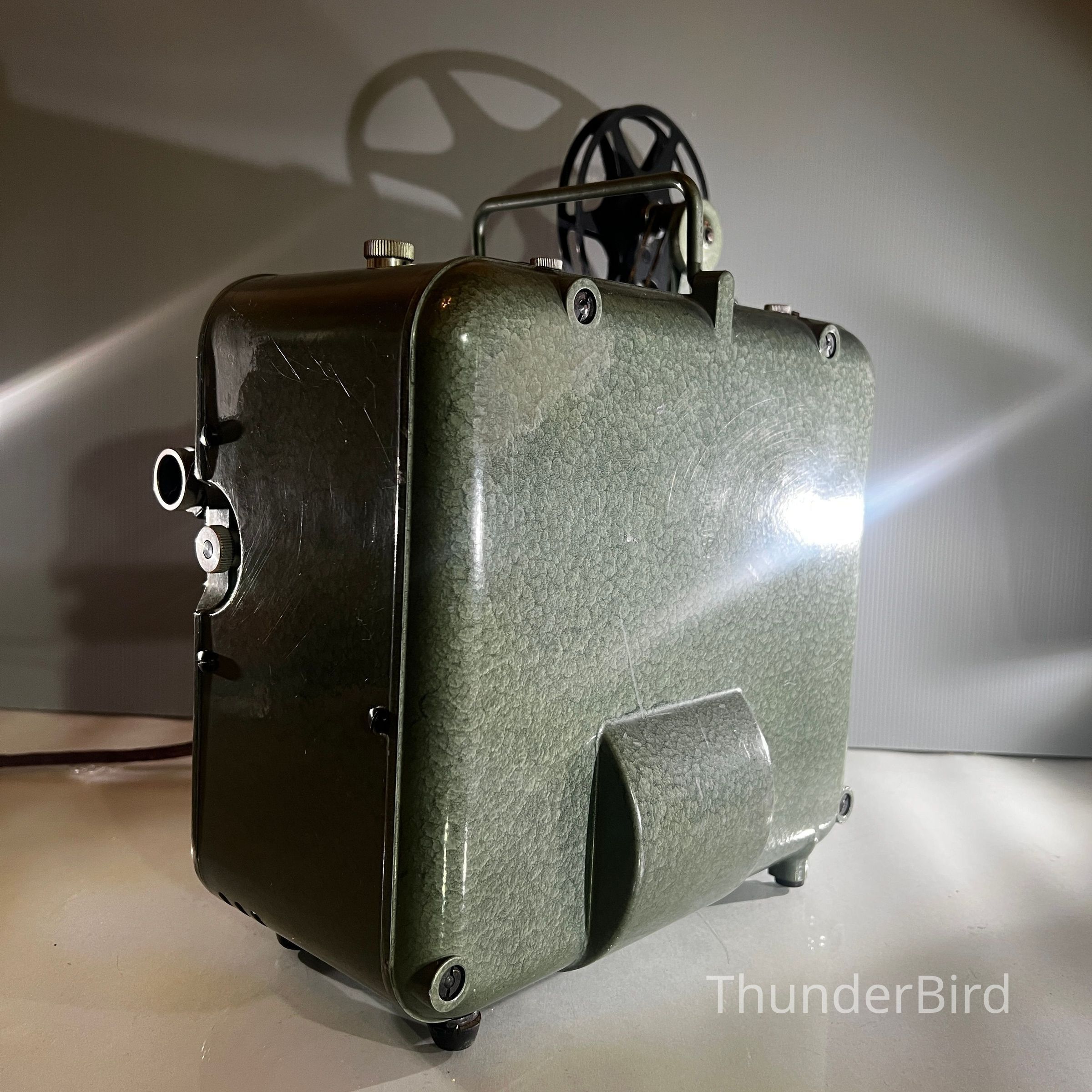 A mid century Bauer Pantalux 8 projector manufactured in Stuttgart Untertürkheim, Germany by Eugen Bauer G.m.b.H during the early to mid 1950s. Built for Standard 8 mm silent film, the Pantalux series was known for its precision German engineering, heavy cast metal construction and hammered enamel finish. This example features the classic textured green housing, side mounted reel arm and the distinctive Bauer control layout that defined their post war projectors. With its sculptural industrial form, exposed film path and robust build quality, it makes an exceptional vintage display piece and is ideal for décor, film themed interiors or collectors of historical technology.