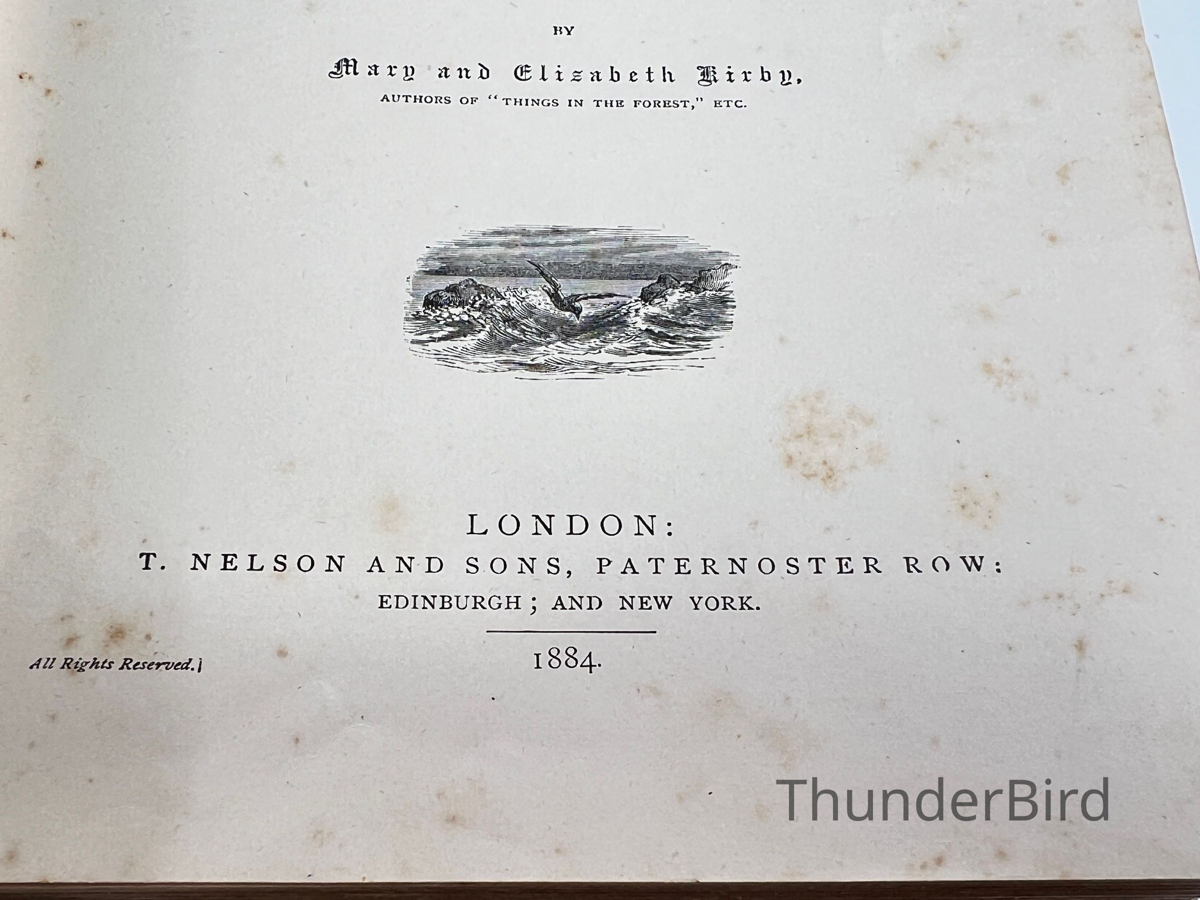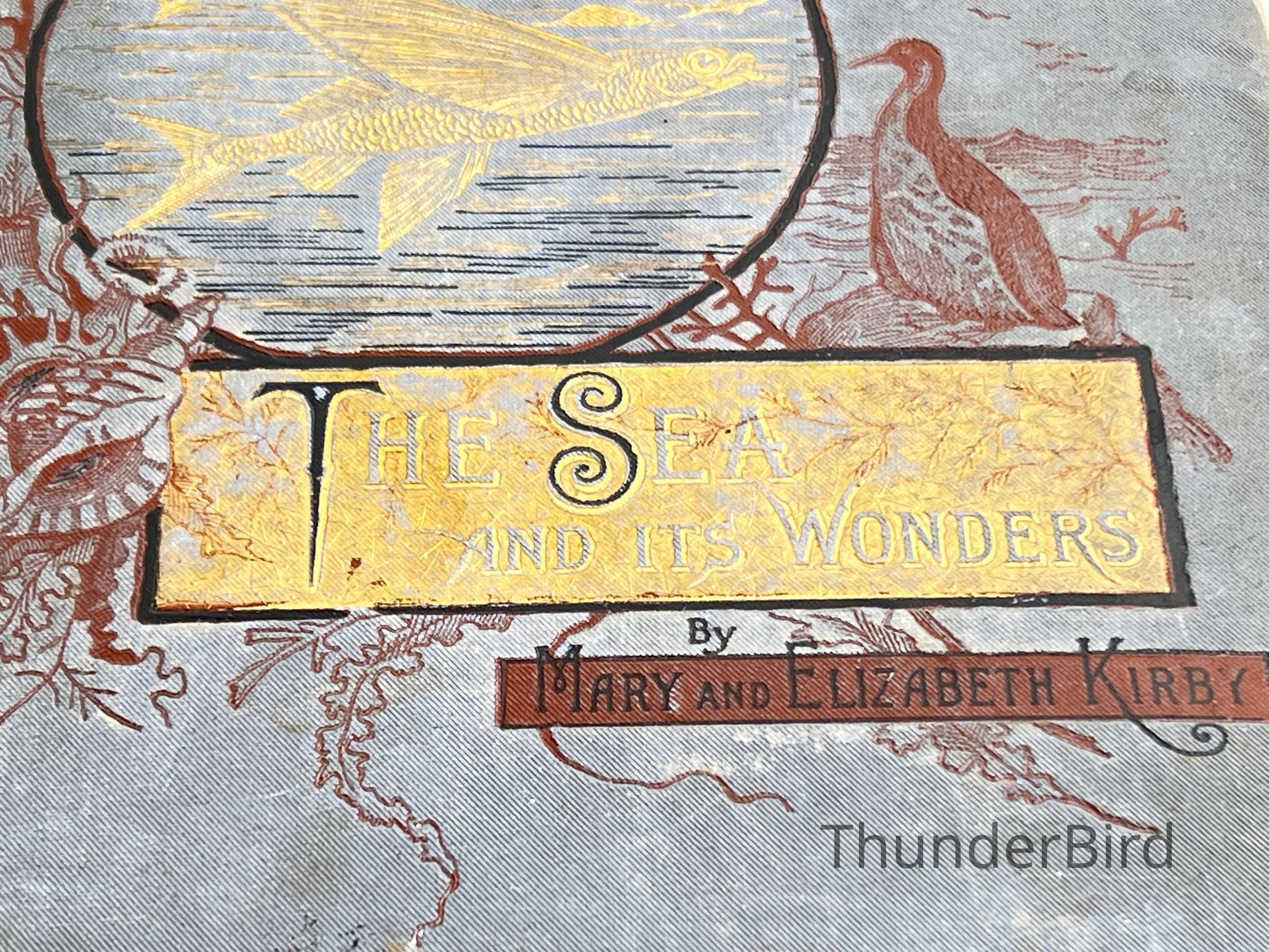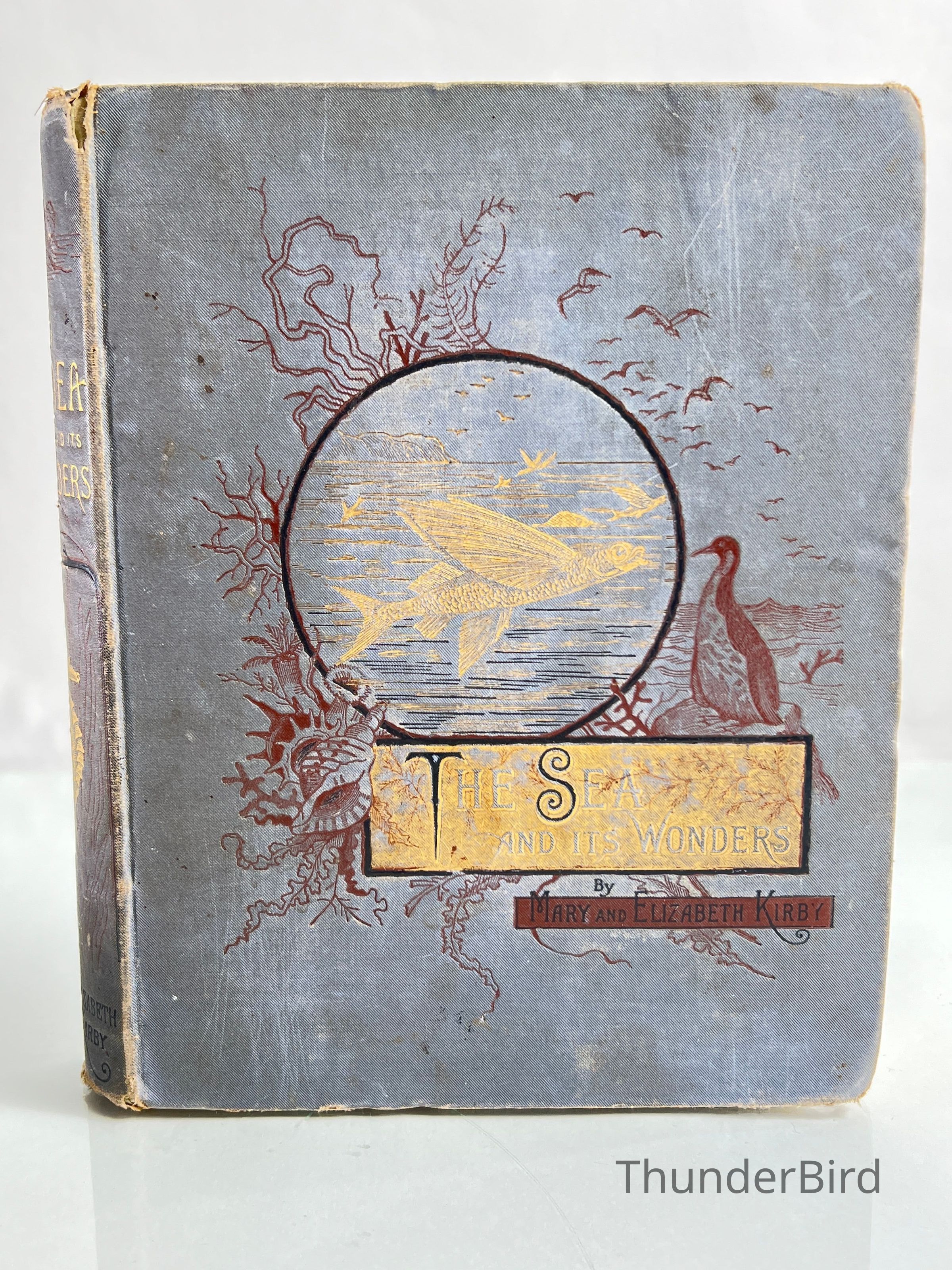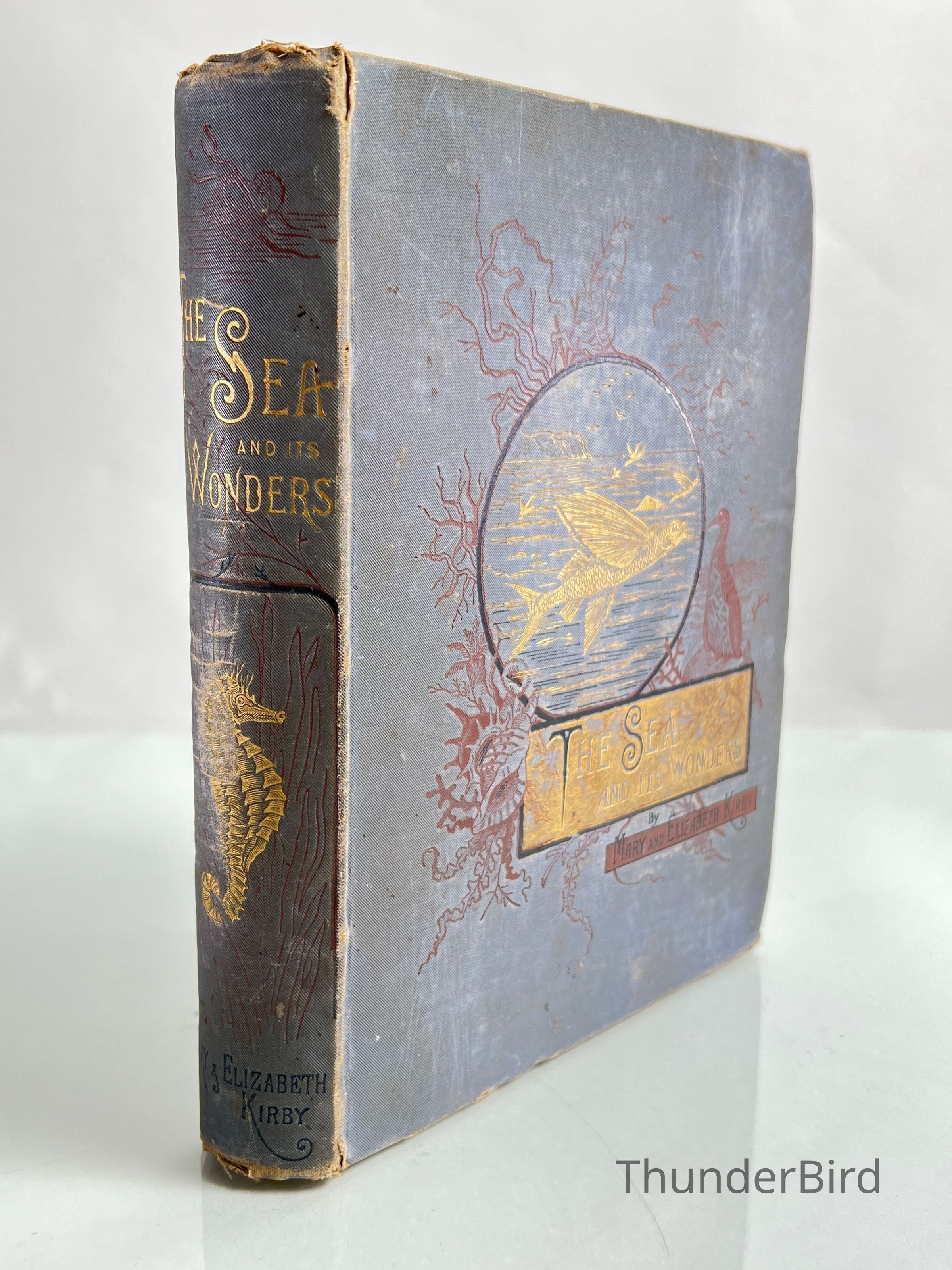 An original 1884 edition of The Sea and Its Wonders by Mary and Elizabeth Kirby, published by T. Nelson and Sons, London. This Victorian natural history volume was intended to inspire young readers with scientific understanding and appreciation of marine life. The book features remarkable engraved illustrations, including sea creatures such as argonauts, flying fish, and seabirds. The decorative cloth binding is embellished with gilt and printed marine motifs, including a flying fish and coral, typical of the period's aesthetic. A compelling companion to the Kirbys’ other notable educational titles.