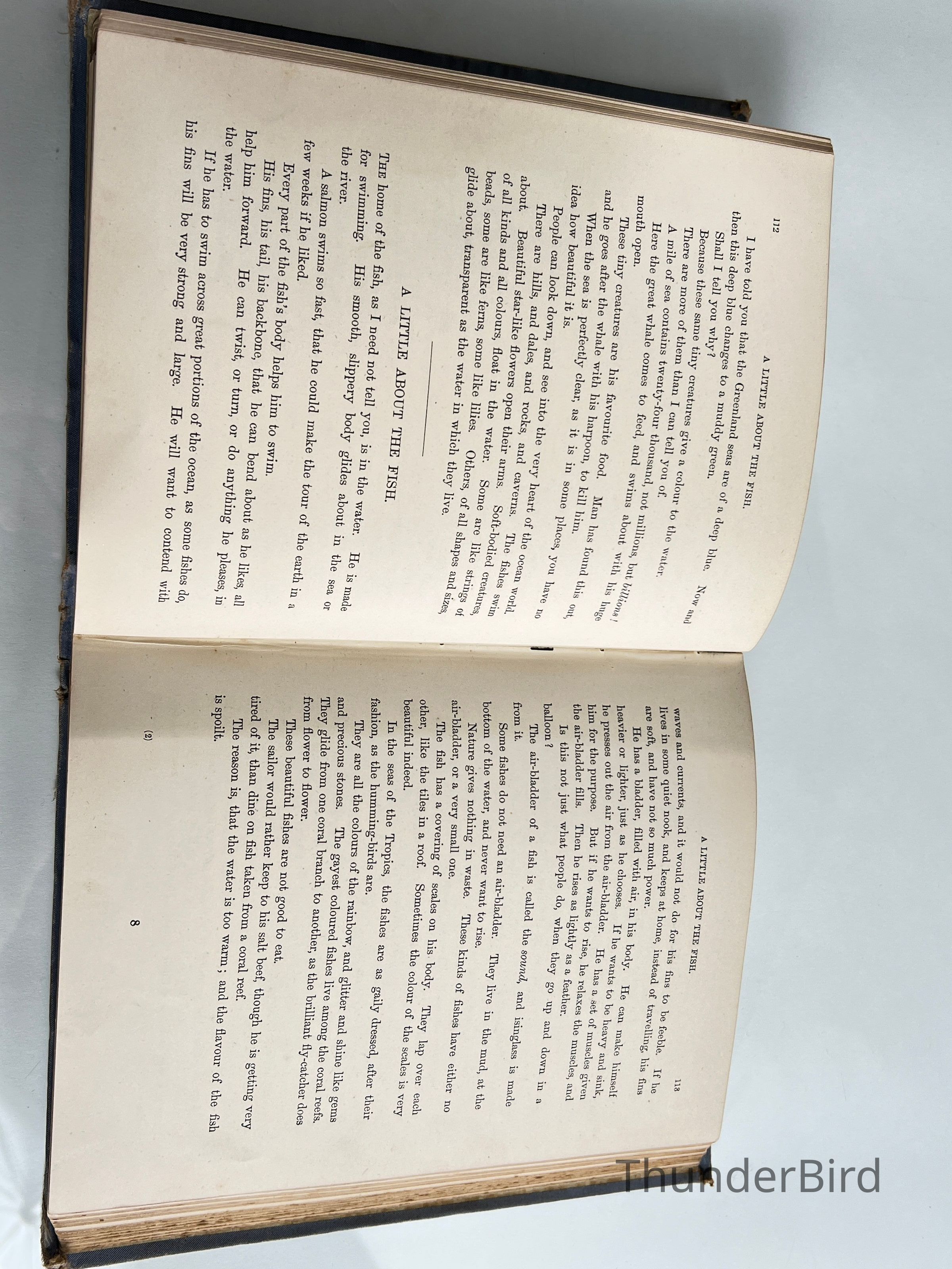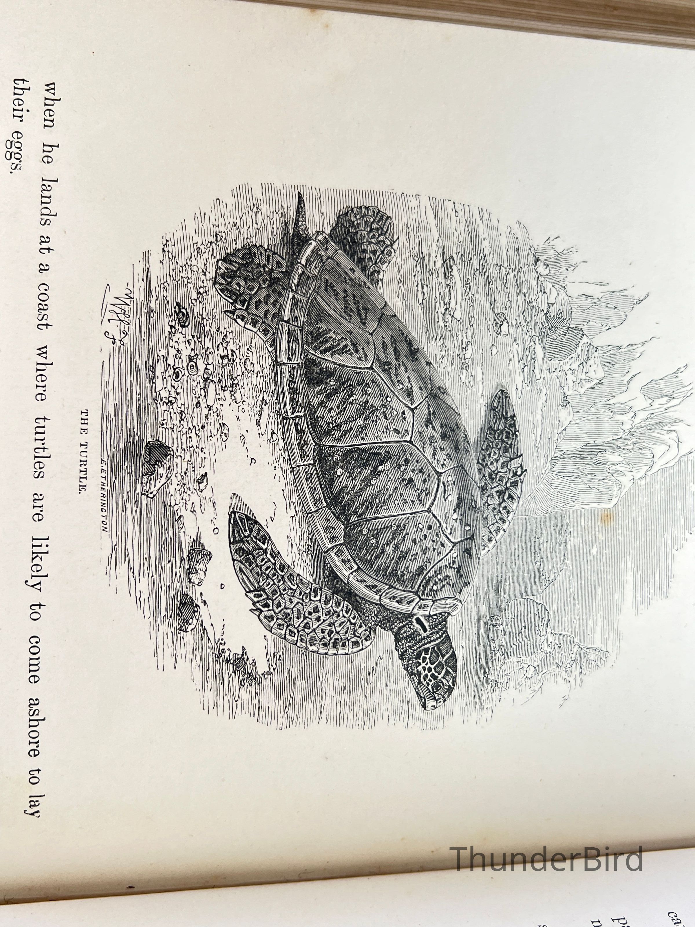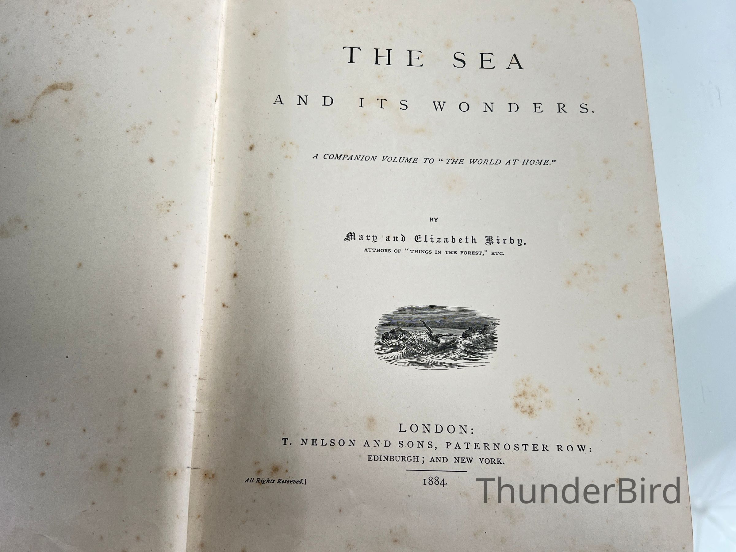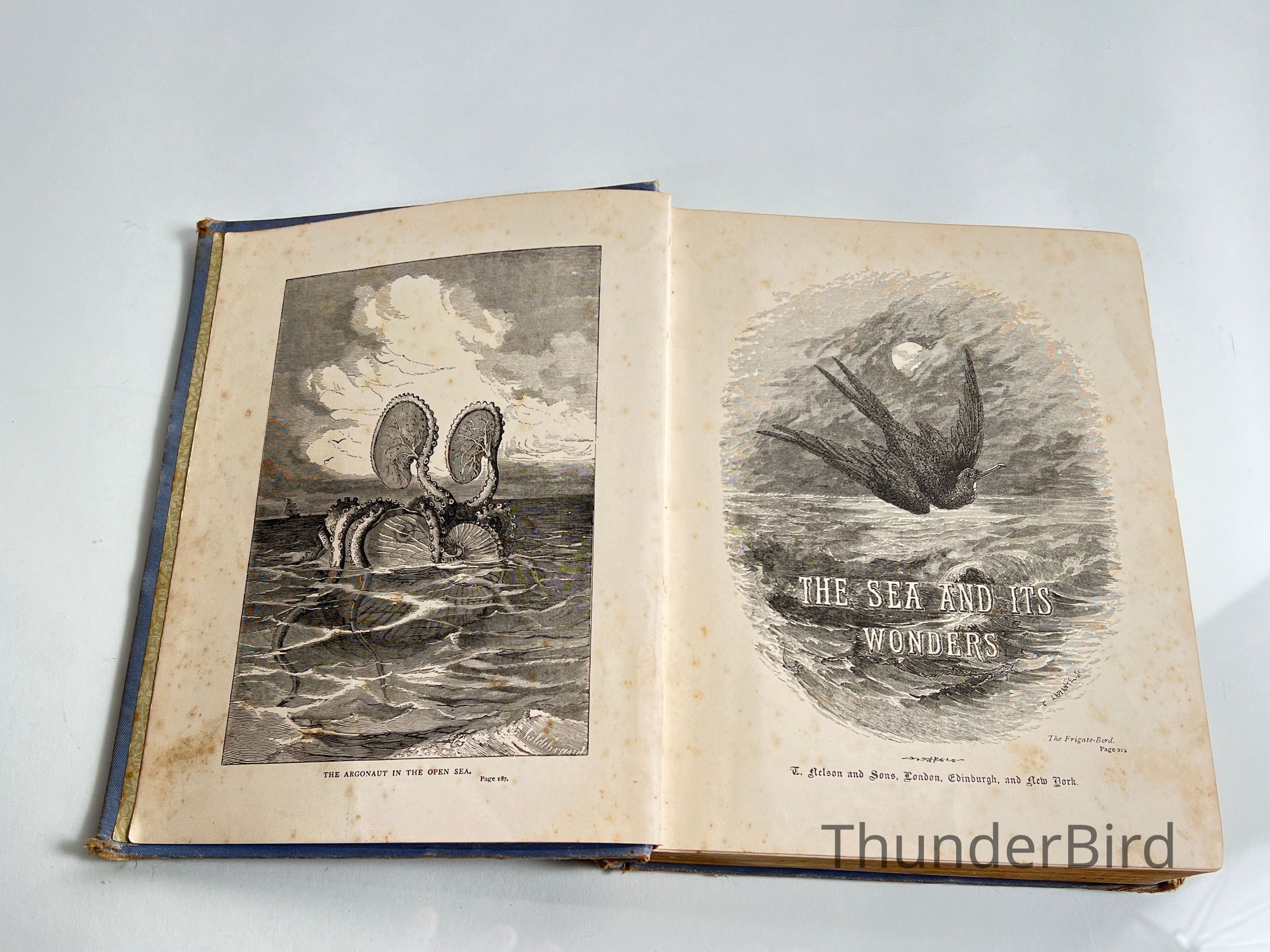 An original 1884 edition of The Sea and Its Wonders by Mary and Elizabeth Kirby, published by T. Nelson and Sons, London. This Victorian natural history volume was intended to inspire young readers with scientific understanding and appreciation of marine life. The book features remarkable engraved illustrations, including sea creatures such as argonauts, flying fish, and seabirds. The decorative cloth binding is embellished with gilt and printed marine motifs, including a flying fish and coral, typical of the period's aesthetic. A compelling companion to the Kirbys’ other notable educational titles.