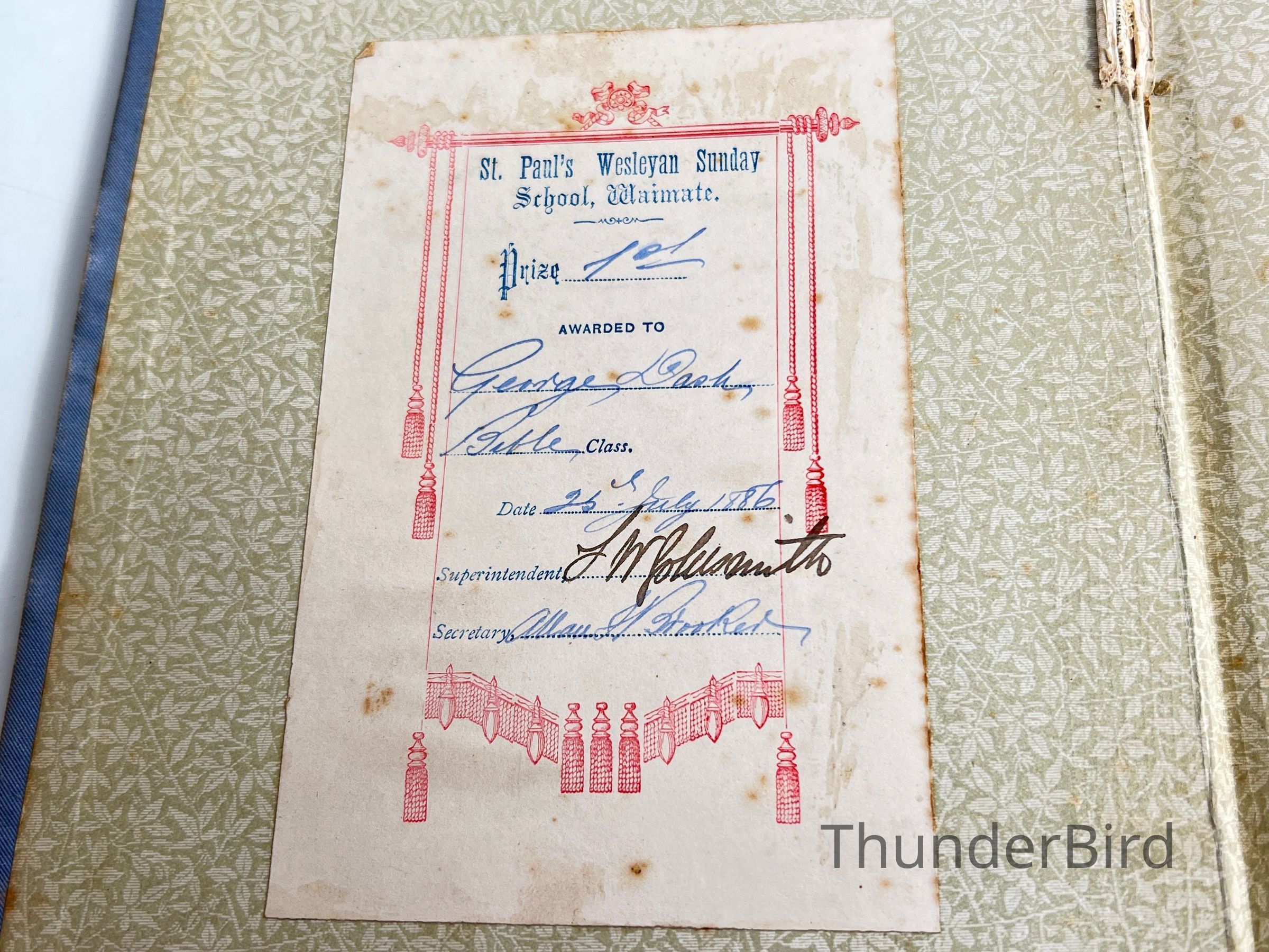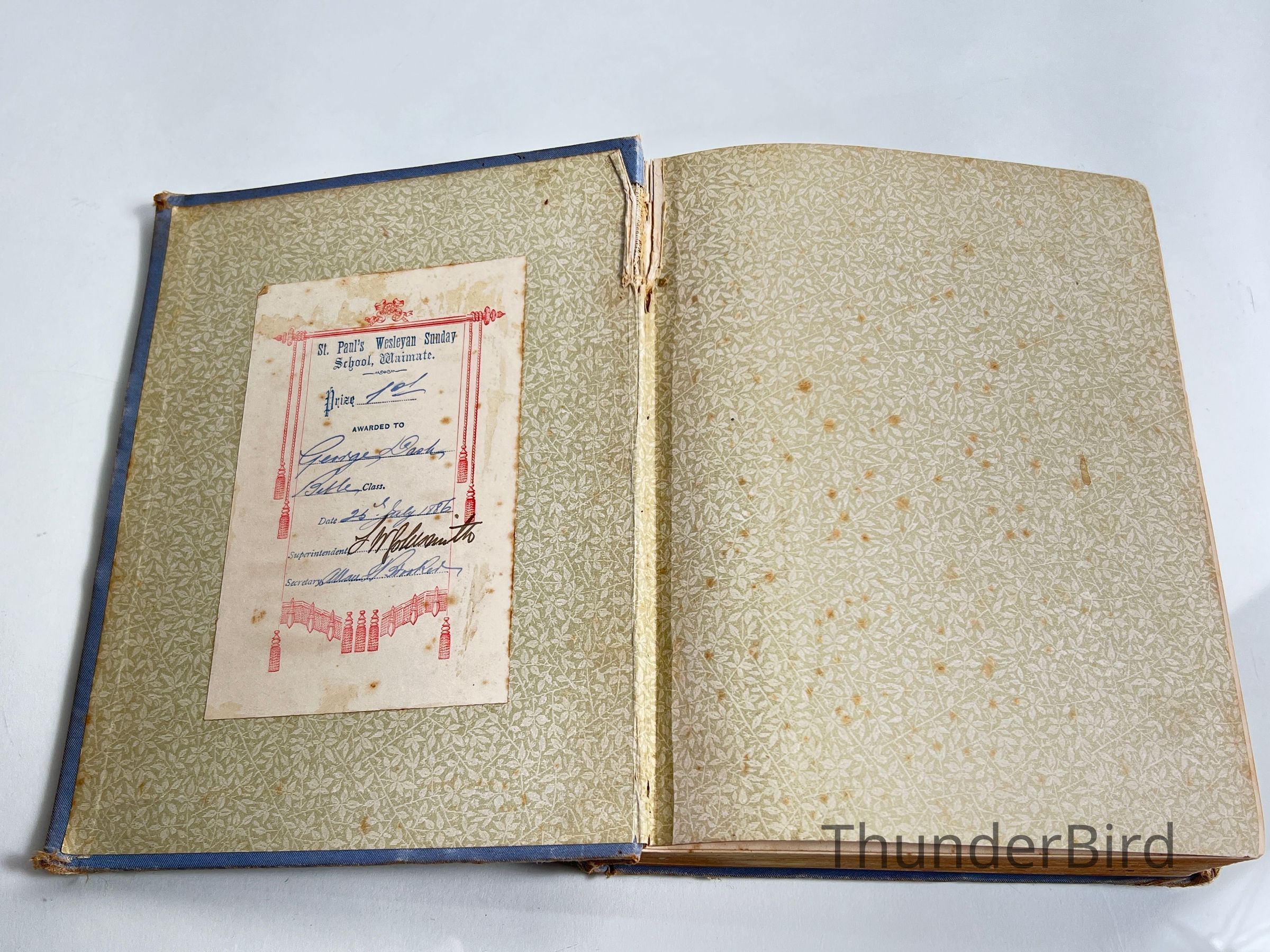 This particular copy bears a presentation label from St. Paul’s Wesleyan Sunday School in Waimate, New Zealand, dated 1888 — a significant piece of colonial book history.