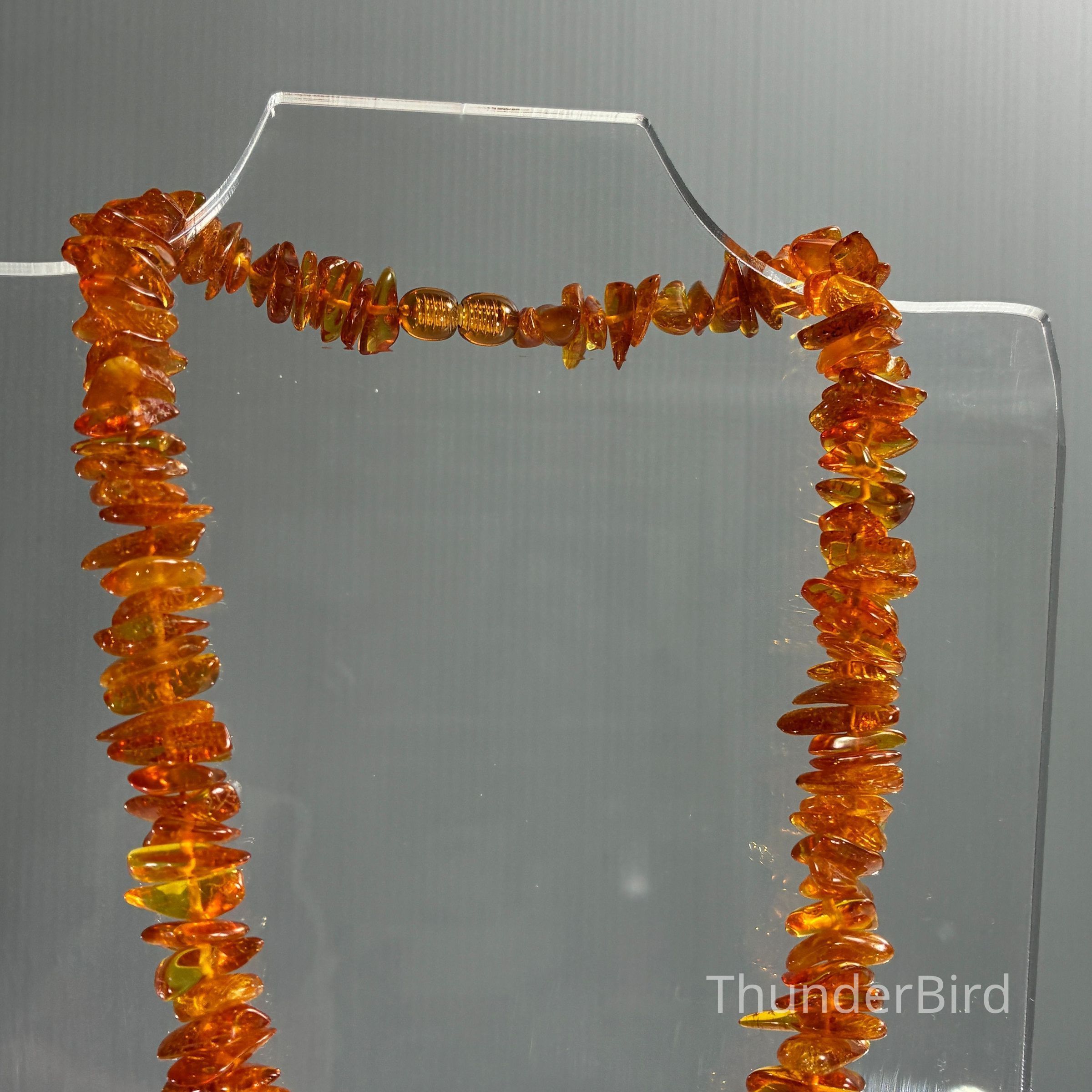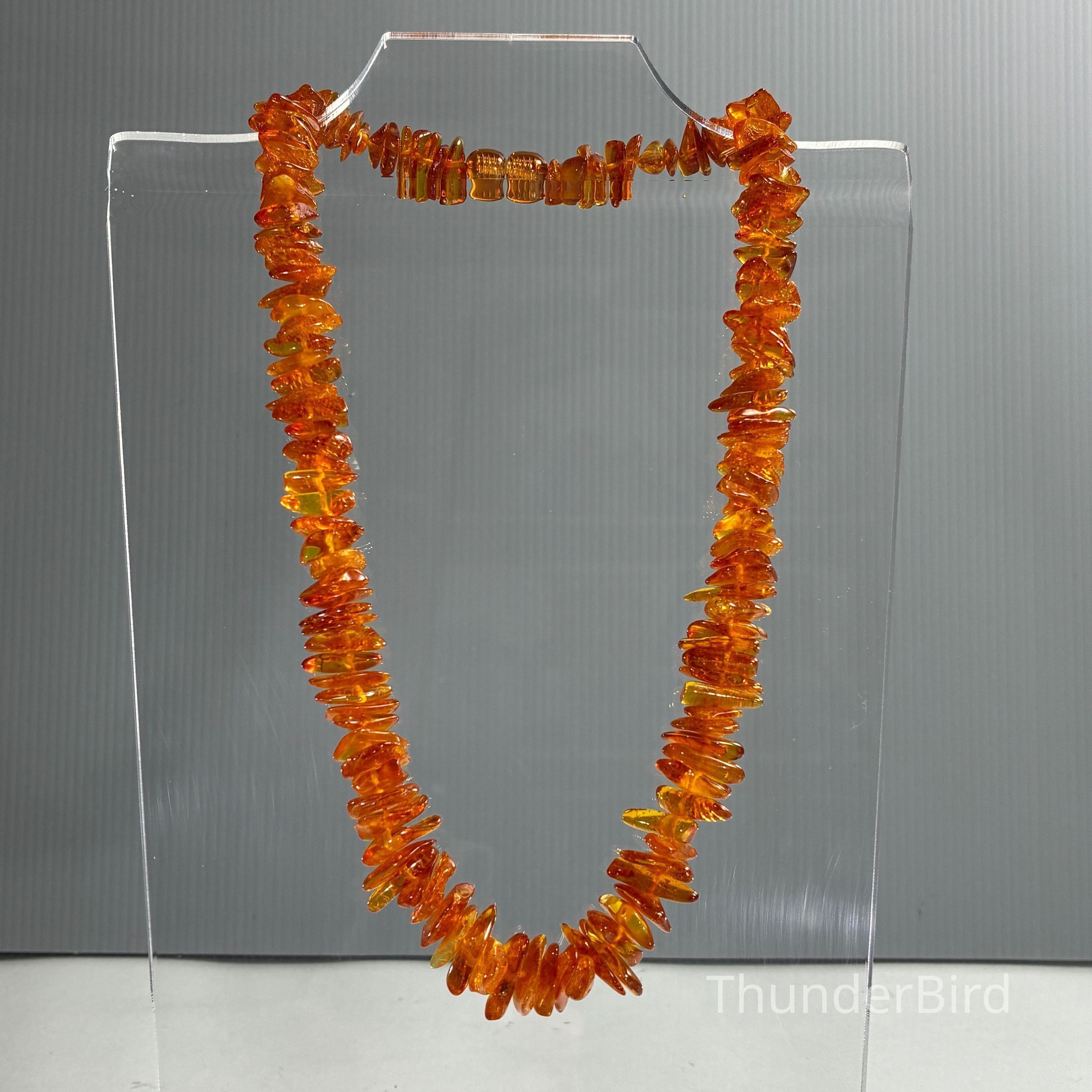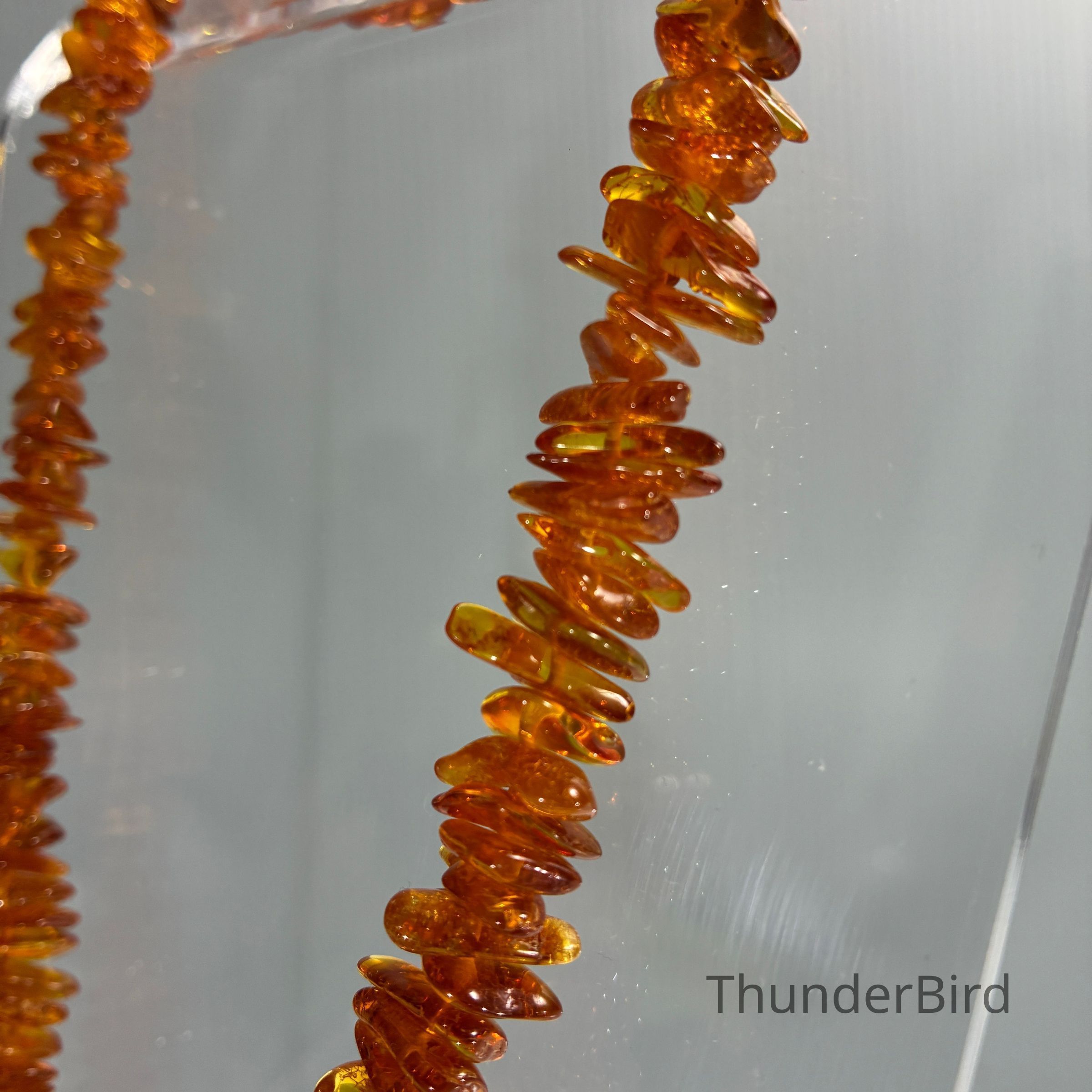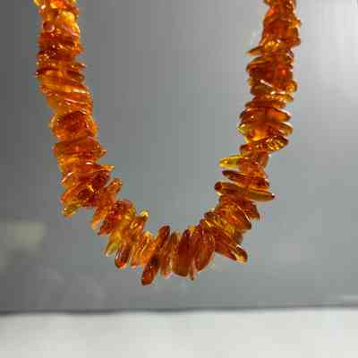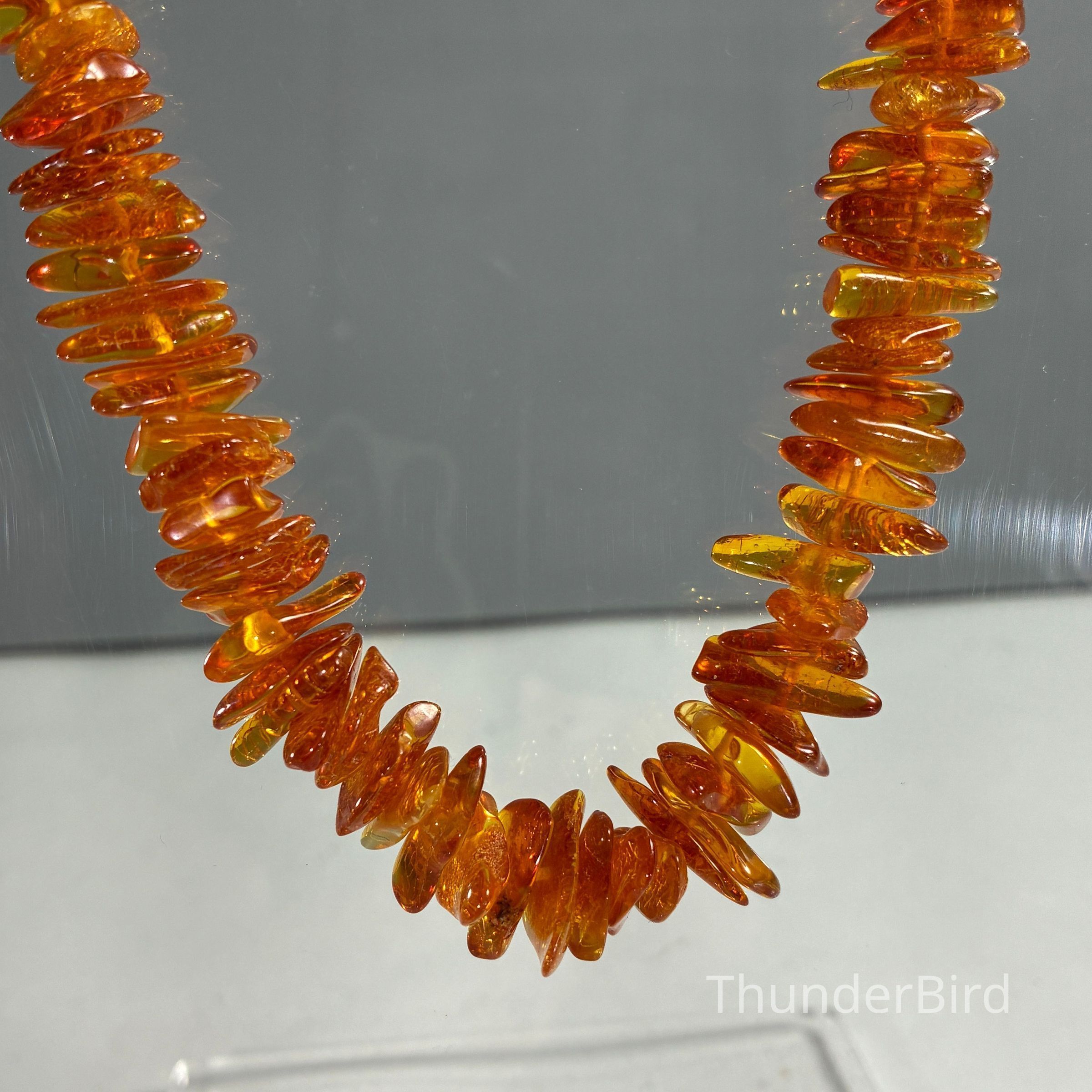 A beautiful vintage 45 cm necklace strung with genuine Baltic amber in rich, golden cognac hues. The necklace is composed of irregular polished amber chips, showcasing natural inclusions and the glowing translucency that makes true amber so desirable. The necklace closes with an amber screw clasp, blending seamlessly into the organic design. Each bead has a unique shape and clarity, giving the piece warmth and individuality.