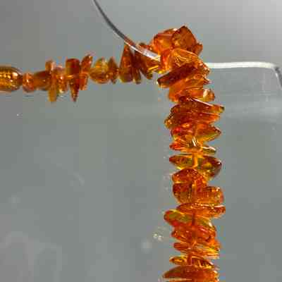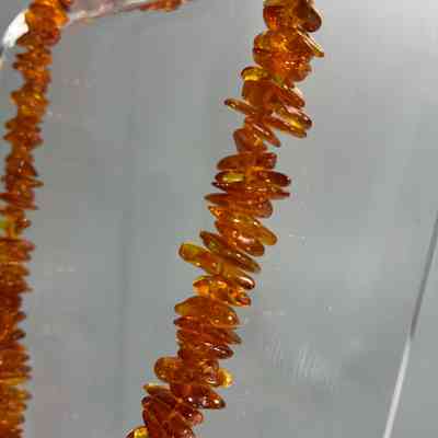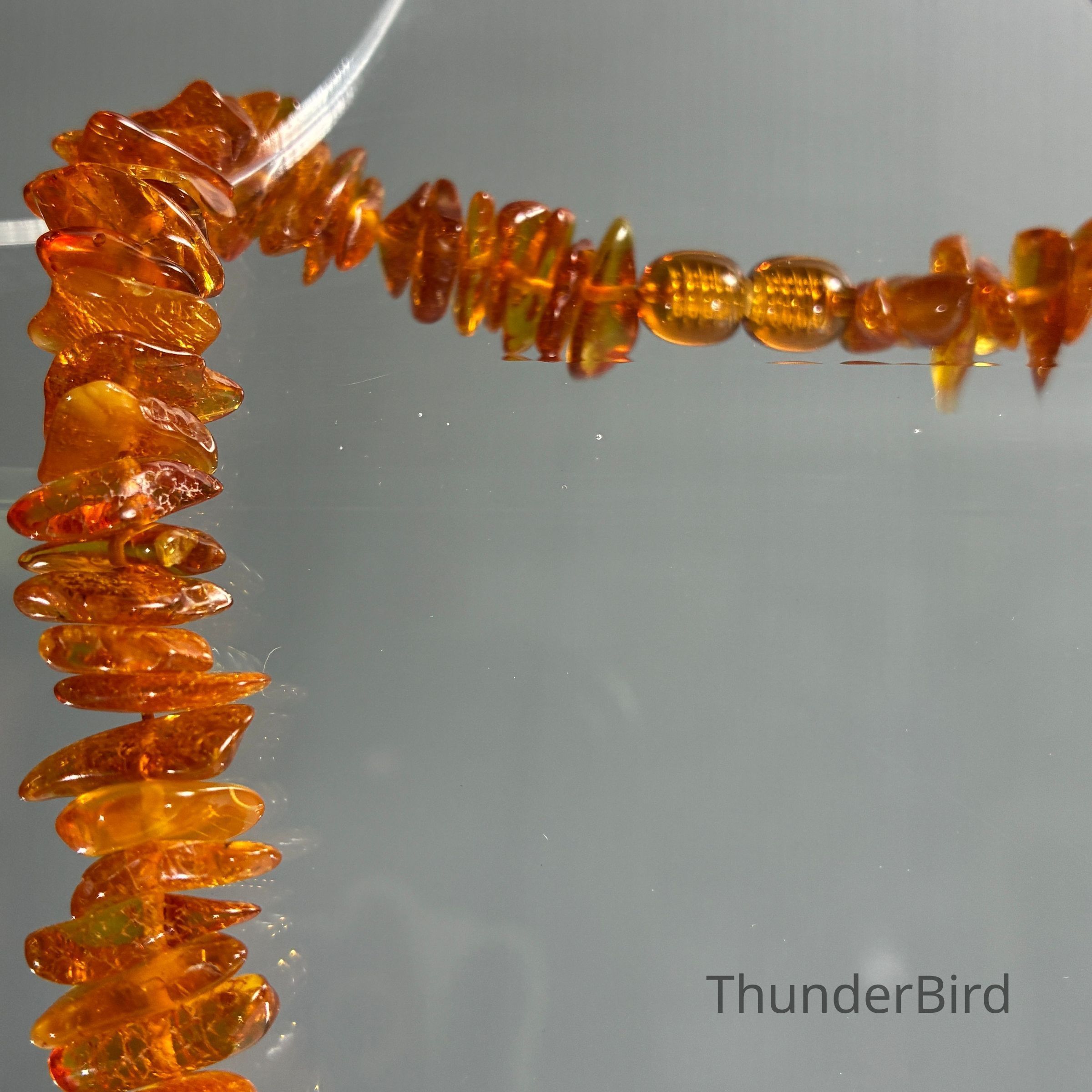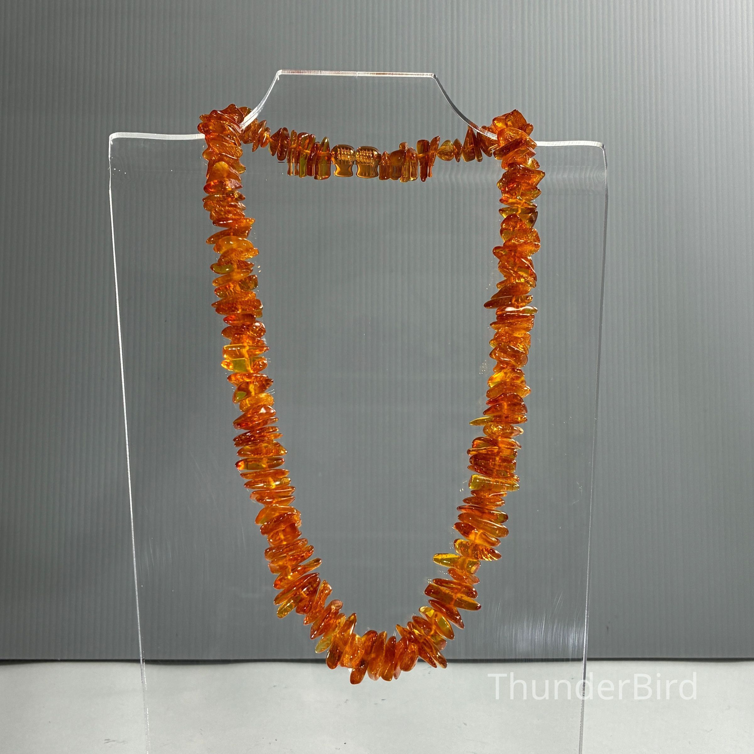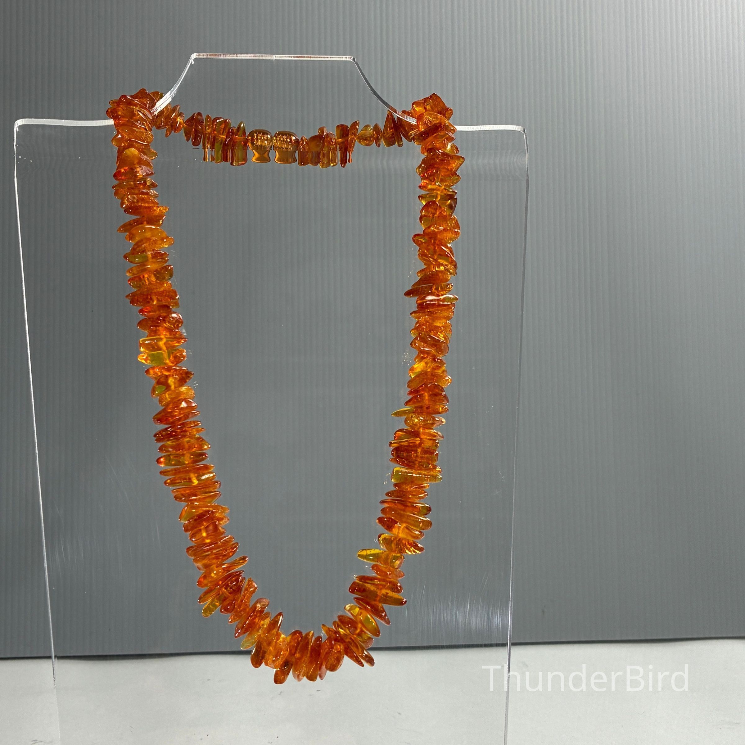 A beautiful vintage 45 cm necklace strung with genuine Baltic amber in rich, golden cognac hues. The necklace is composed of irregular polished amber chips, showcasing natural inclusions and the glowing translucency that makes true amber so desirable. The necklace closes with an amber screw clasp, blending seamlessly into the organic design. Each bead has a unique shape and clarity, giving the piece warmth and individuality.