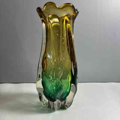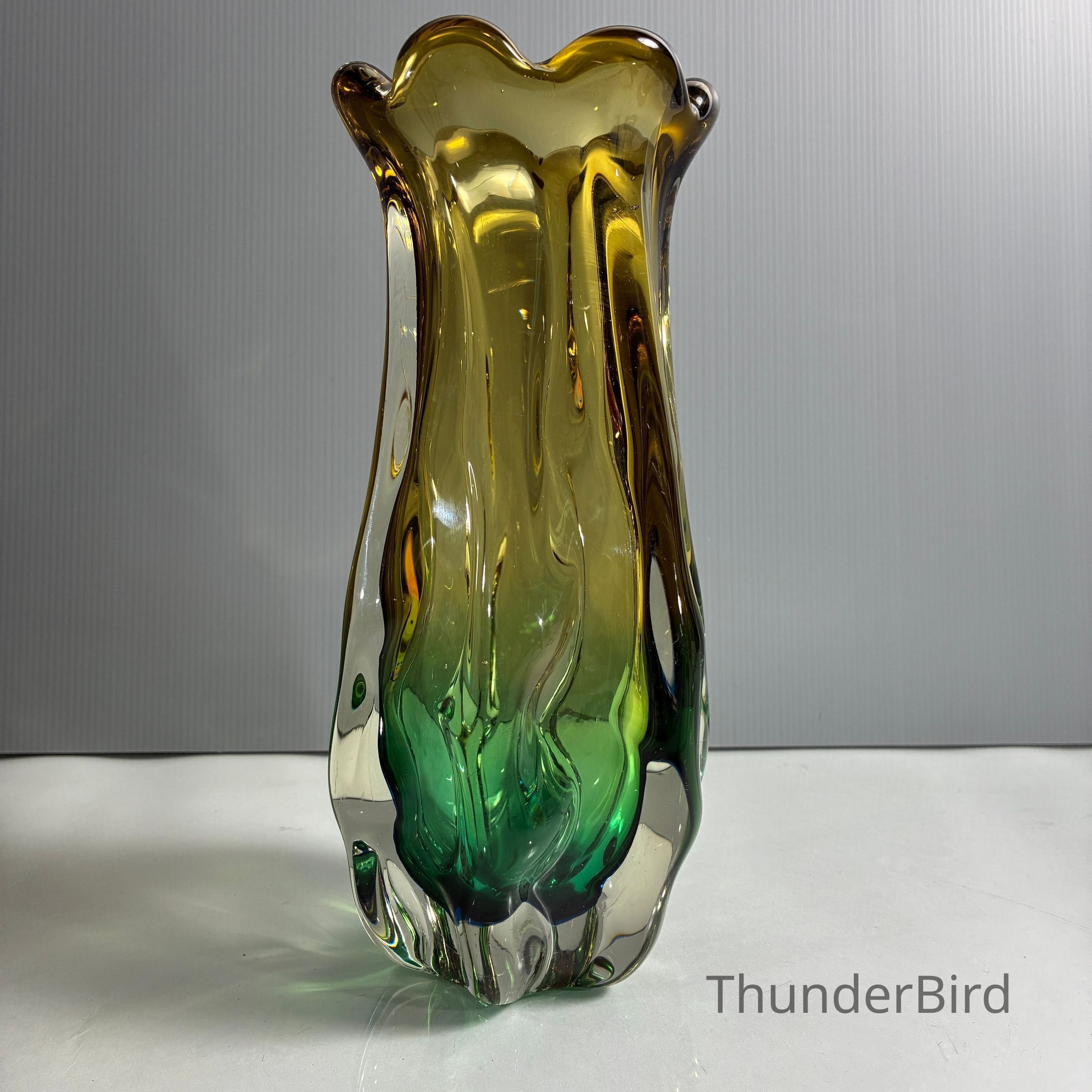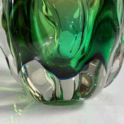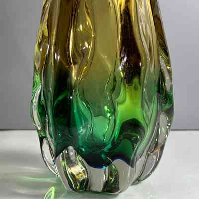 28.10.25u Mid-Century Sanyu (Japan) Ribbed Art Glass Vase – Amber, Emerald & Blue OverlayEntry/Object ID