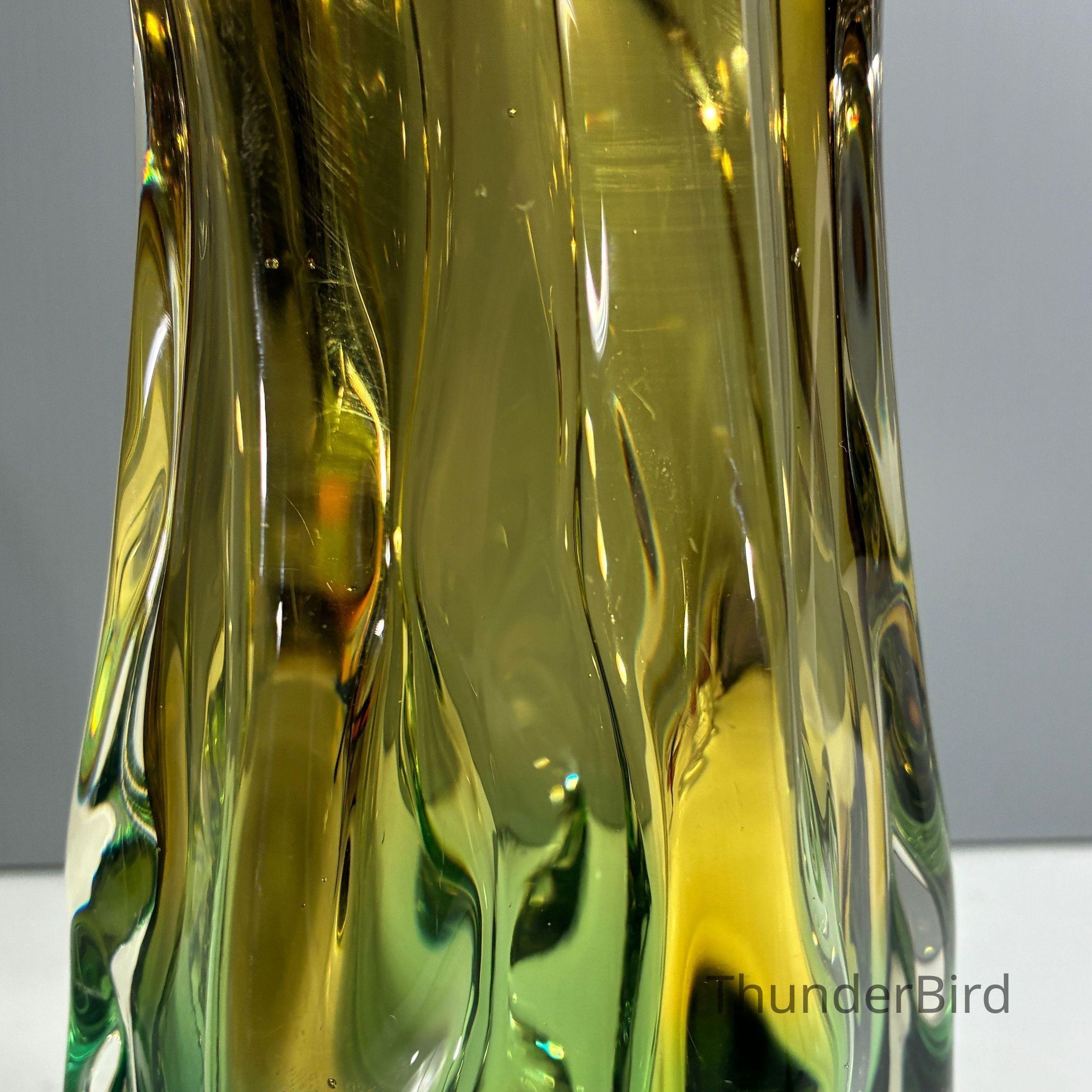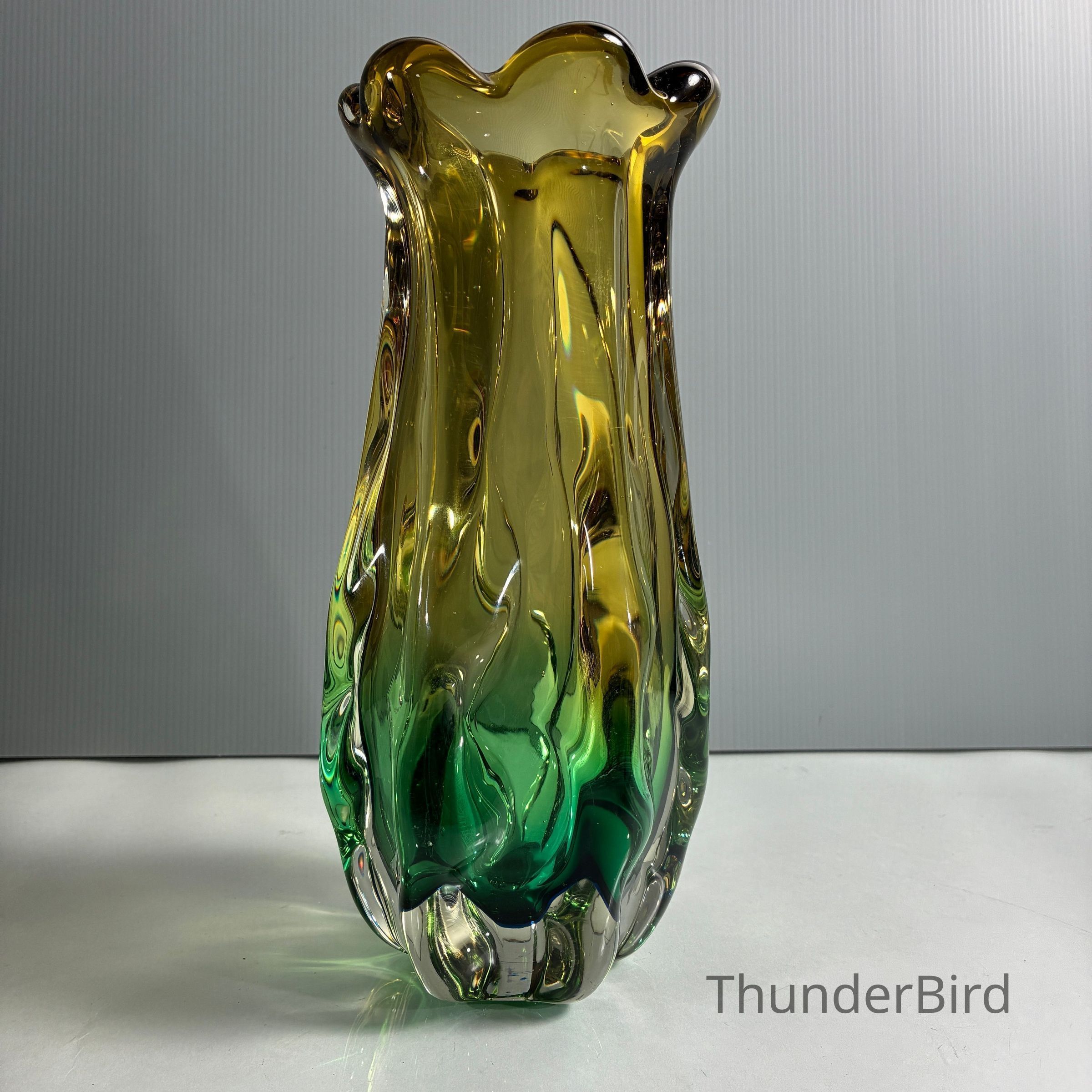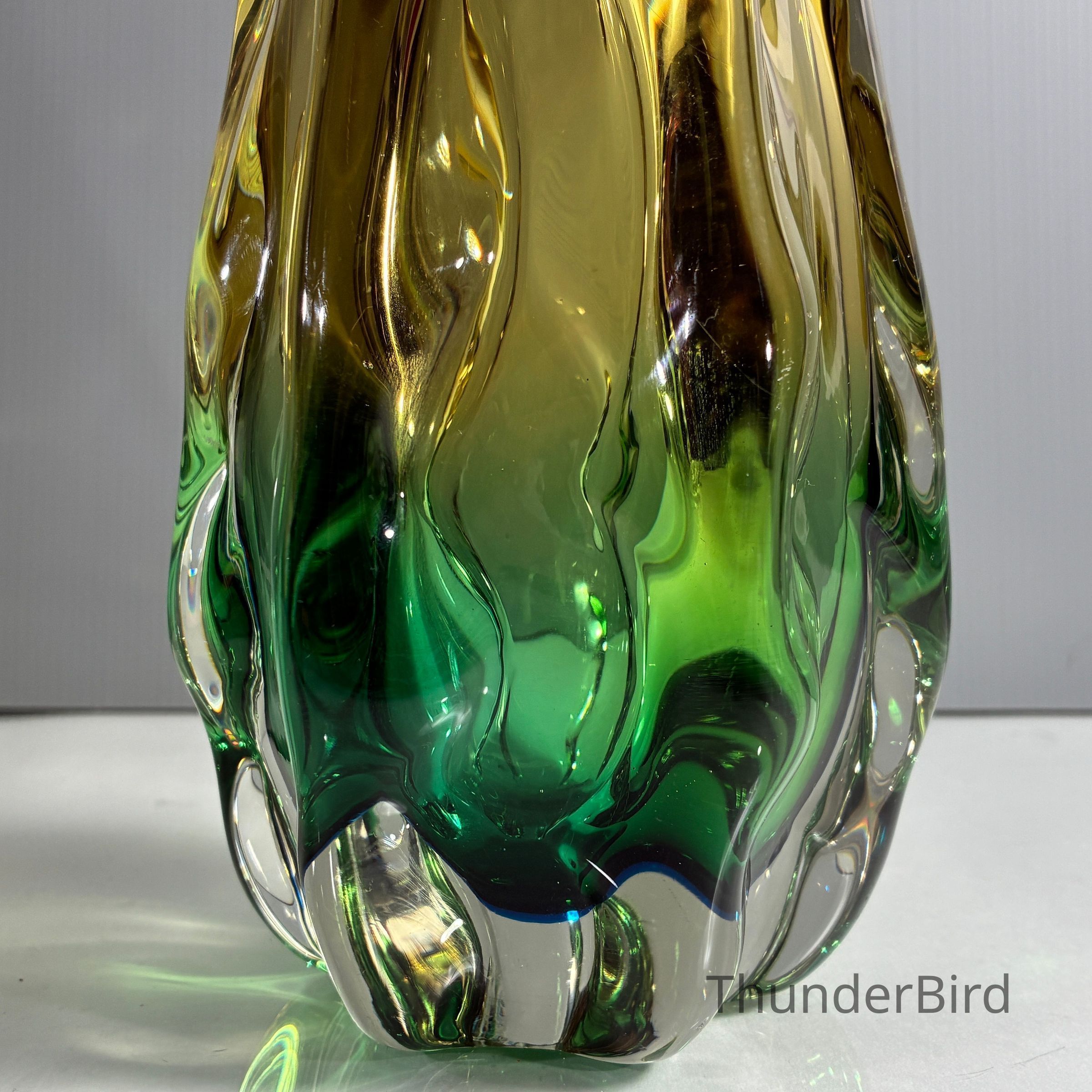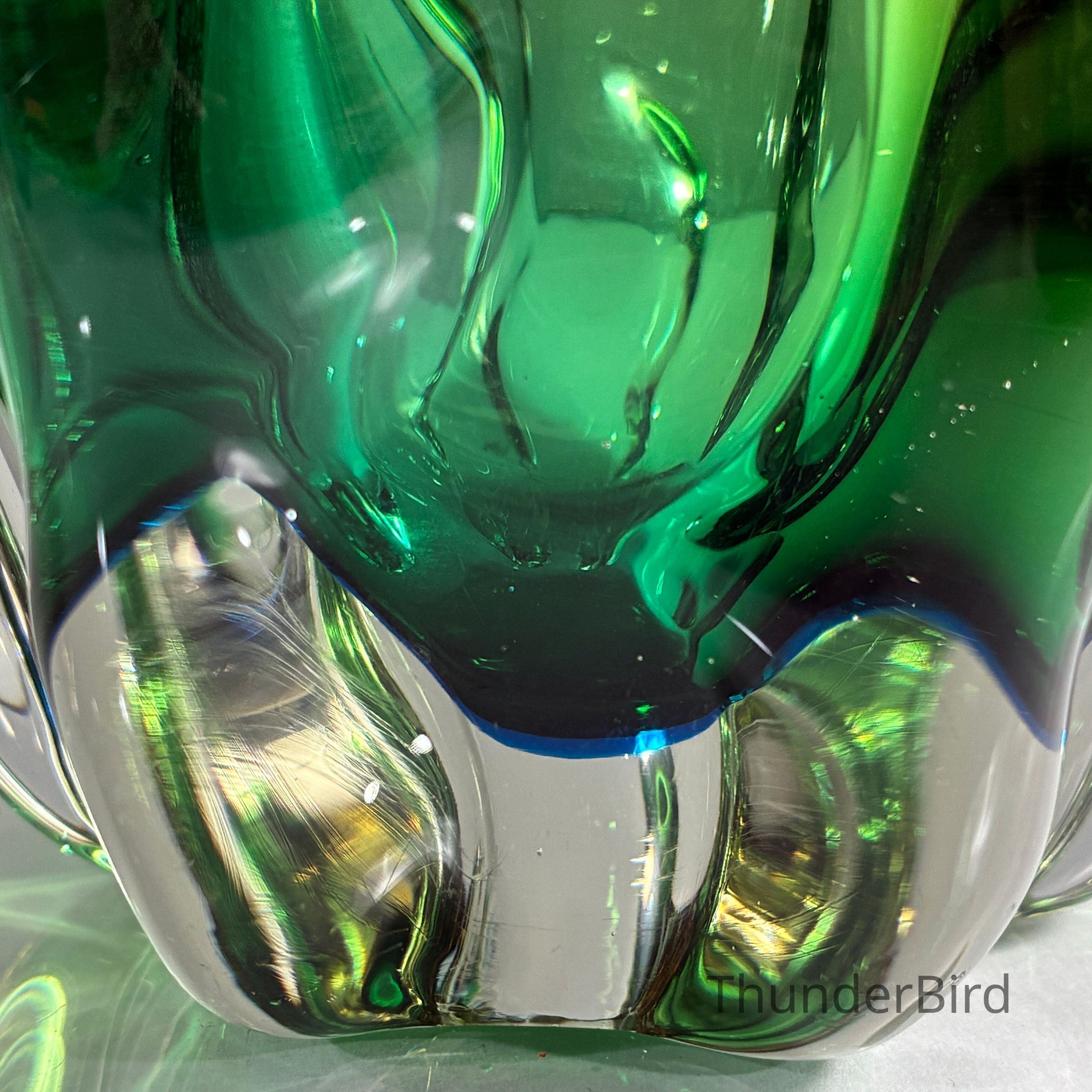 A superb mid-century ribbed art glass vase by Sanyu Glass, Osaka, Japan, c.1960s–70s. This well-documented model features a flared rim and fluid, ribbed form, created in heavy, high-quality blown glass. The colour palette is characteristic of Sanyu’s output, with golden amber and emerald green overlaid in the Sommerso style, and a fine layer of cobalt blue visible at the base.