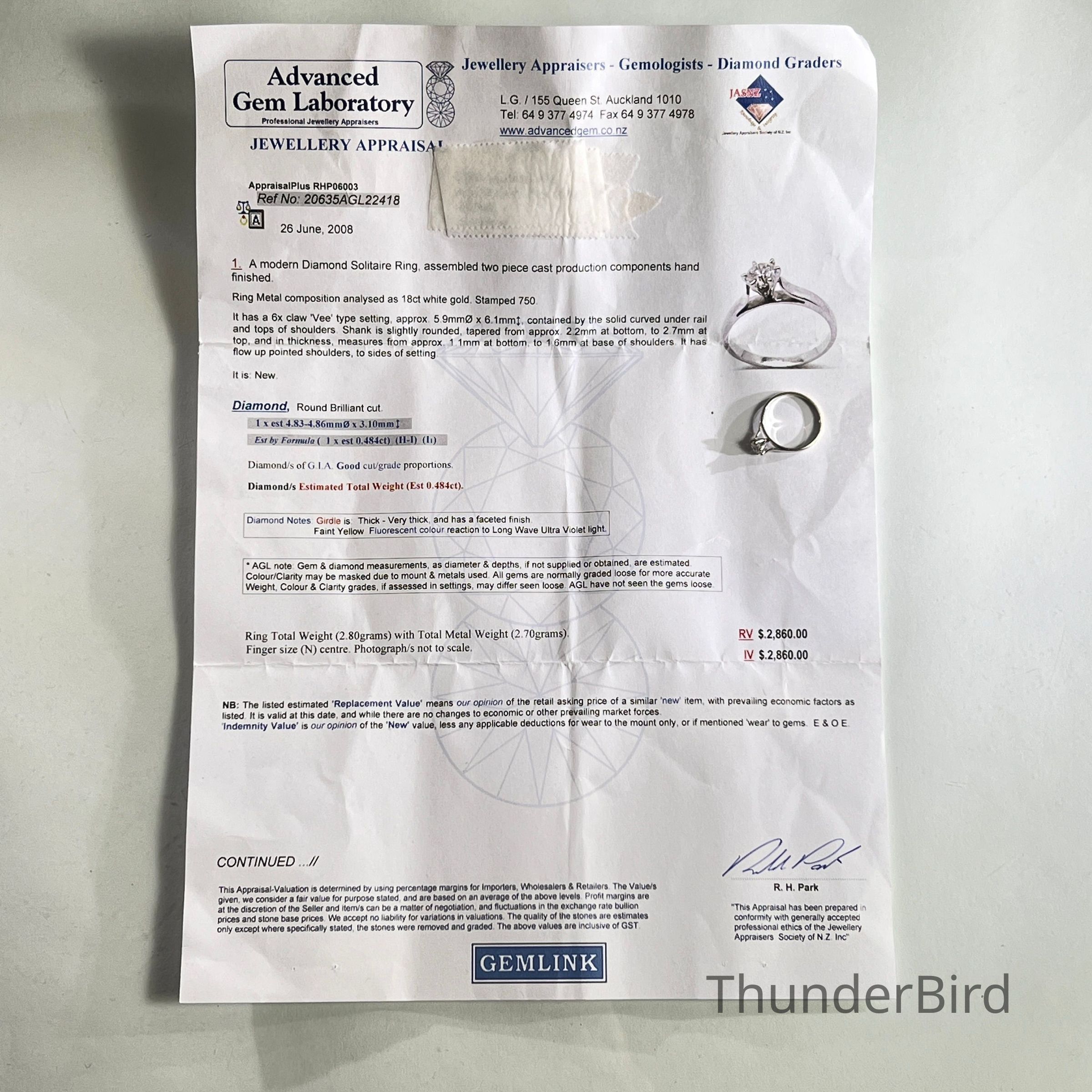 Diamond solitaire ring manufactured in 18ct white gold and set with a round brilliant cut diamond of approximately 0.48 carats. The diamond is secured in a six claw Vee style setting, a less commonly used configuration designed to provide firm support while allowing light exposure to the stone. This elegant setting elevates the stone while allowing excellent fire and sparkle, particularly noticeable in natural sunlight. The band is of tapered form with balanced proportions. The ring is stamped 750, confirming 18ct gold purity, and has been professionally assessed. The ring was last professionally valued in 2008 with a replacement and indemnity valuation of NZ$2,860.
