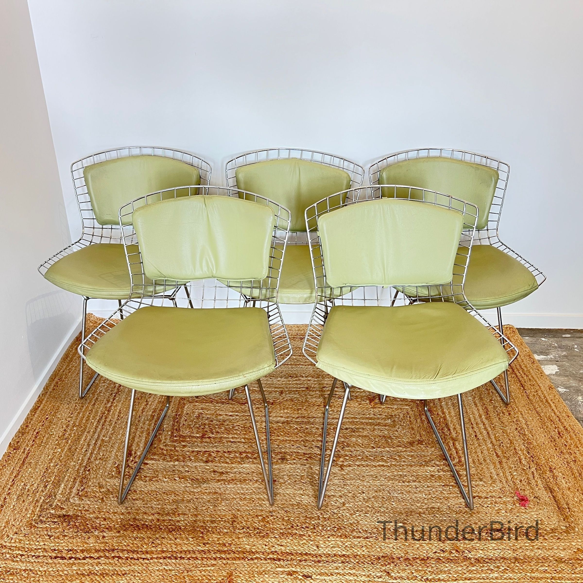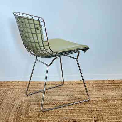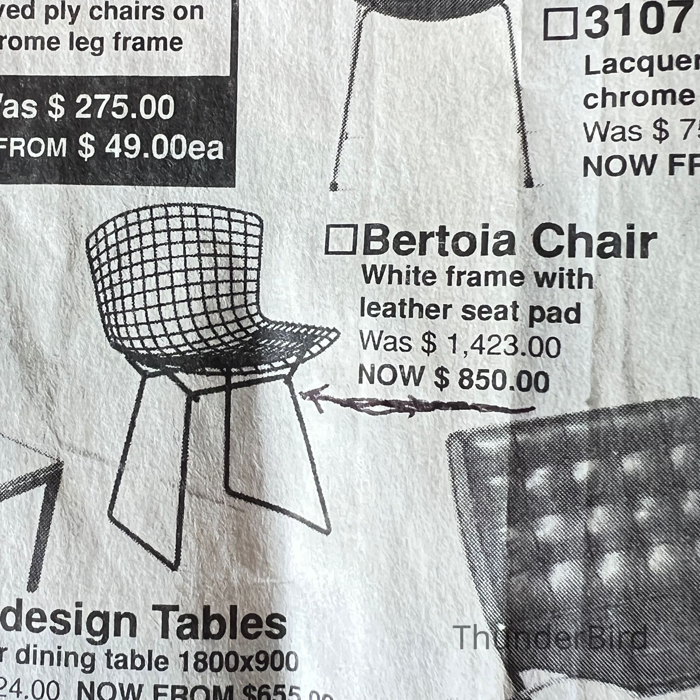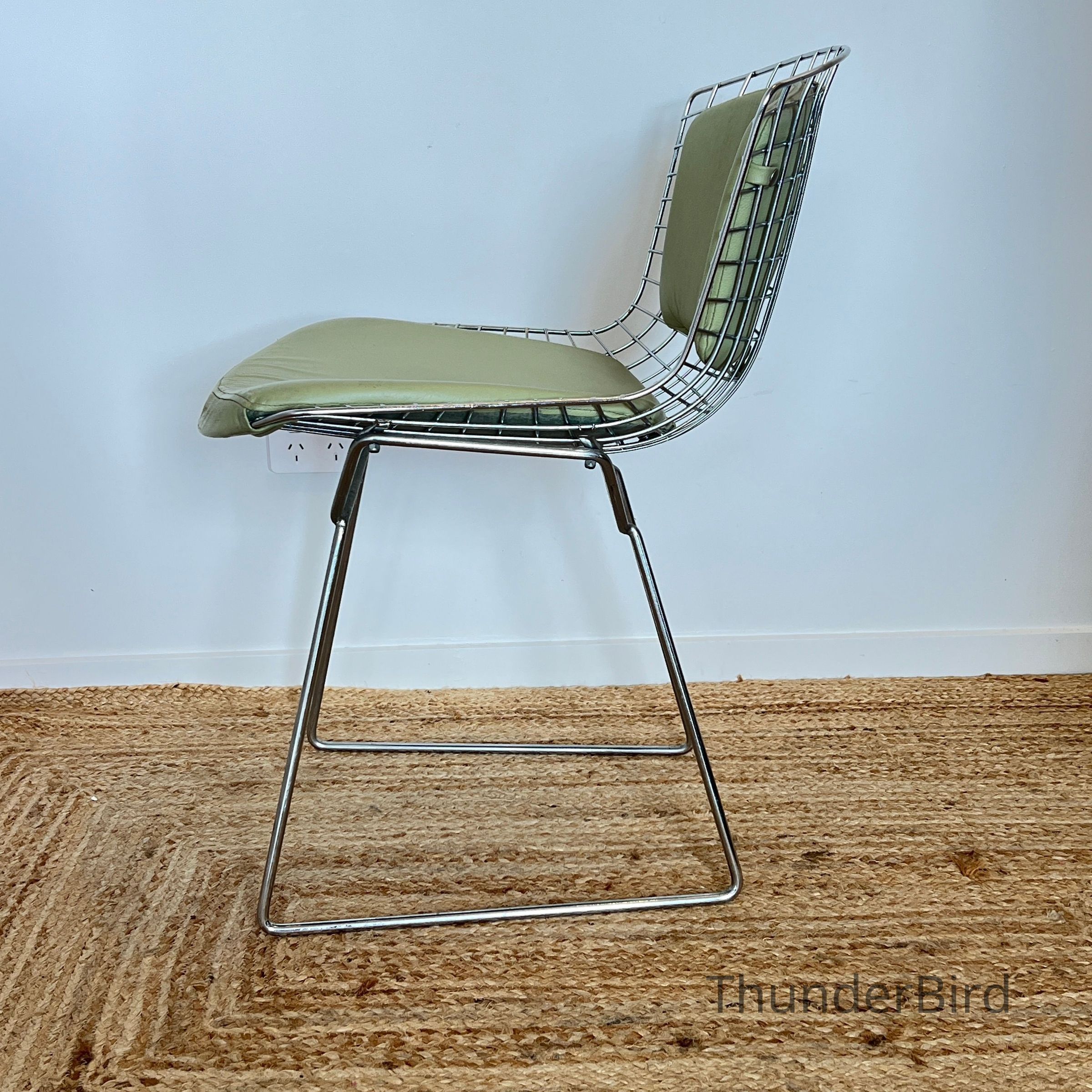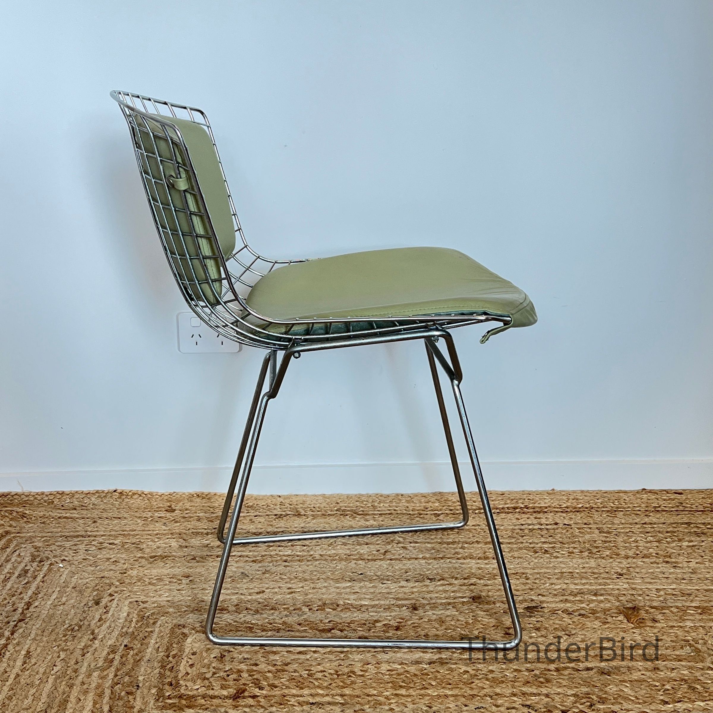 A set of five Bertoia Wire Side Chairs consistent with early 2000s Knoll-authorised production, originally retailed in New Zealand by Bromhead Design. These follow Harry Bertoia’s 1952 design, formed from a welded steel wire grid on a sled base. The construction details closely match known genuine examples from the period including the seat-basket form, wire pattern, weld structure, and base geometry. The original leather seat and back pads are included. A 2002 Bromhead Design clearance advert was found stored with one chair (!!), confirming the period availability of this model in New Zealand. These features collectively support authenticity.