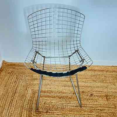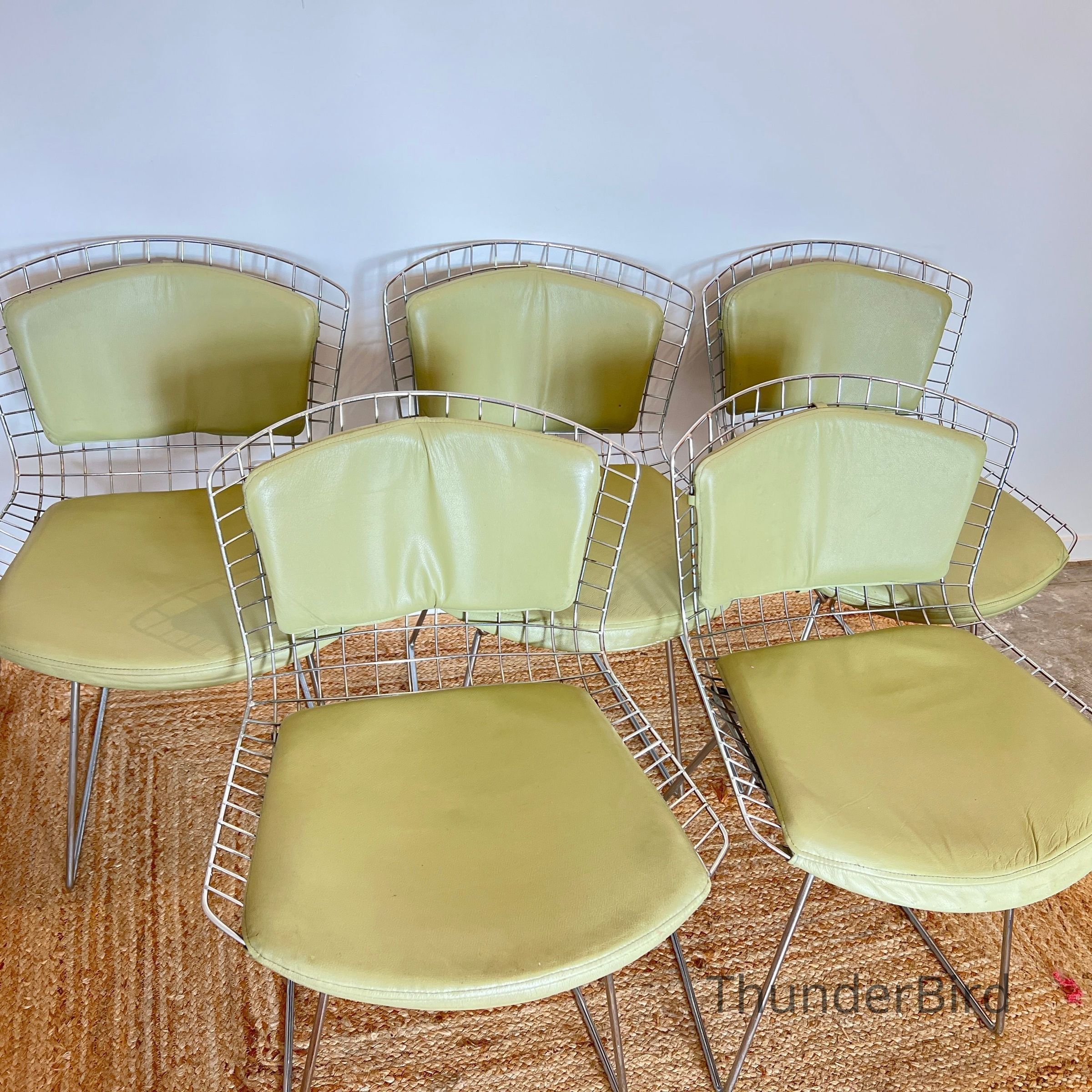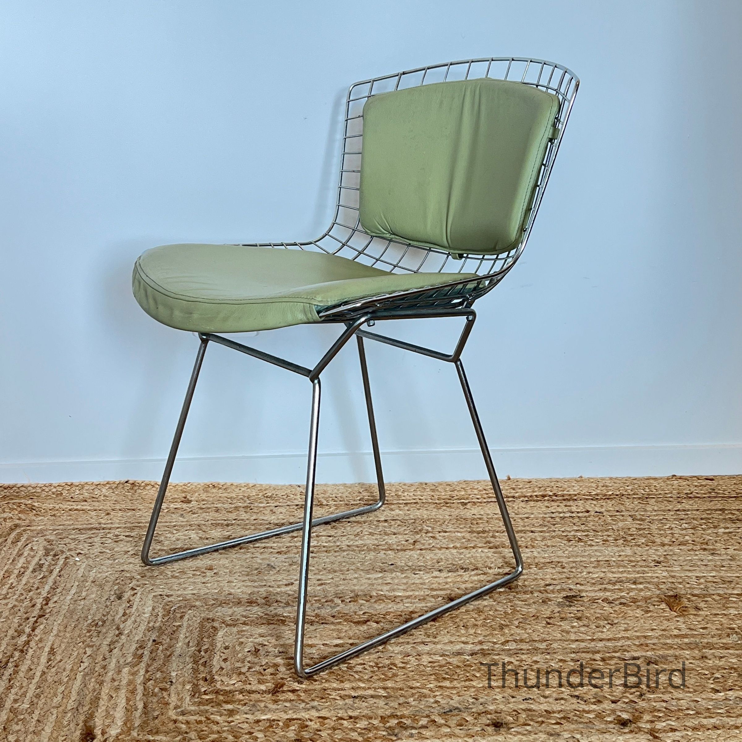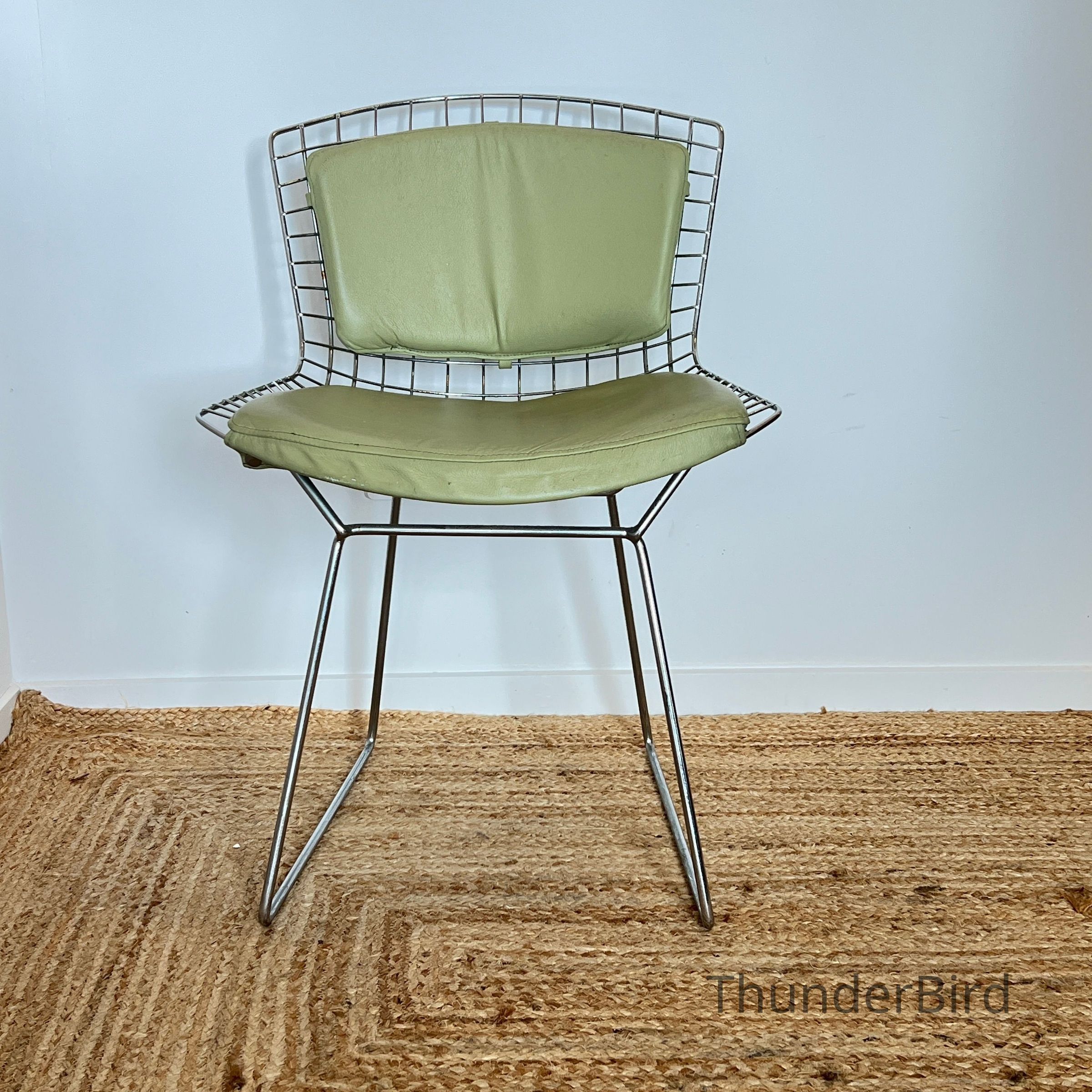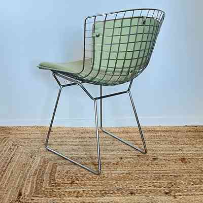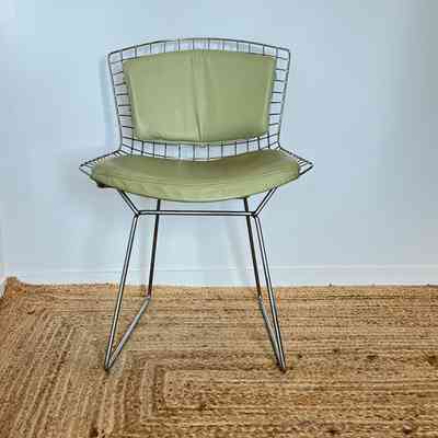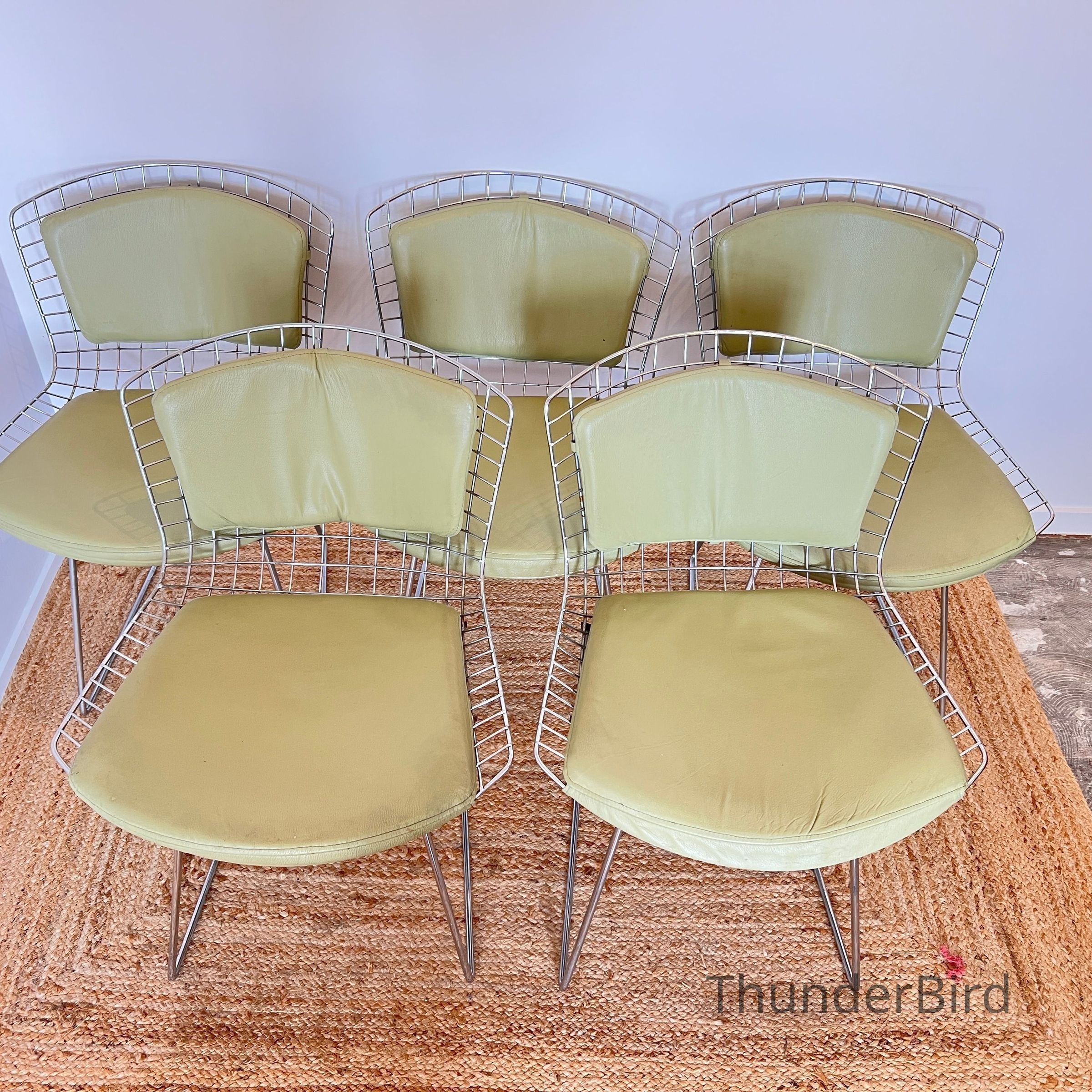 A set of five Bertoia Wire Side Chairs consistent with early 2000s Knoll-authorised production, originally retailed in New Zealand by Bromhead Design. These follow Harry Bertoia’s 1952 design, formed from a welded steel wire grid on a sled base. The construction details closely match known genuine examples from the period including the seat-basket form, wire pattern, weld structure, and base geometry. The original leather seat and back pads are included. A 2002 Bromhead Design clearance advert was found stored with one chair (!!), confirming the period availability of this model in New Zealand. These features collectively support authenticity.