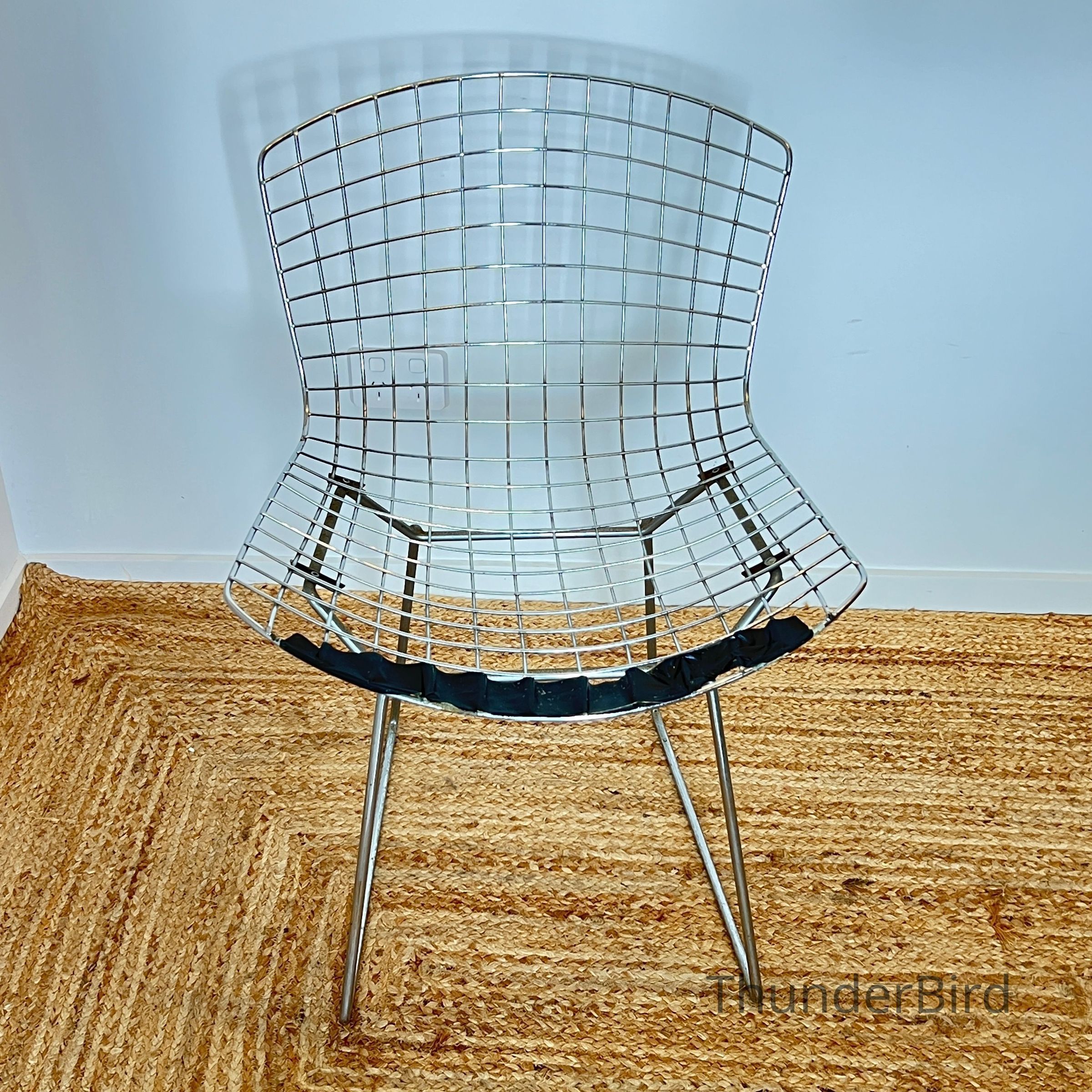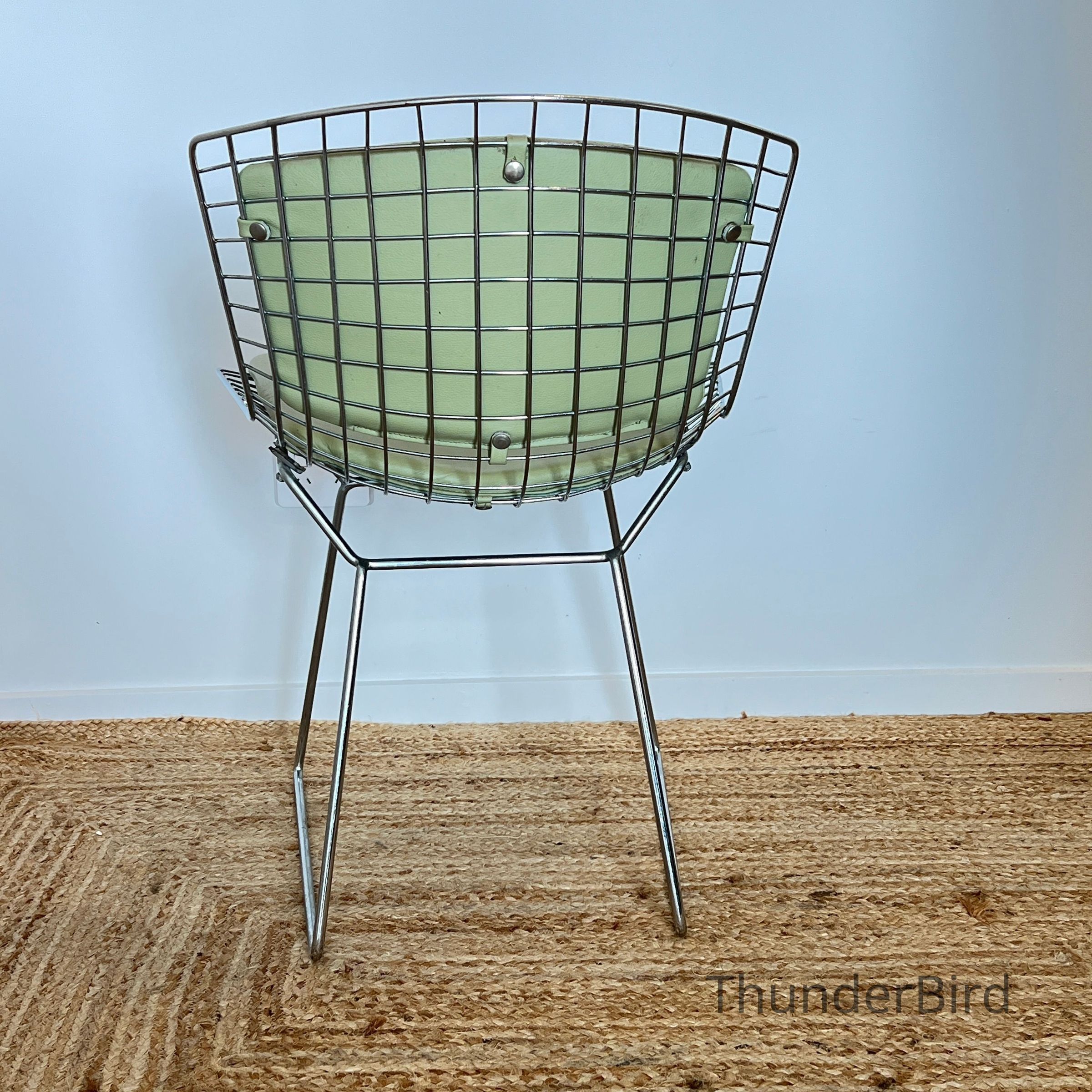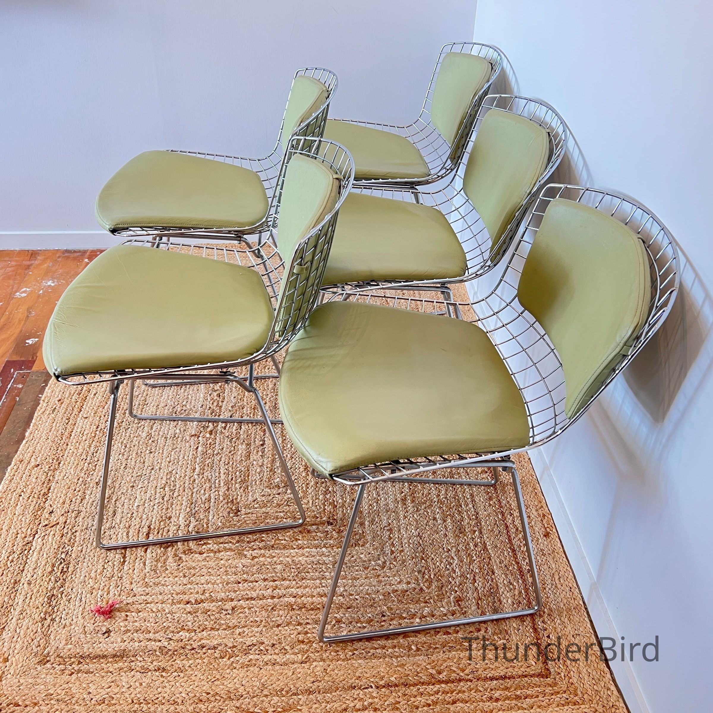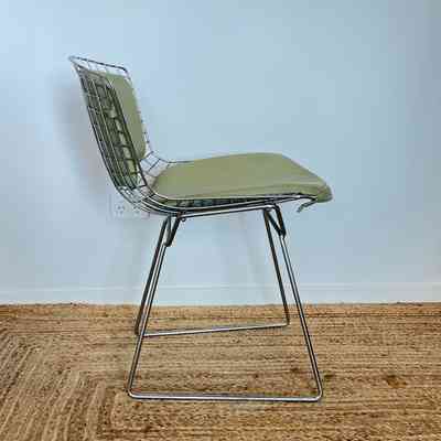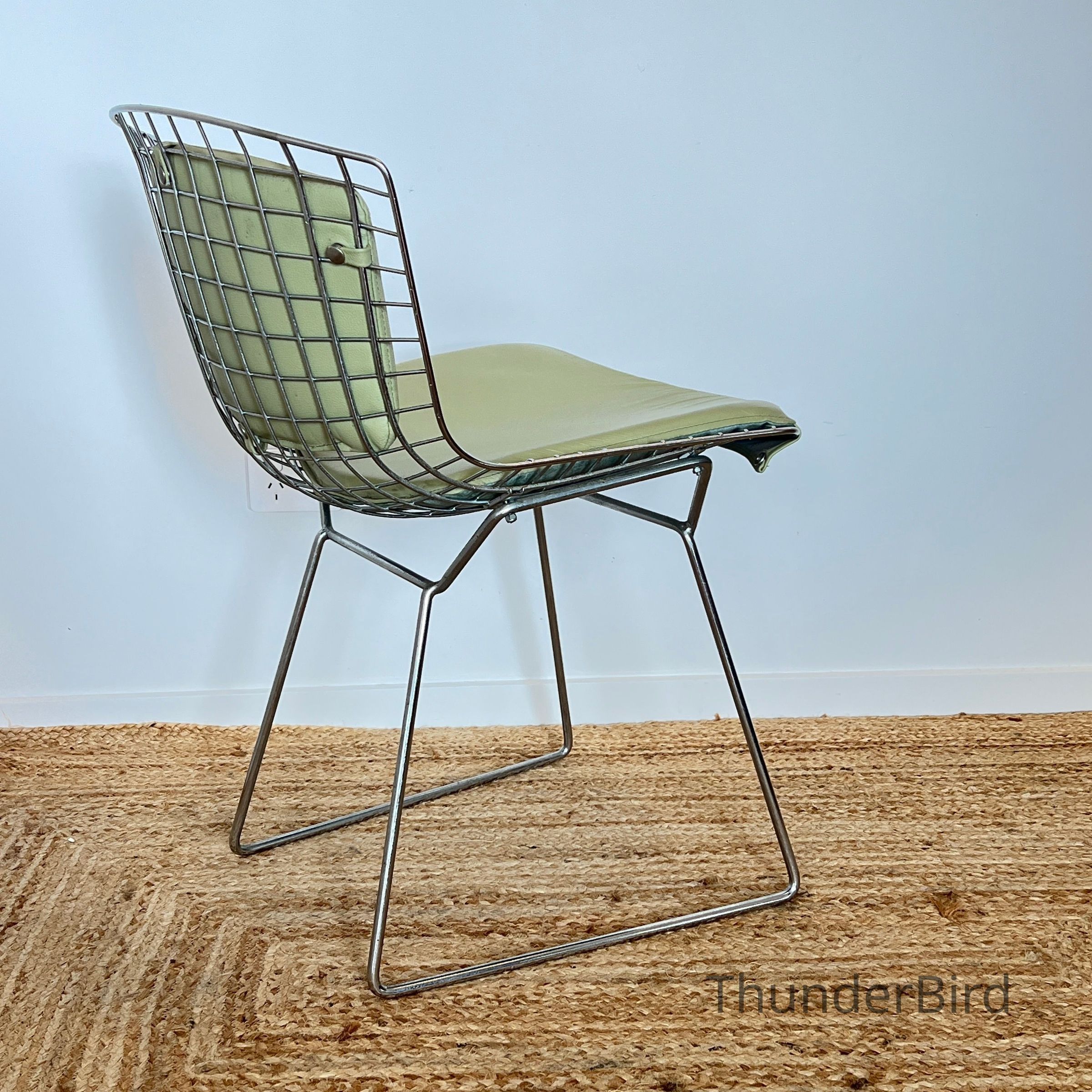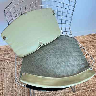 A set of five Bertoia Wire Side Chairs consistent with early 2000s Knoll-authorised production, originally retailed in New Zealand by Bromhead Design. These follow Harry Bertoia’s 1952 design, formed from a welded steel wire grid on a sled base. The construction details closely match known genuine examples from the period including the seat-basket form, wire pattern, weld structure, and base geometry. The original leather seat and back pads are included. A 2002 Bromhead Design clearance advert was found stored with one chair (!!), confirming the period availability of this model in New Zealand. These features collectively support authenticity.