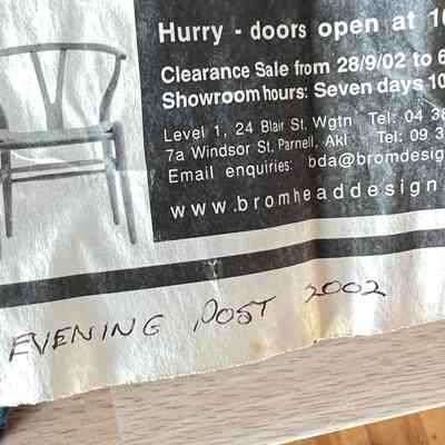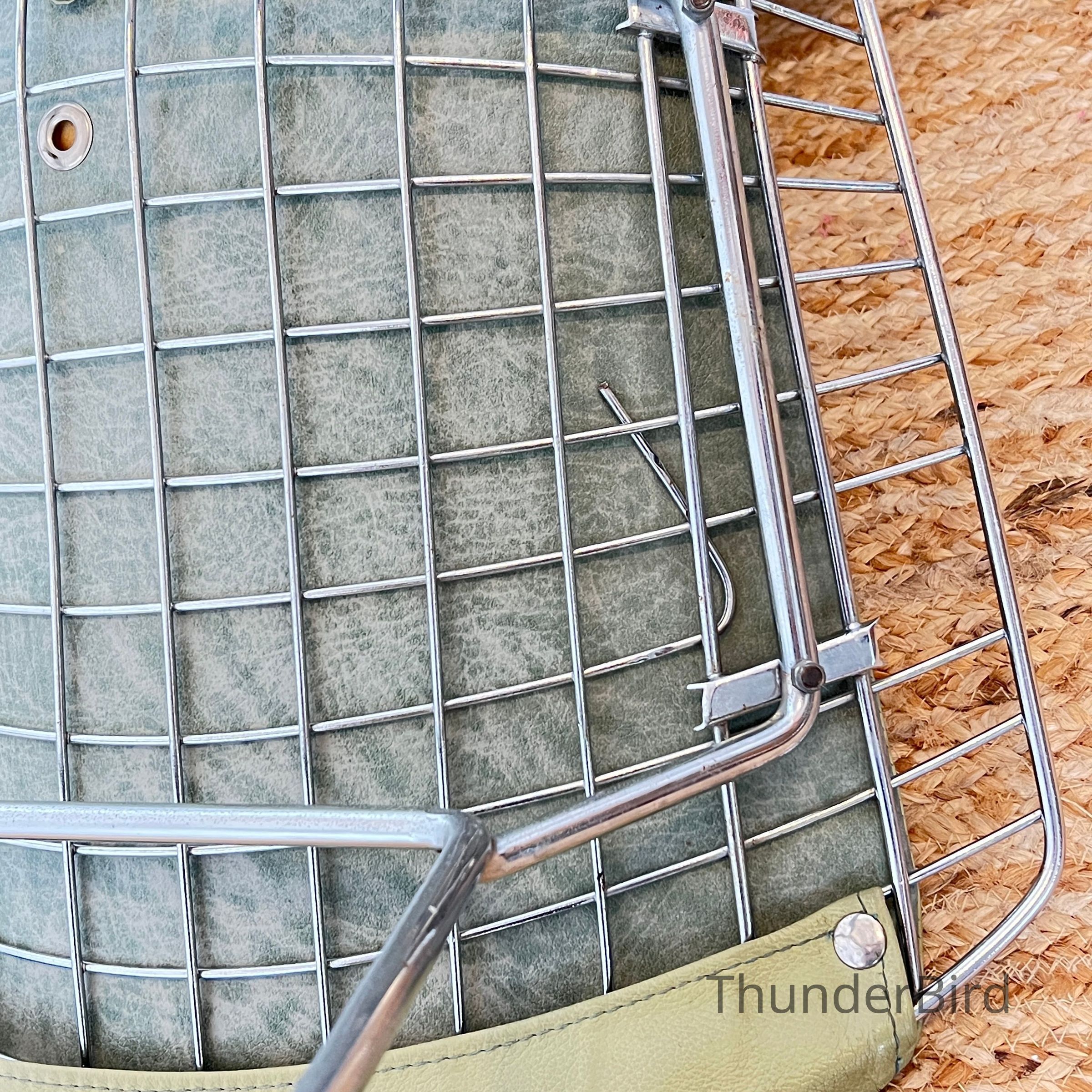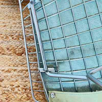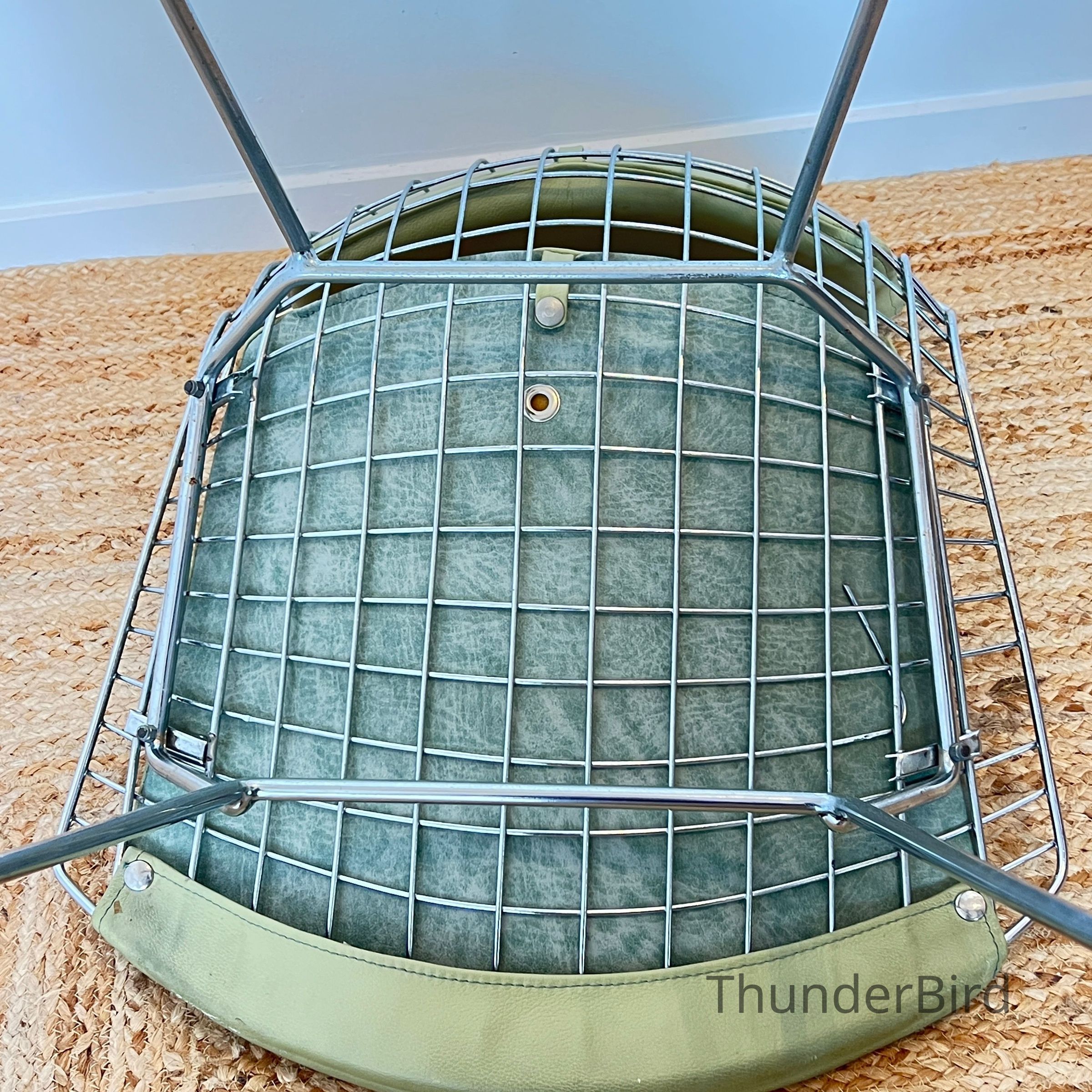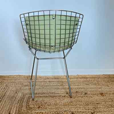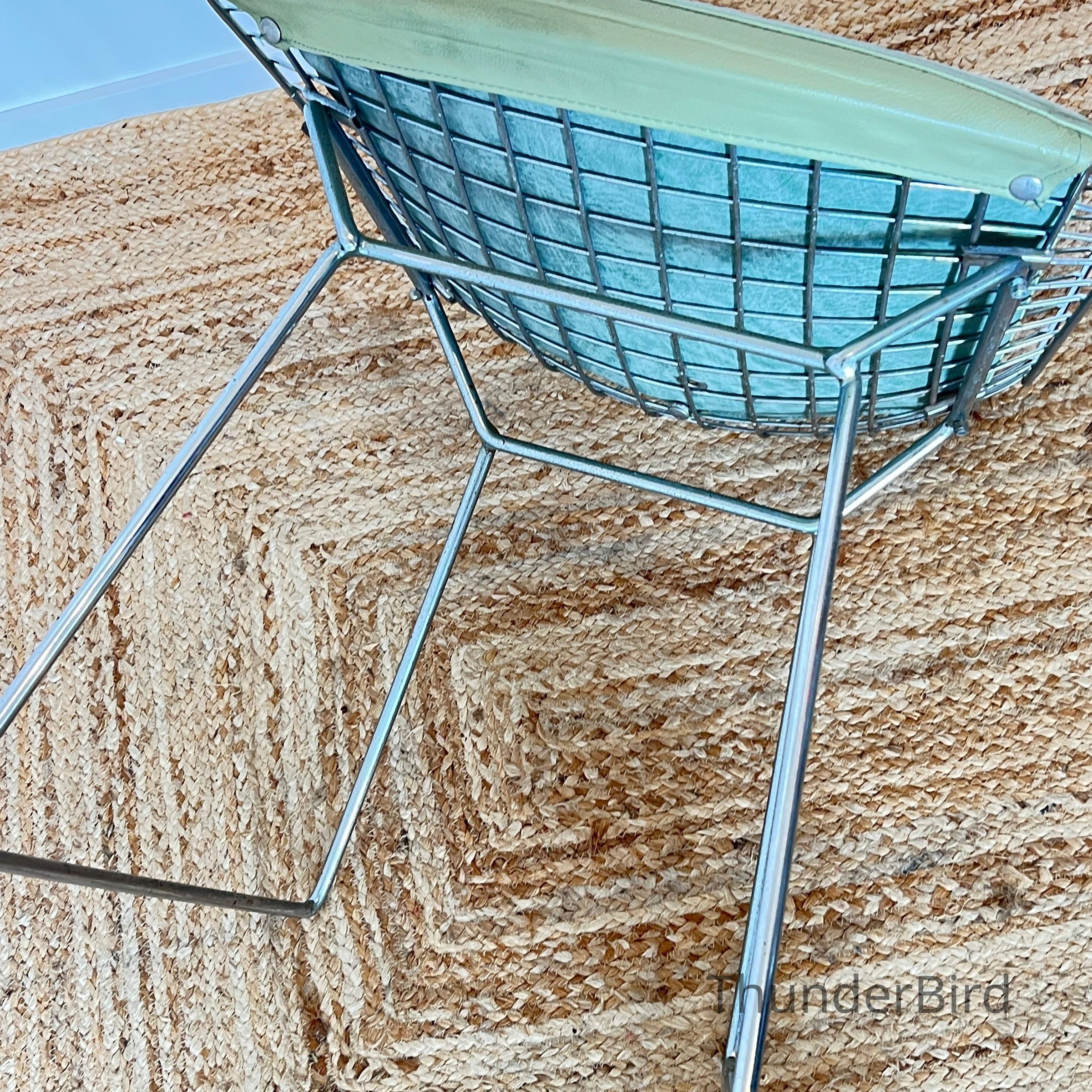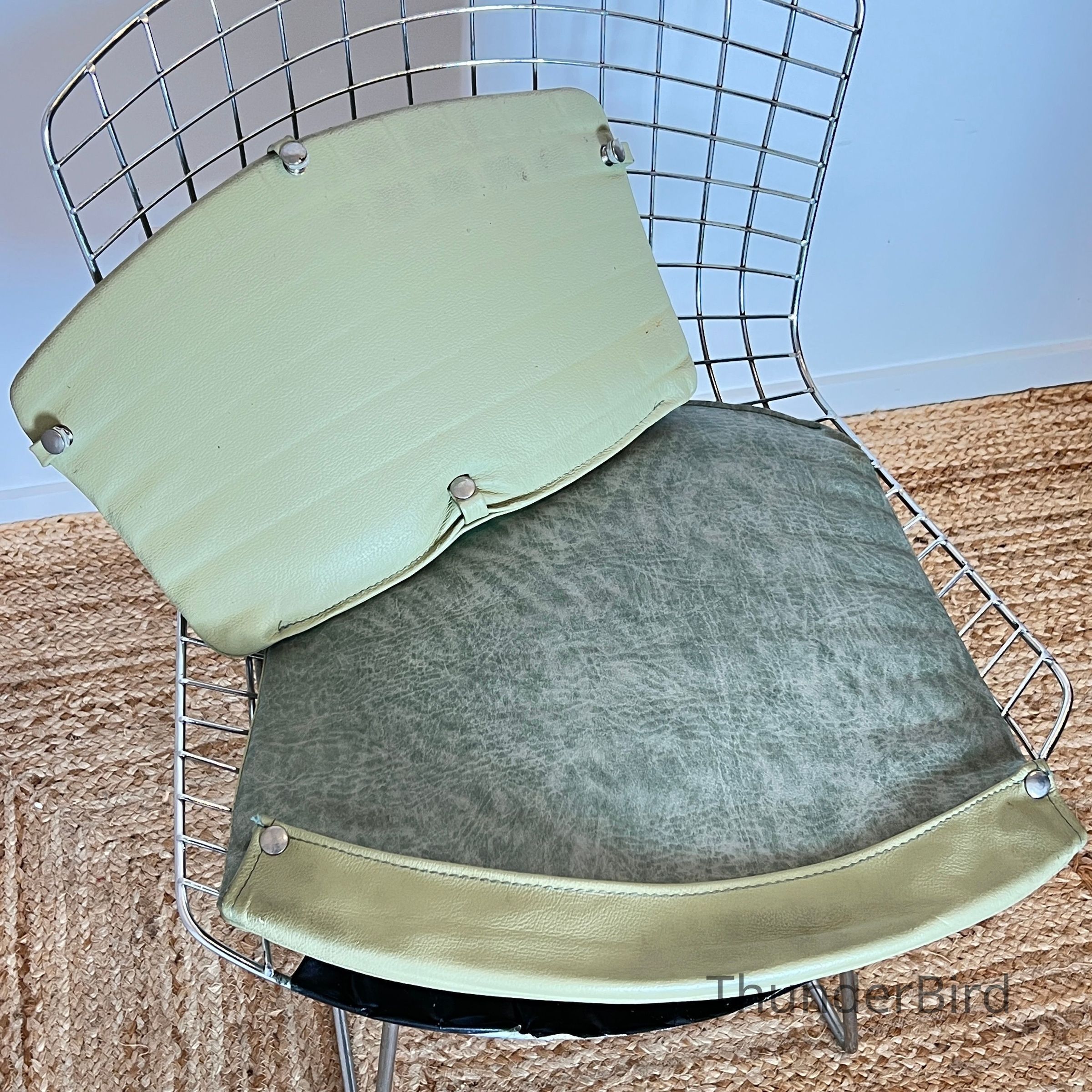 A set of five Bertoia Wire Side Chairs consistent with early 2000s Knoll-authorised production, originally retailed in New Zealand by Bromhead Design. These follow Harry Bertoia’s 1952 design, formed from a welded steel wire grid on a sled base. The construction details closely match known genuine examples from the period including the seat-basket form, wire pattern, weld structure, and base geometry. The original leather seat and back pads are included. A 2002 Bromhead Design clearance advert was found stored with one chair (!!), confirming the period availability of this model in New Zealand. These features collectively support authenticity.