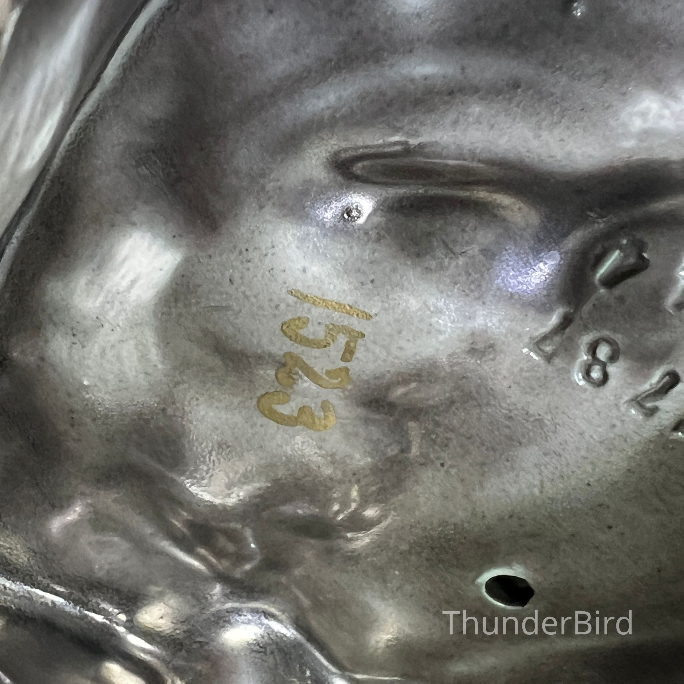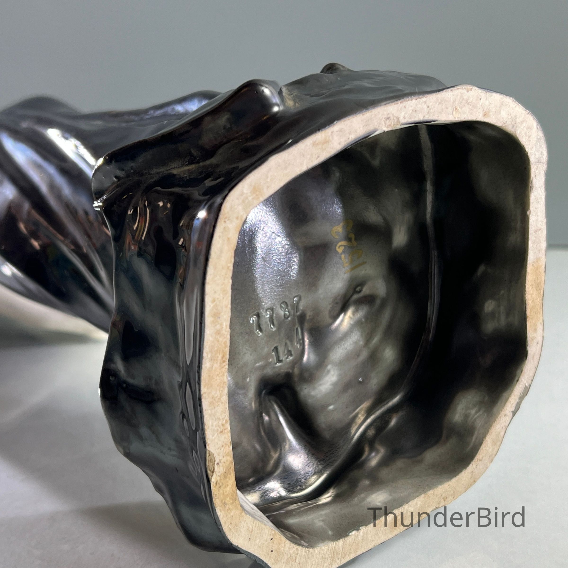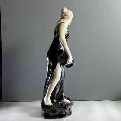 Beautifully modelled Art Nouveau ceramic figurine by Theodore Schoop, known for his sculptural work produced for European potteries in the early twentieth century. This elegant maiden carries a vessel at her side, her draped gown and flowing movement capturing the organic, graceful aesthetic of the Art Nouveau period. The striking black and ivory glaze accentuates the contrast between the figure’s form and the fluidity of the garment. The base carries impressed numbers and a faintly impressed T Schoop signature to the side below her foot, consistent with his lightly applied marks that often sit beneath the glaze.