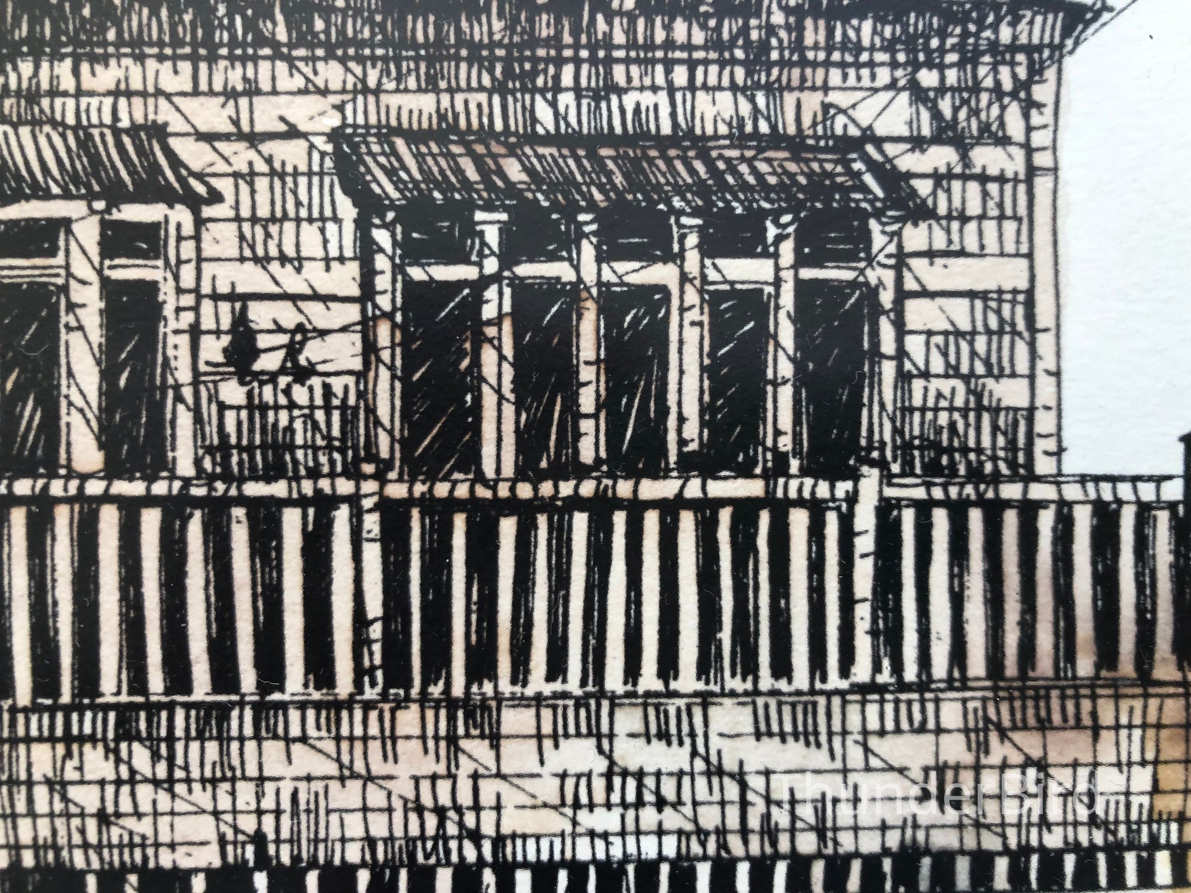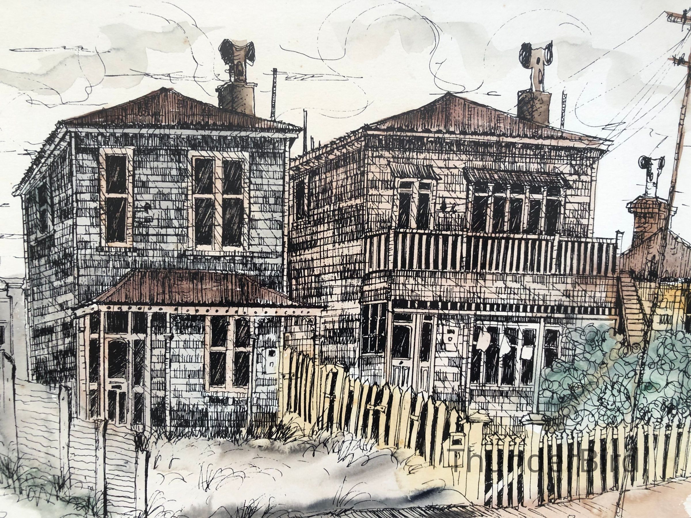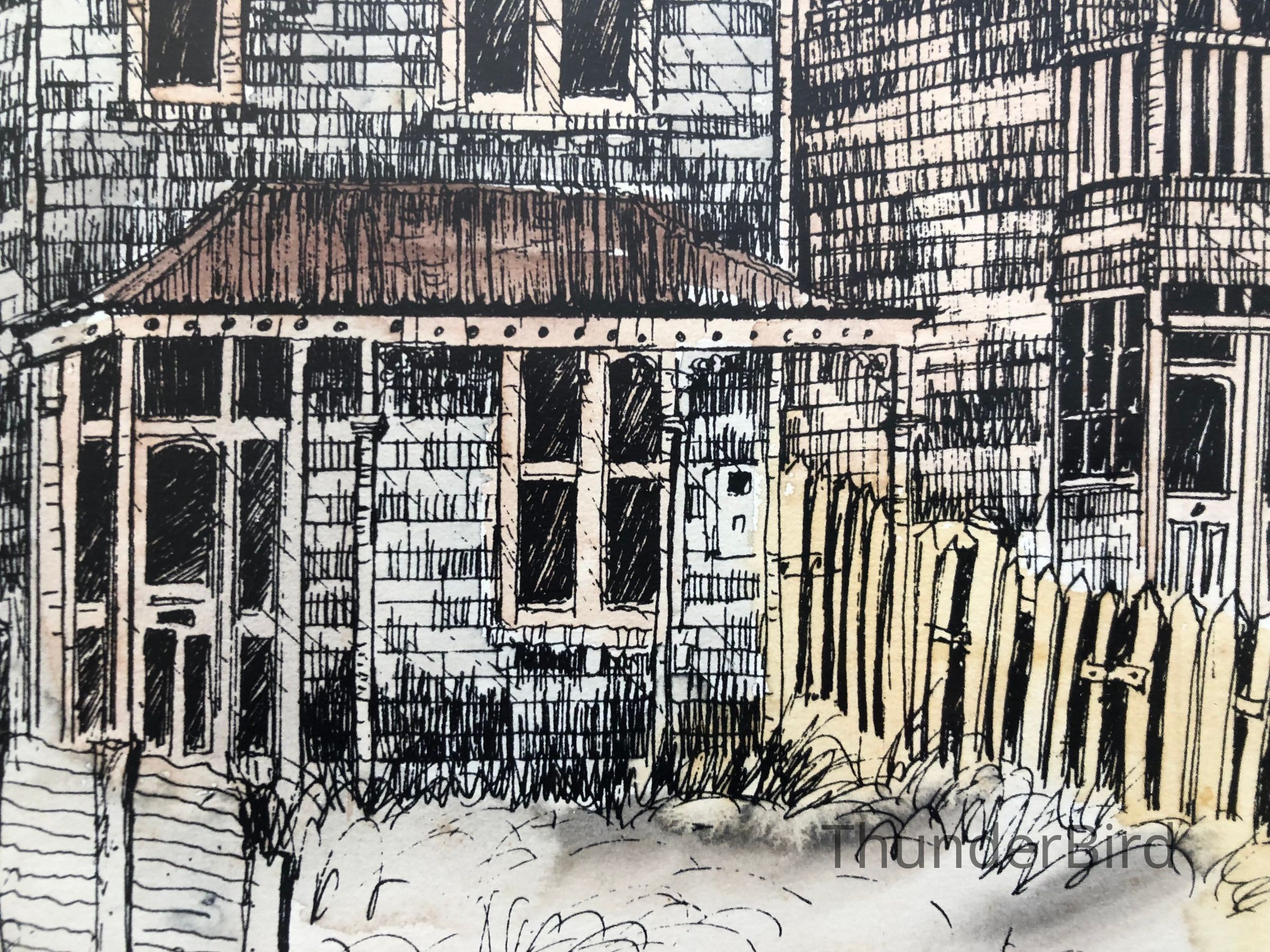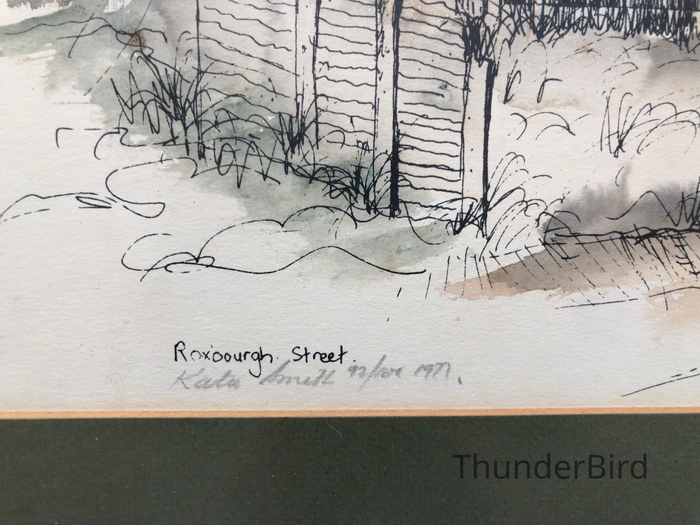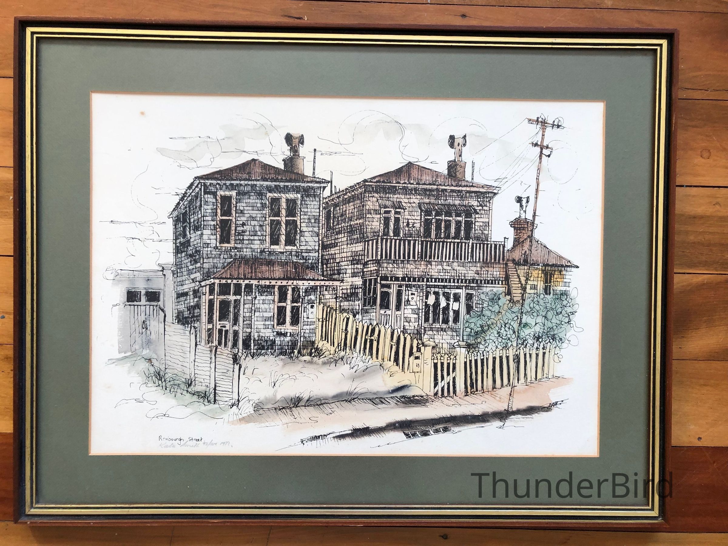 "Roxburgh Street" is a captivating hand-colored lithograph by Kate Smith, dated 1977. As piece number 92 of a limited edition of 187, it depicts a nostalgic New Zealand streetscape with a meticulous eye for detail. Smith's mastery is evident in the precise linework and the selective use of color, which breathes life into the urban scene. This artwork is not only a visual pleasure but also a historical snapshot of architectural elegance.