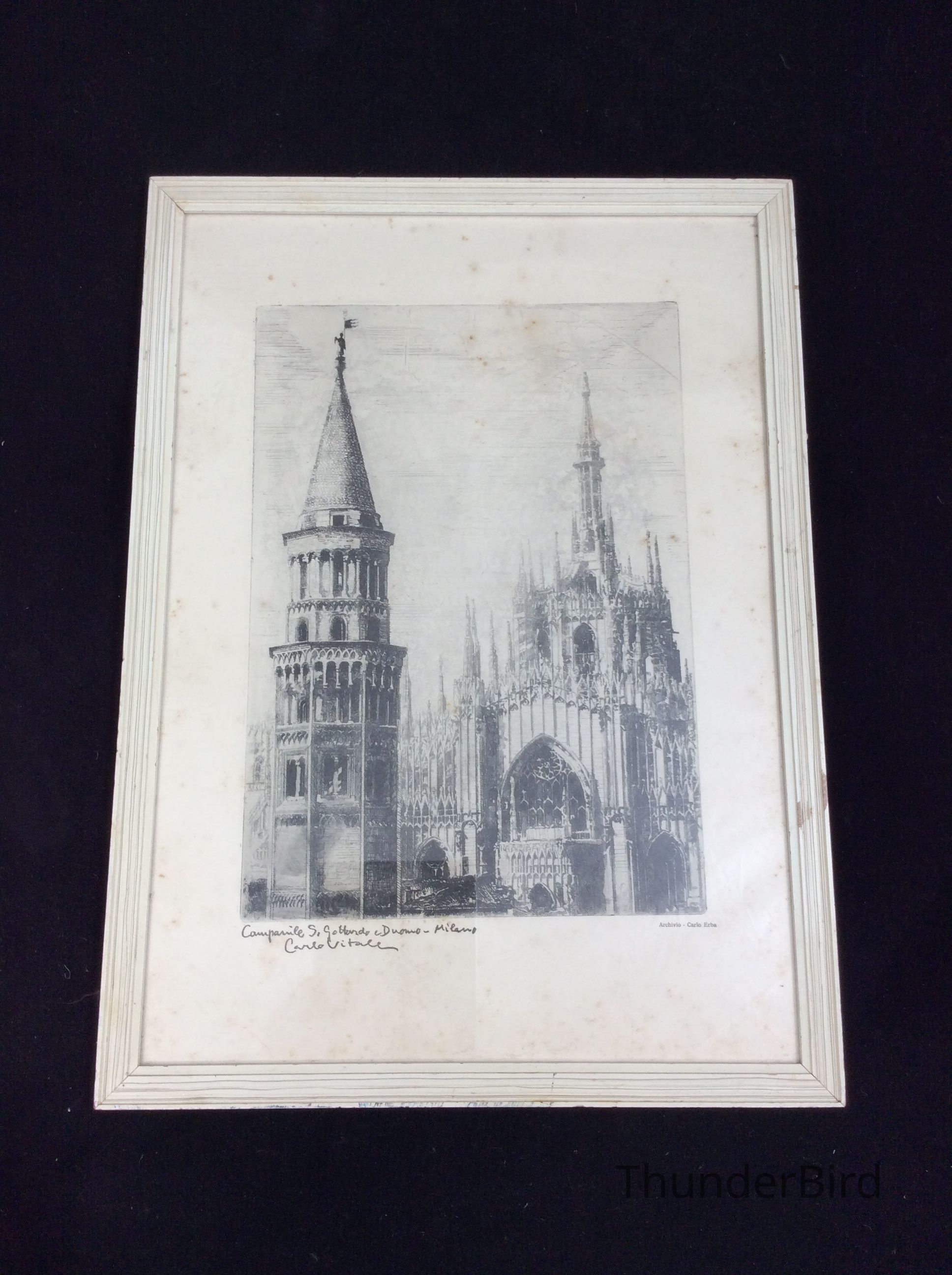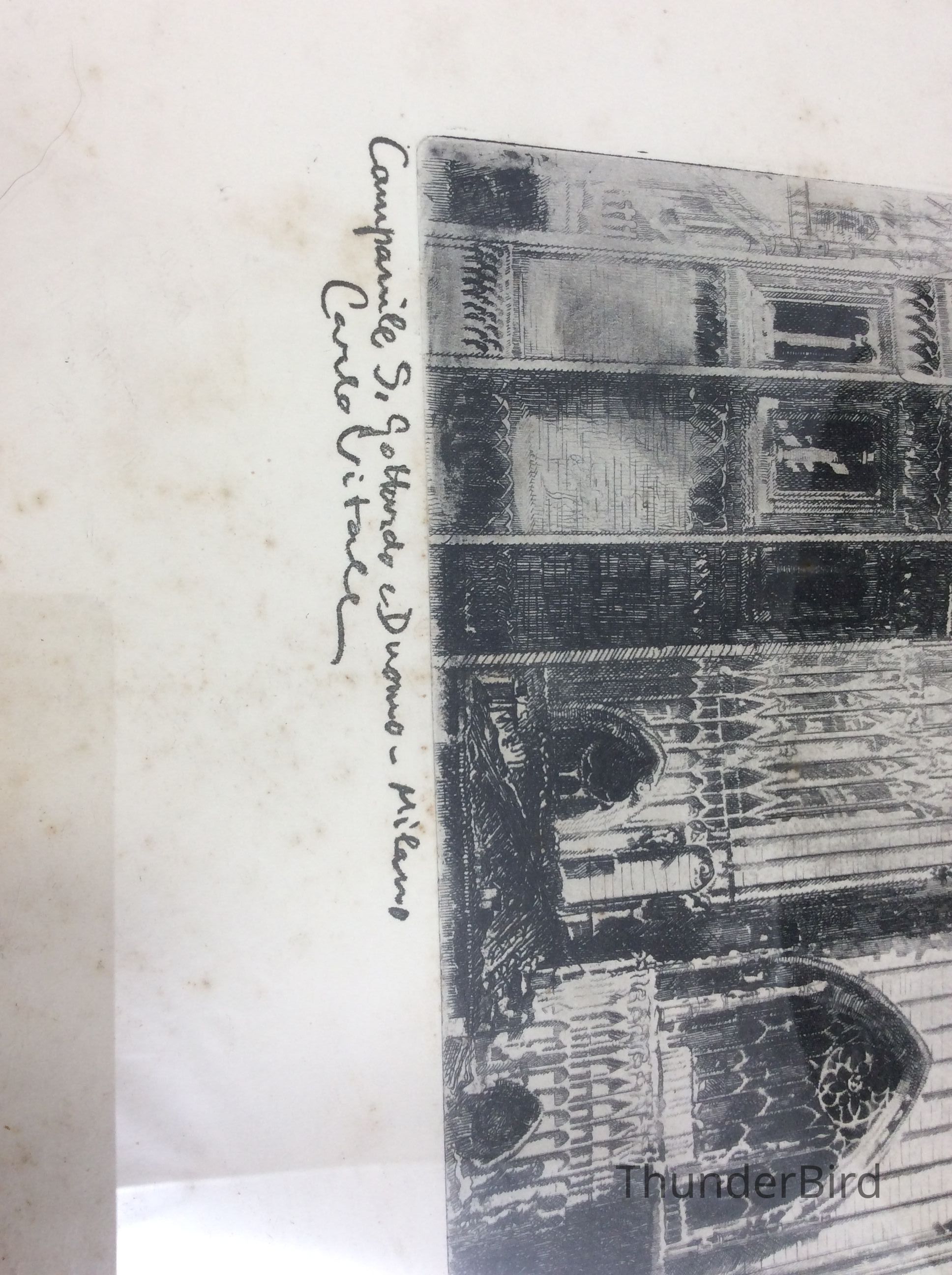 Carlo Vitale's gravure, "San Ambrogio, Milano," is a fine representation of the artist's meticulous skill and devotion to detail, capturing the essence of the iconic basilica. The piece eloquently conveys the architectural majesty and spiritual ambiance of this historic Milanese landmark, resonating with the deep cultural and religious roots of Italy.