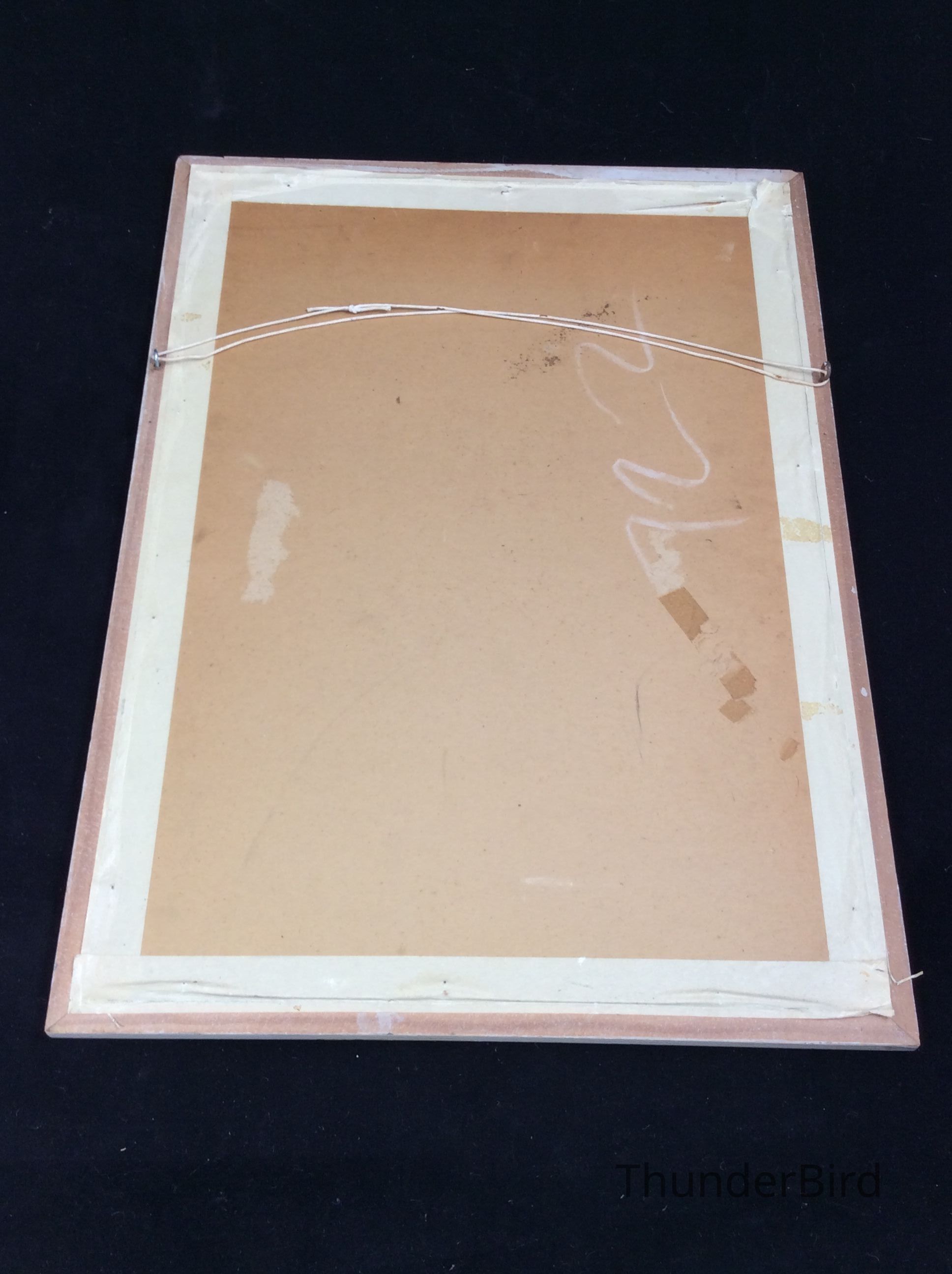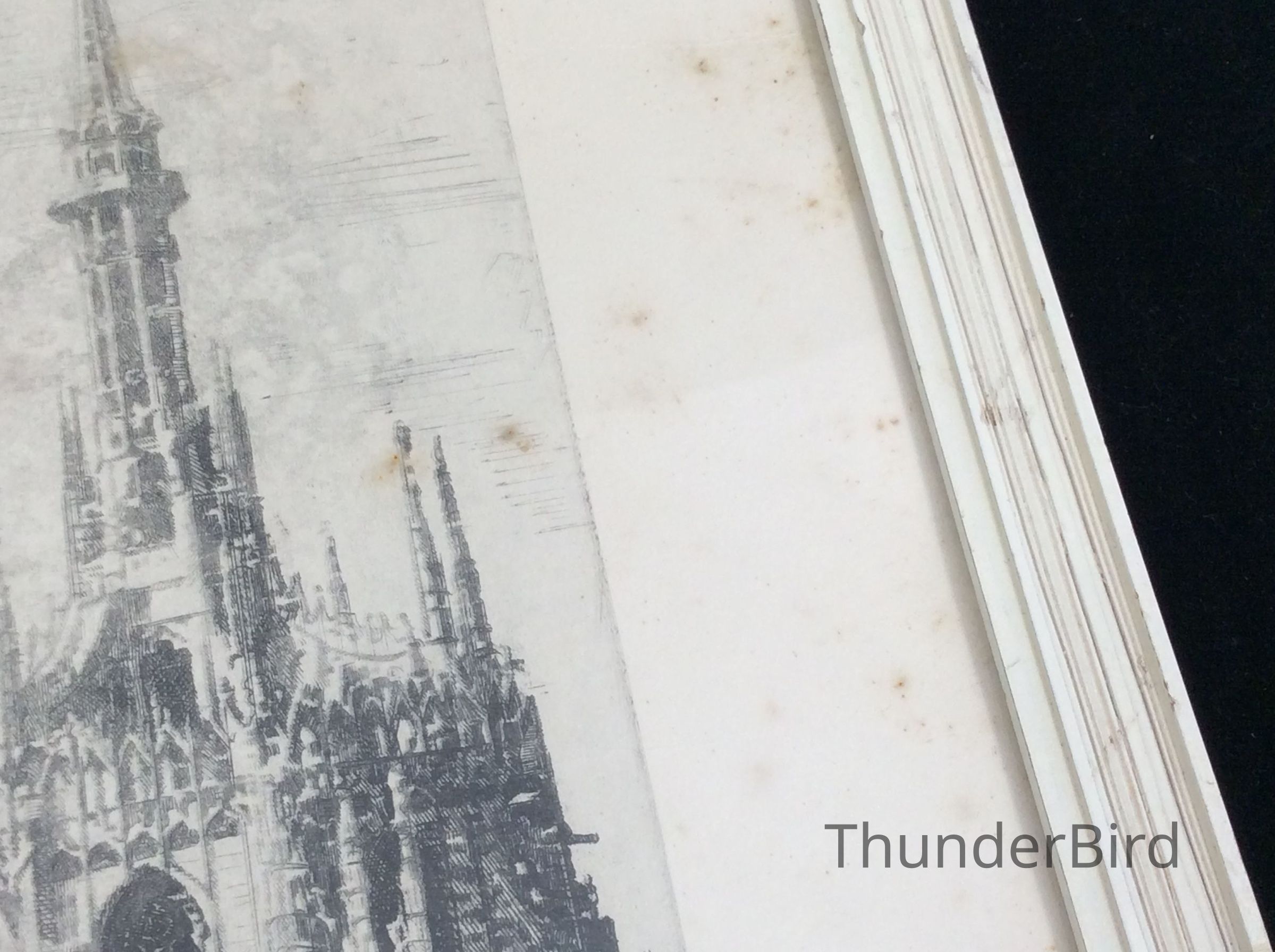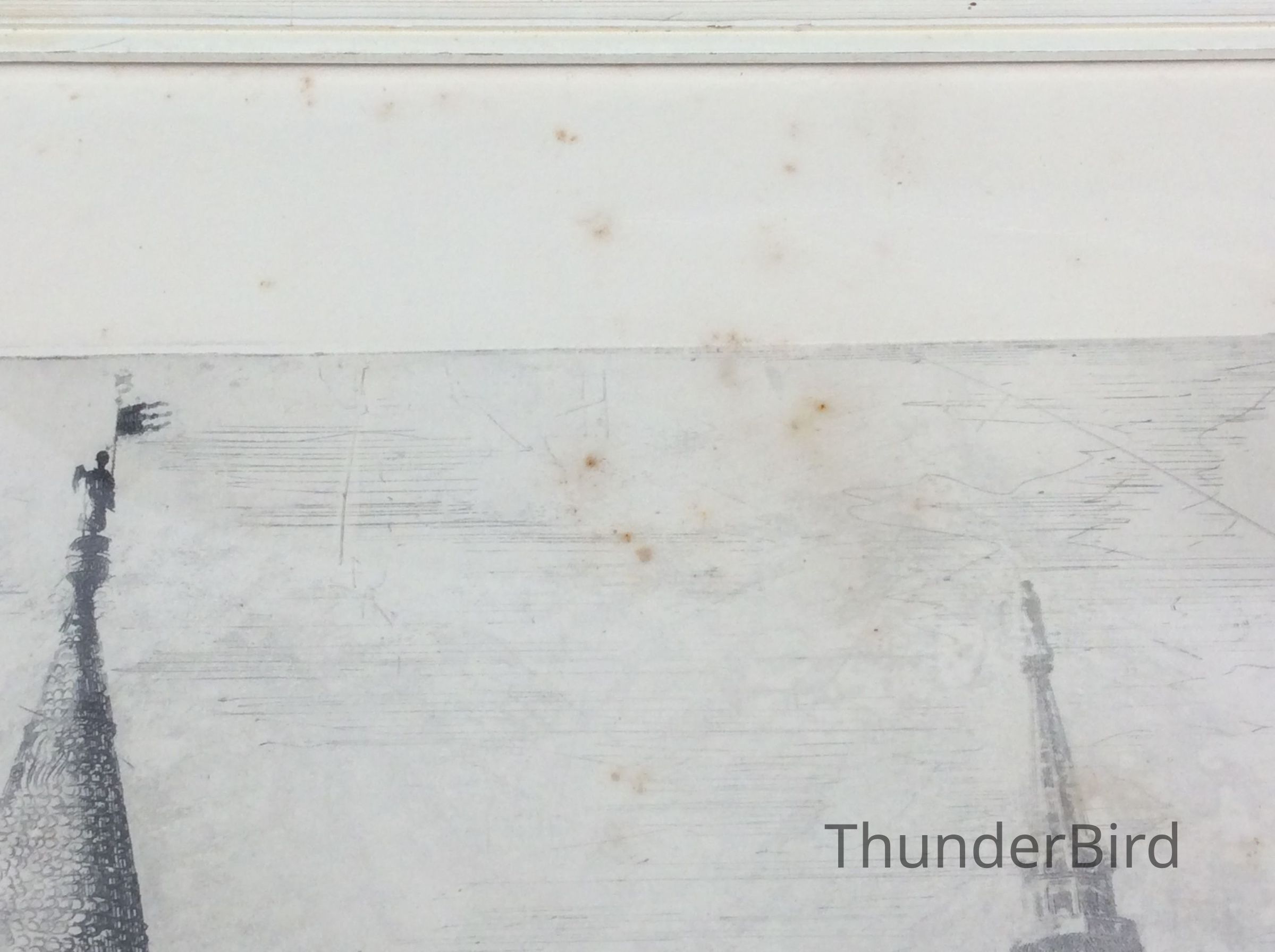 The artwork is set behind glass, preserving its delicate gravure lines and shading. Notable foxing on the paper is present, indicative of its age.
