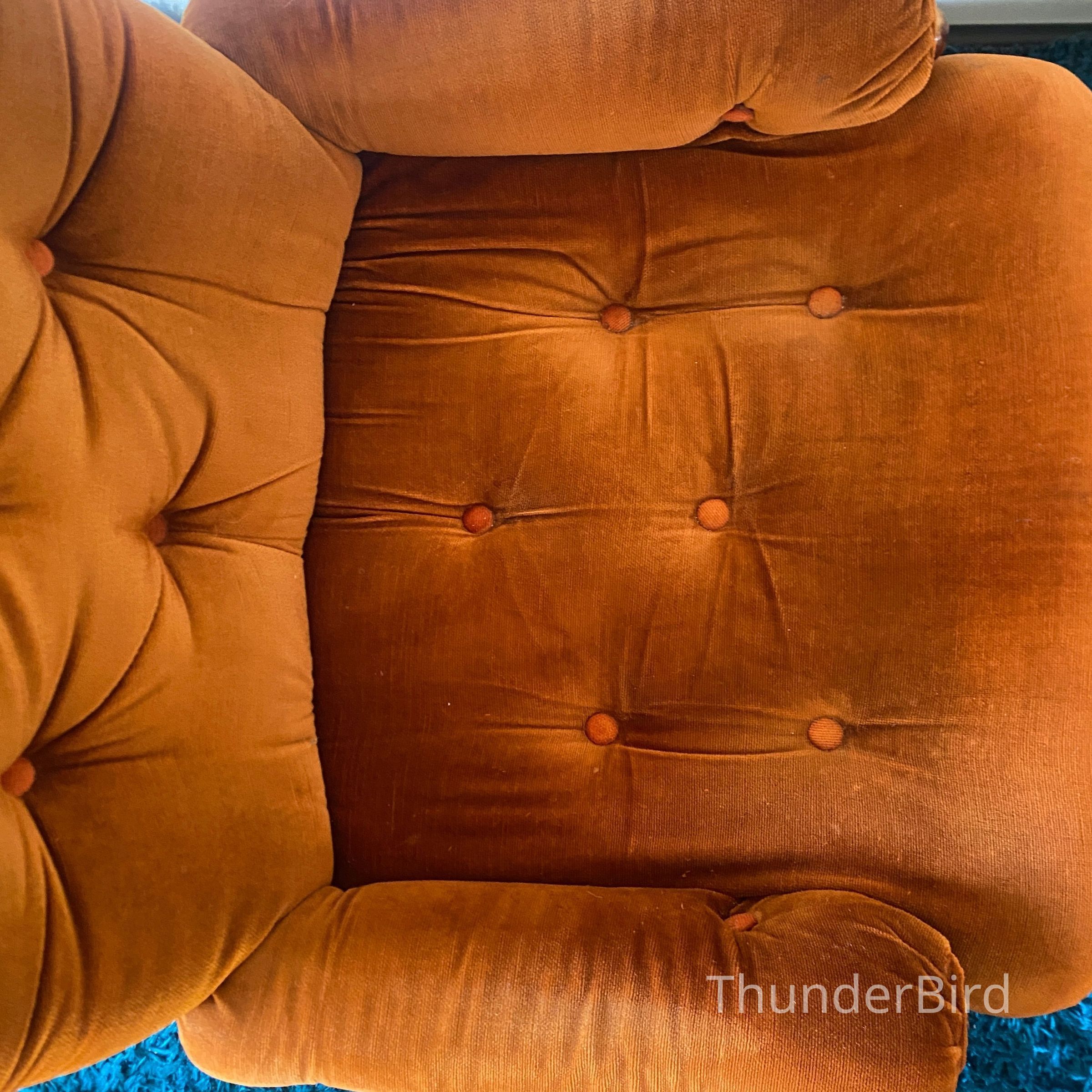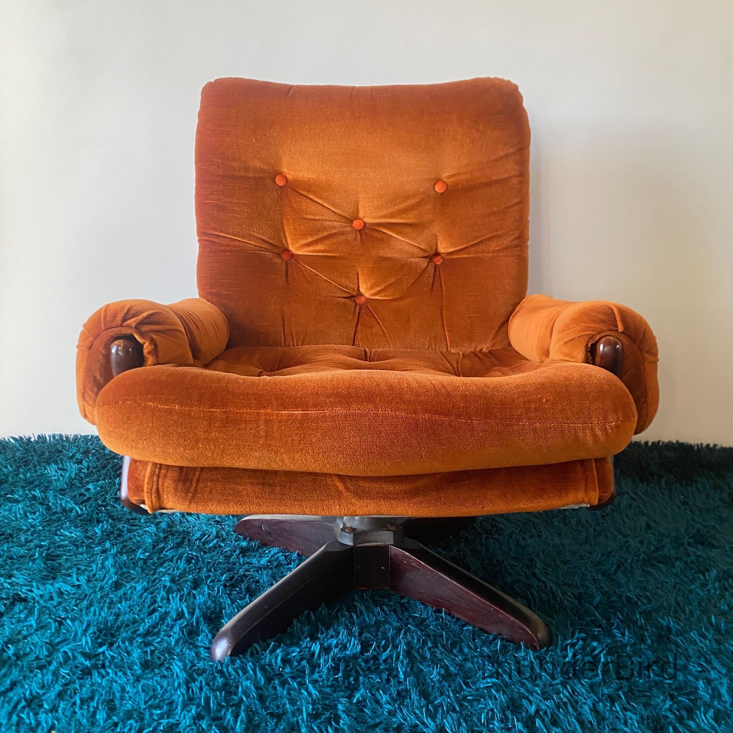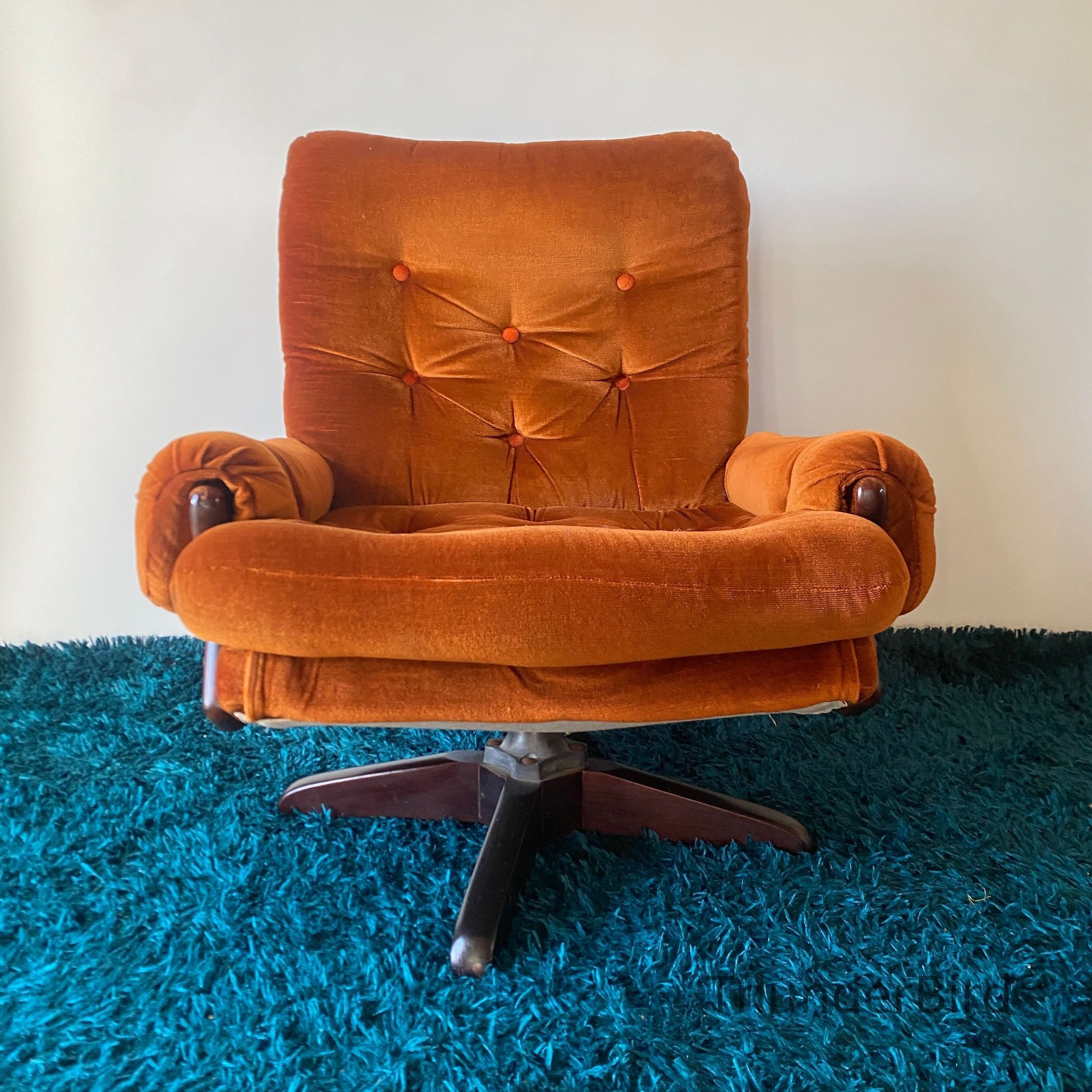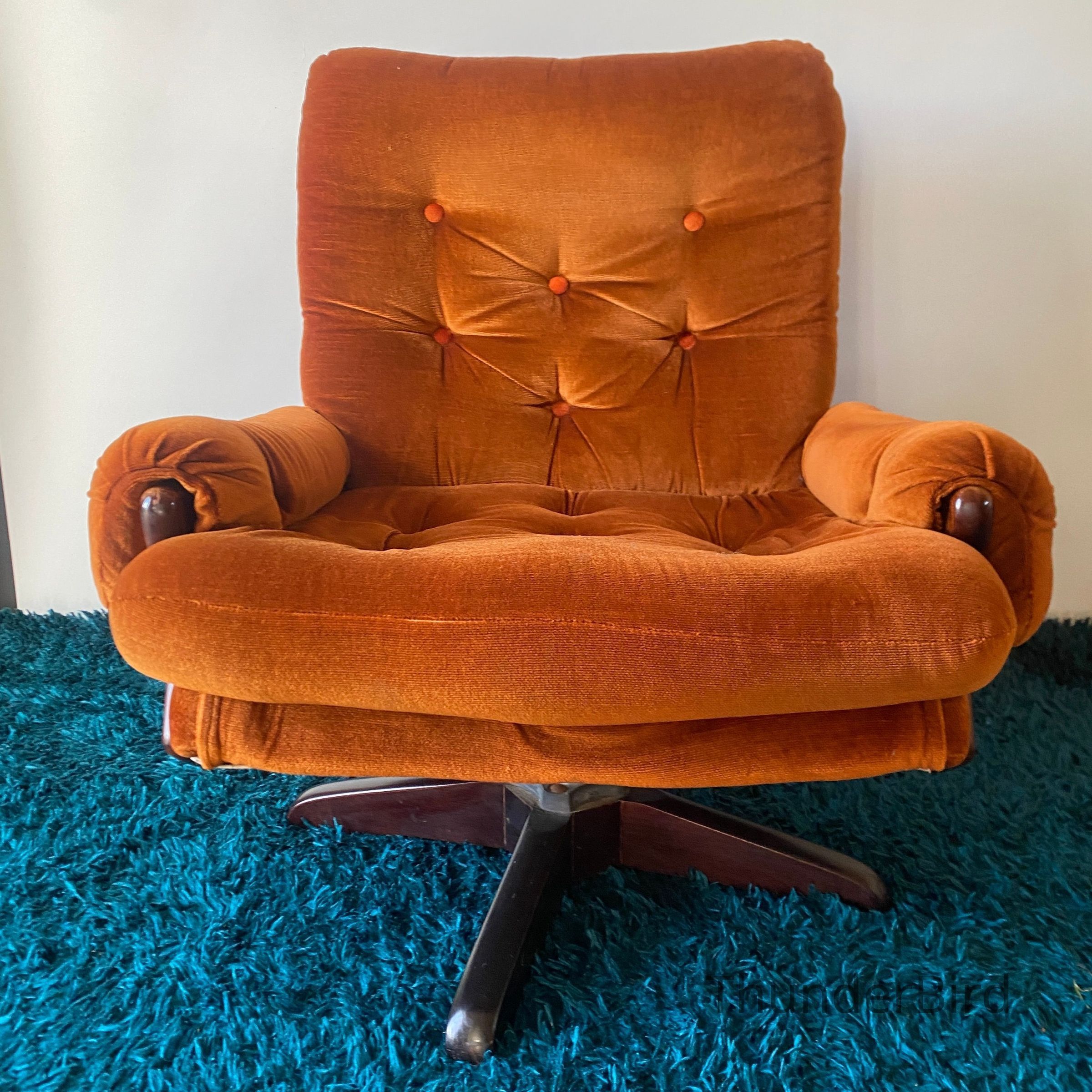 This striking mid-century swivel lounge chair dates from the 1970s. Upholstered in a rich burnt orange velour, the chair features a deep, button-tufted backrest, generous cushioning, and classic scrolled arms with exposed wooden caps. The sturdy wooden swivel & tilting base adds both function and form, allowing for 360-degree rotation. Likely New Zealand-made, this piece reflects the influence of Parker or similar period manufacturers. Highly collectible and increasingly sought after in retro interiors.