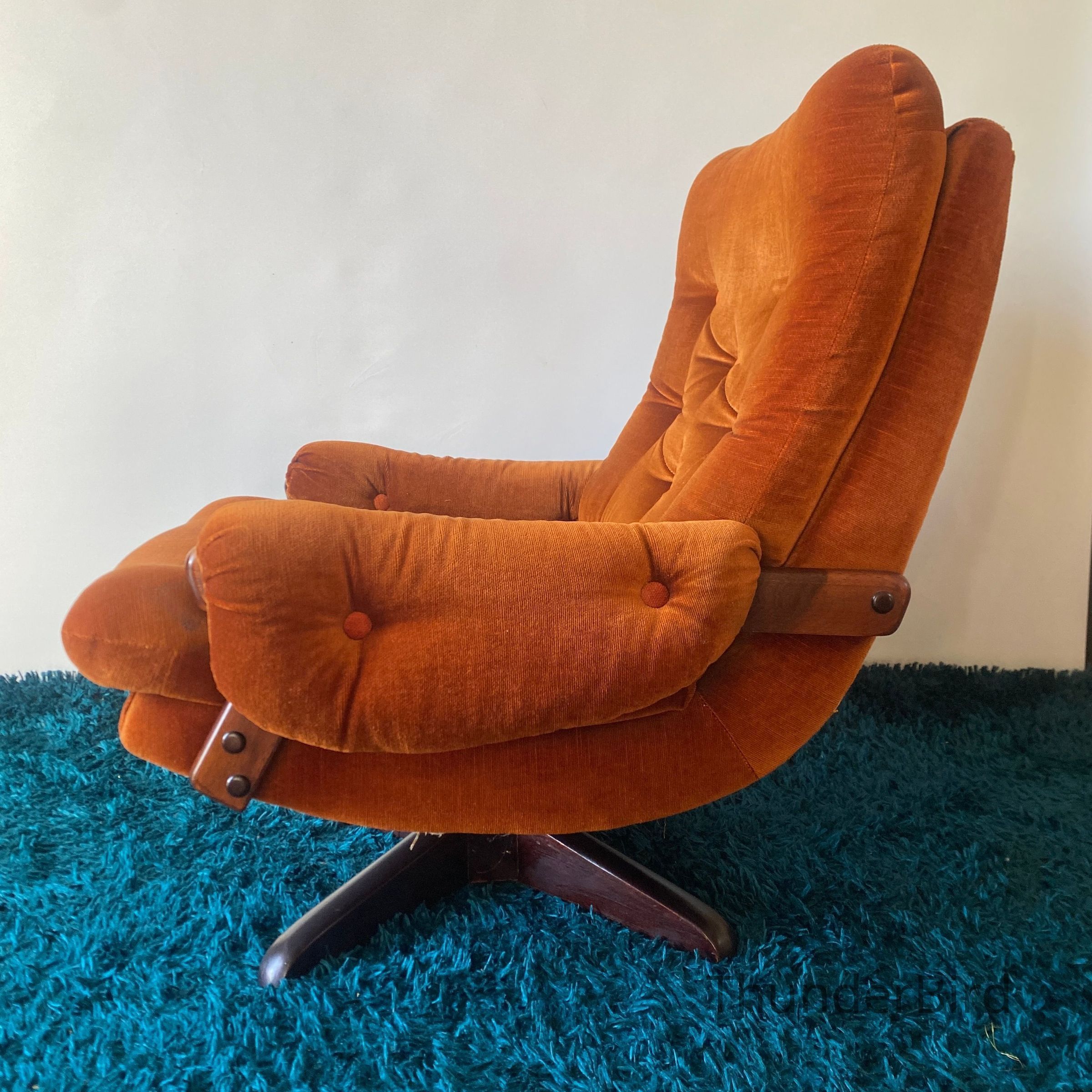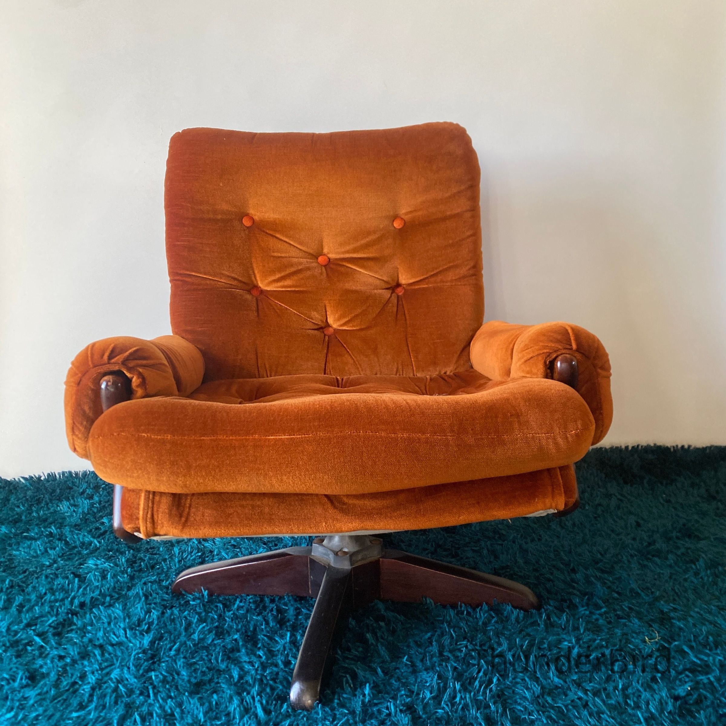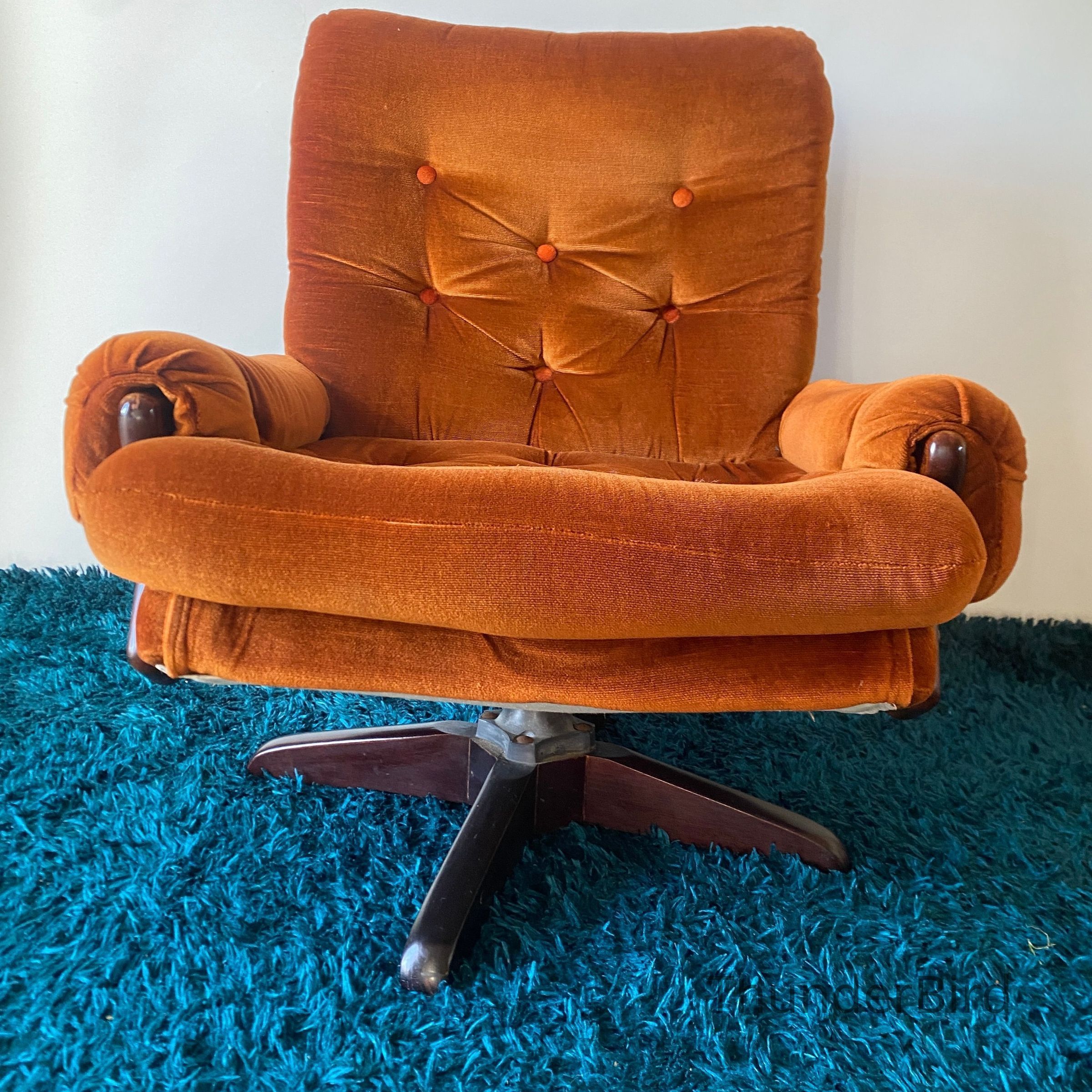 This striking mid-century swivel lounge chair dates from the 1970s. Upholstered in a rich burnt orange velour, the chair features a deep, button-tufted backrest, generous cushioning, and classic scrolled arms with exposed wooden caps. The sturdy wooden swivel & tilting base adds both function and form, allowing for 360-degree rotation. Likely New Zealand-made, this piece reflects the influence of Parker or similar period manufacturers. Highly collectible and increasingly sought after in retro interiors.