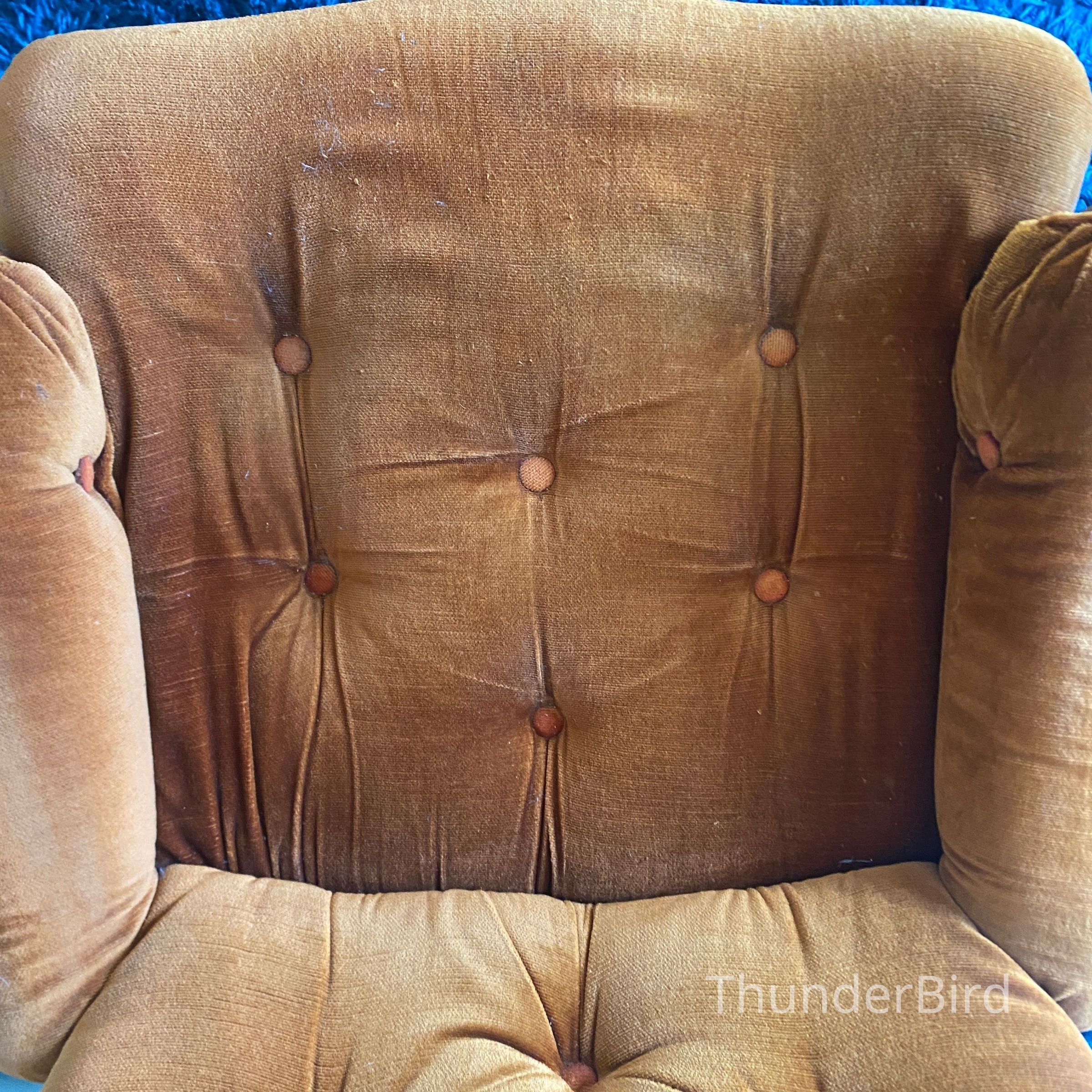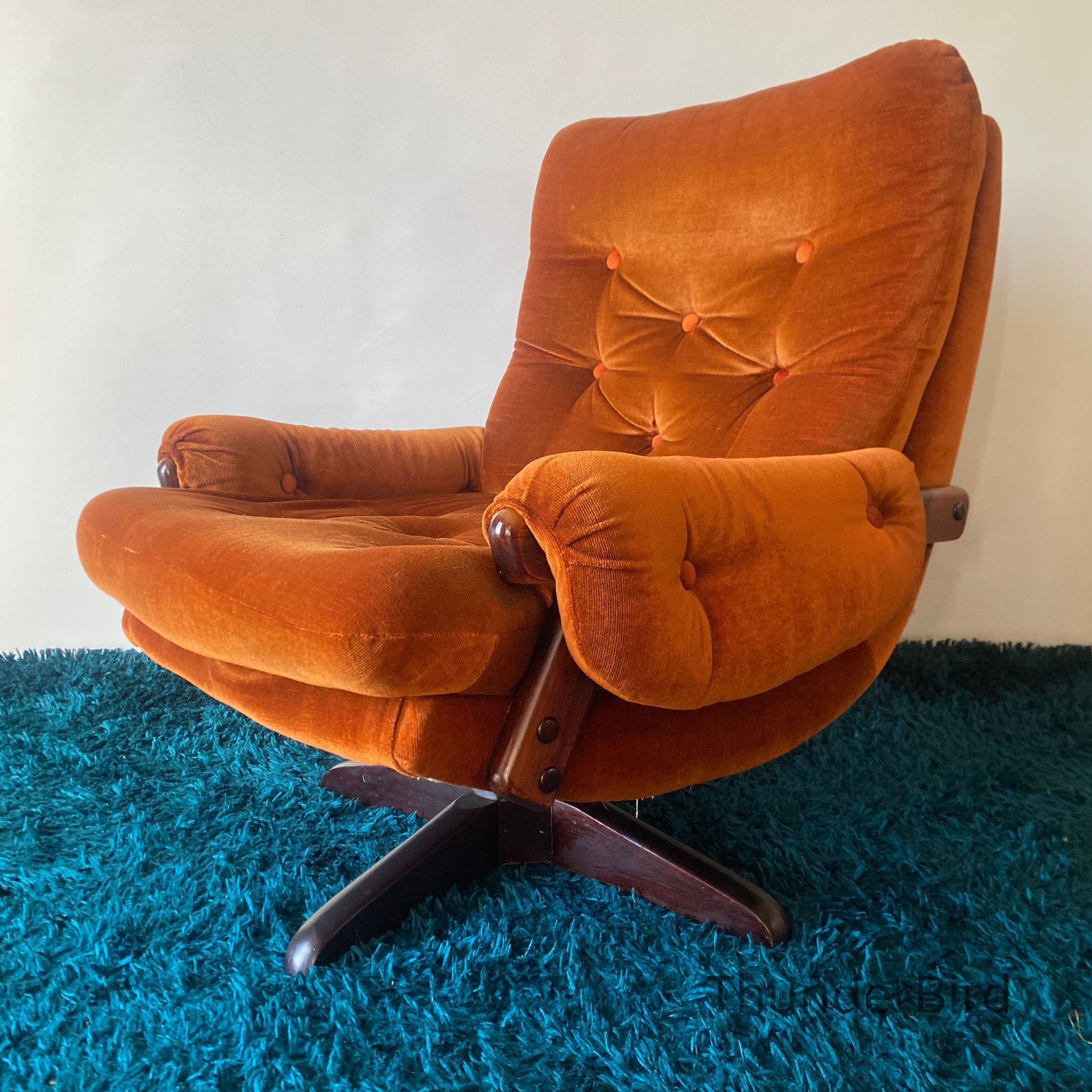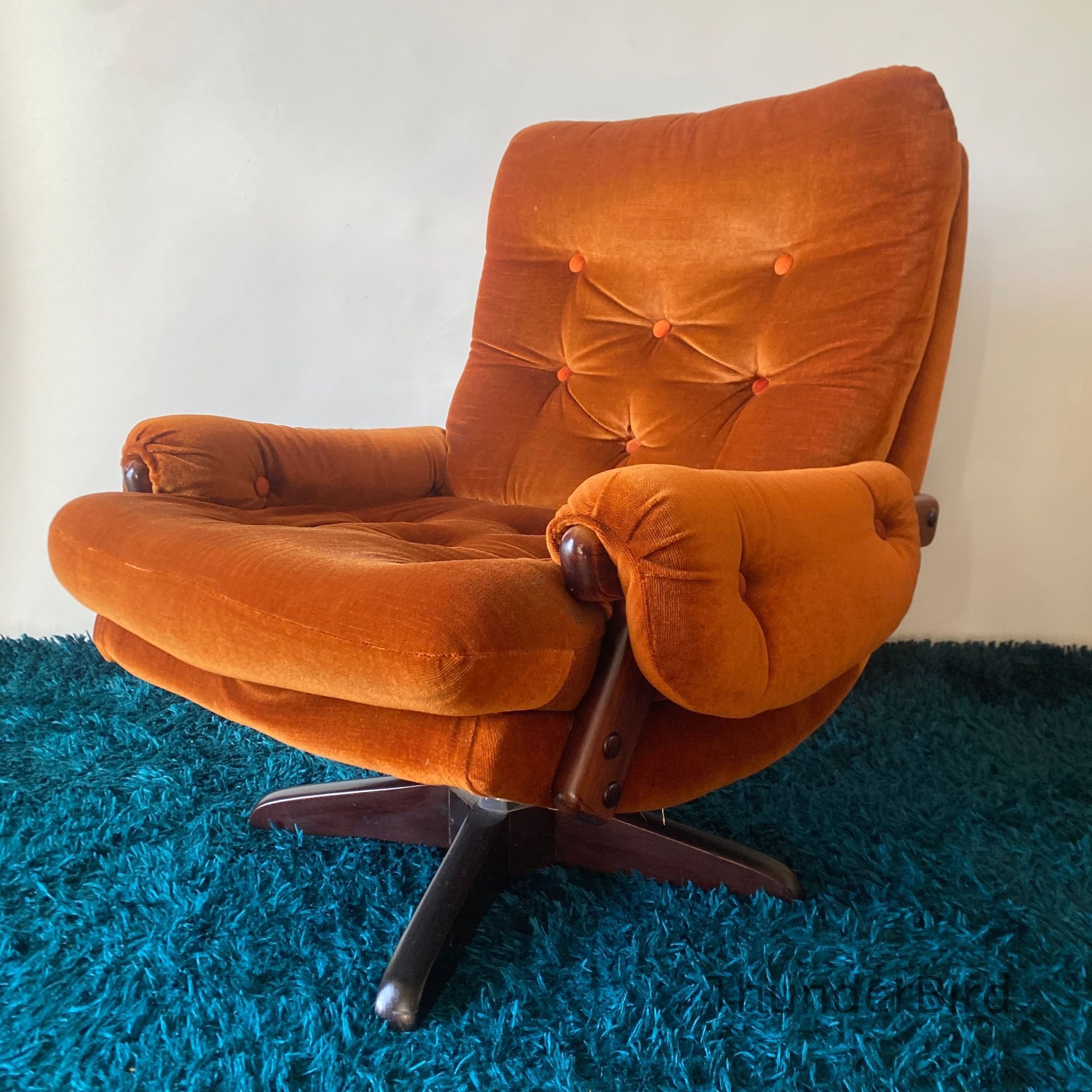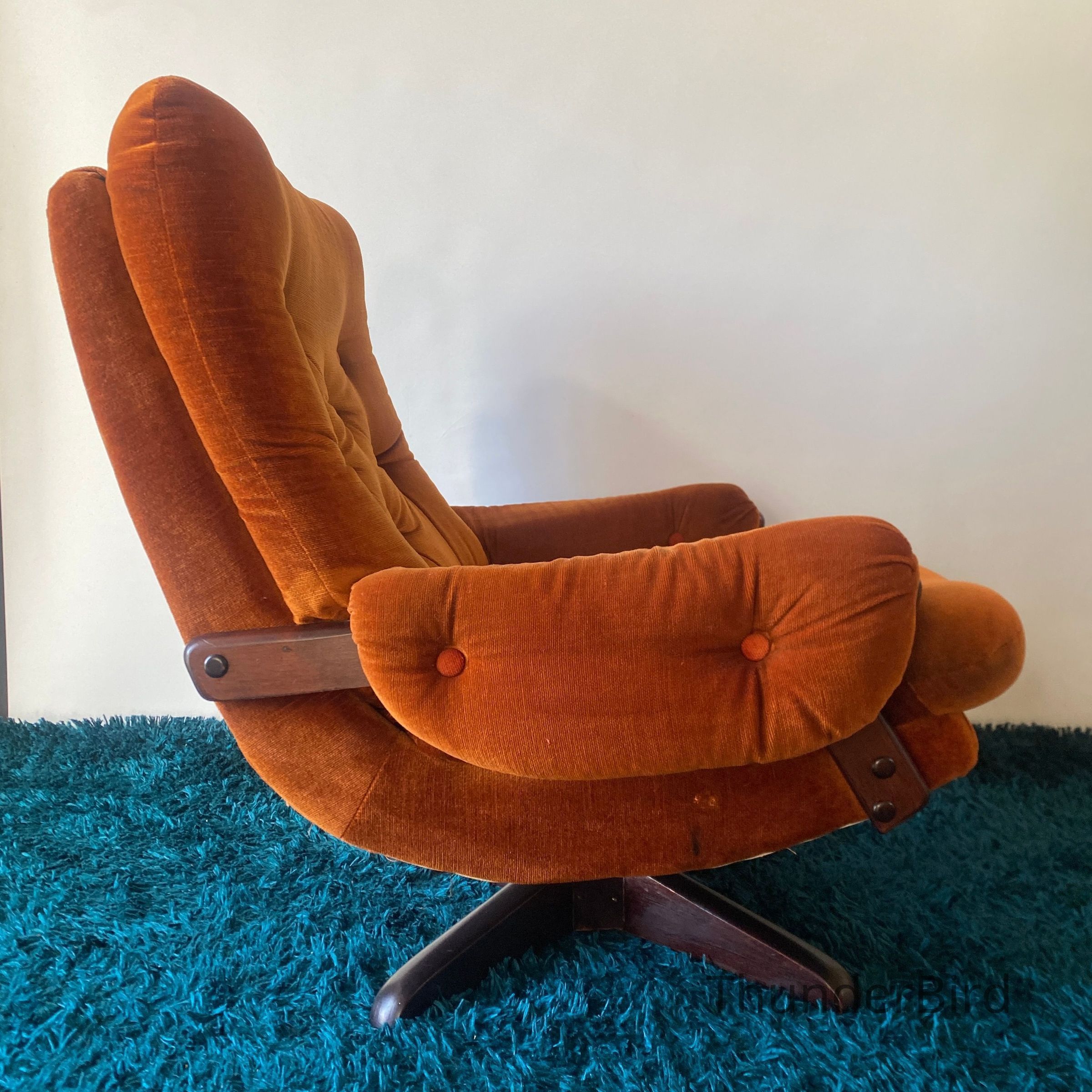 This striking mid-century swivel lounge chair dates from the 1970s. Upholstered in a rich burnt orange velour, the chair features a deep, button-tufted backrest, generous cushioning, and classic scrolled arms with exposed wooden caps. The sturdy wooden swivel & tilting base adds both function and form, allowing for 360-degree rotation. Likely New Zealand-made, this piece reflects the influence of Parker or similar period manufacturers. Highly collectible and increasingly sought after in retro interiors.