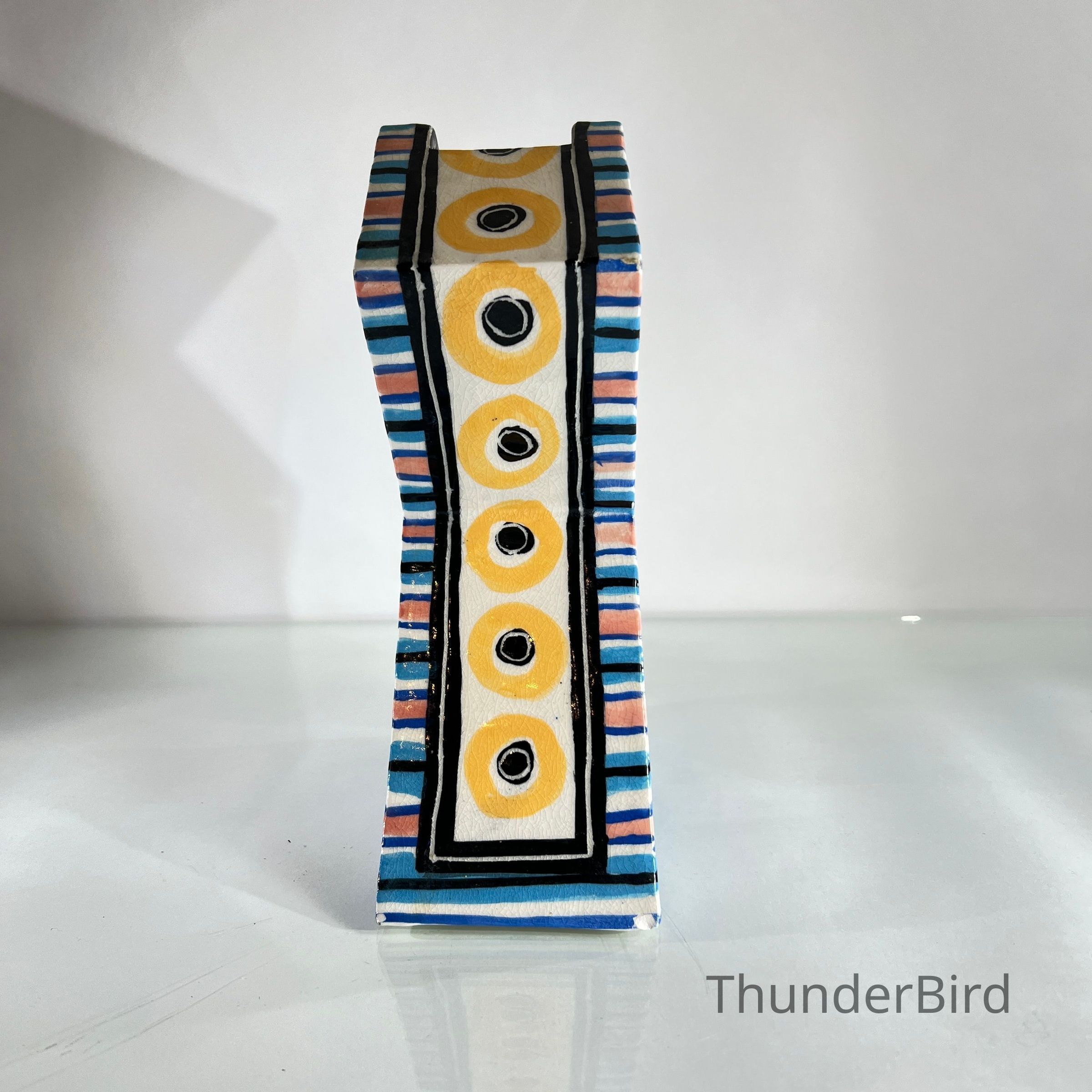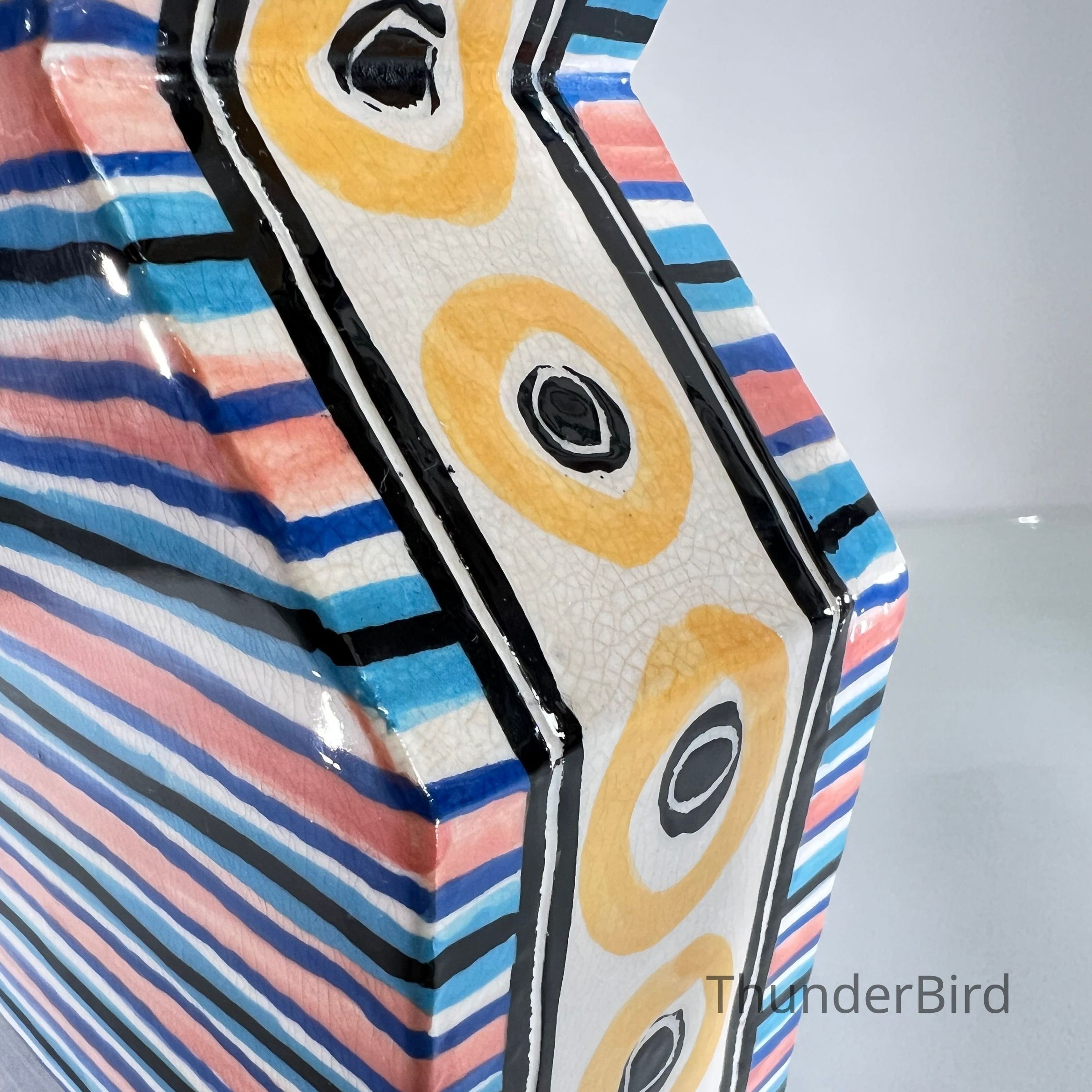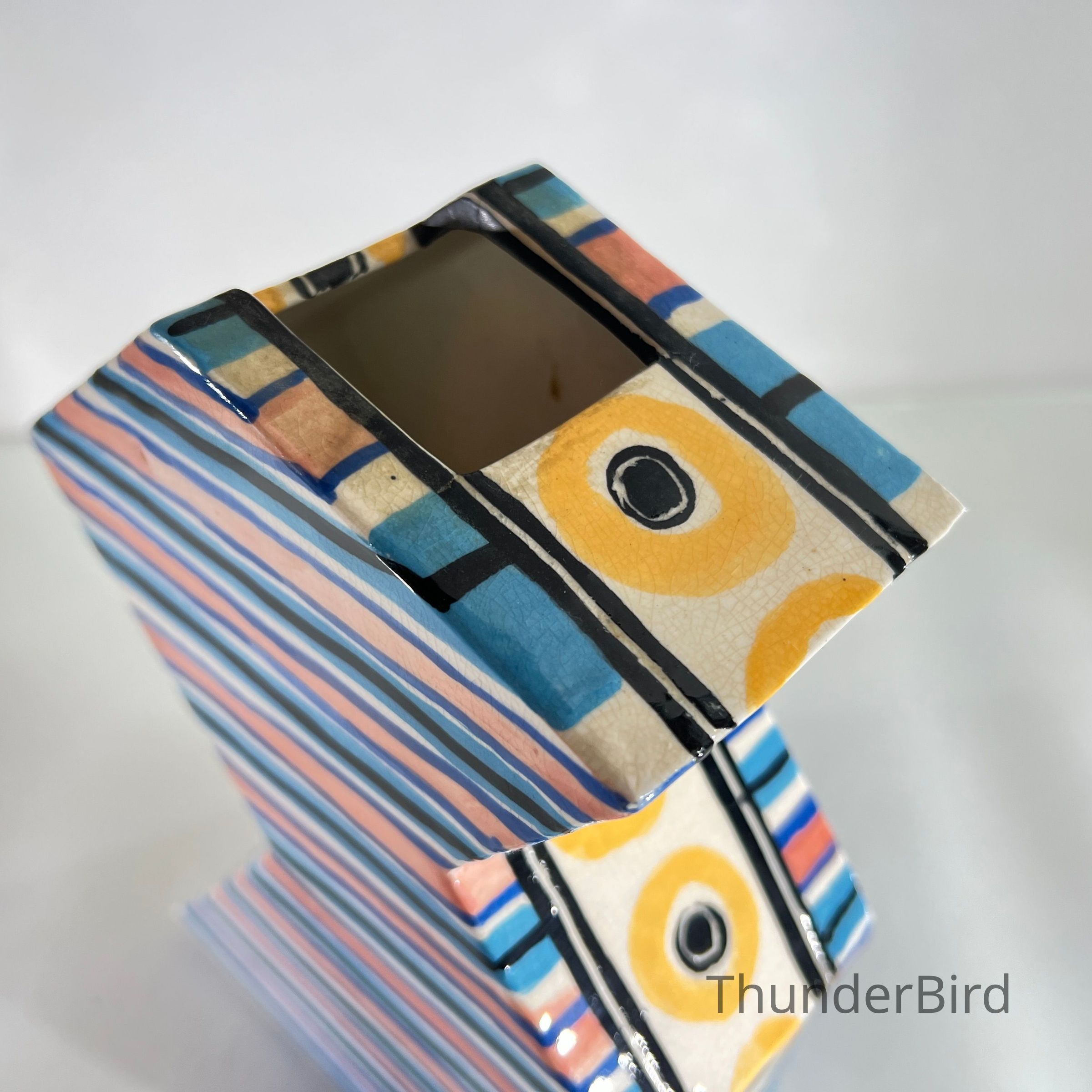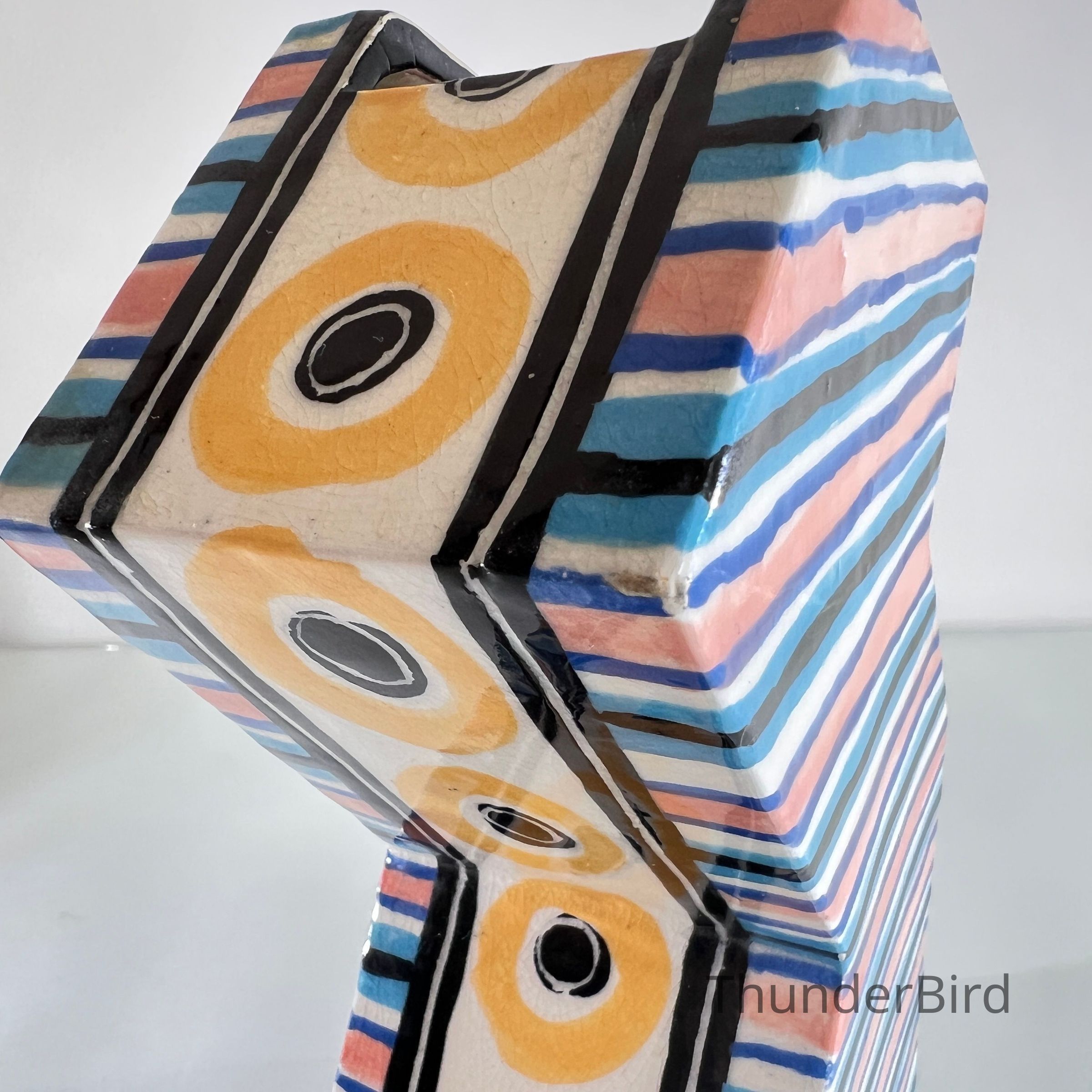 A striking postmodern ceramic vase with a bold angular zigzag silhouette, evocative of the Memphis Milano movement. Decorated with hand-painted striped and circular motifs in vivid colourways, this sculptural piece captures the energetic aesthetic of 1980s avant-garde Italian design. Likely a studio or art pottery production from the late 20th century. Displays beautifully as a statement object.