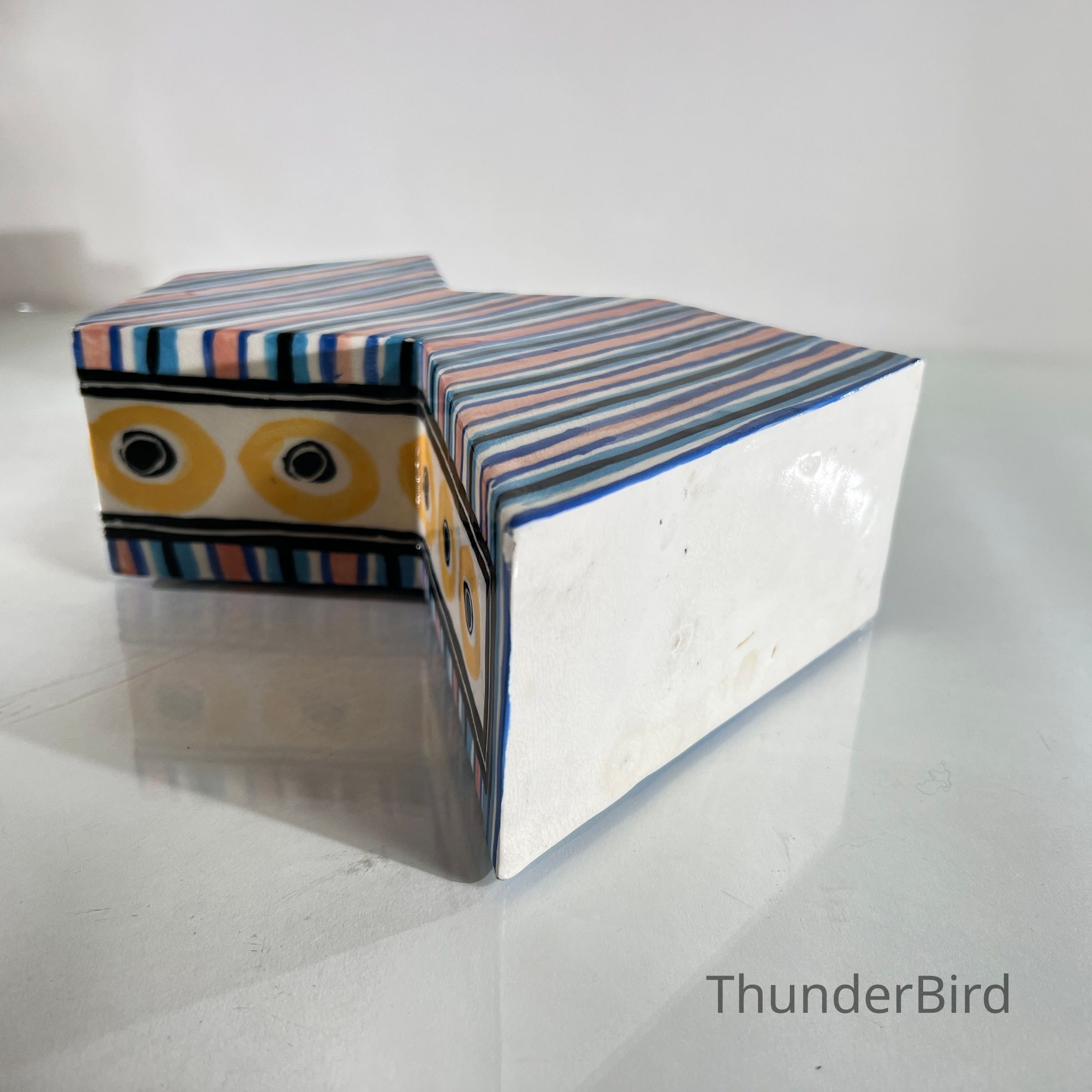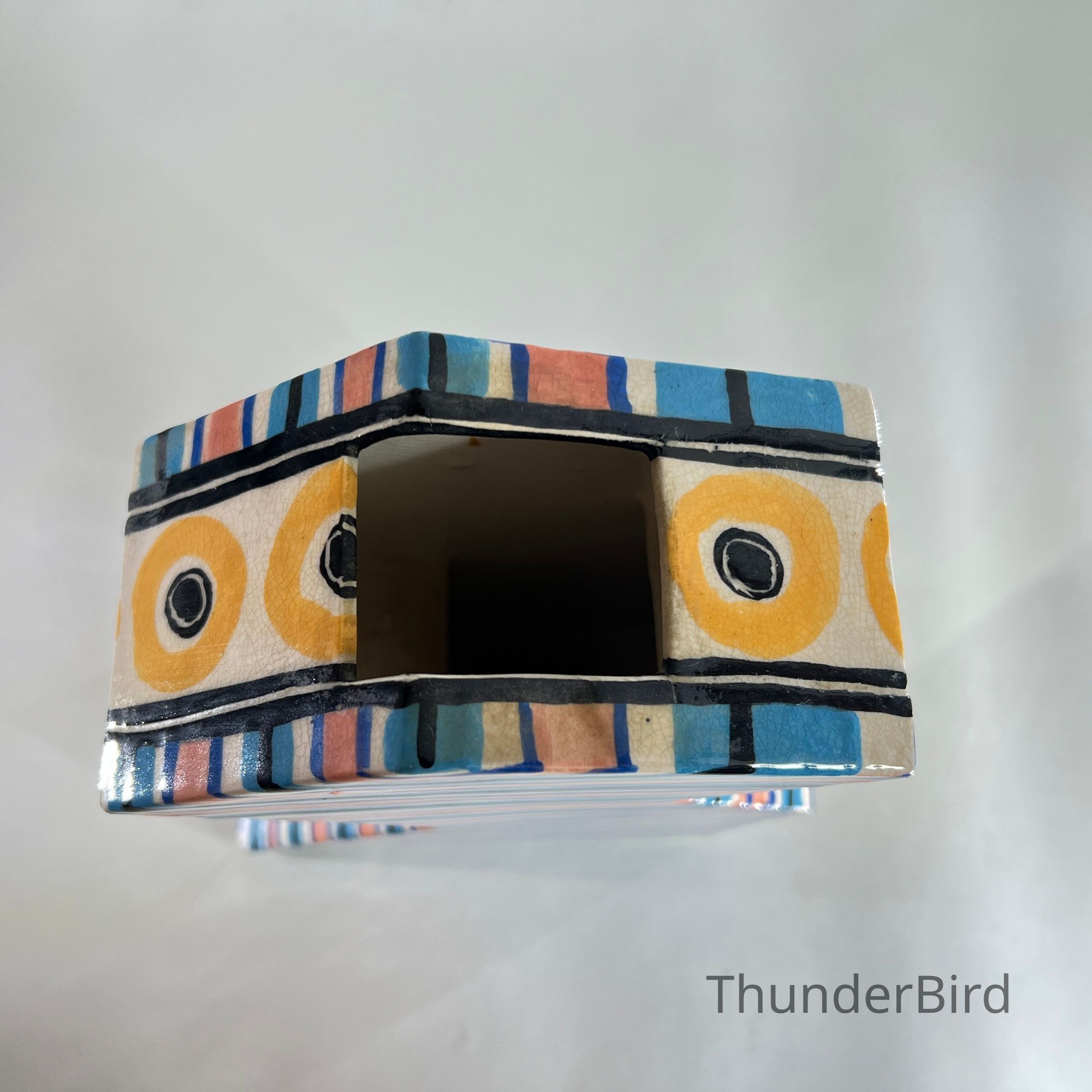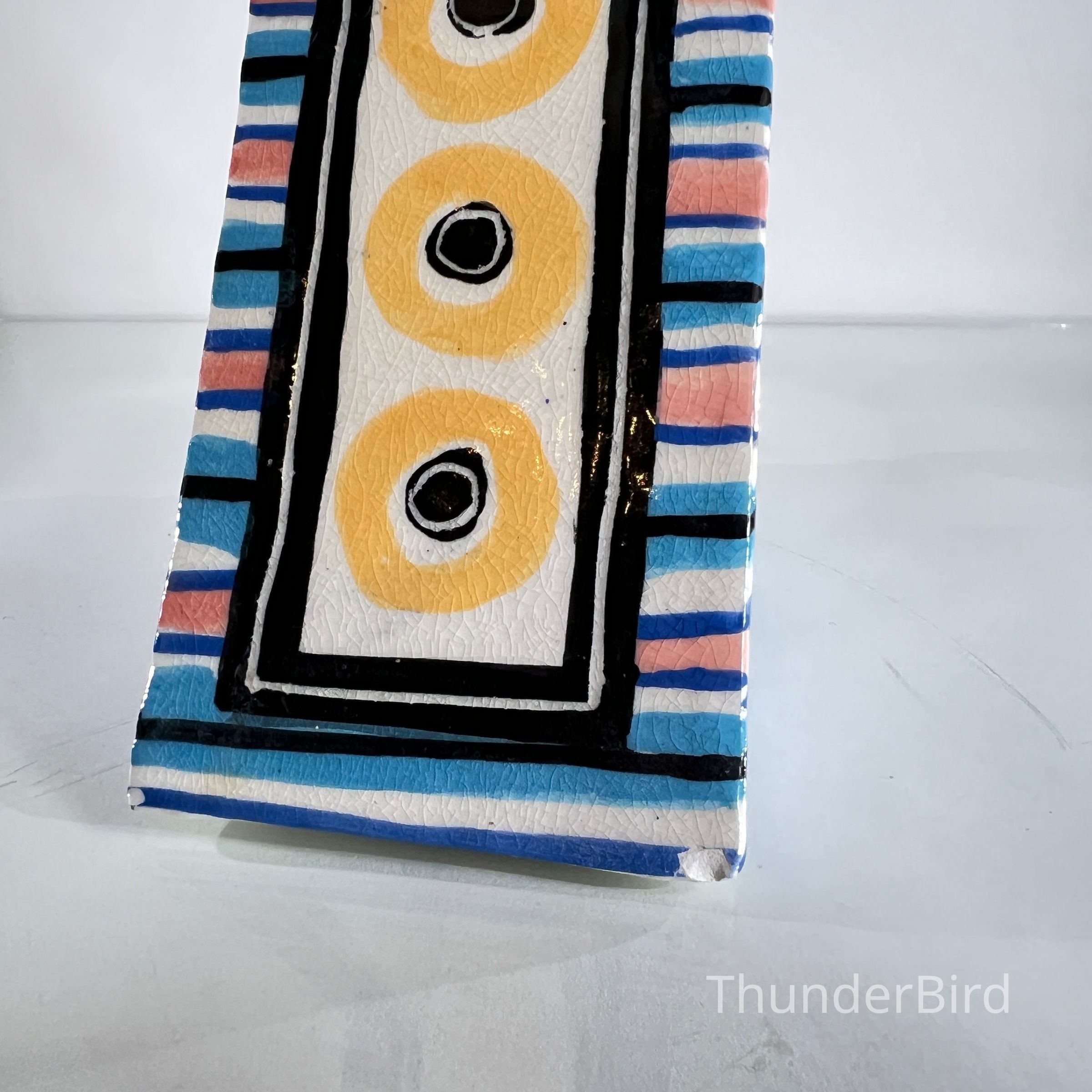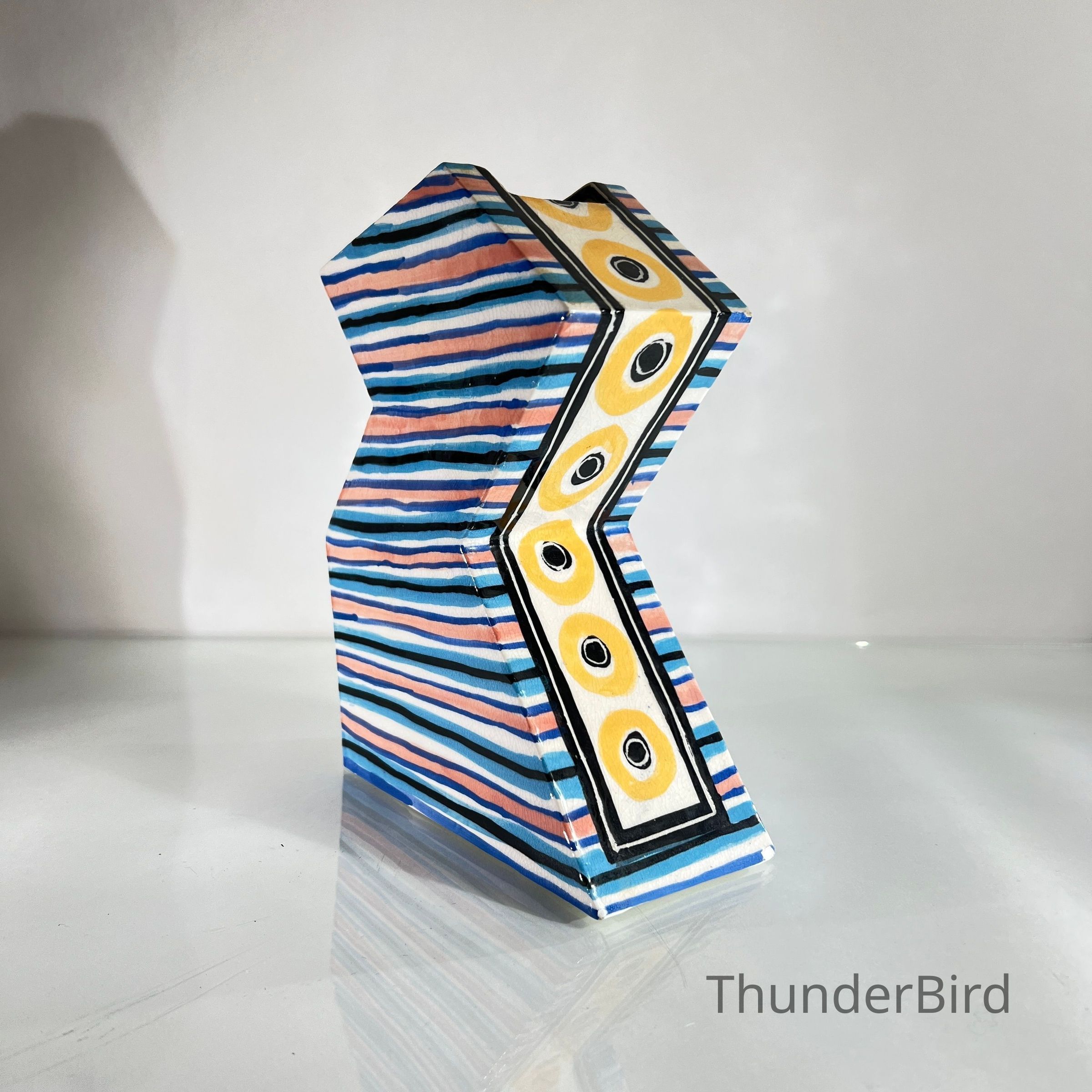 A striking postmodern ceramic vase with a bold angular zigzag silhouette, evocative of the Memphis Milano movement. Decorated with hand-painted striped and circular motifs in vivid colourways, this sculptural piece captures the energetic aesthetic of 1980s avant-garde Italian design. Likely a studio or art pottery production from the late 20th century. Displays beautifully as a statement object.