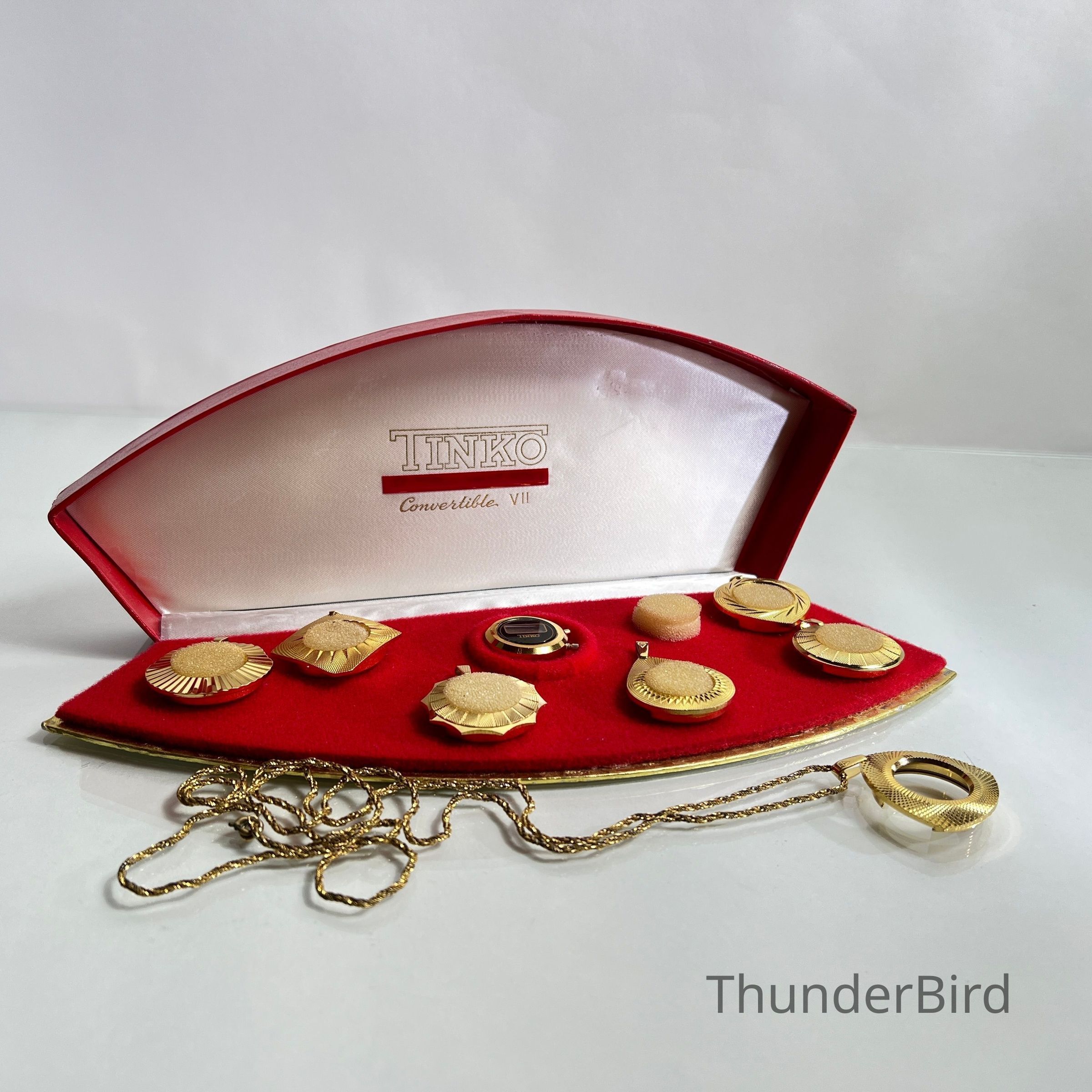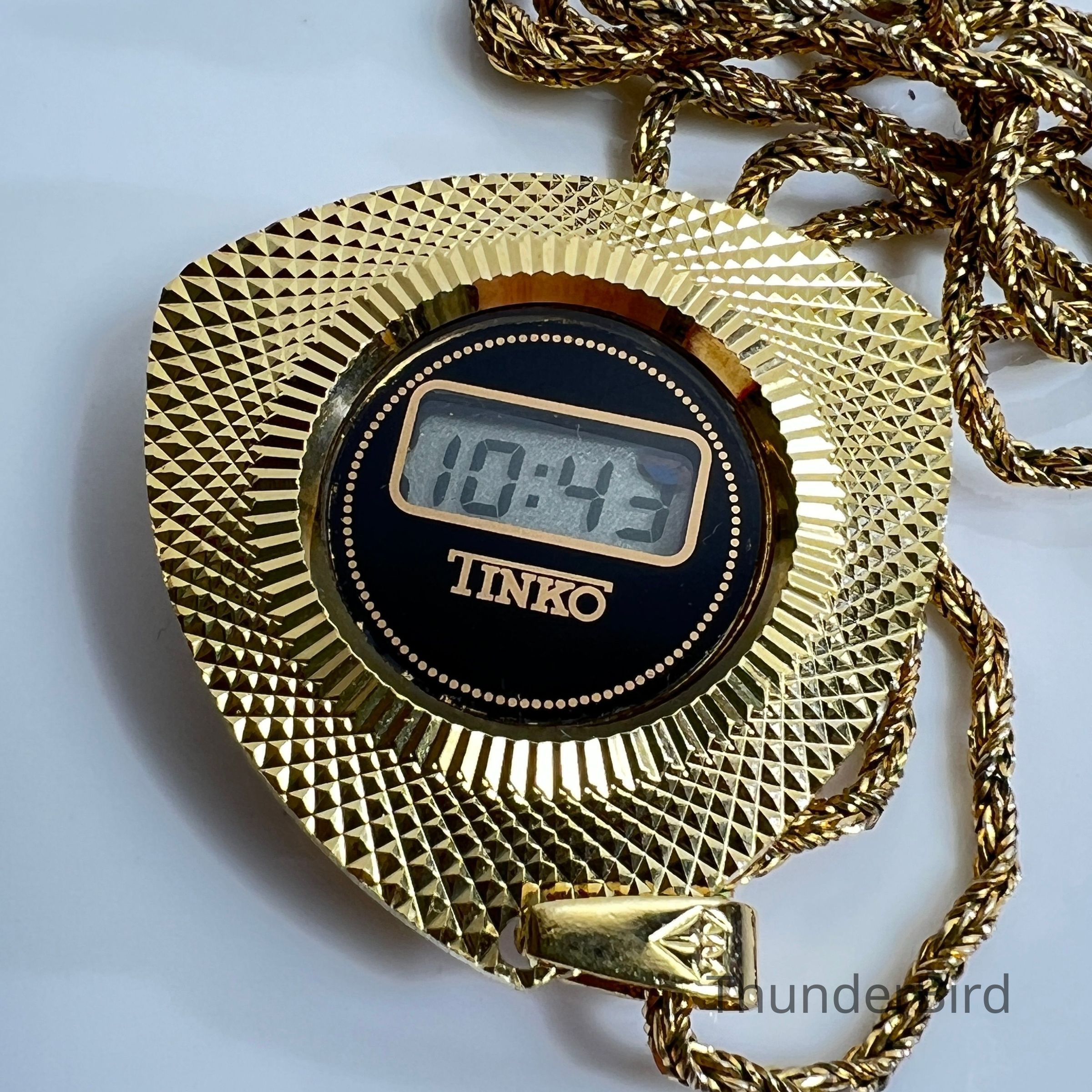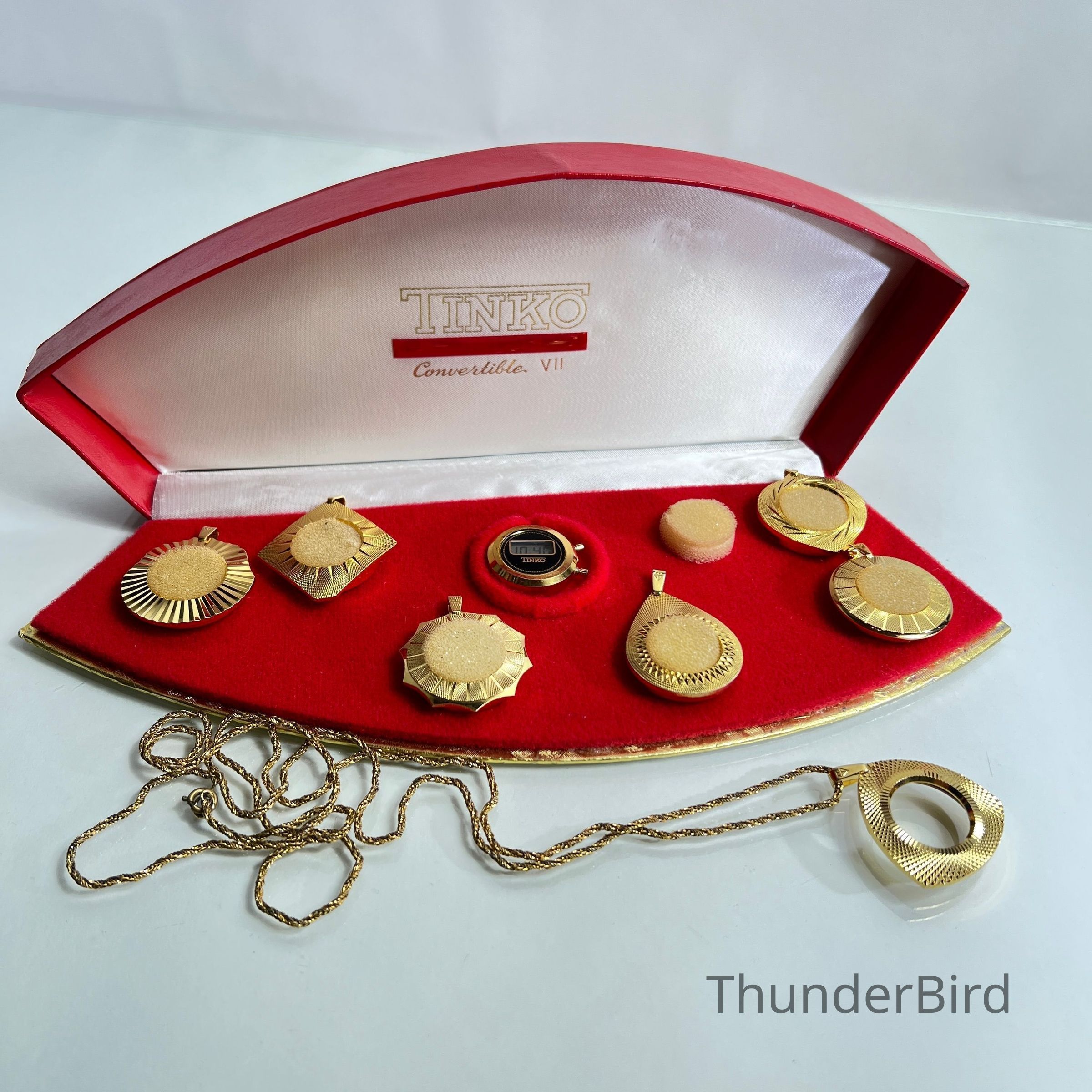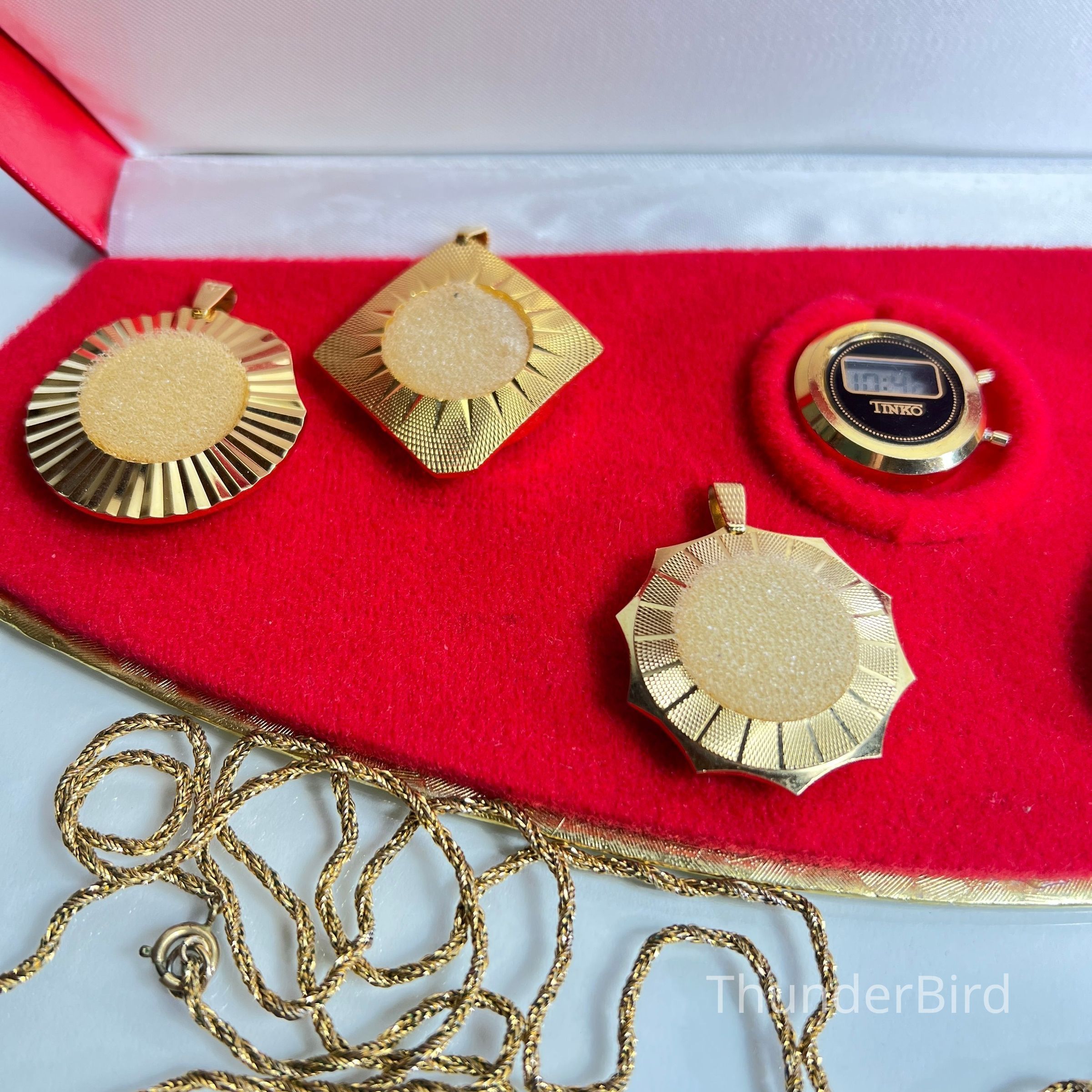 A complete cased set of the TINKO Convertible VII digital pendant watch, made in Hong Kong circa 1970s. This innovative jewellery-watch hybrid features a central digital timepiece module with interchangeable gold-tone pendant frames and a rope-style necklace chain. Set includes 1 digital timepiece, 1 chain, and 7 decorative pendant attachments, all presented in the original fitted red vinyl case with gold detailing. Pretty cool!!