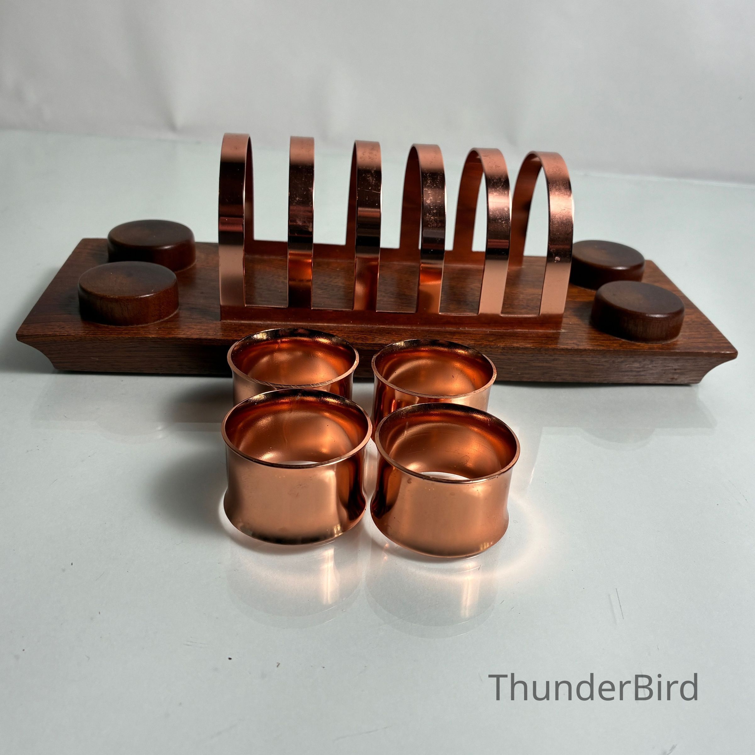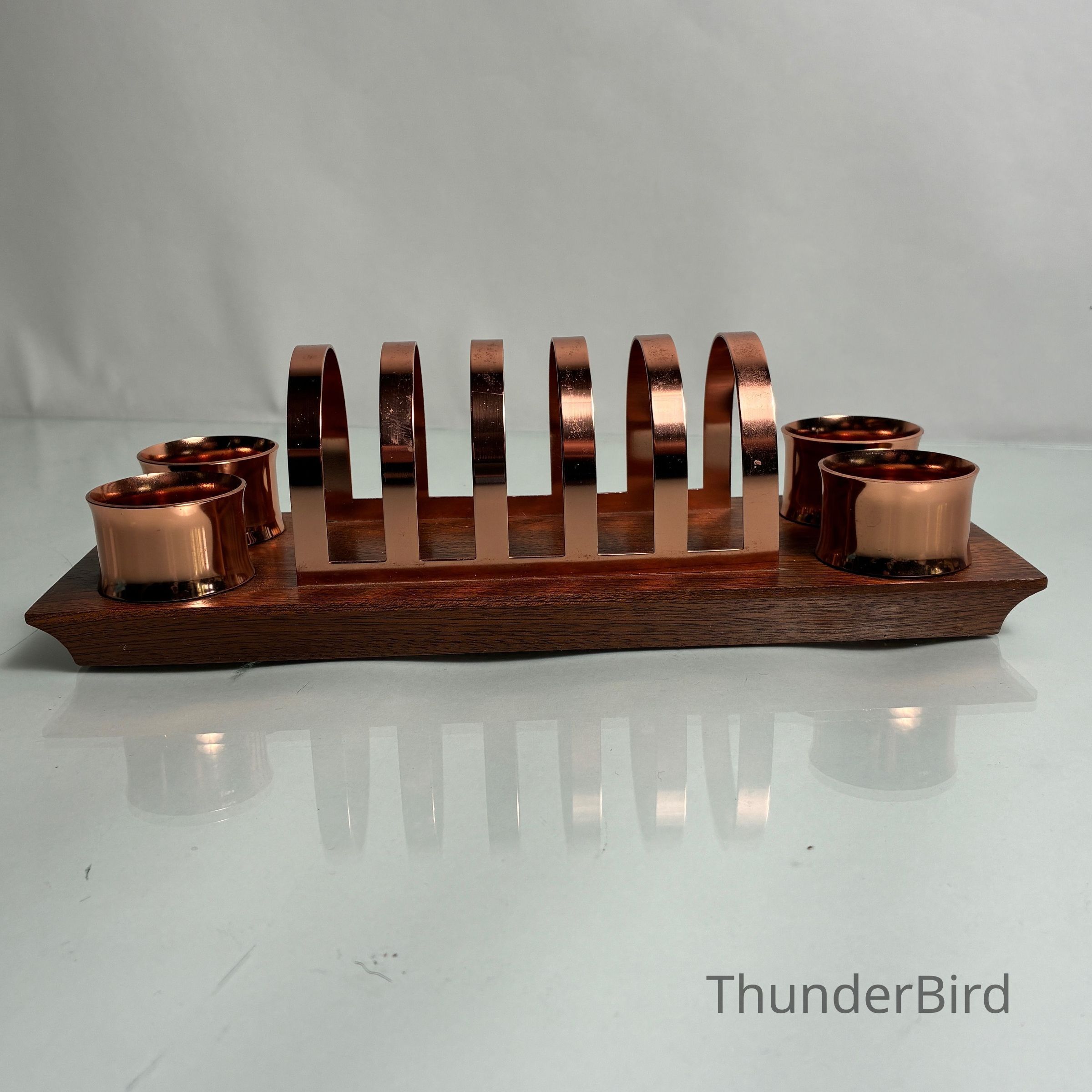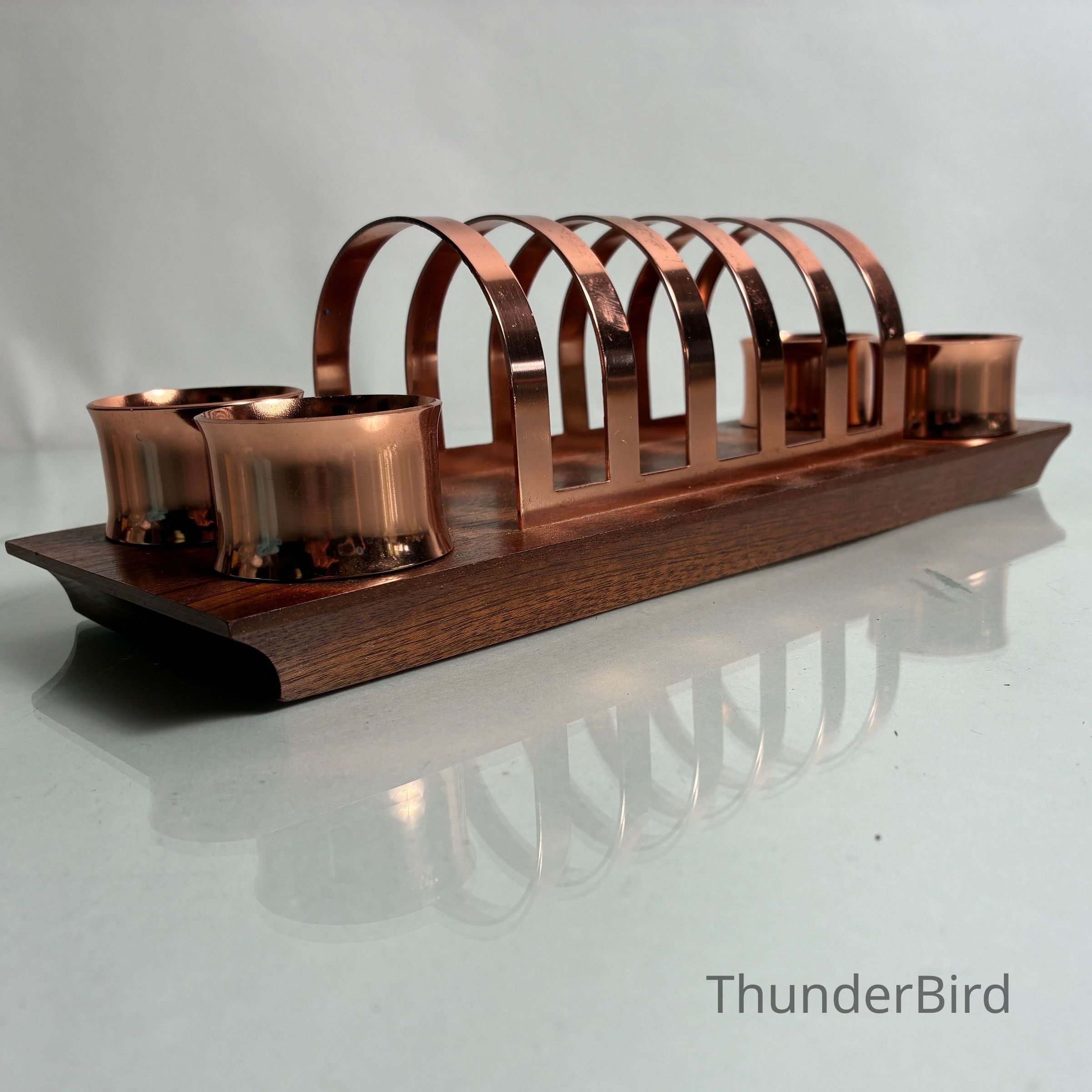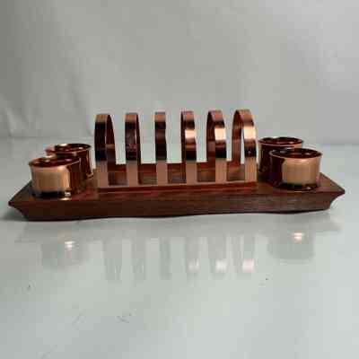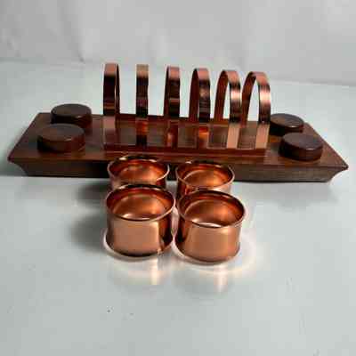 A striking mid-century toast rack and napkin ring set by Anolux Anodised Products, Auckland, New Zealand. The design is classic retro – featuring six arched copper-anodised aluminium dividers for toast, flanked by four matching napkin rings. The set is mounted on a beautifully shaped timber base with turned wood accents that securely hold the rings in place.