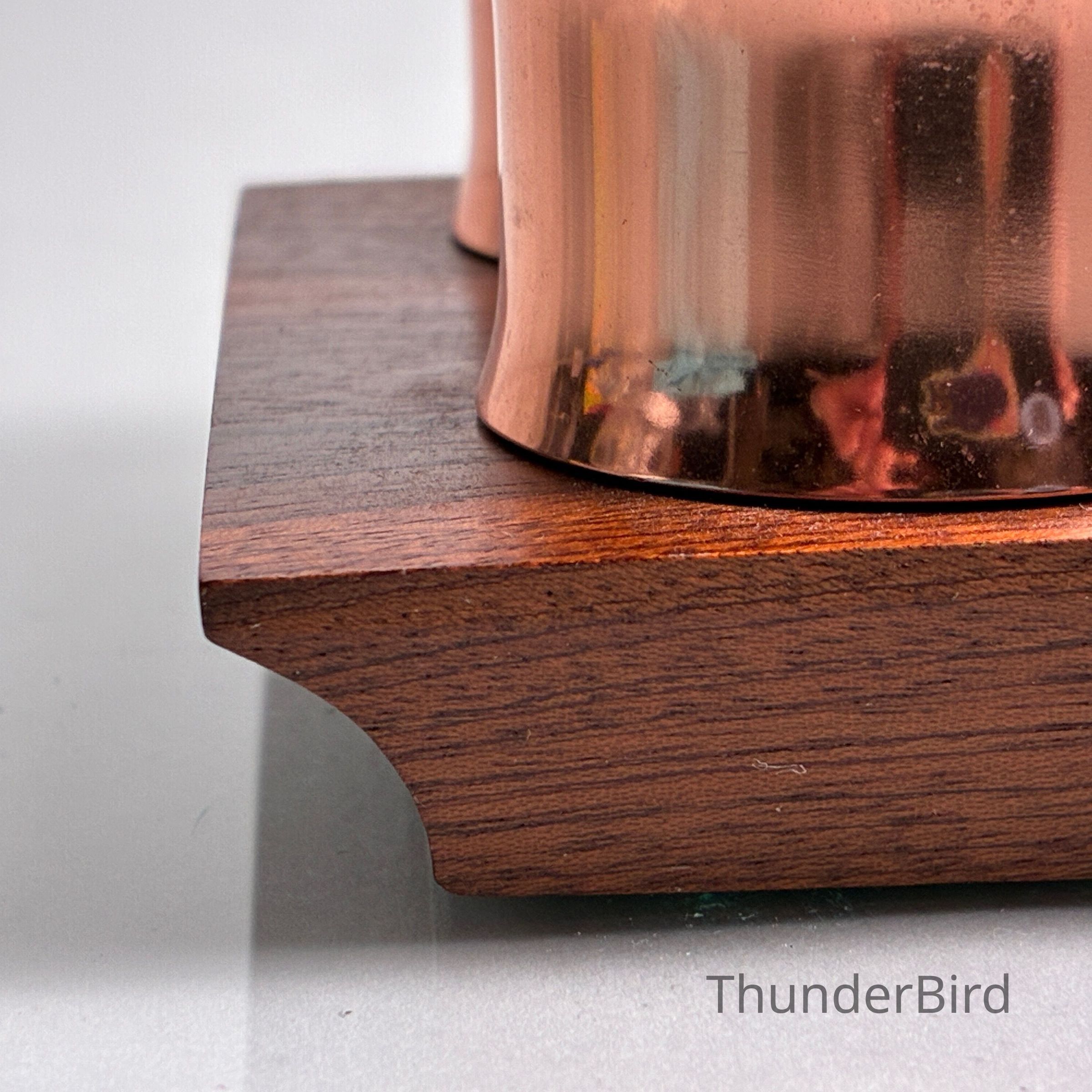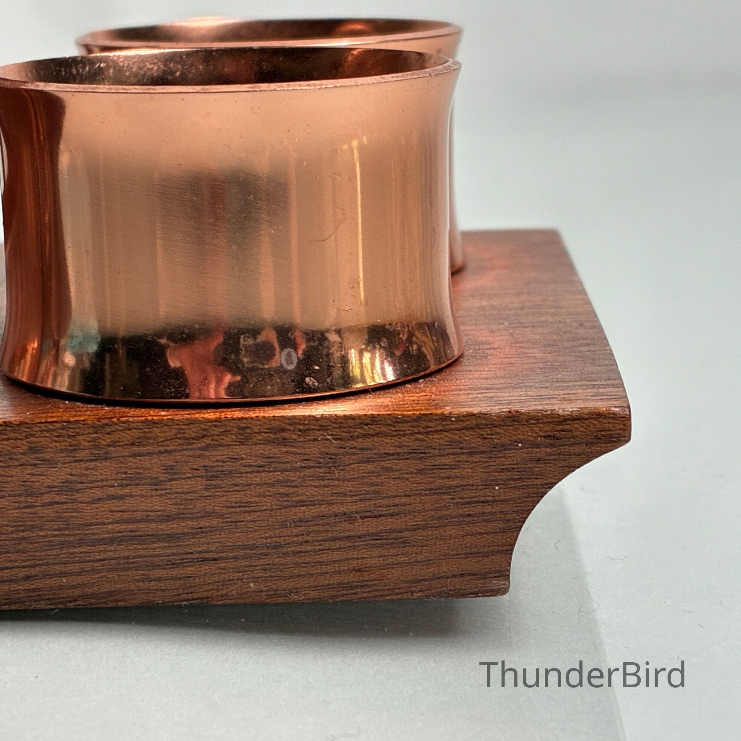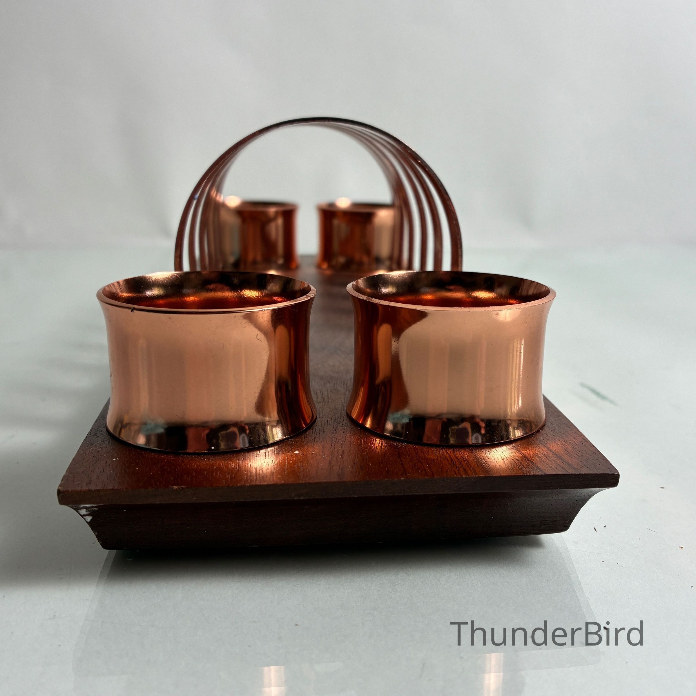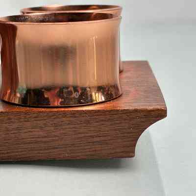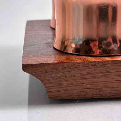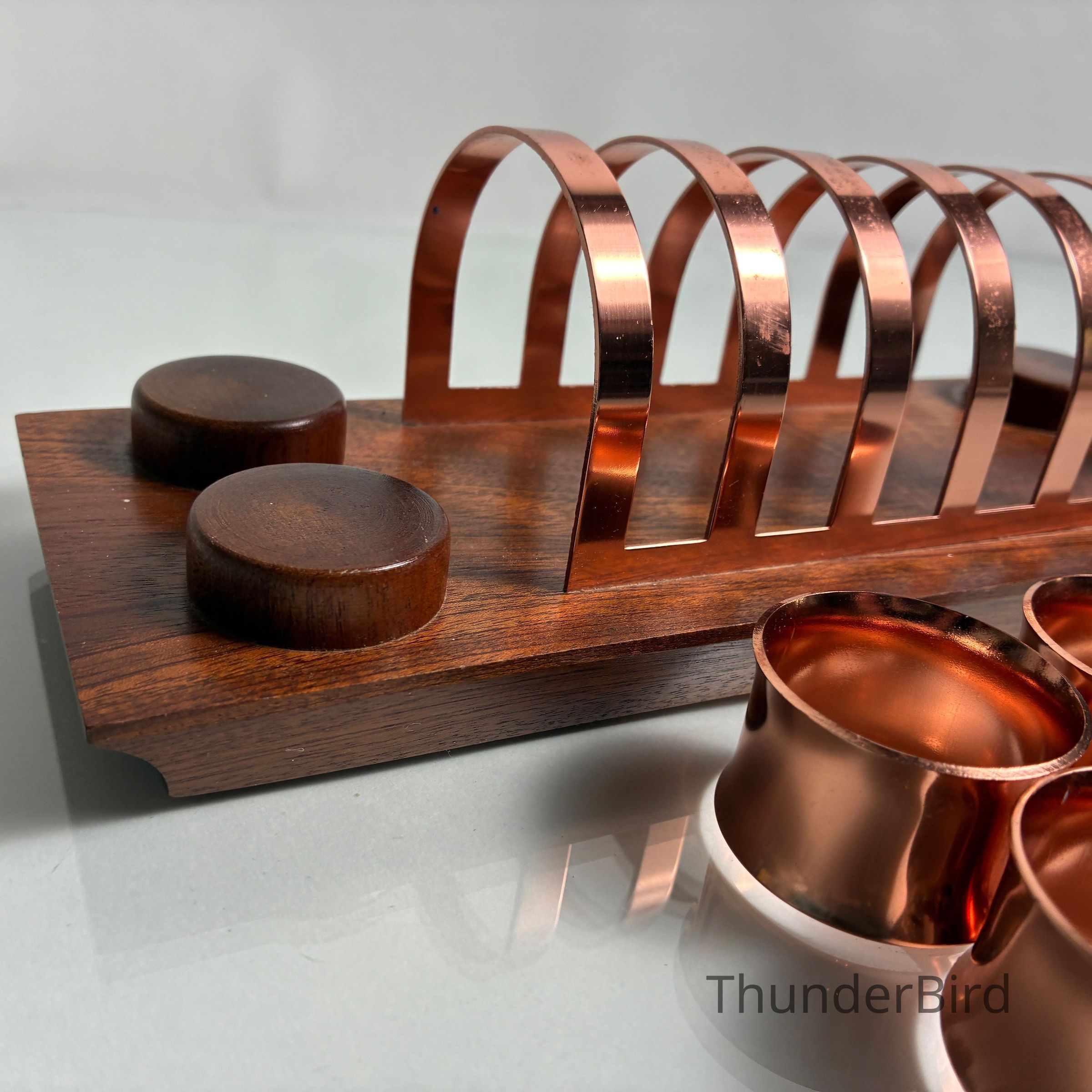 A striking mid-century toast rack and napkin ring set by Anolux Anodised Products, Auckland, New Zealand. The design is classic retro – featuring six arched copper-anodised aluminium dividers for toast, flanked by four matching napkin rings. The set is mounted on a beautifully shaped timber base with turned wood accents that securely hold the rings in place.