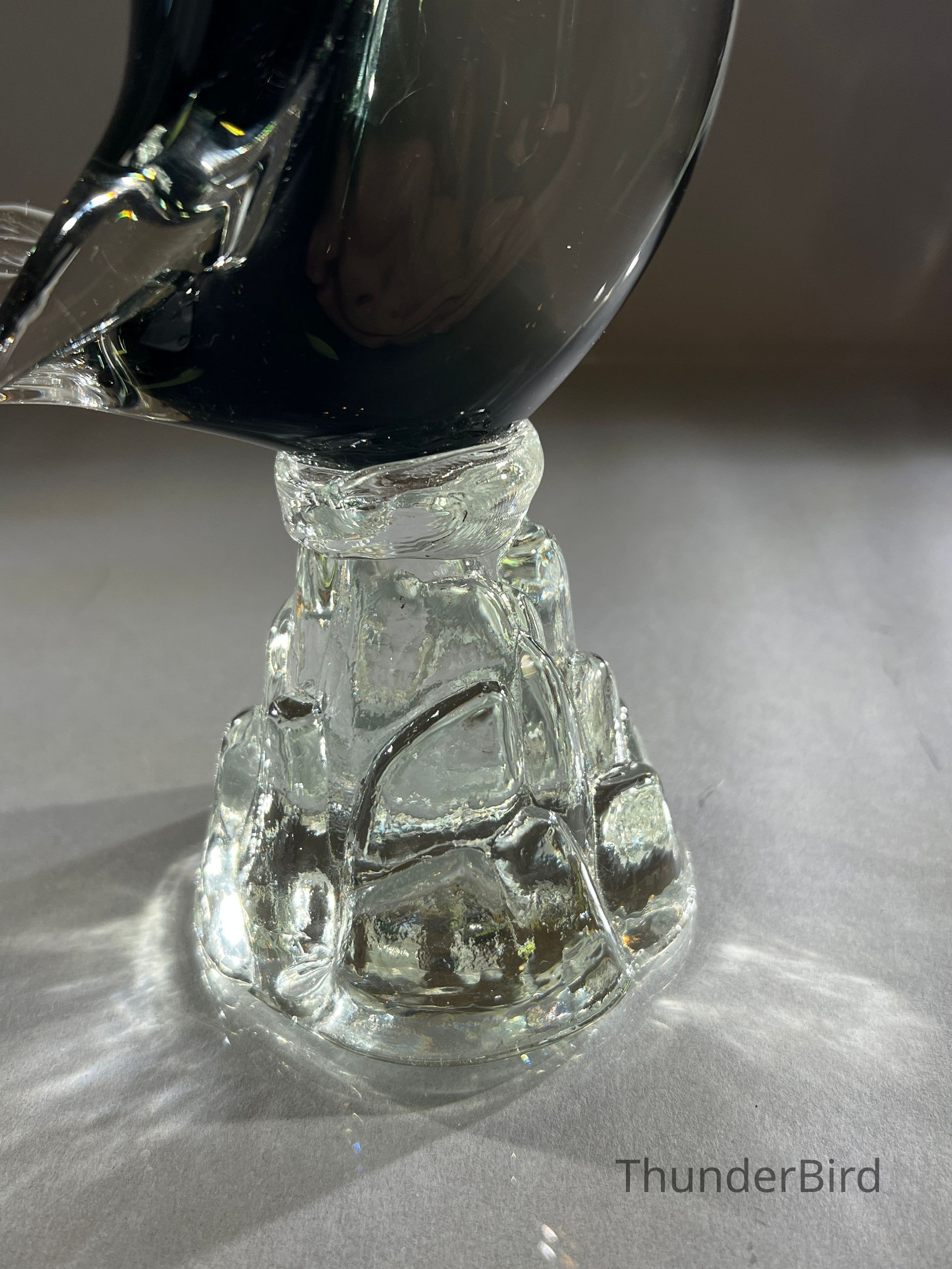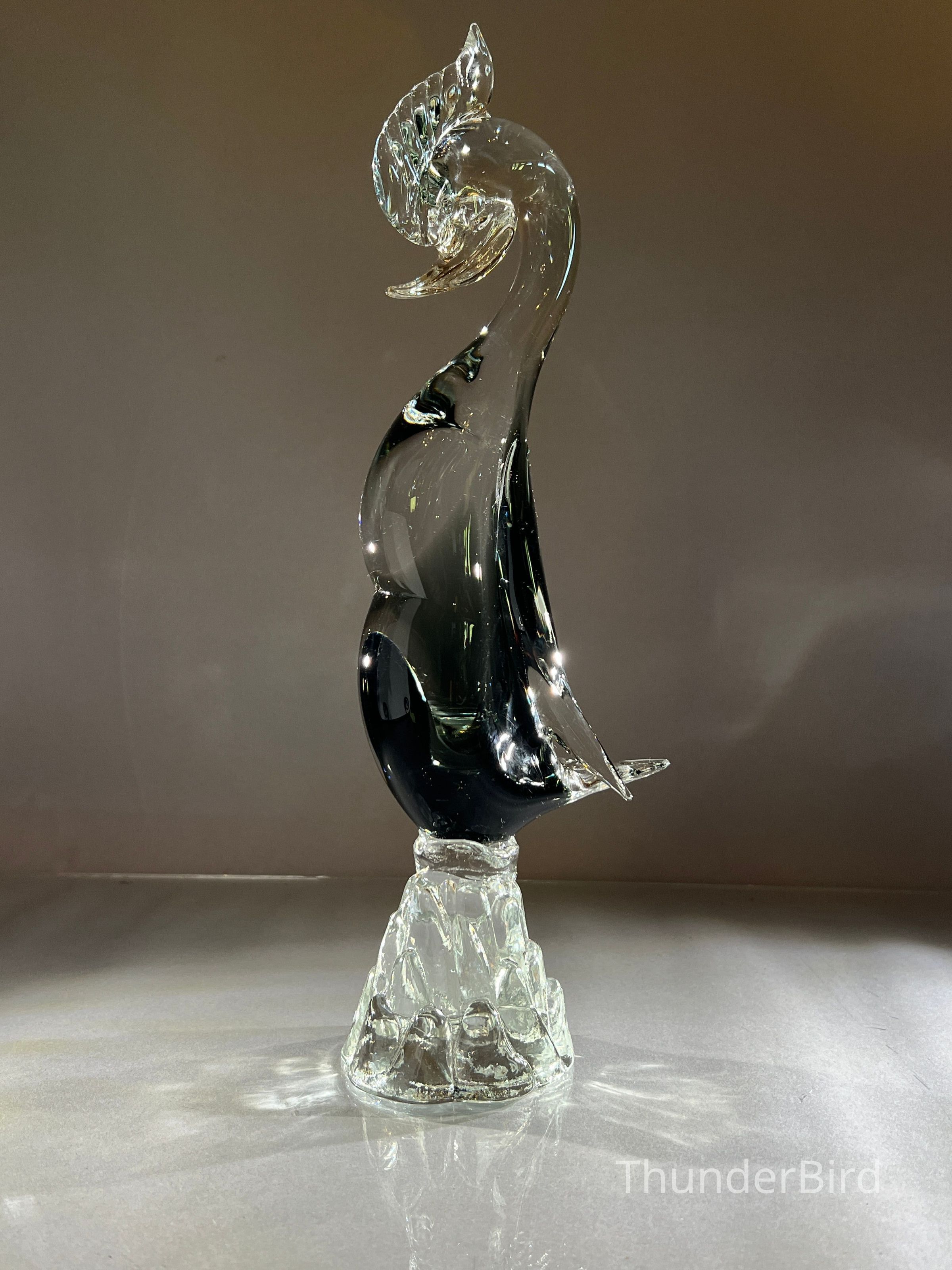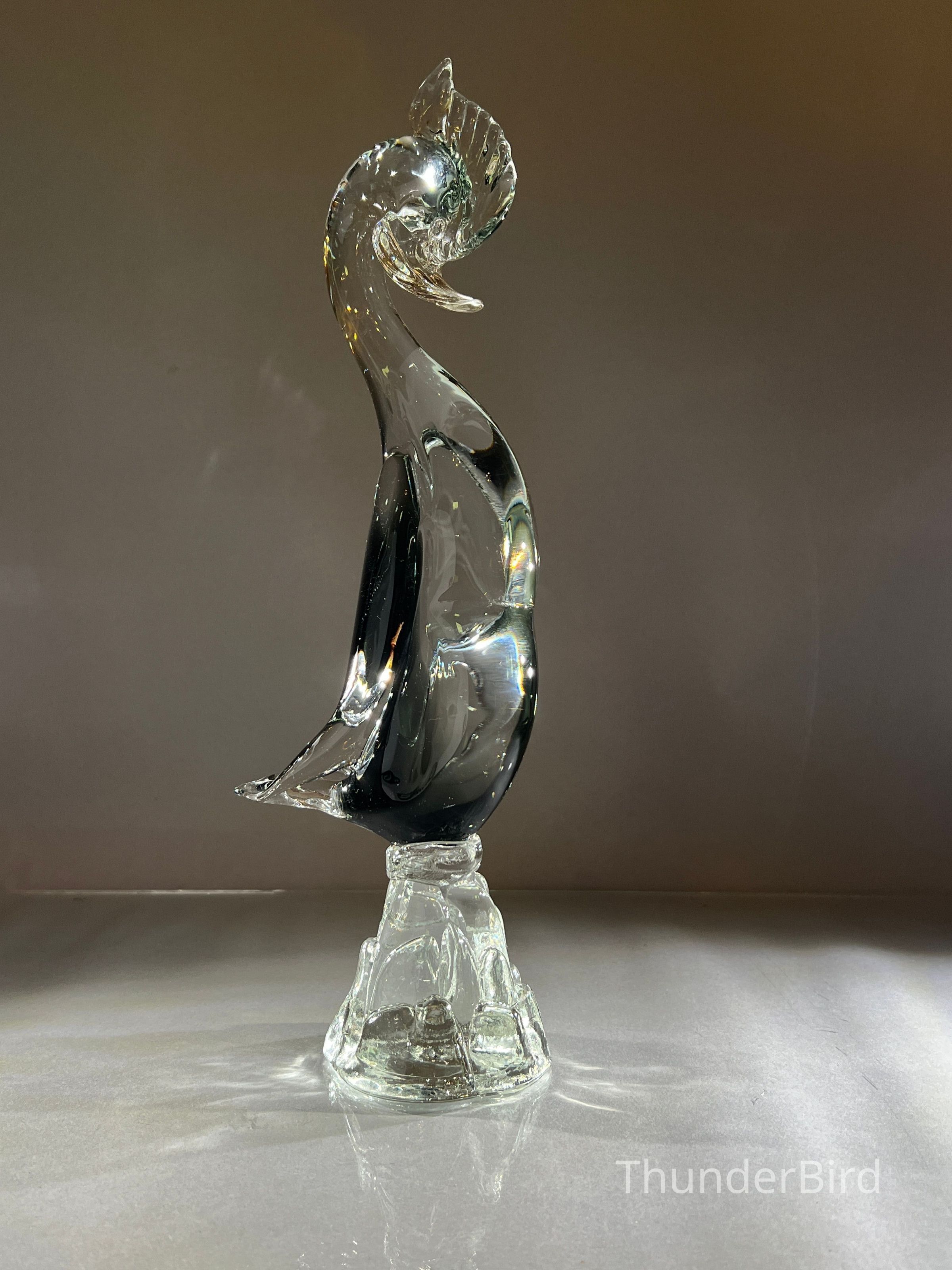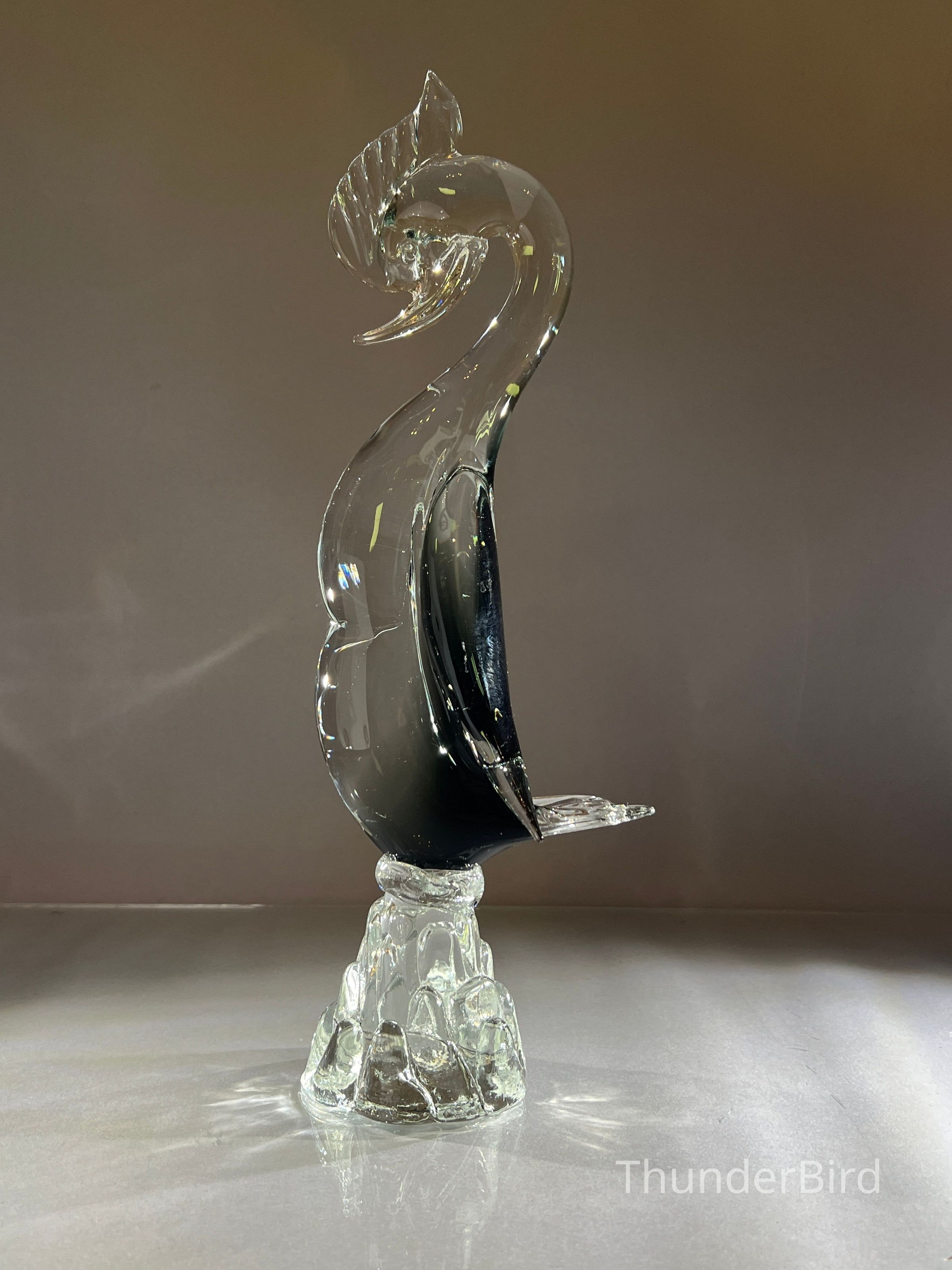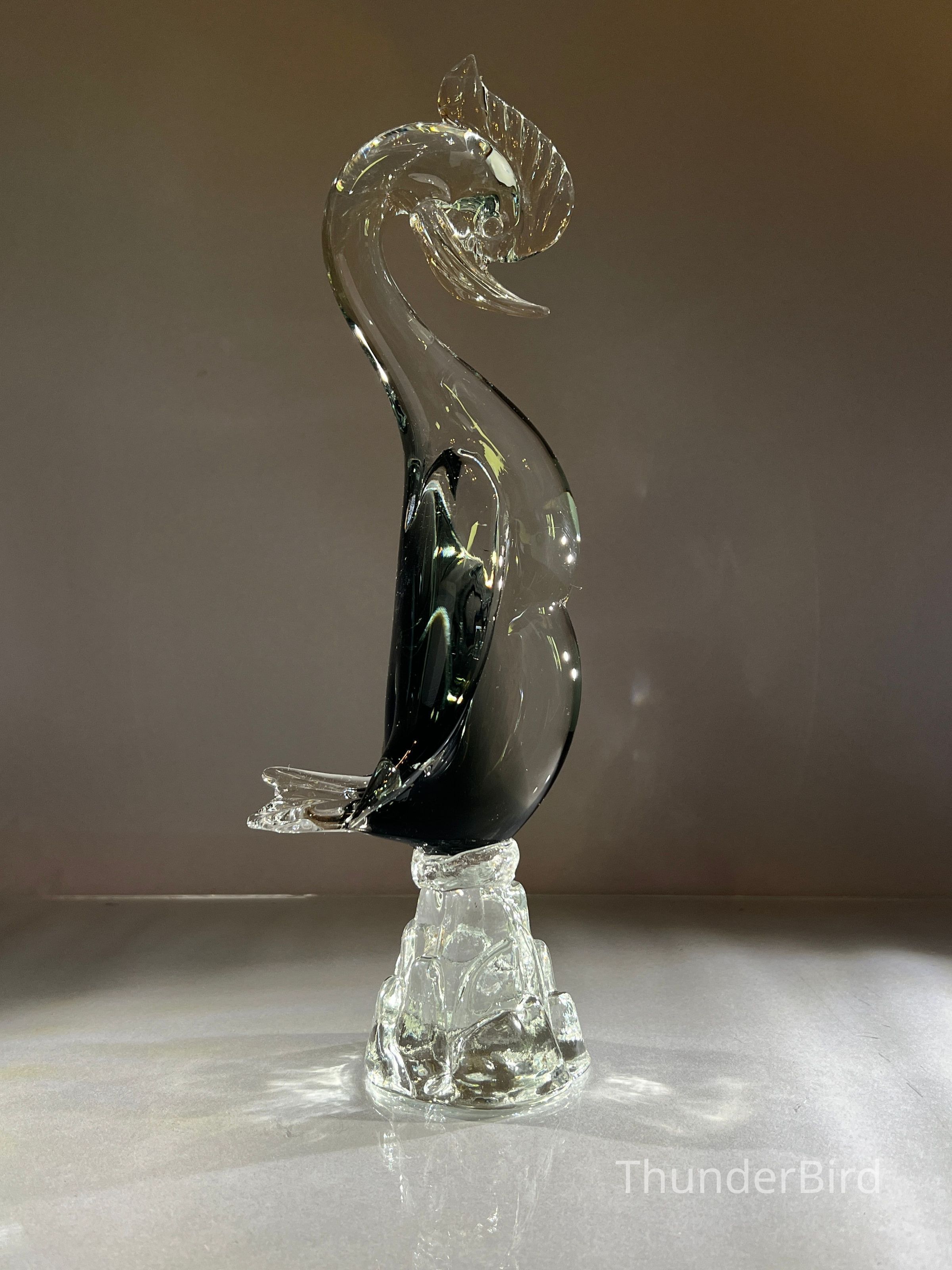 A striking mid-century Murano glass bird sculpture in clear and smokey grey tones. This elegant, hand-blown piece showcases the masterful craftsmanship of Murano glassmakers, with a sculptural form featuring a gracefully arched neck, textured crest, and a solid glass base designed to resemble rock or ice. Likely dating from the 1950s–1970s, this piece is a fine example of Italian glass artistry.