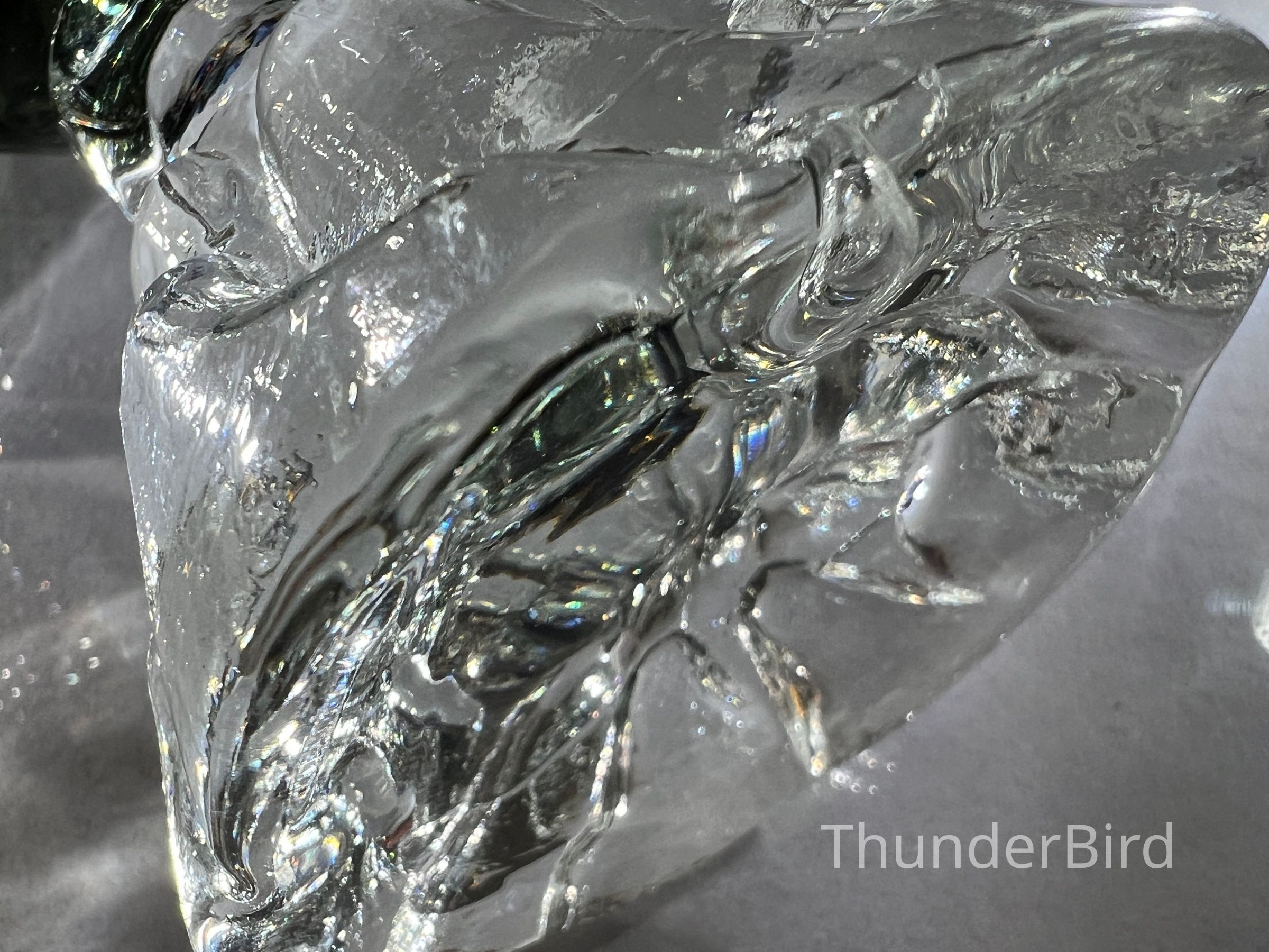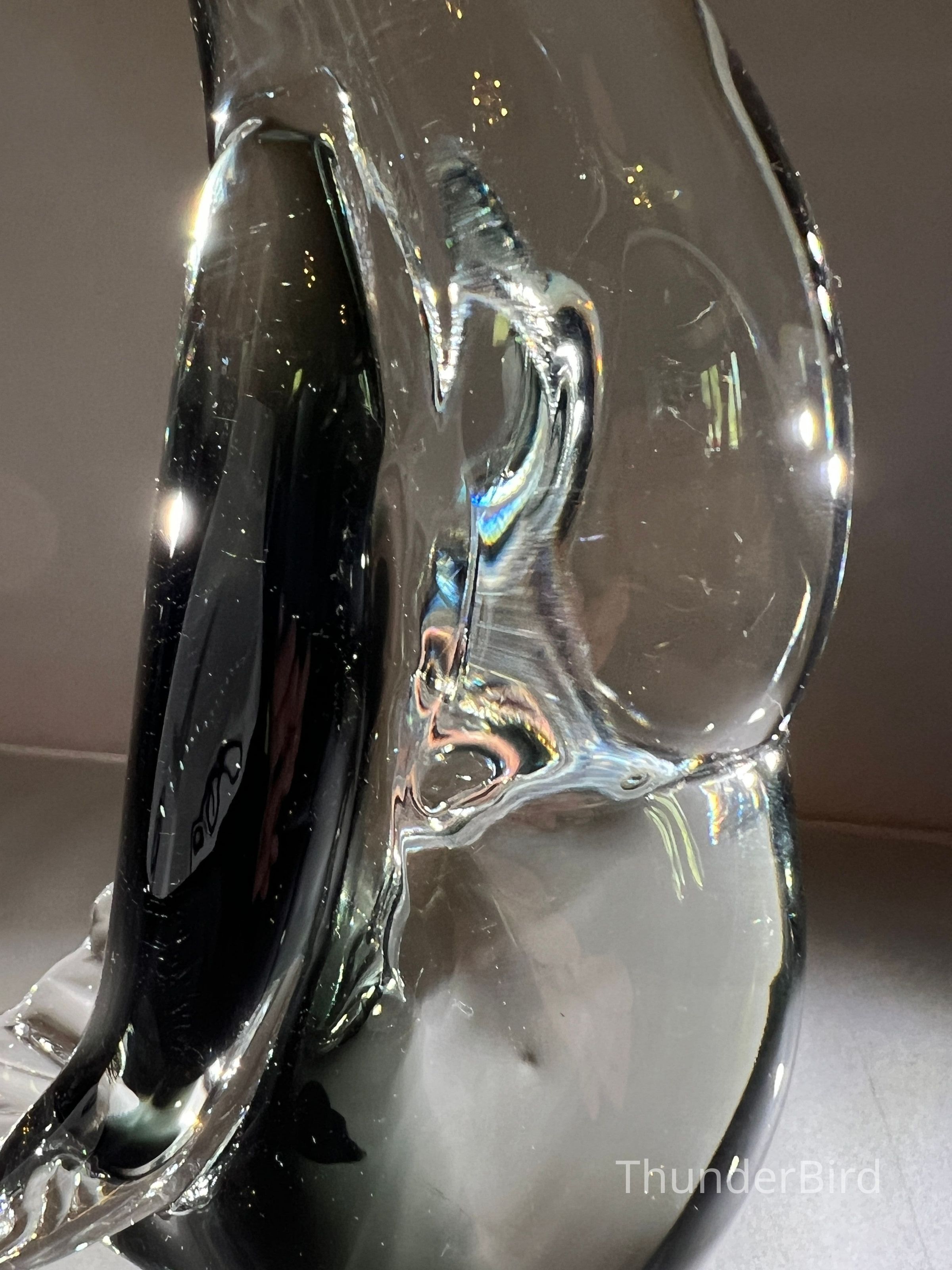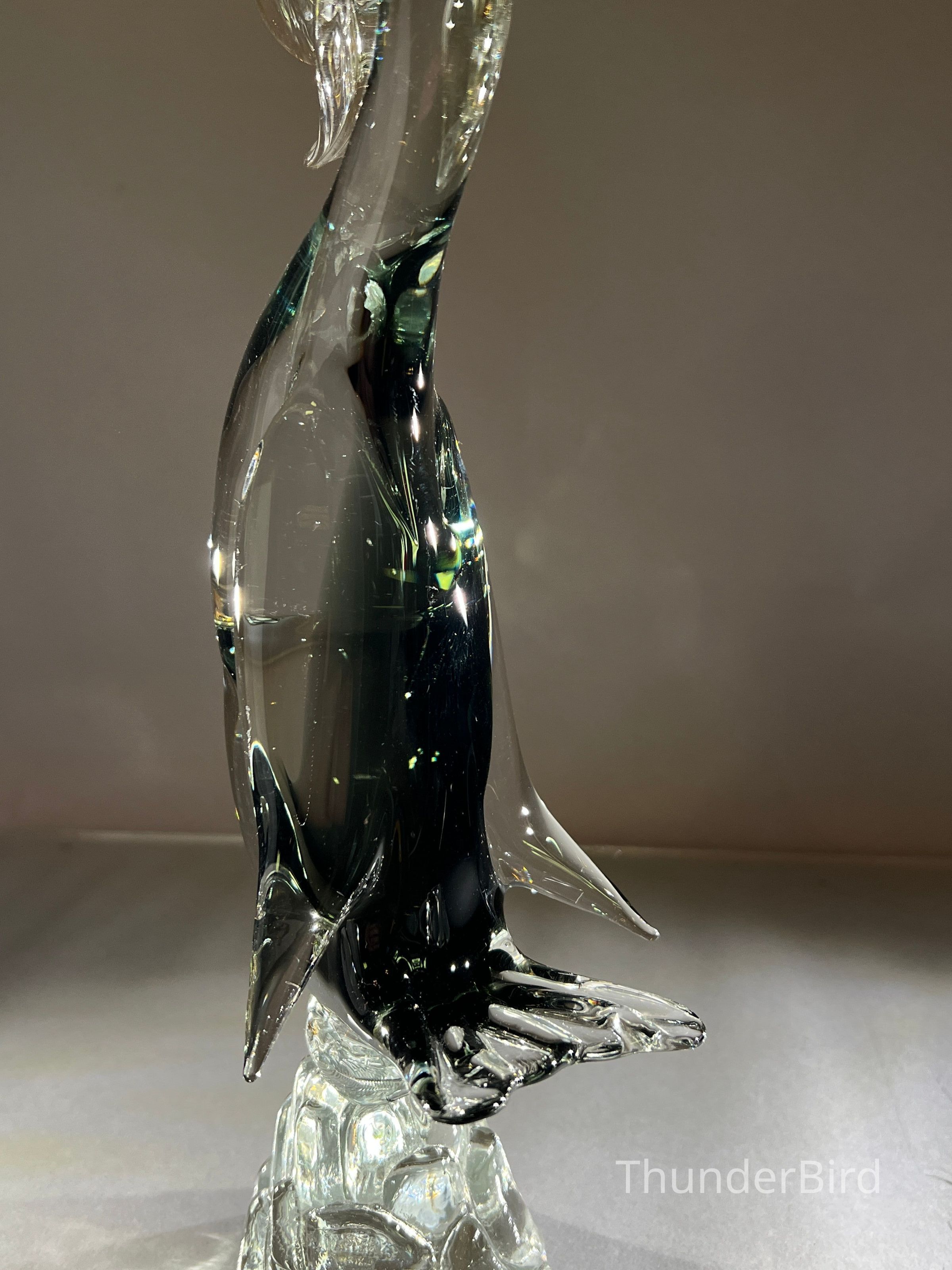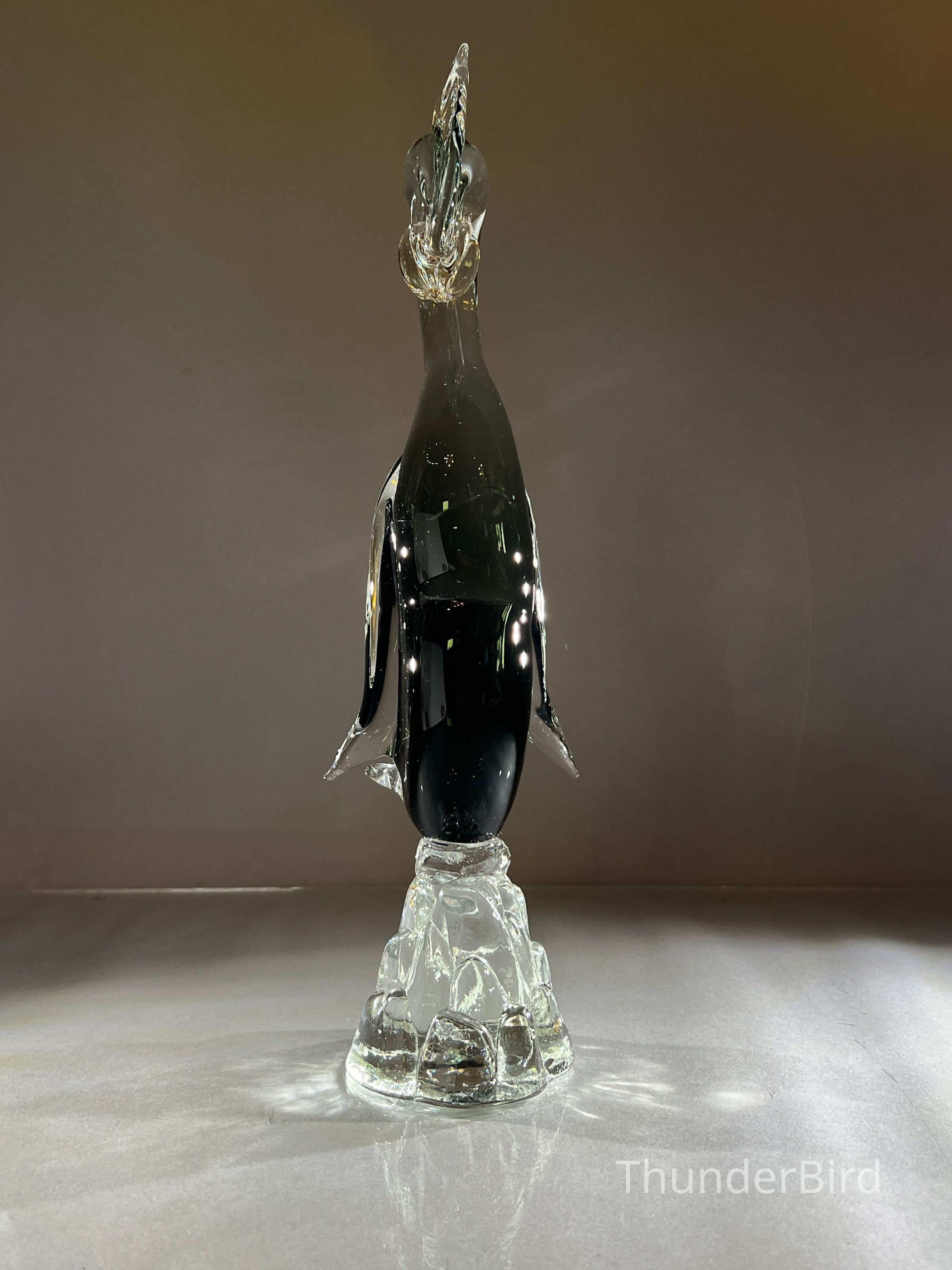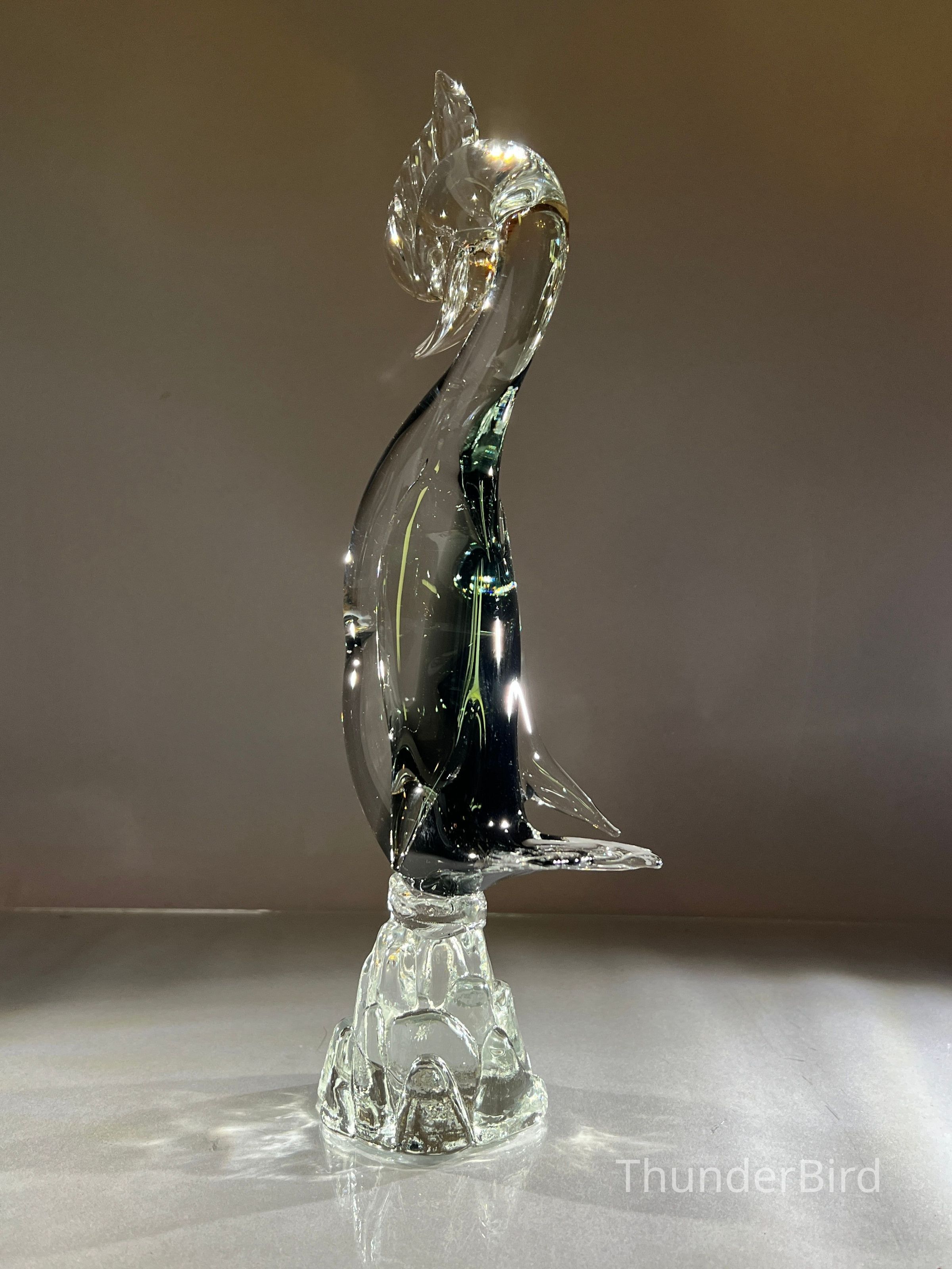 A striking mid-century Murano glass bird sculpture in clear and smokey grey tones. This elegant, hand-blown piece showcases the masterful craftsmanship of Murano glassmakers, with a sculptural form featuring a gracefully arched neck, textured crest, and a solid glass base designed to resemble rock or ice. Likely dating from the 1950s–1970s, this piece is a fine example of Italian glass artistry.