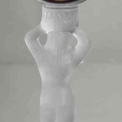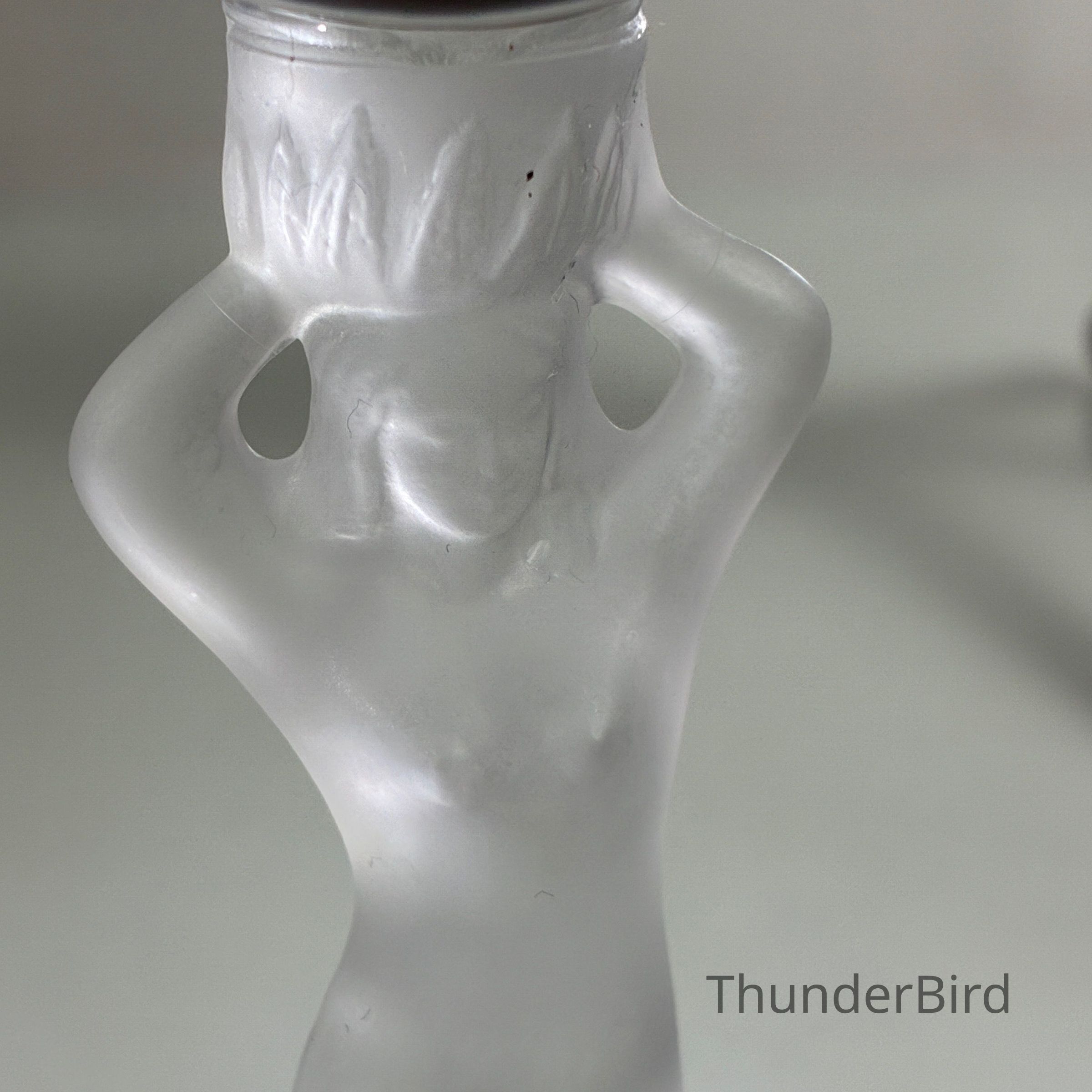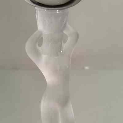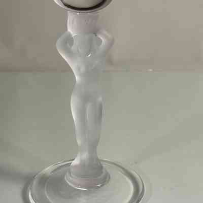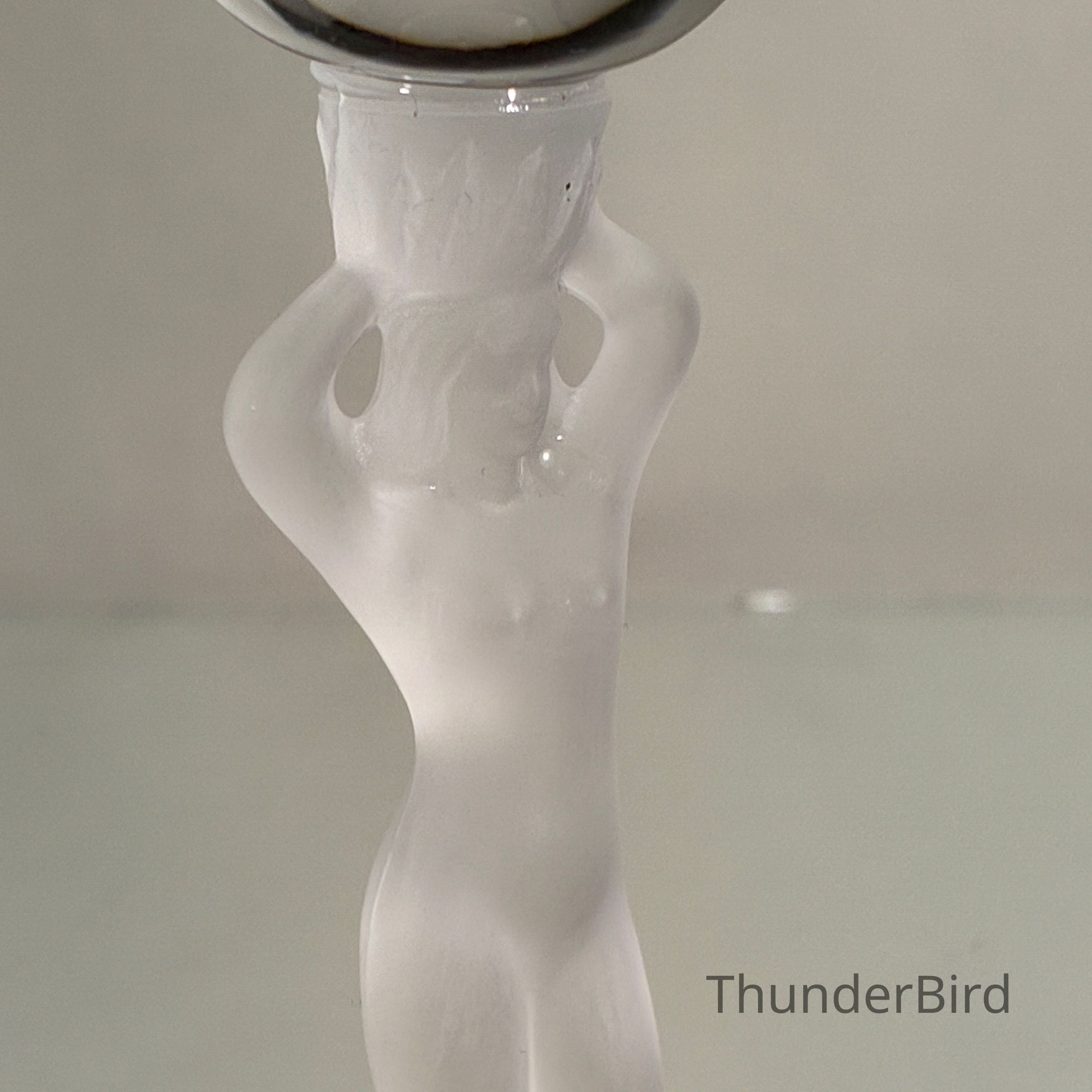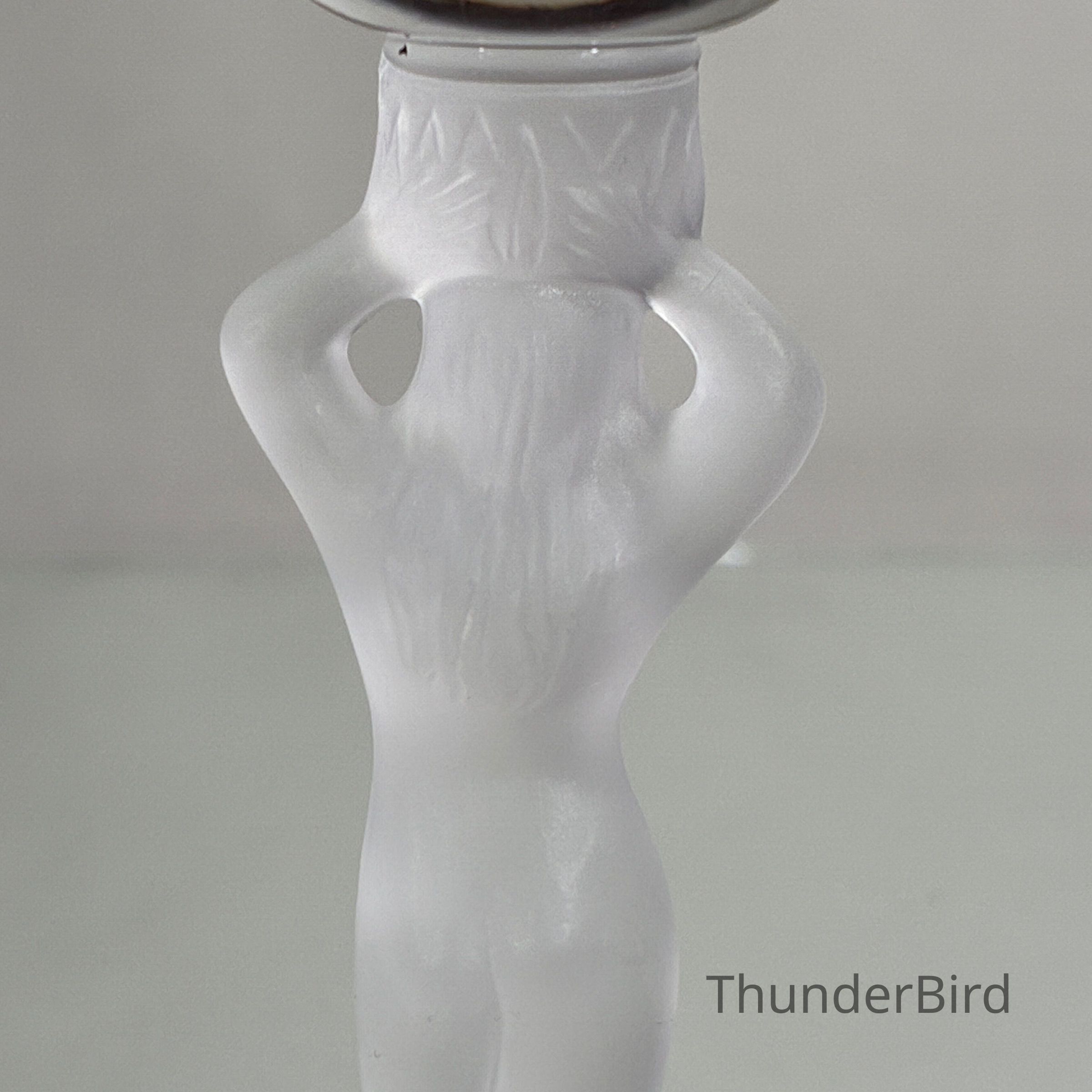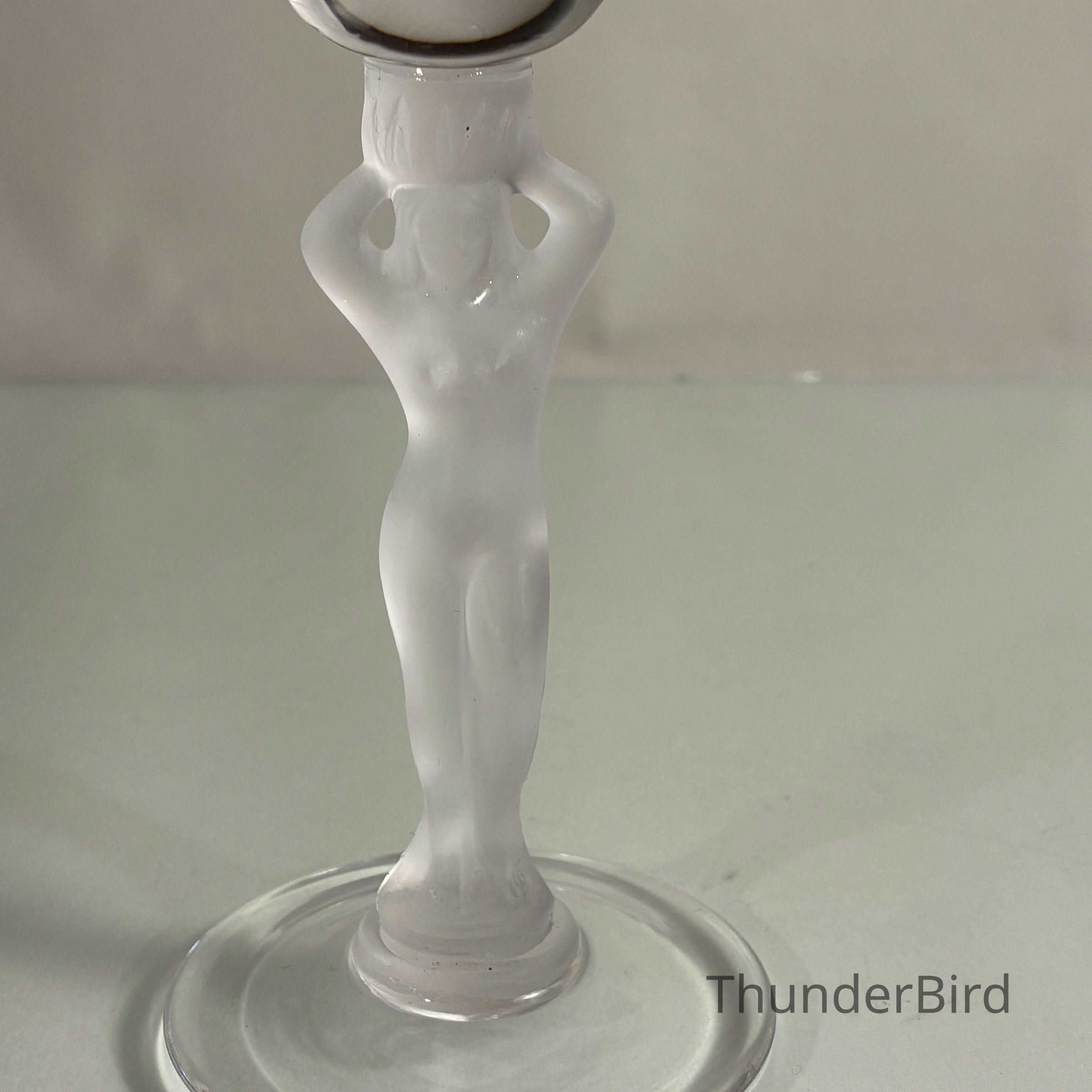 Elegant vintage cocktail or dessert glass featuring a clear bowl atop a finely detailed frosted nude female figurine stem, in the distinctive style of Bayel, the esteemed French crystal house.