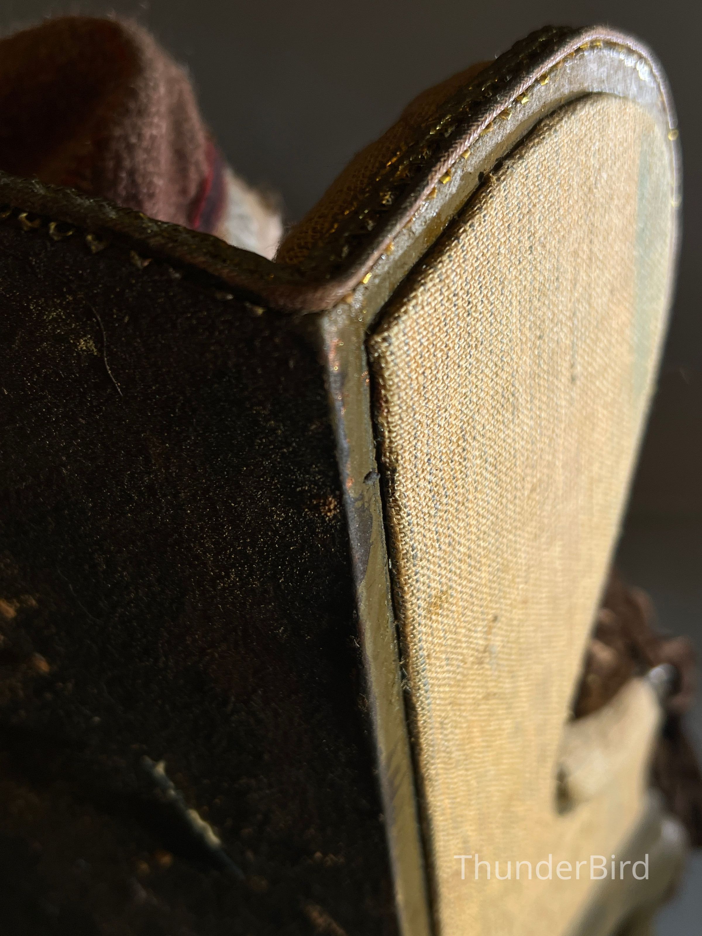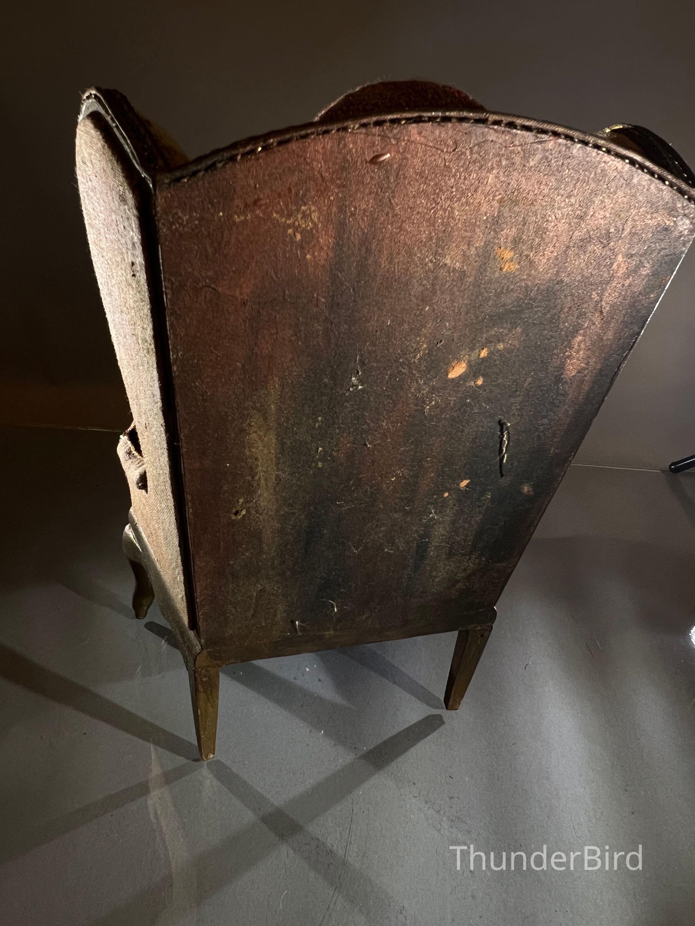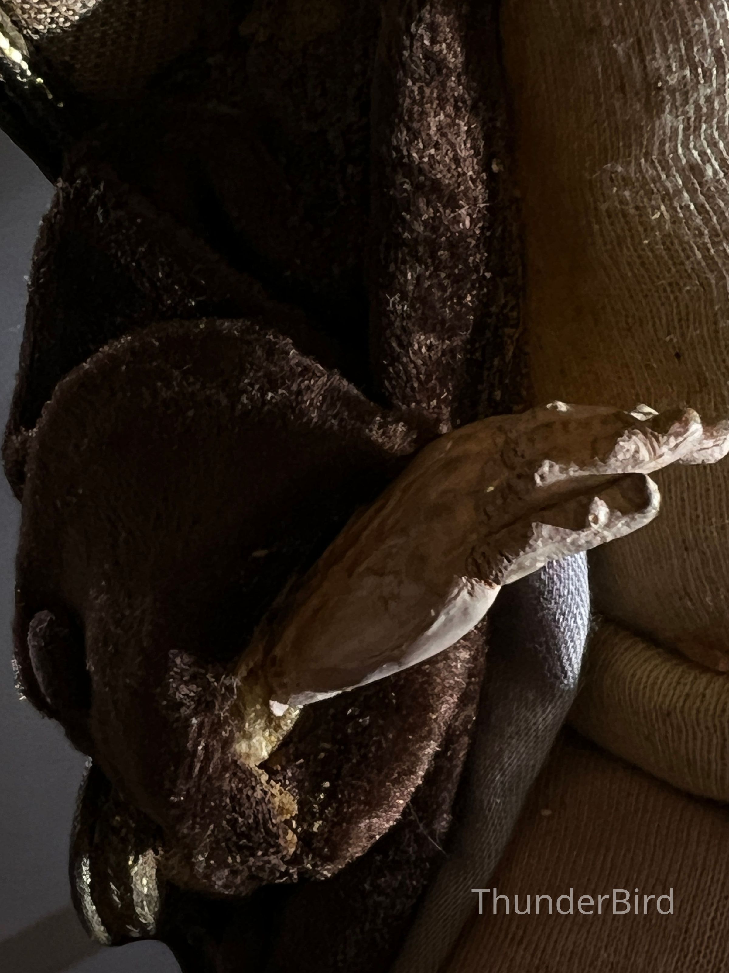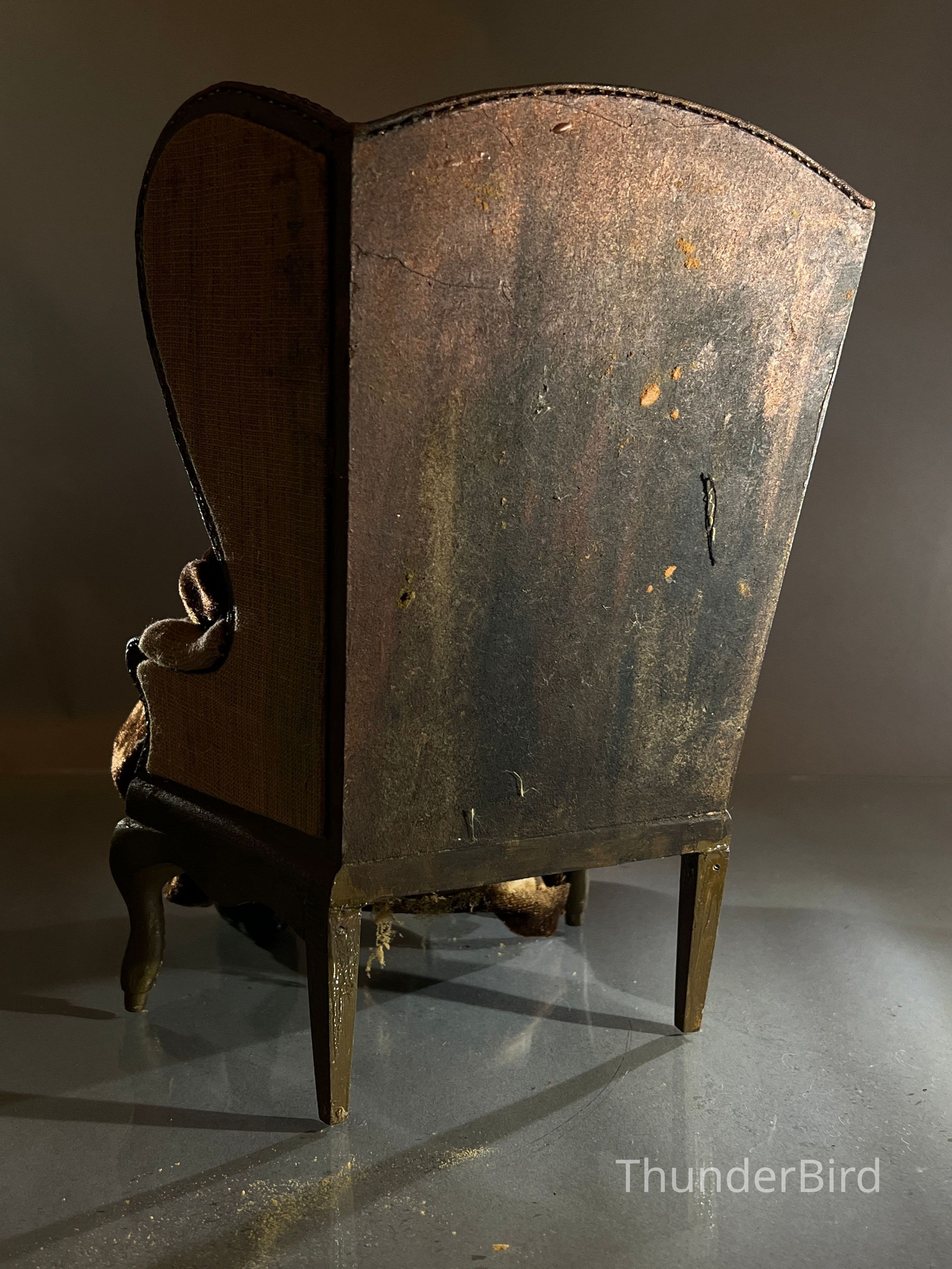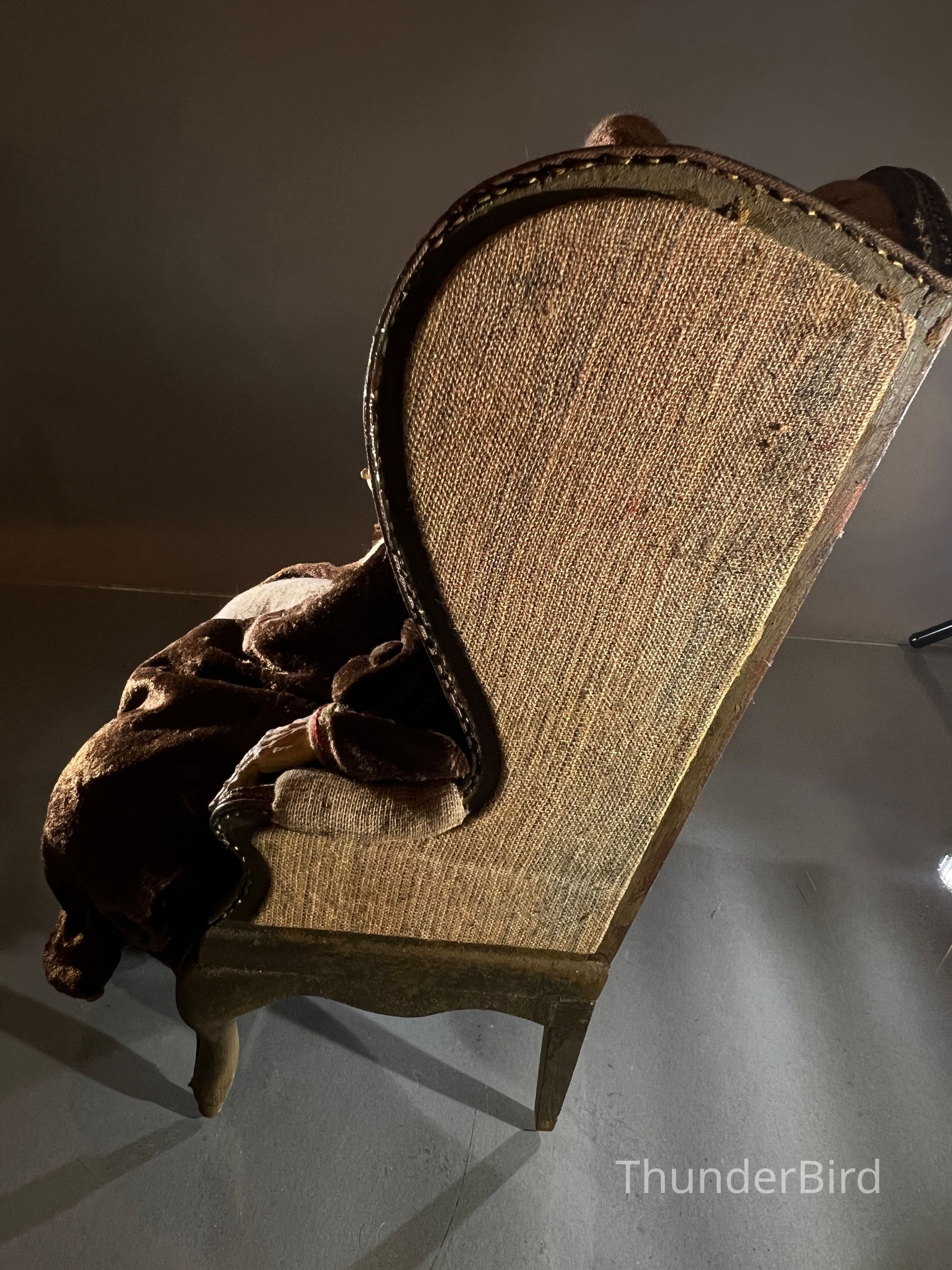 Displays wear consistent with age and studio use. Surface cracking, textile fading, and structural fragility are present but stable. The seated pose is fixed. Chair included. Recommended for display only. Handle with care.