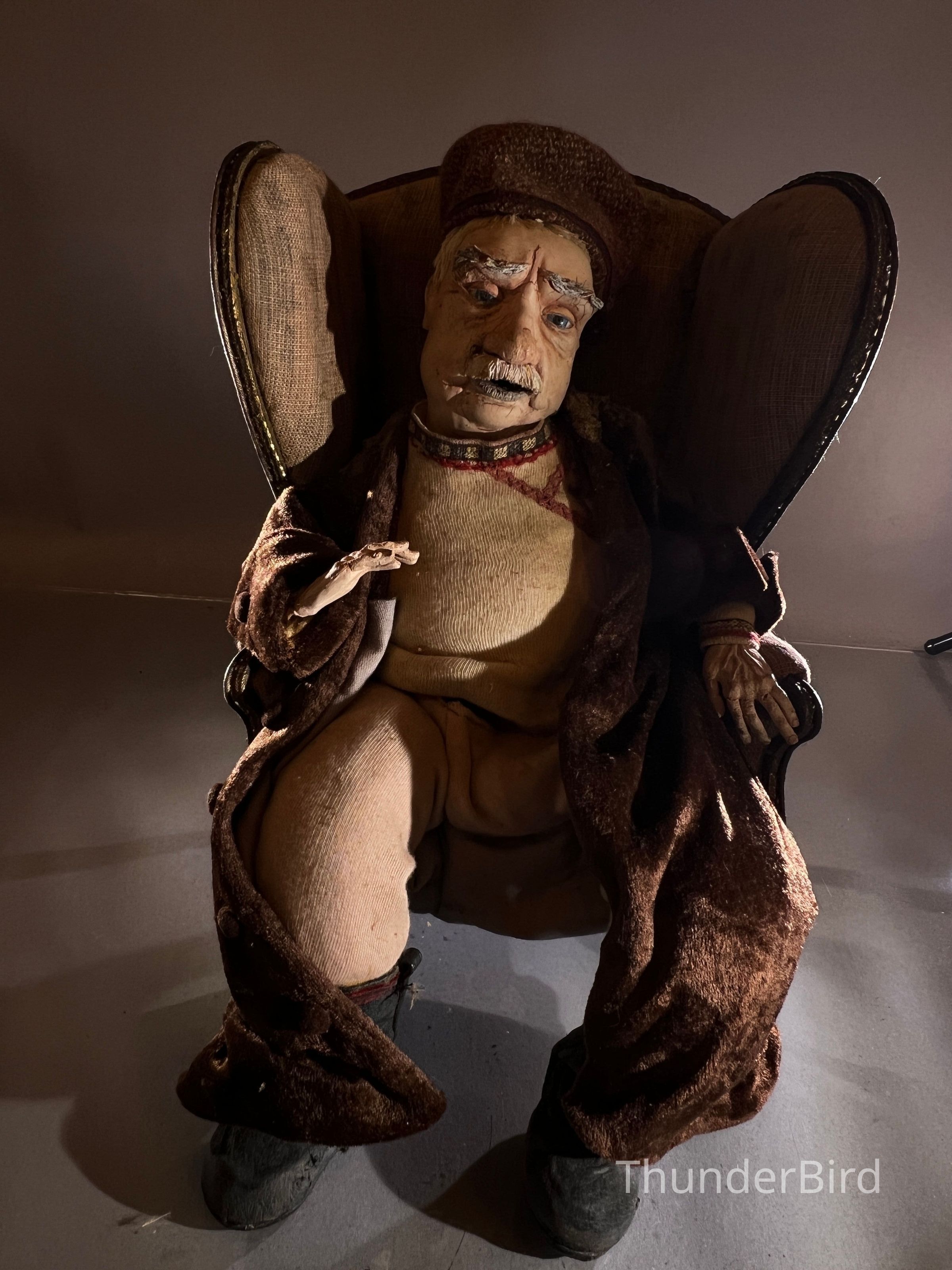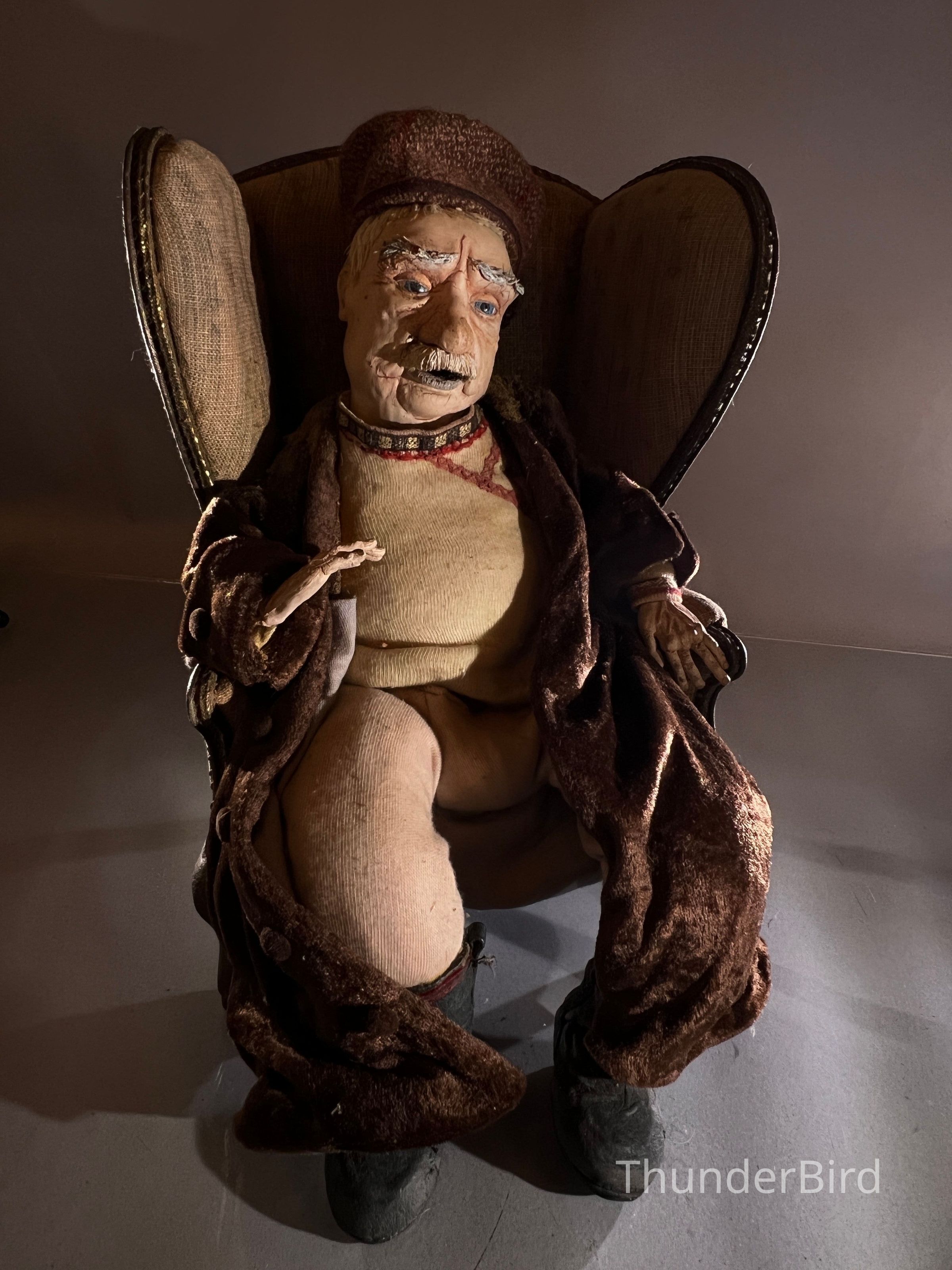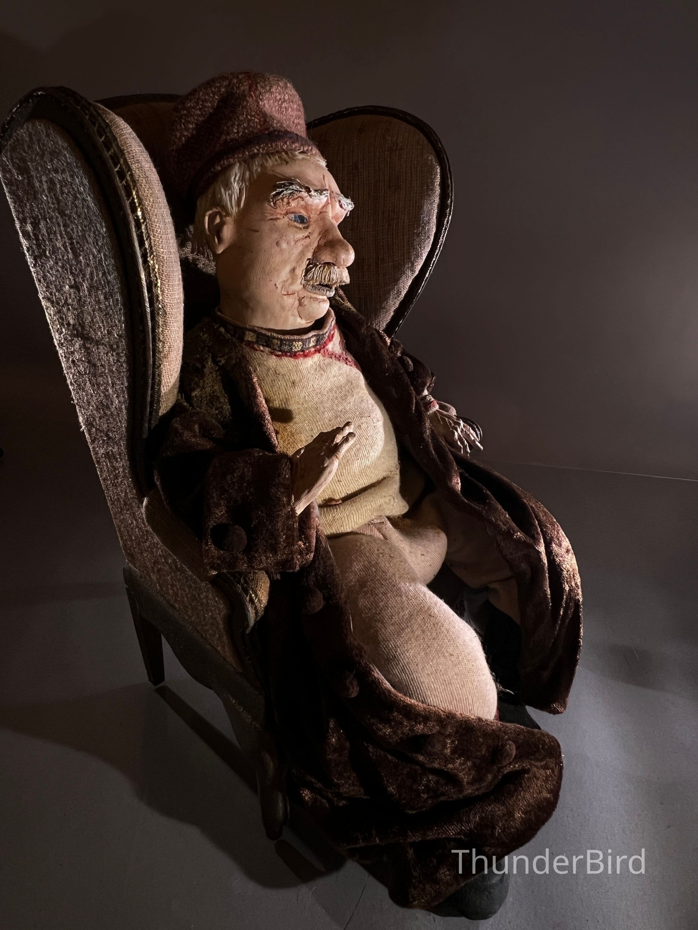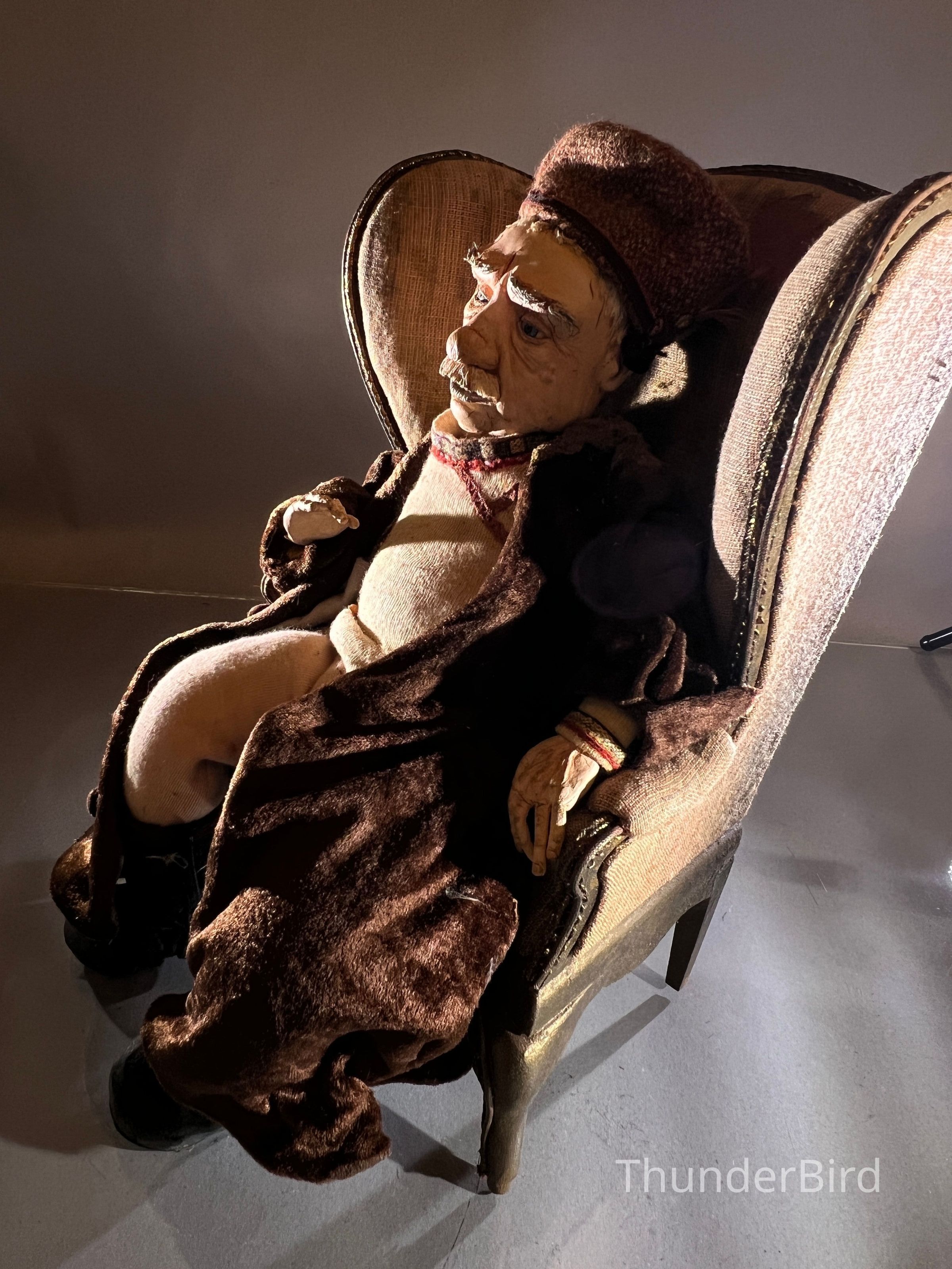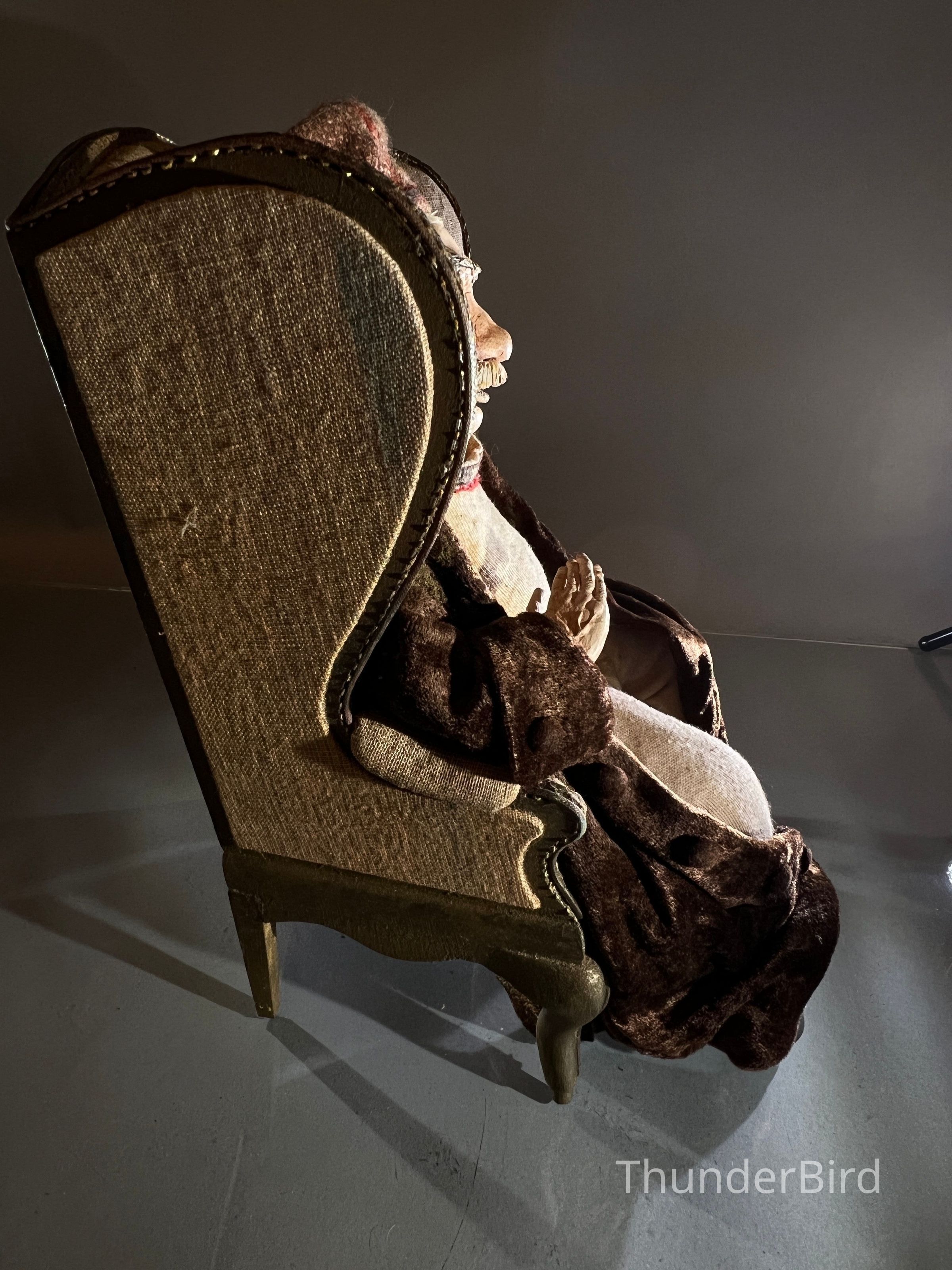 An intriguing seated male puppet, richly expressive and possibly portraying a storyteller, craftsman, or forger character—possibly from Wagner’s Ring Cycle, which Platt adapted in The Ring of the Nibelung (2000). This puppet’s sculpted face is highly detailed, with piercing blue eyes, textured eyebrows, and a solemn expression that suggests wisdom or cunning. He wears a long robe over a padded body, with a stylised period jumper and velvet-like gown. His position in a miniature wingback chair adds an air of gravitas and theatrical stillness.