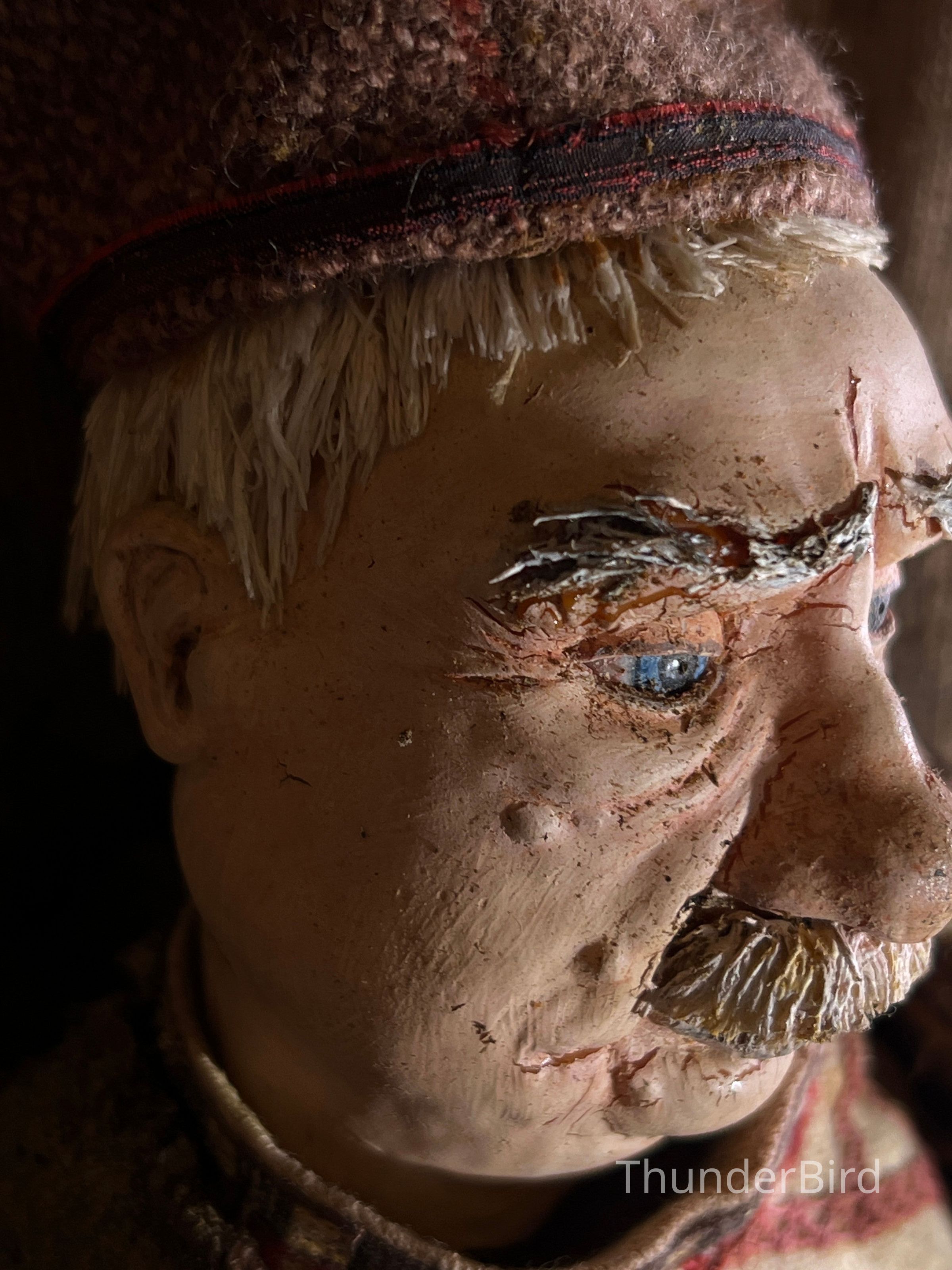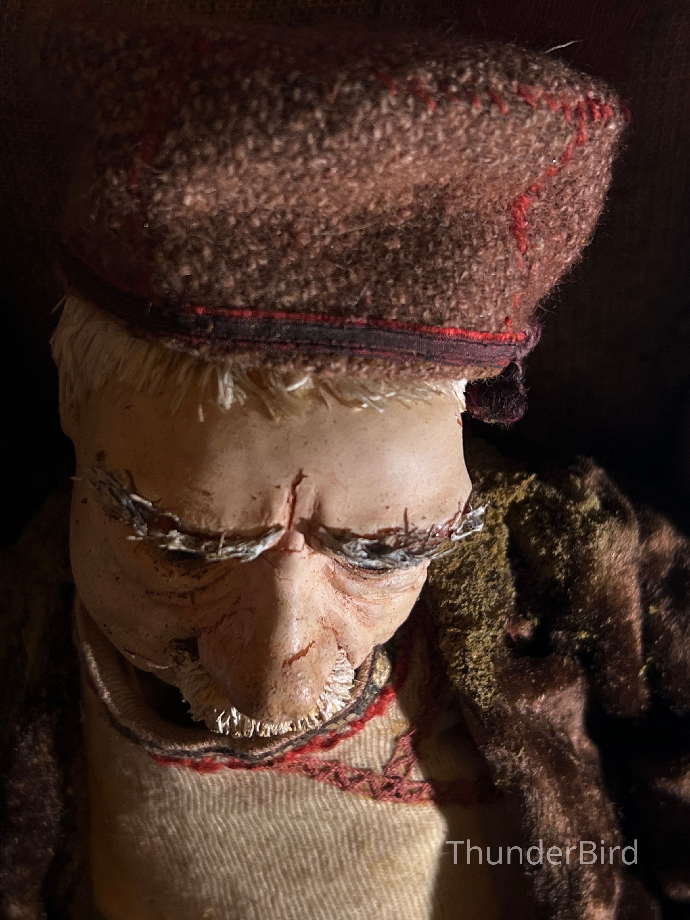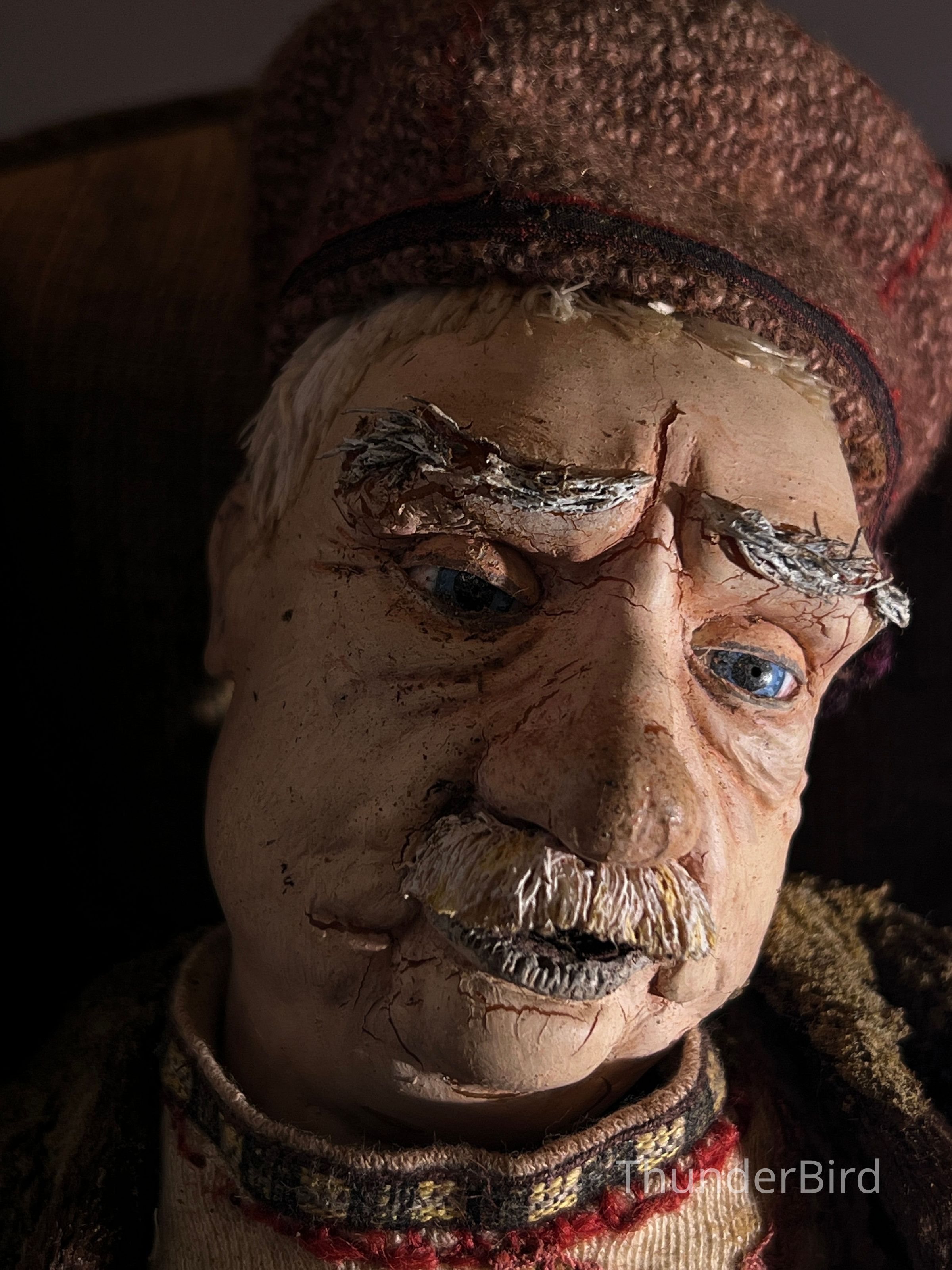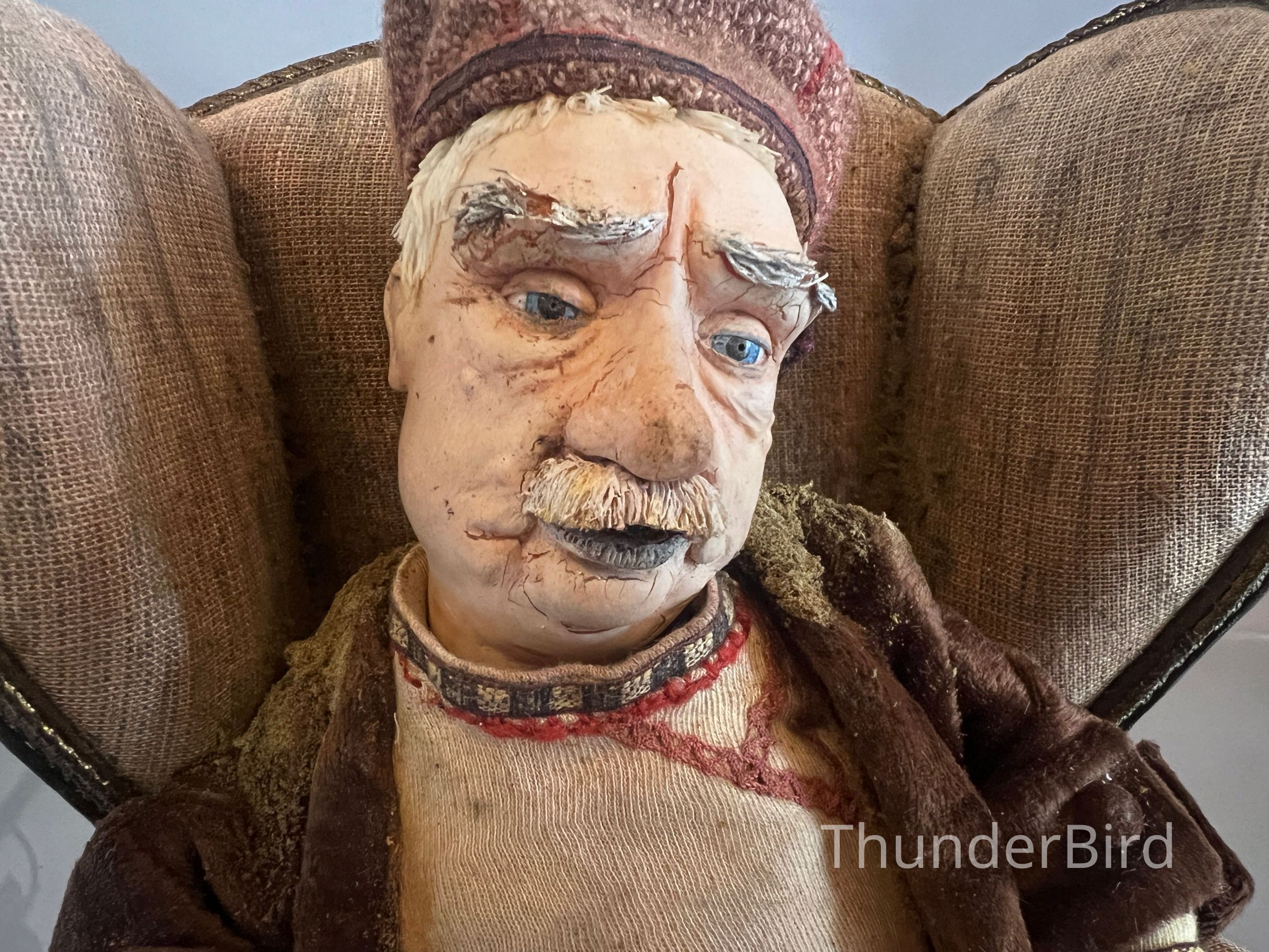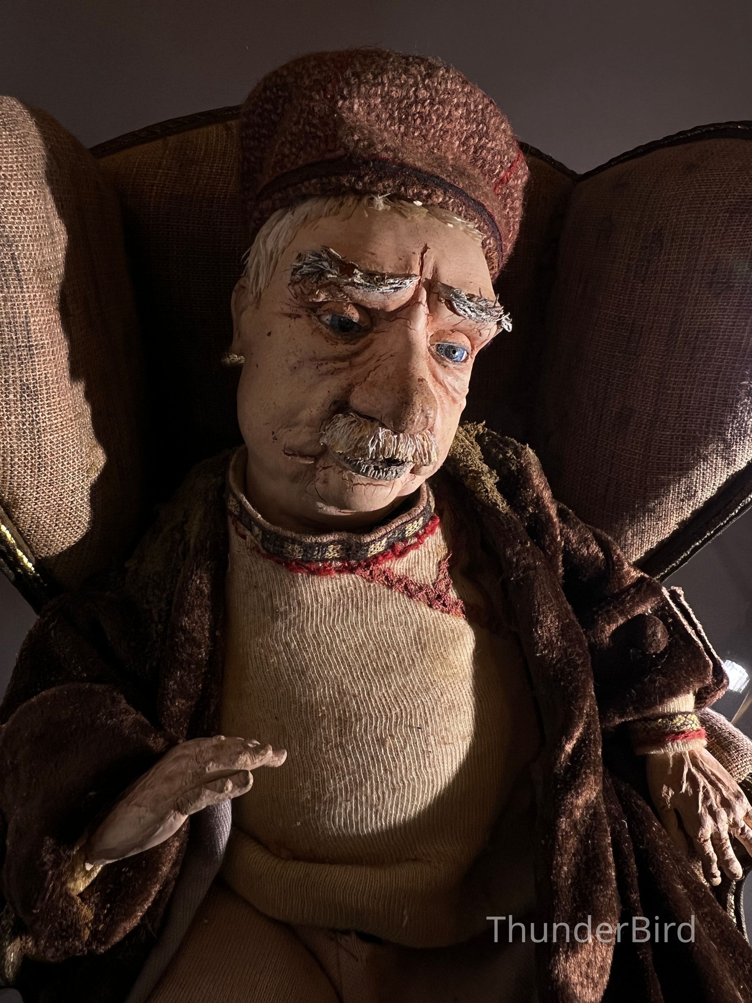 An intriguing seated male puppet, richly expressive and possibly portraying a storyteller, craftsman, or forger character—possibly from Wagner’s Ring Cycle, which Platt adapted in The Ring of the Nibelung (2000). This puppet’s sculpted face is highly detailed, with piercing blue eyes, textured eyebrows, and a solemn expression that suggests wisdom or cunning. He wears a long robe over a padded body, with a stylised period jumper and velvet-like gown. His position in a miniature wingback chair adds an air of gravitas and theatrical stillness.