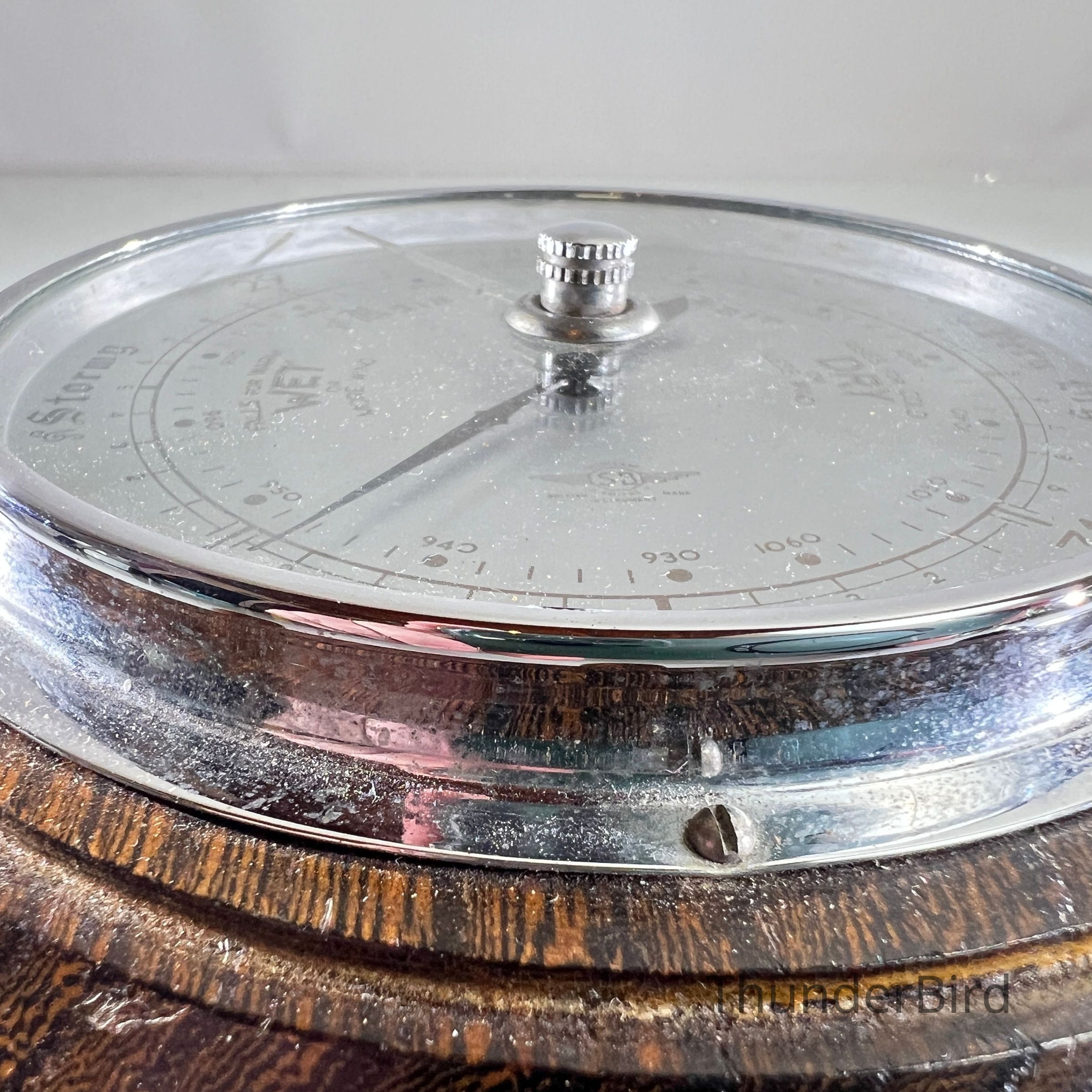 Very good vintage condition. The barometer is in working order and will require calibration by the buyer according to their local pressure settings. The wood frame presents well with some minor marks consistent with age. Chrome bezel retains original shine.