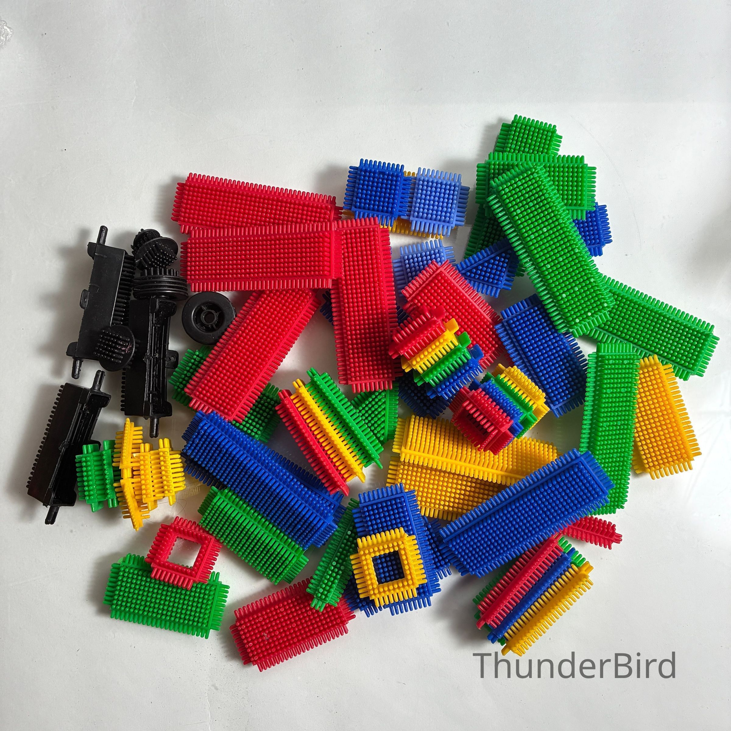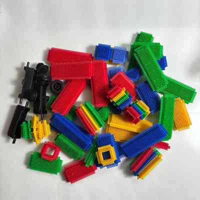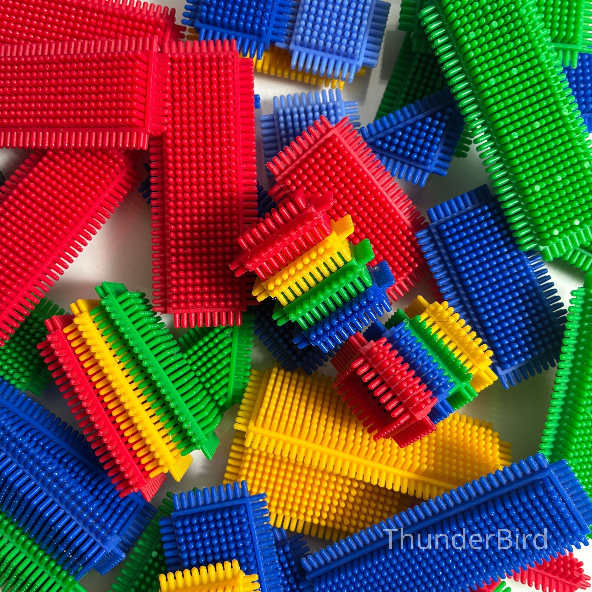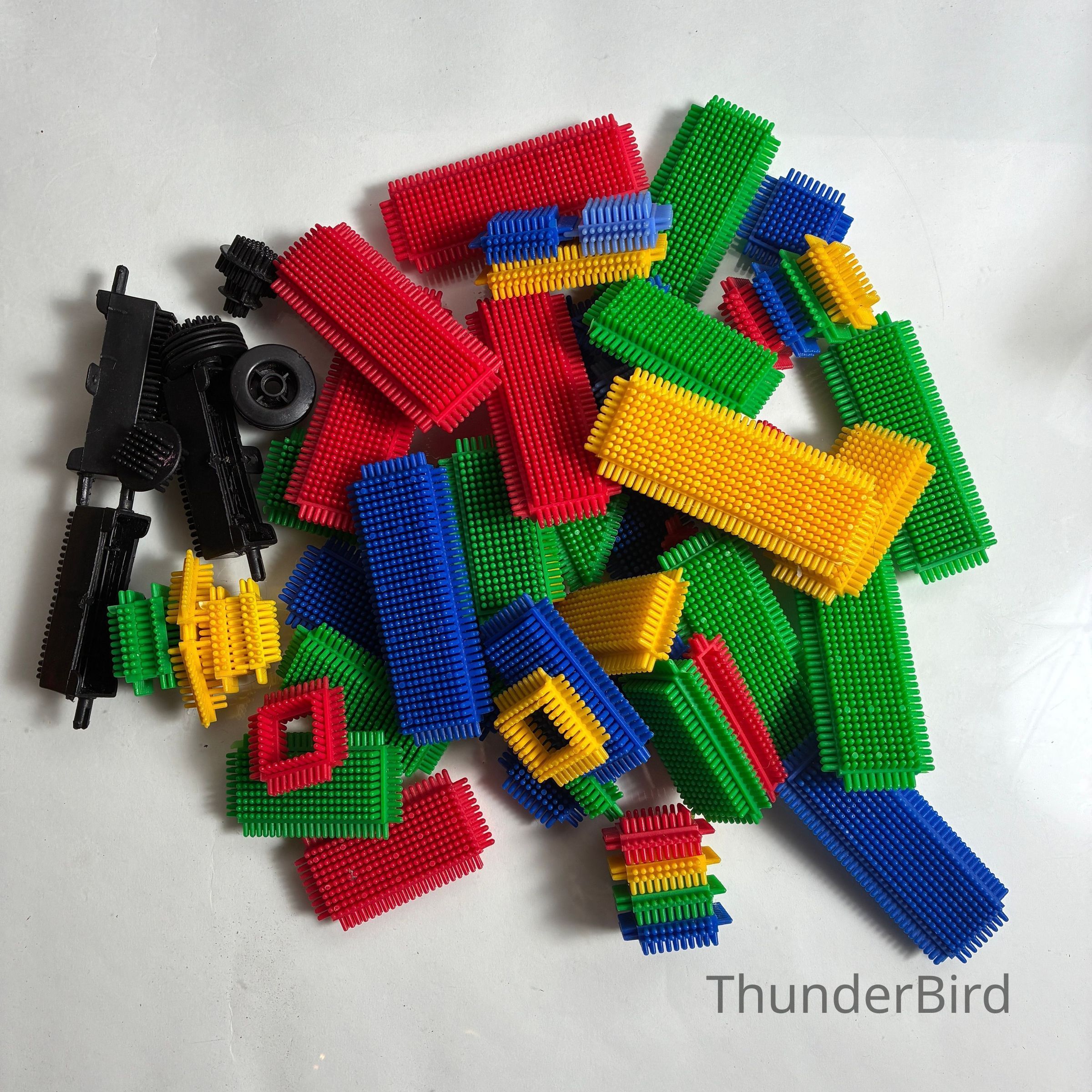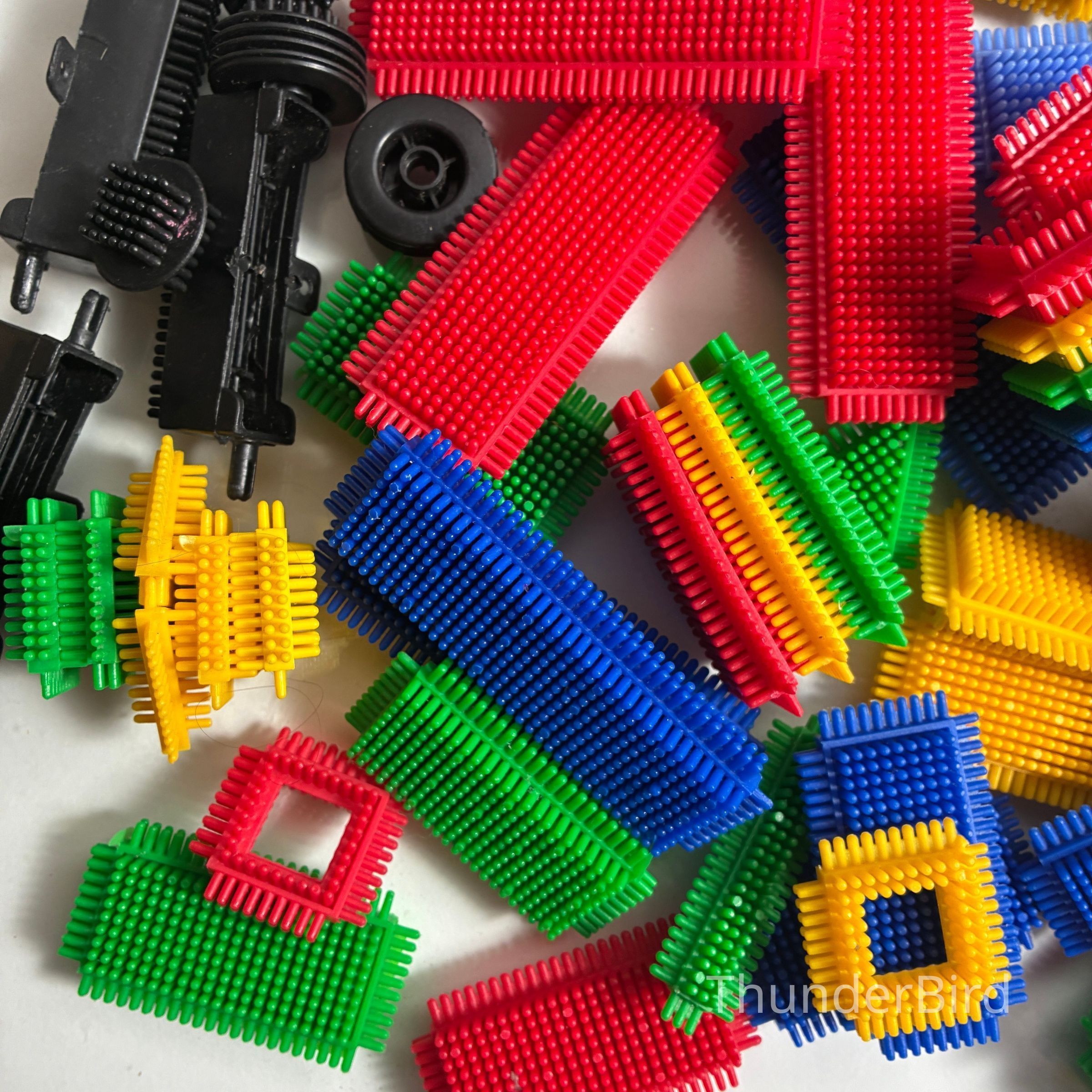 COOL bag of Vintage Playskool Bristle Blocks/Stickie Blocks. These iconic building blocks, introduced in the 1960s, feature soft, flexible bristles that interlock to create endless structures. Let these blocks inspire creativity and fine motor skills as you relive the joy of childhood play. Unleash your imagination and rediscover the magic of these very fun creative toys.