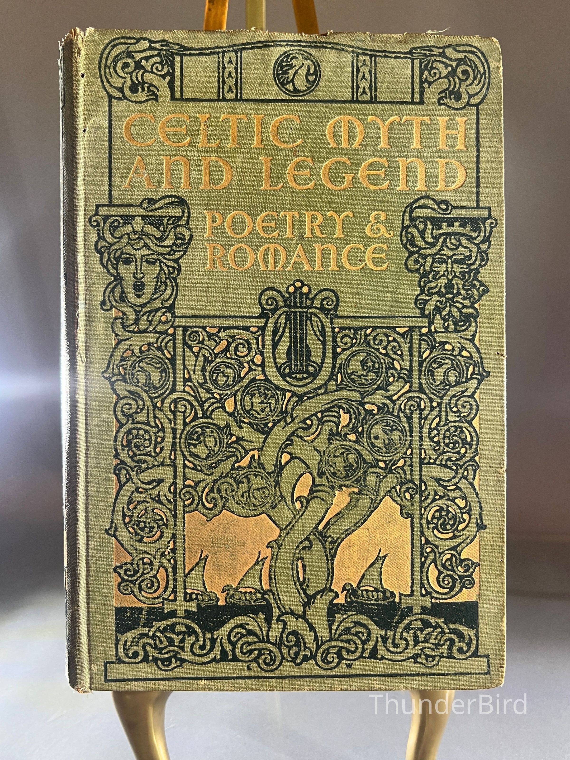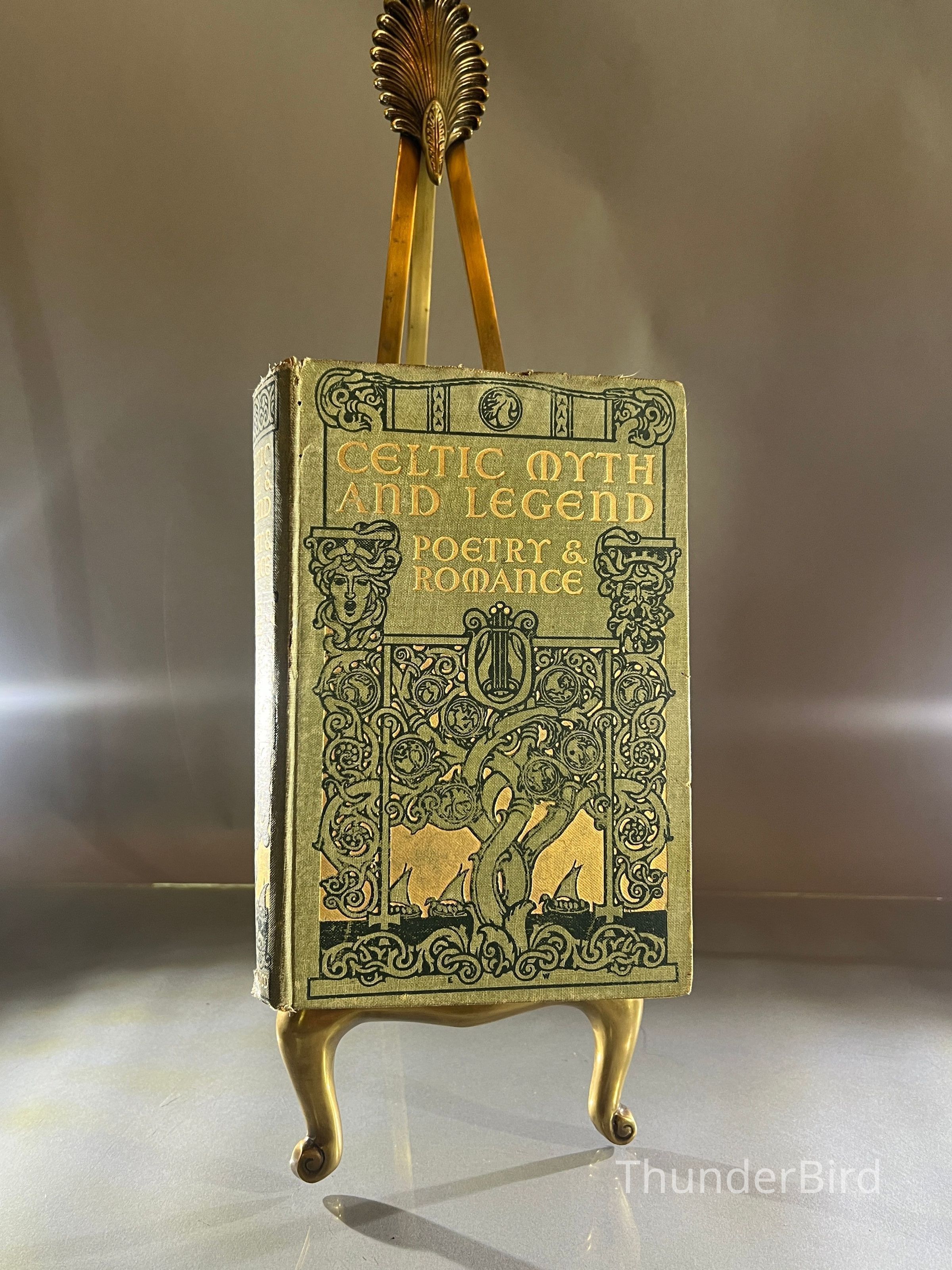 A highly collectible first edition of Celtic Myth and Legend: Poetry & Romance by Charles Squire, published by The Gresham Publishing Company, London, circa 1905. This edition is especially prized for its elaborate gilt-stamped Art Nouveau binding, featuring intertwined knotwork and decorative motifs with strong symbolism rooted in Celtic tradition.