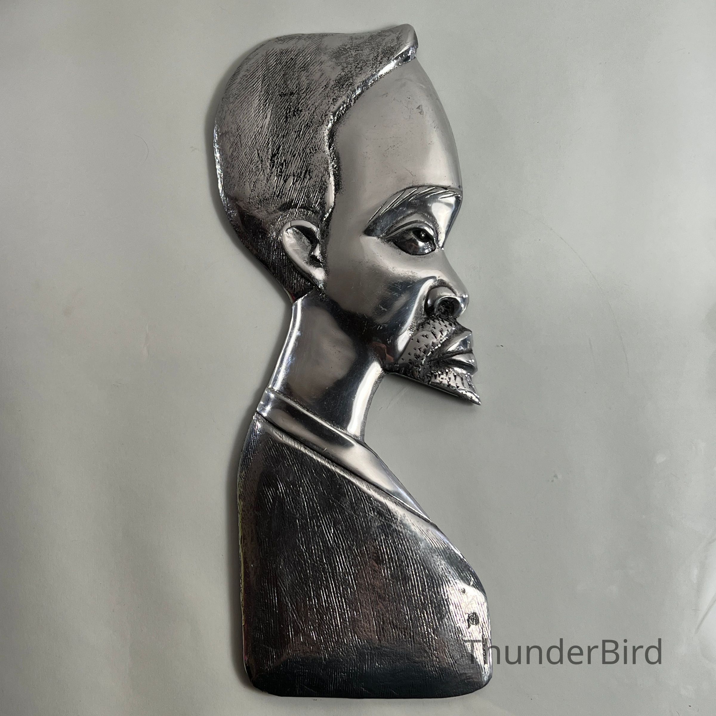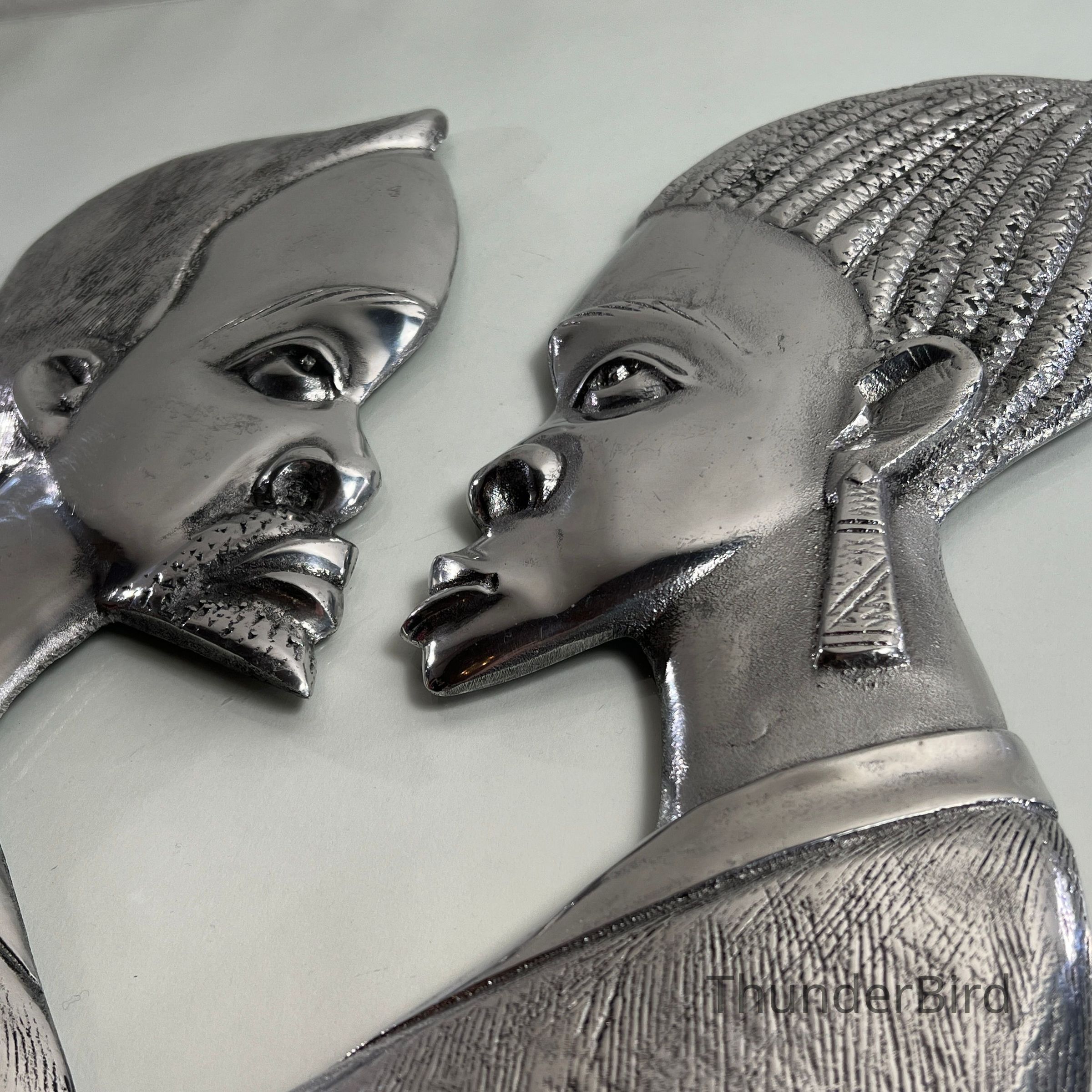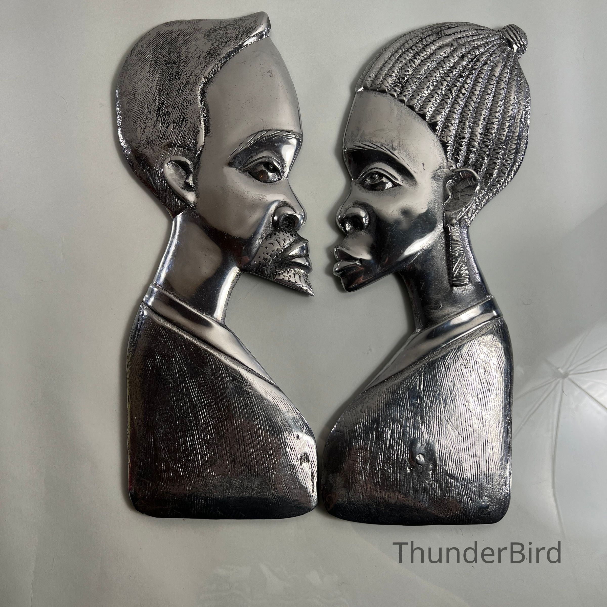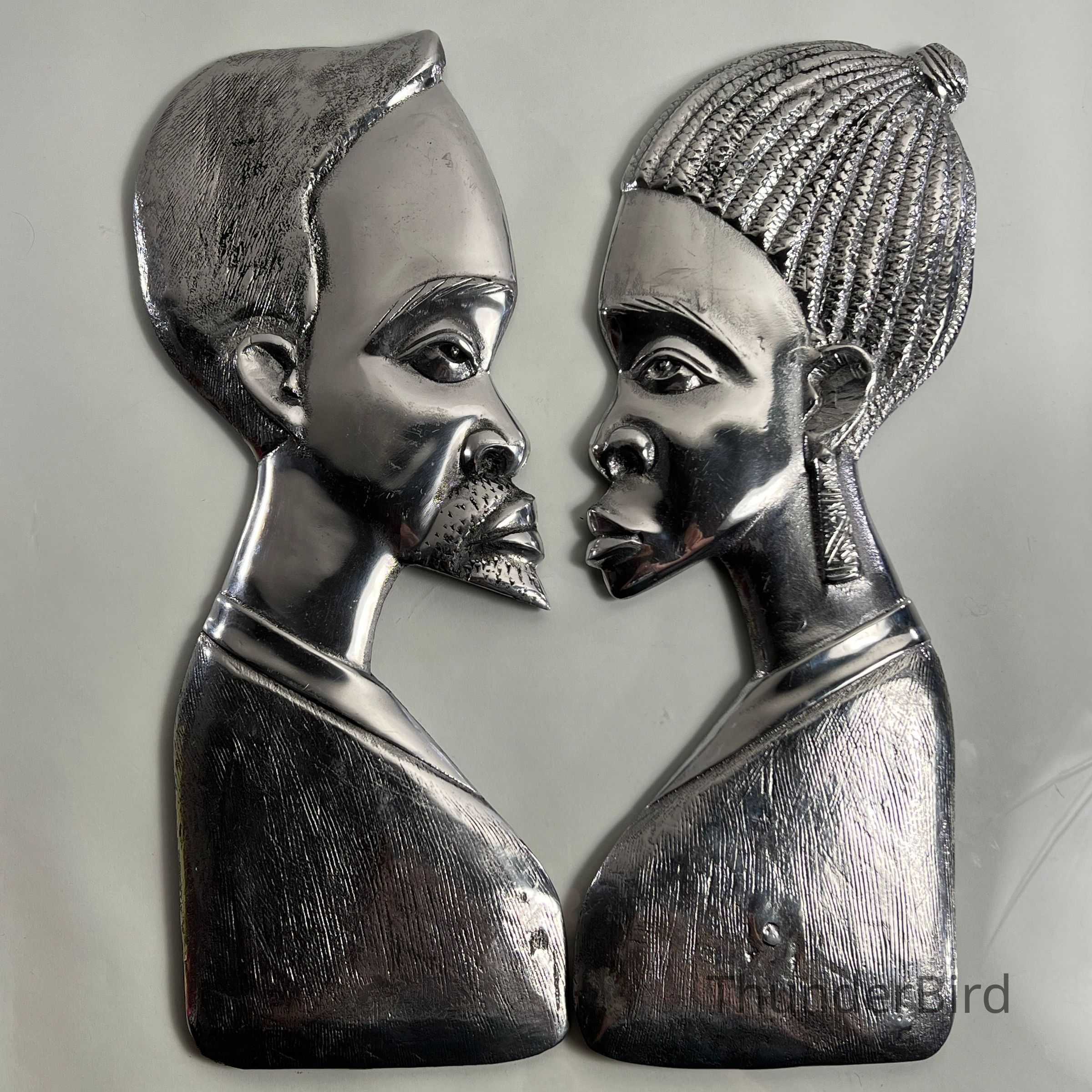 Striking pair of stylised vintage chrome wall plaques, representing a male and female bust in profile. Each piece is cast in relief with fine detailing to facial features and hair, then finished in a highly reflective chrome-like surface. The reverse of each piece is marked "FIBA0003" and "FIBA0002" respectively, likely produced in the mid-to-late 20th century, possibly inspired by African modernist design movements.