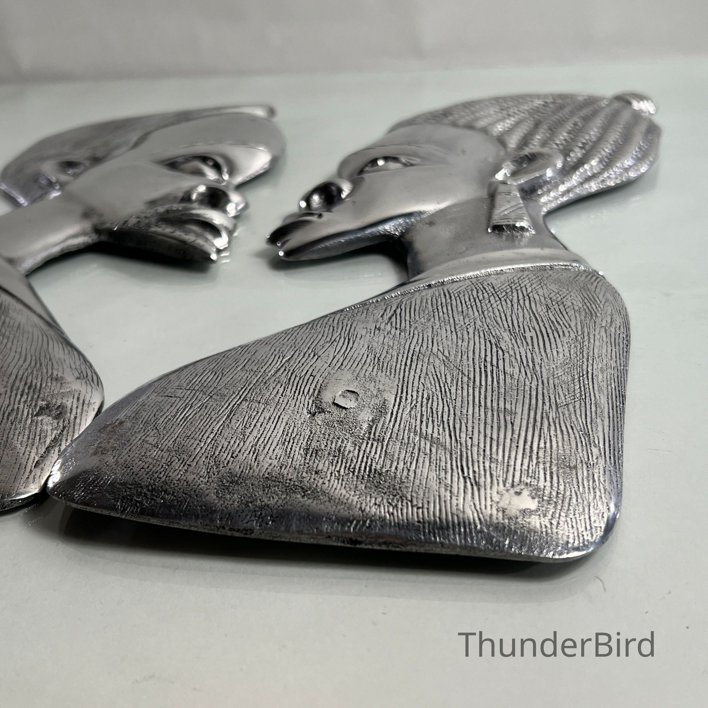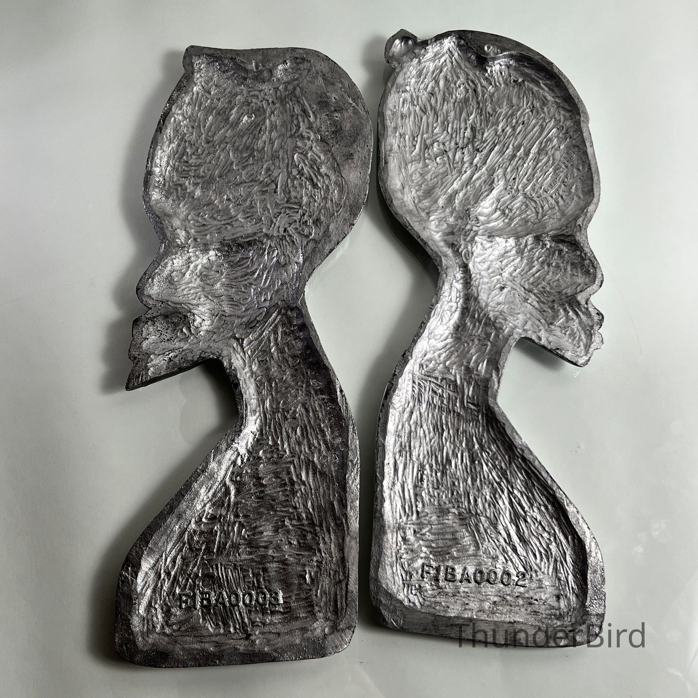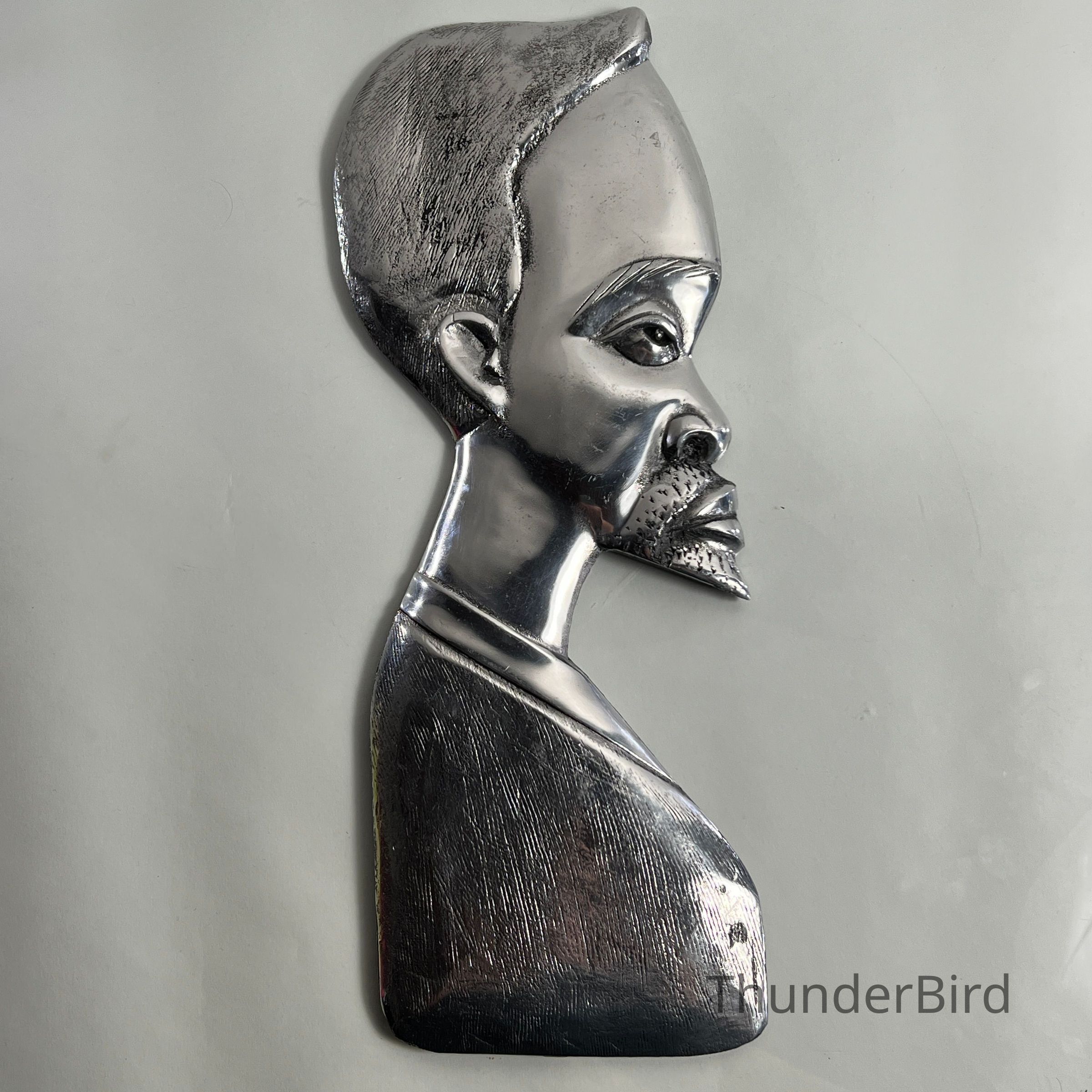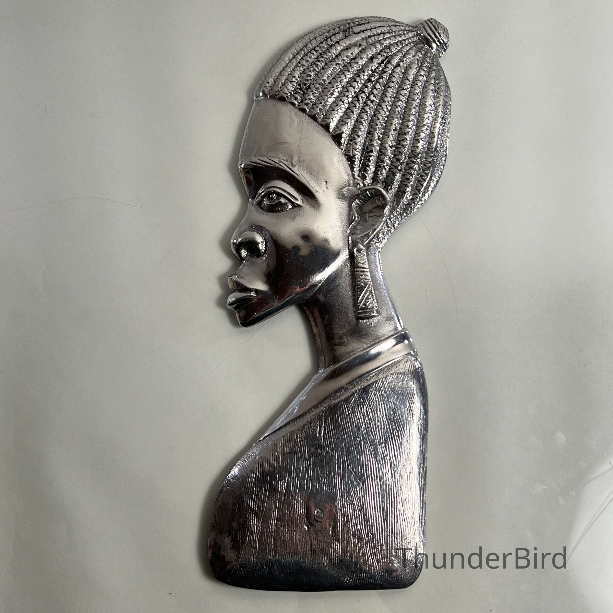 Striking pair of stylised vintage chrome wall plaques, representing a male and female bust in profile. Each piece is cast in relief with fine detailing to facial features and hair, then finished in a highly reflective chrome-like surface. The reverse of each piece is marked "FIBA0003" and "FIBA0002" respectively, likely produced in the mid-to-late 20th century, possibly inspired by African modernist design movements.