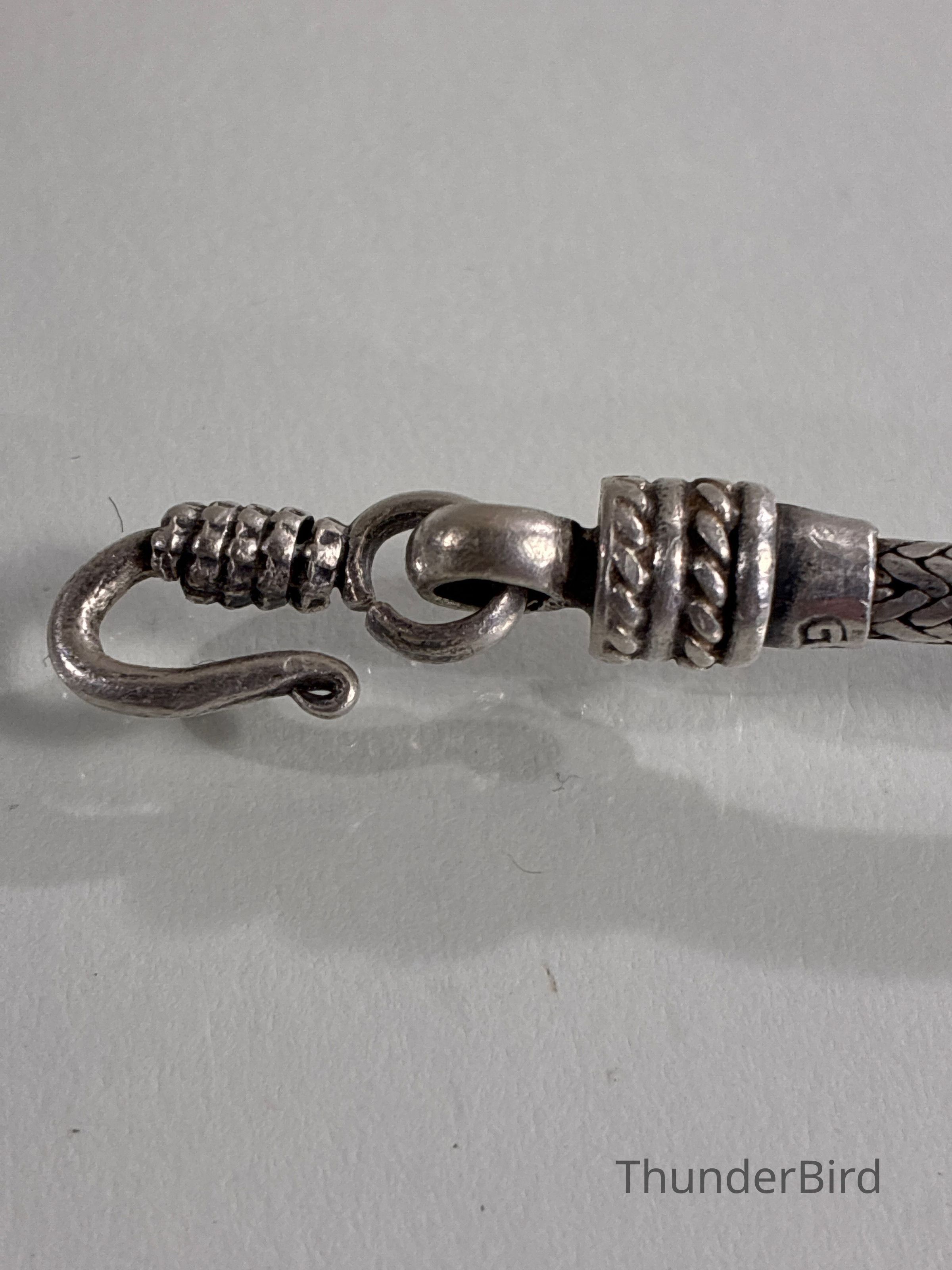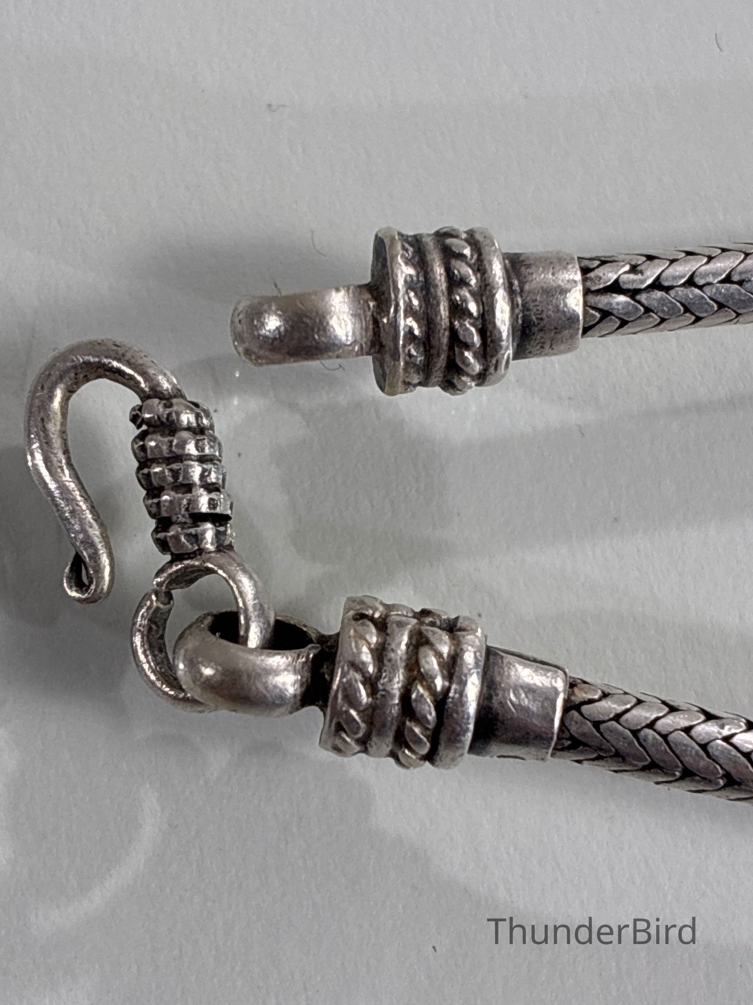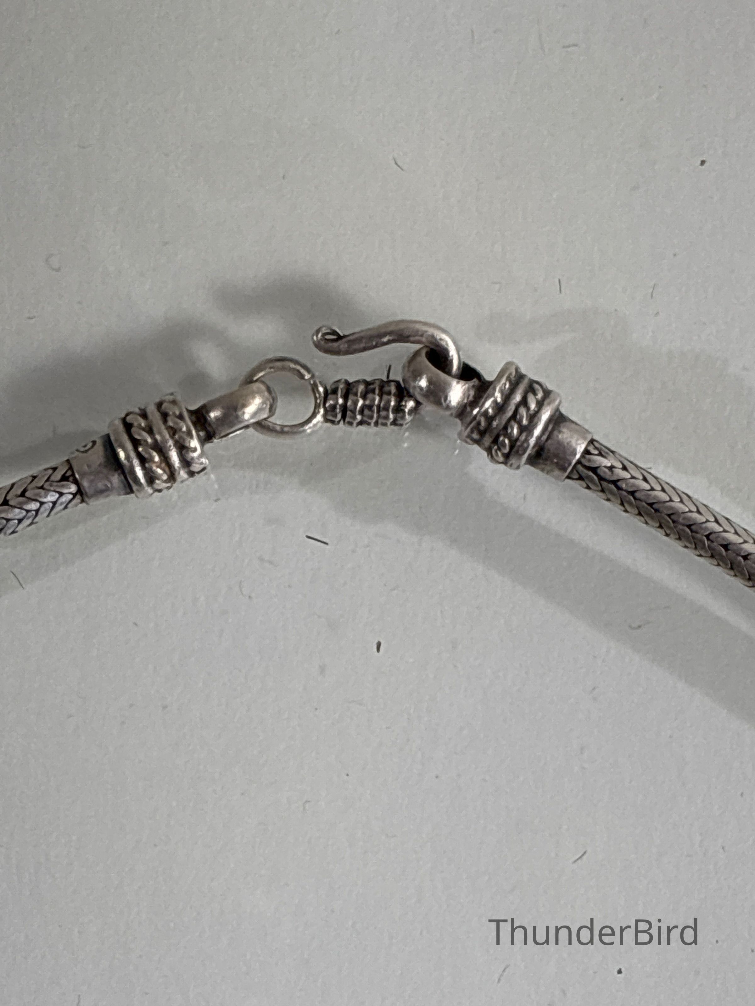 Beautifully crafted artisan necklace in a dense foxtail or plaited woven silver design. Believed to be solid sterling silver based on weight, finish, and lack of visible wear. The piece is highly tactile with a pleasing drape, featuring detailed twisted wire terminals and a traditional hook clasp—characteristic of handcrafted silver jewellery from India or Southeast Asia, popular from the 1980s onward.
