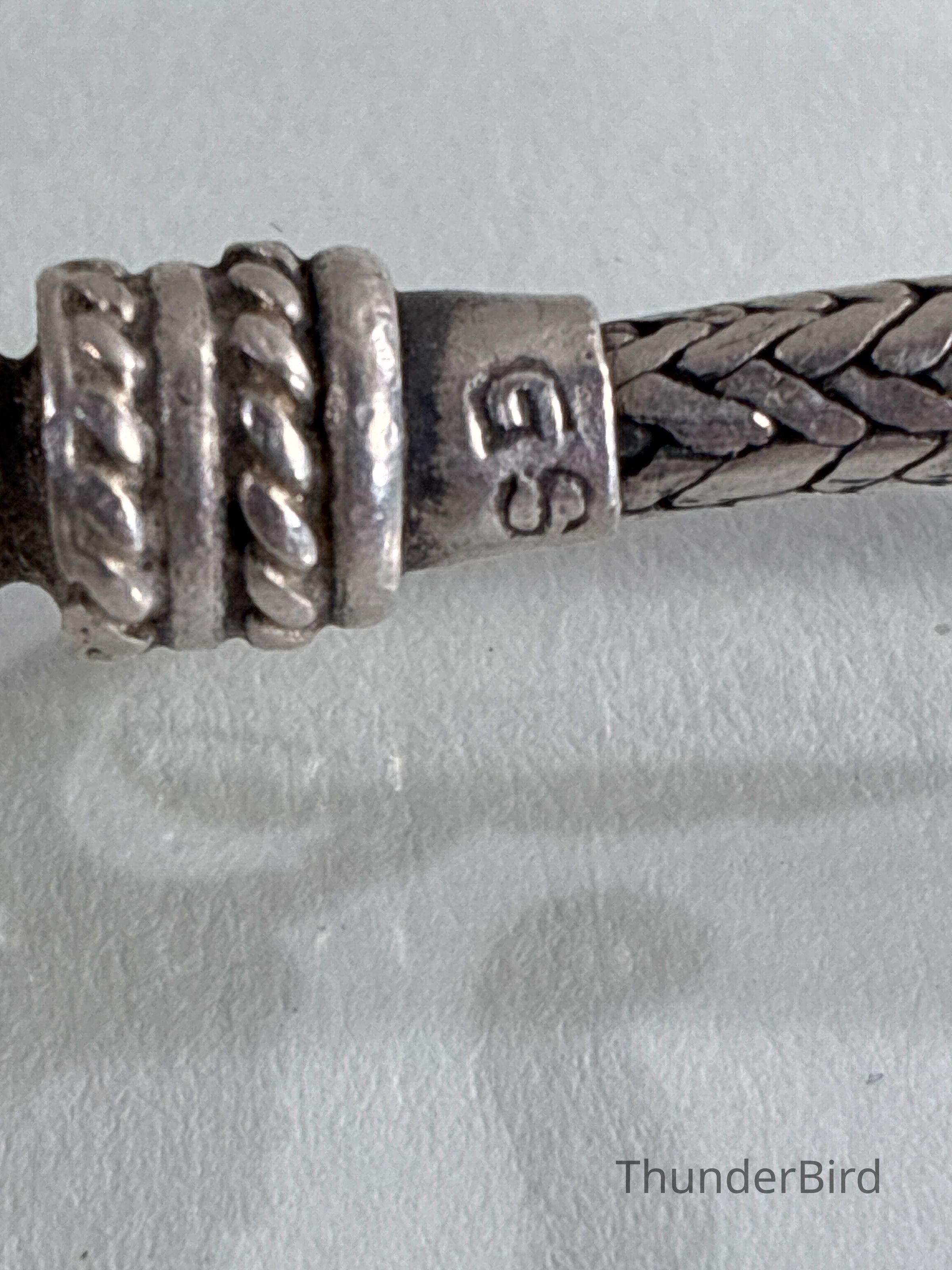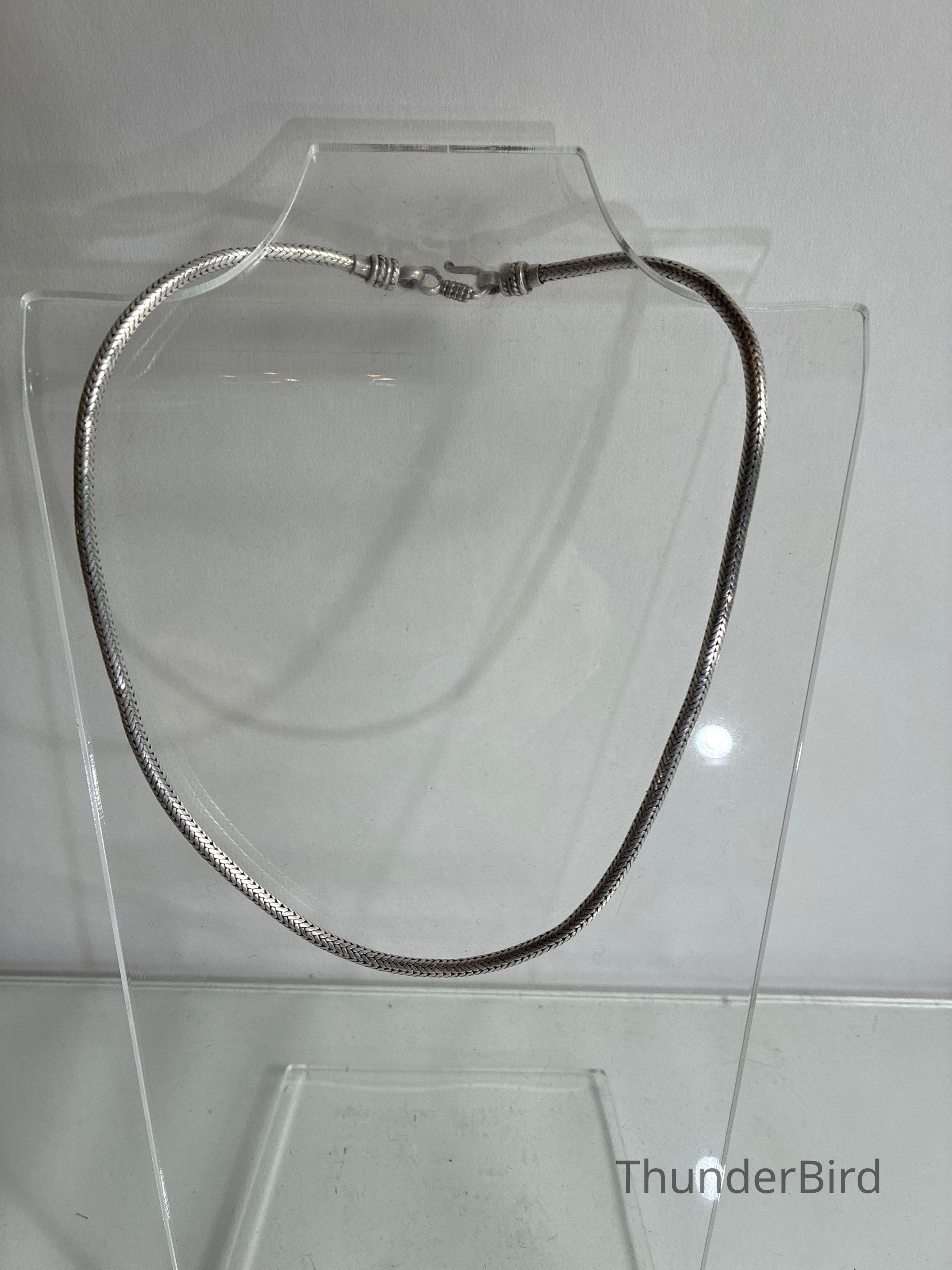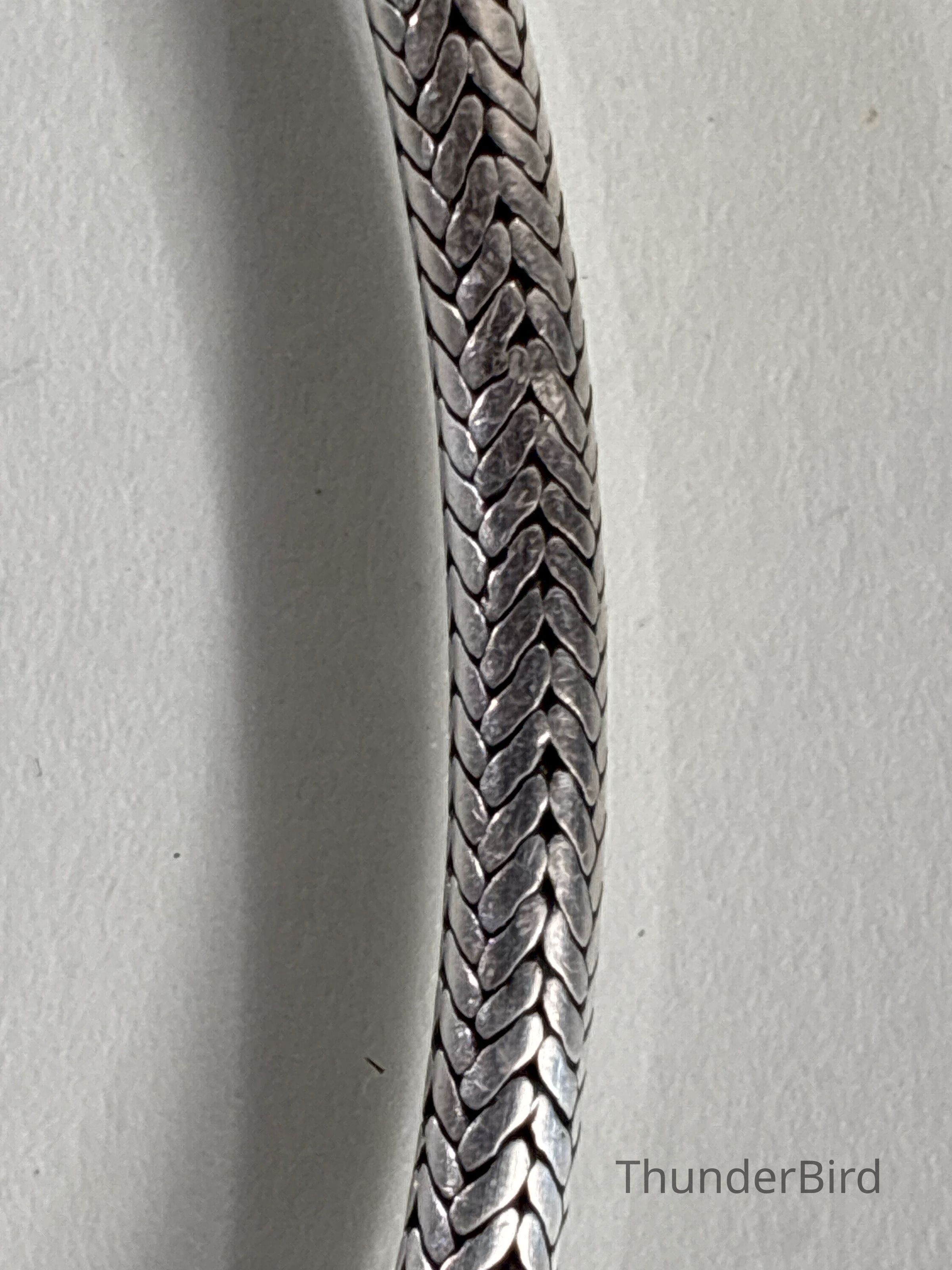 Beautifully crafted artisan necklace in a dense foxtail or plaited woven silver design. Believed to be solid sterling silver based on weight, finish, and lack of visible wear. The piece is highly tactile with a pleasing drape, featuring detailed twisted wire terminals and a traditional hook clasp—characteristic of handcrafted silver jewellery from India or Southeast Asia, popular from the 1980s onward.