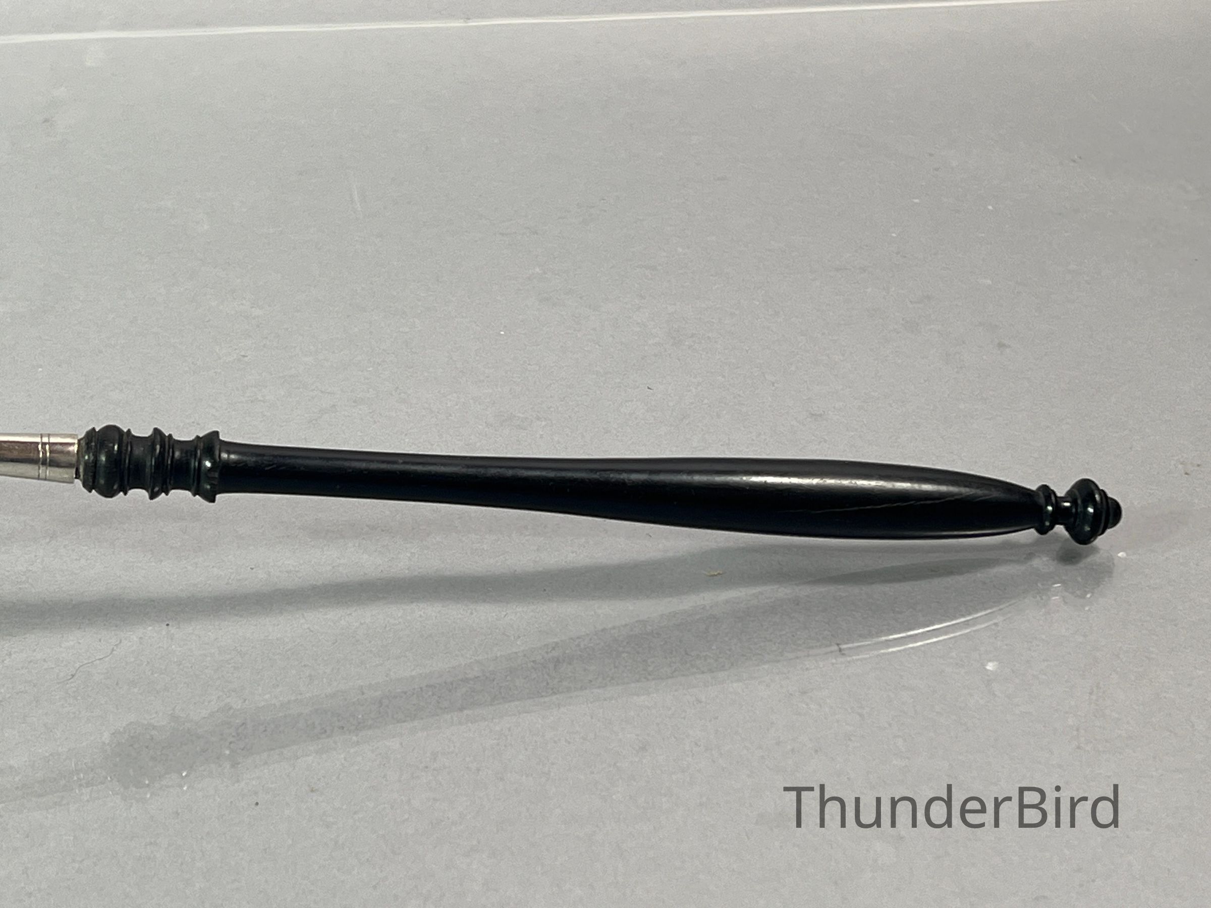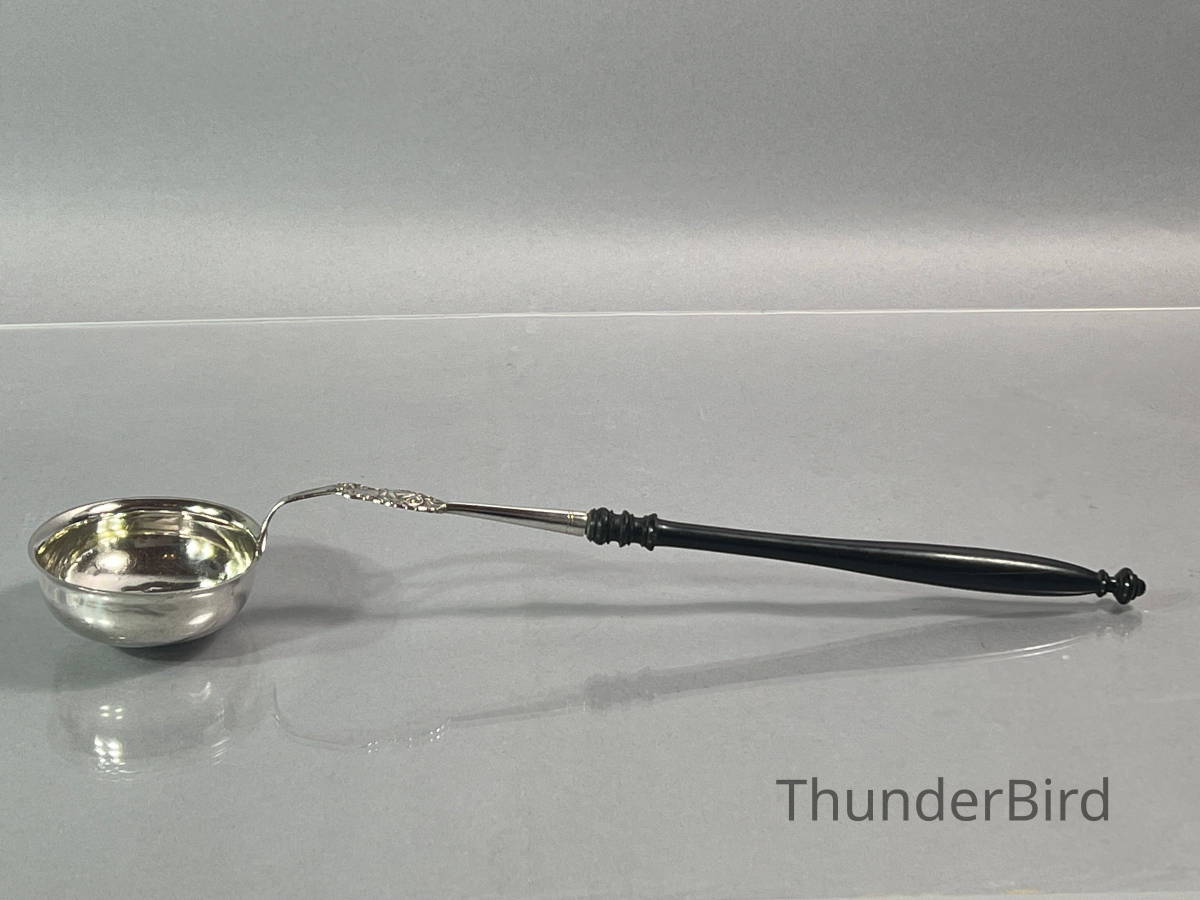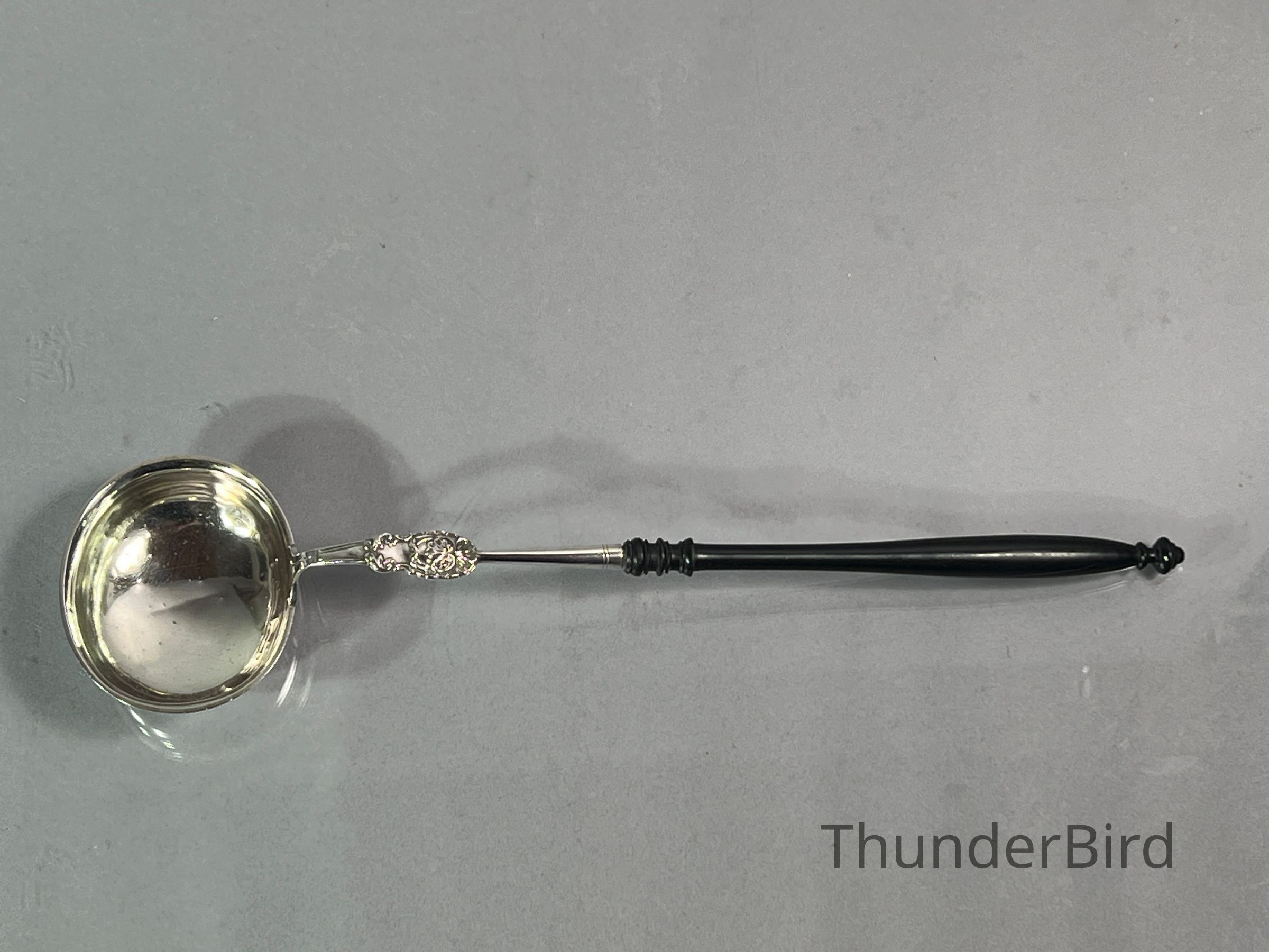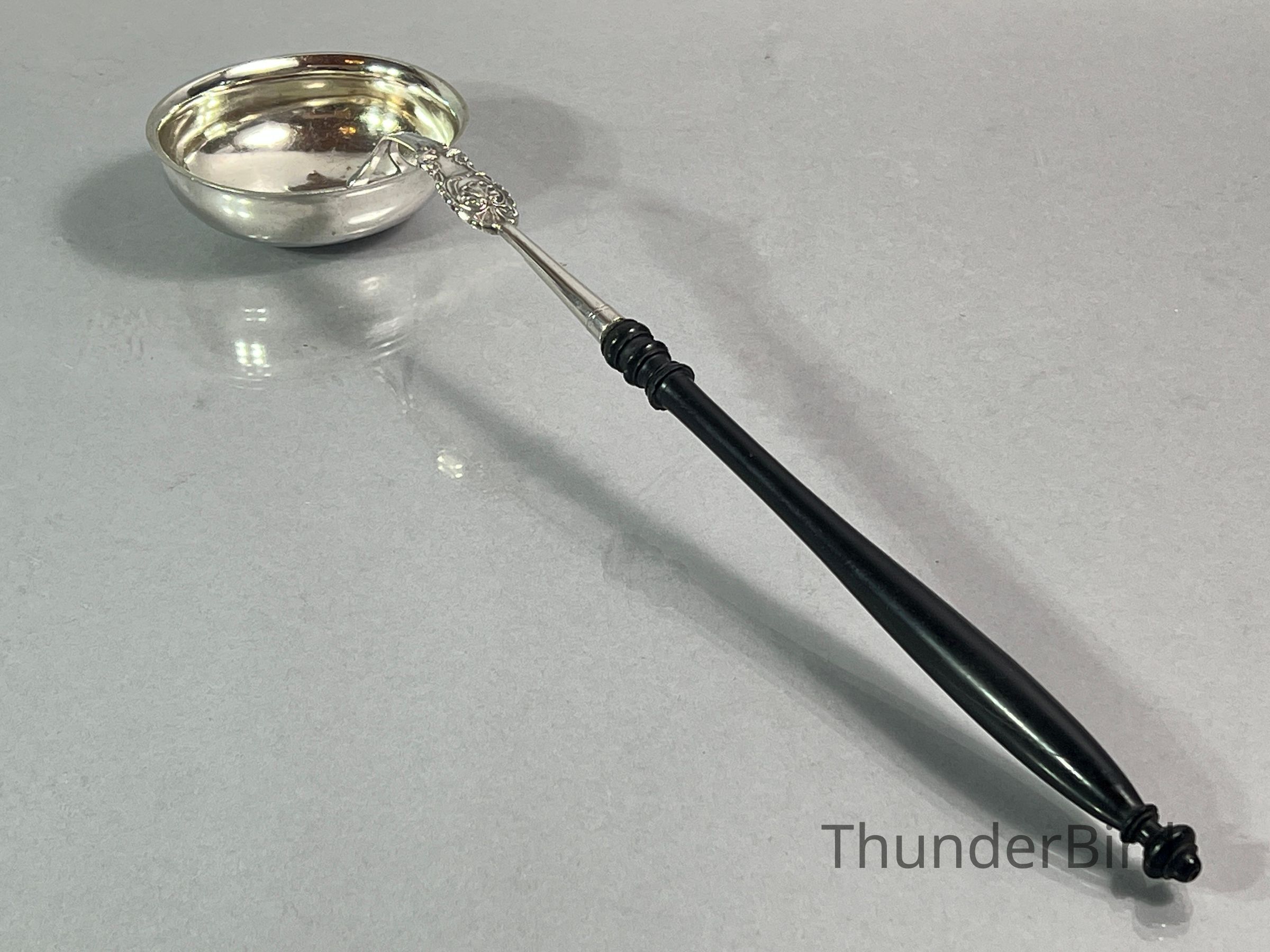 The ladle is hallmarked with "THO ASPERN" and a symbol, identifying it as a German-made piece. It features a finely crafted silver bowl and an elegant turned ebony wood handle. The historical inscriptions add to its charm and provenance.