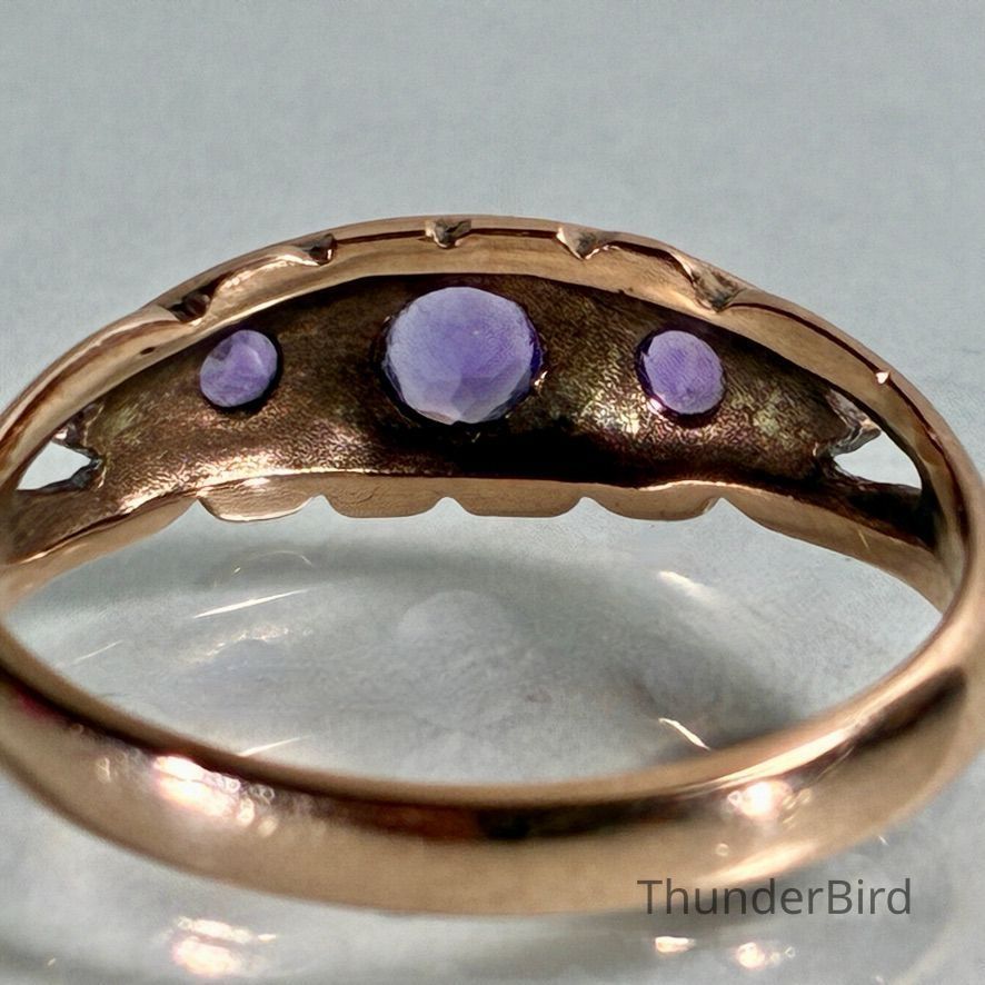 A finely crafted antique 9-carat gold ring, set with three round-cut amethyst gemstones, claw-set in a decorative pierced gallery with split shoulders. The central amethyst is slightly larger, flanked by two matched smaller stones, forming a classic trilogy arrangement, often symbolising past, present, and future.