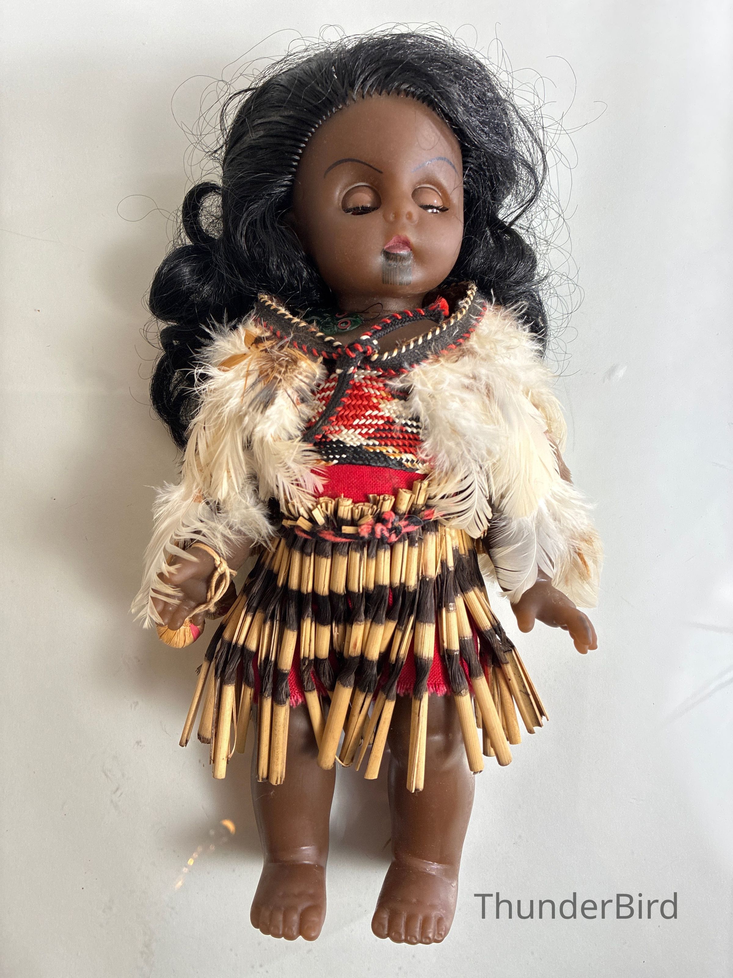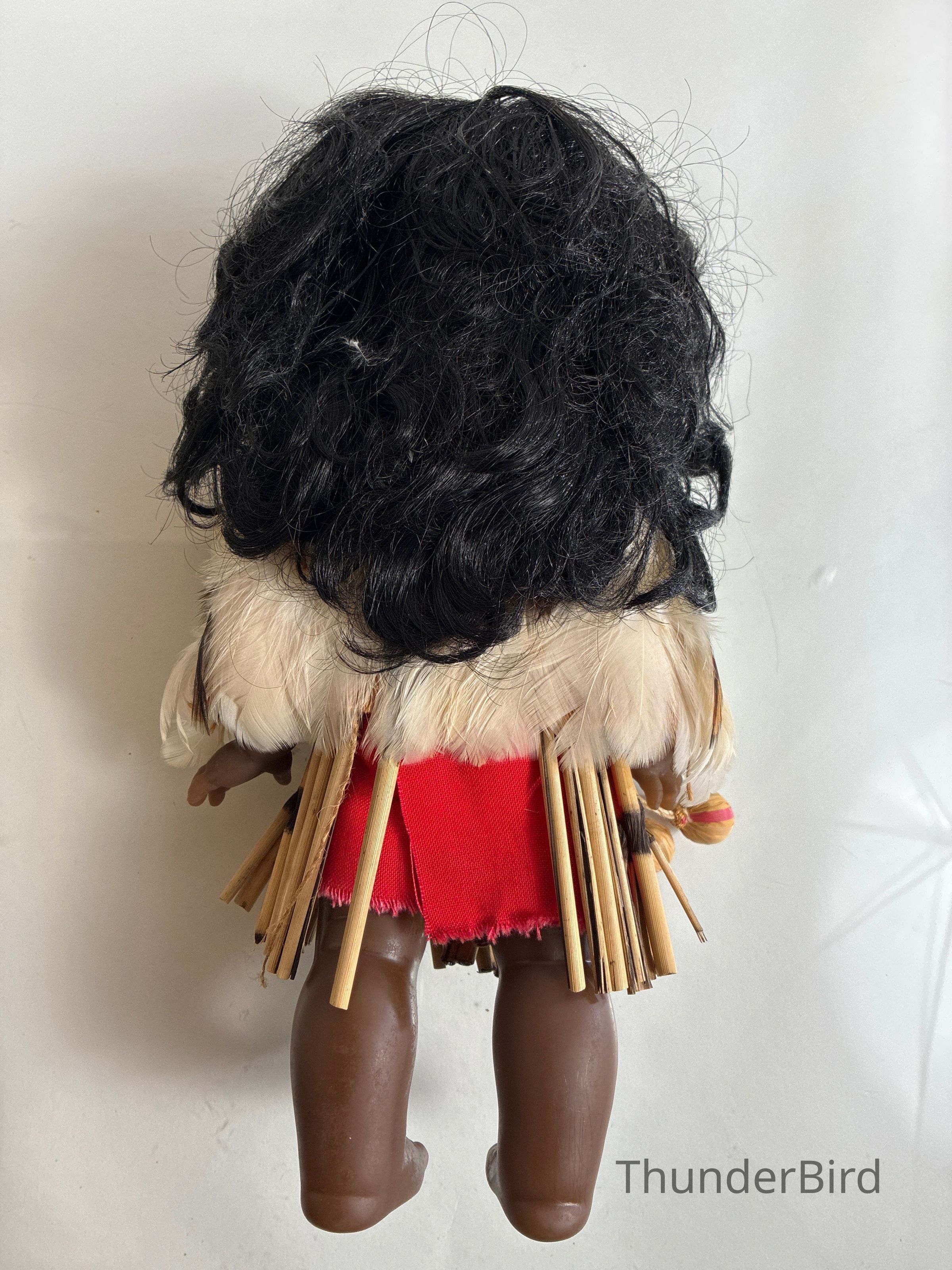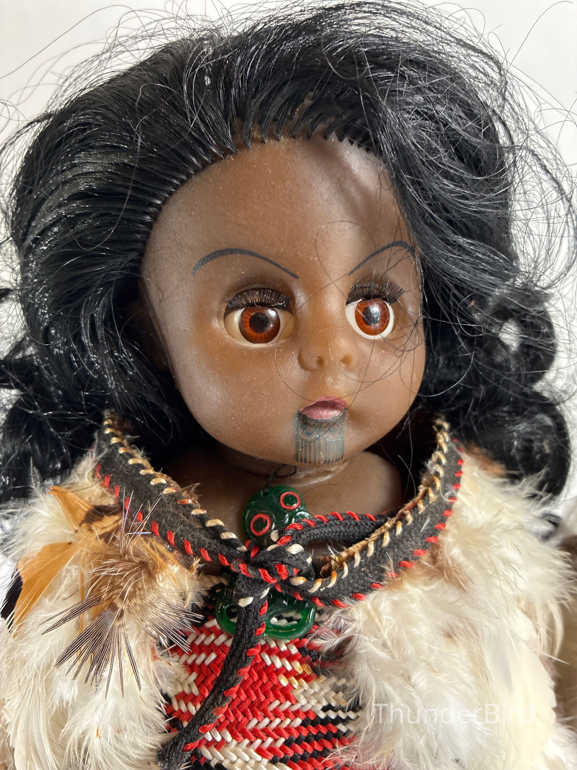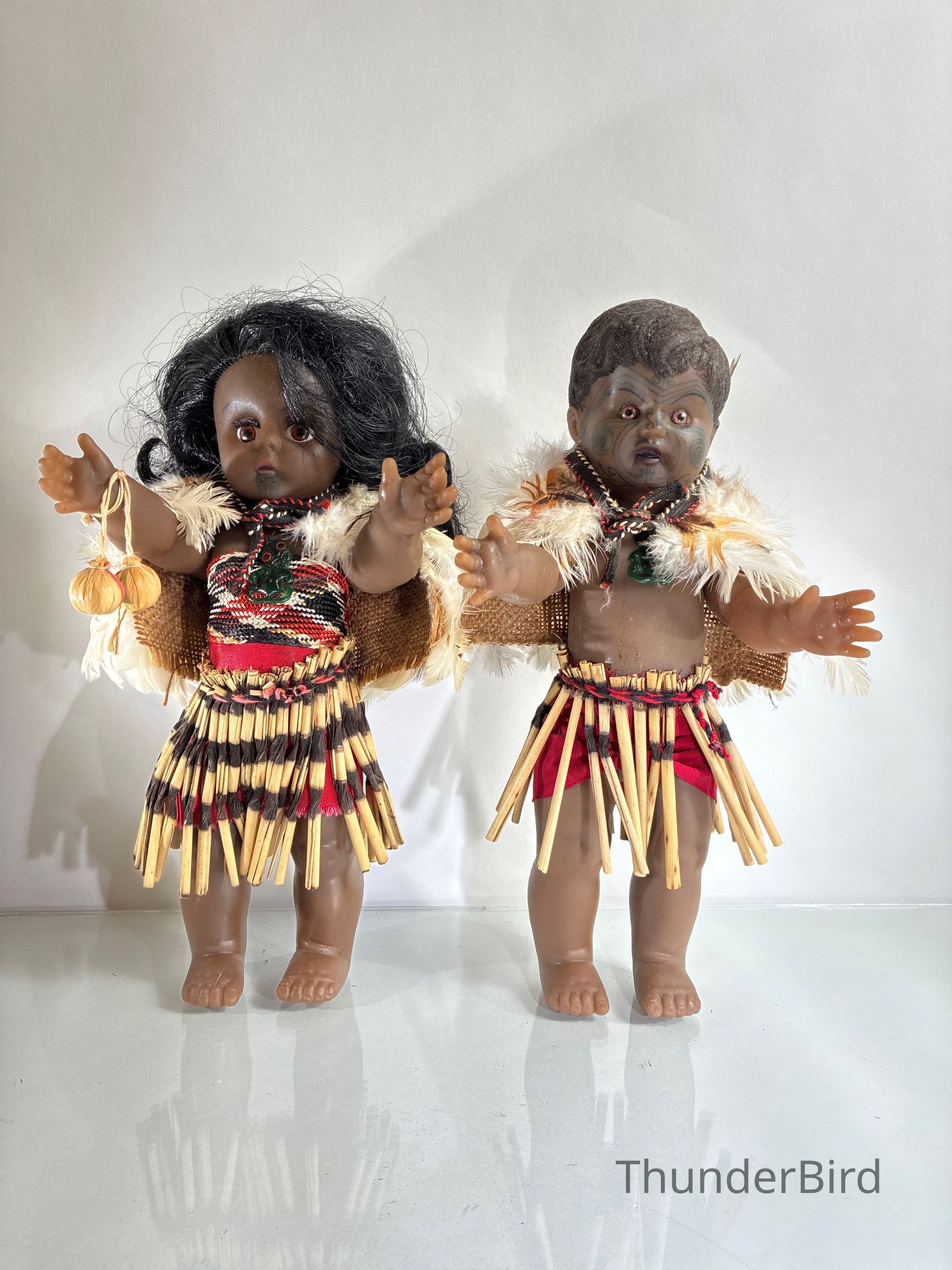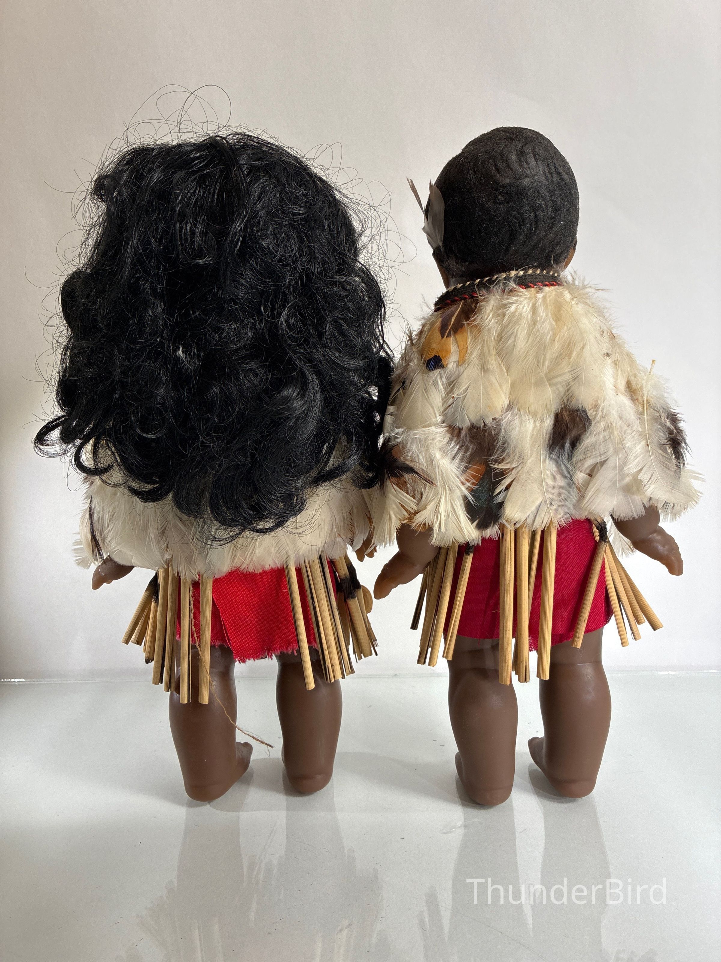 Good vintage condition overall. Both dolls show minor signs of age-related wear. Hair is intact and clothing is well-preserved with original detailing, though slight fraying to fabric edges is noted. Facial paintwork, especially moko and lips, remains clear. Please refer closely to photos for condition specifics.