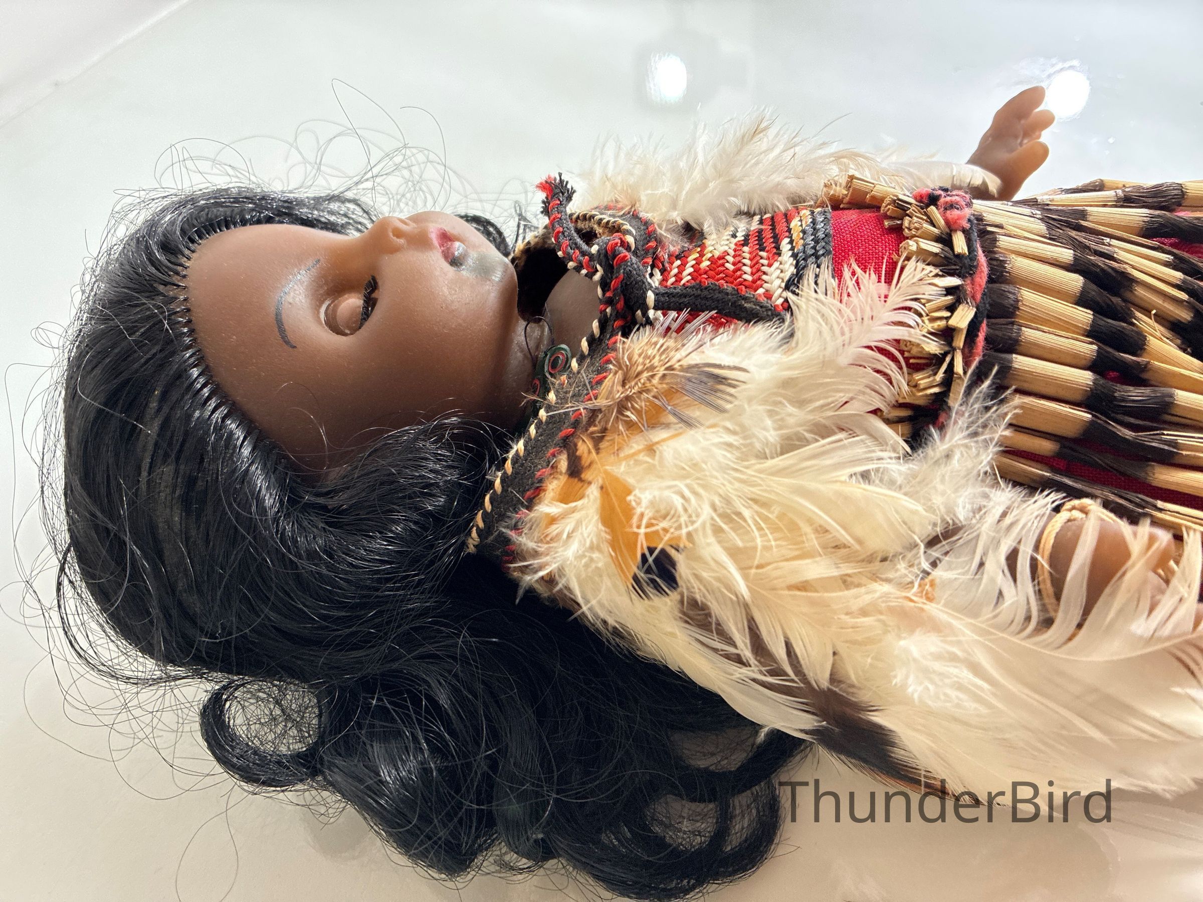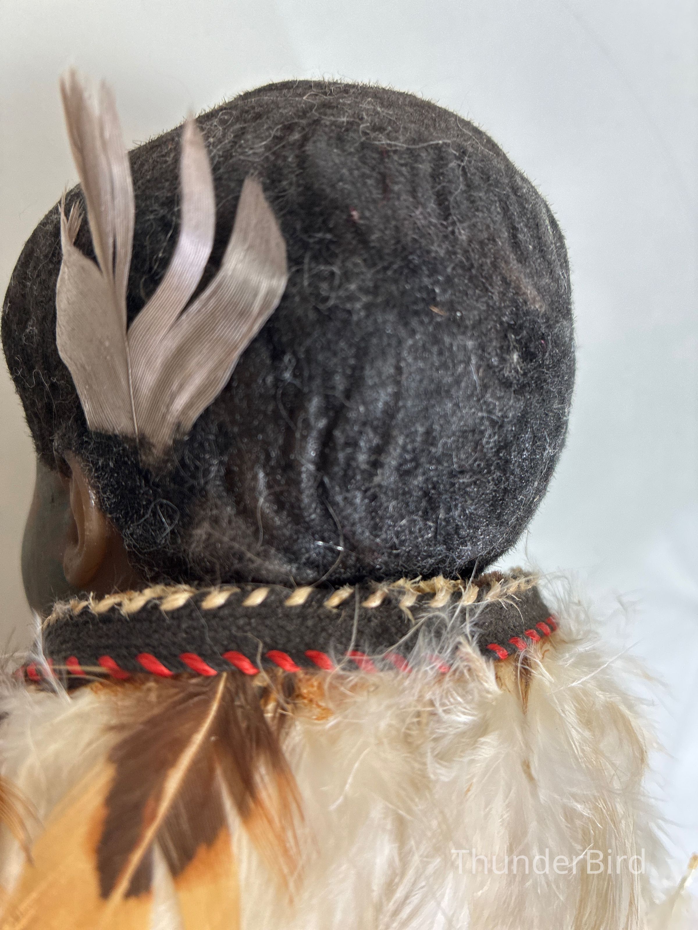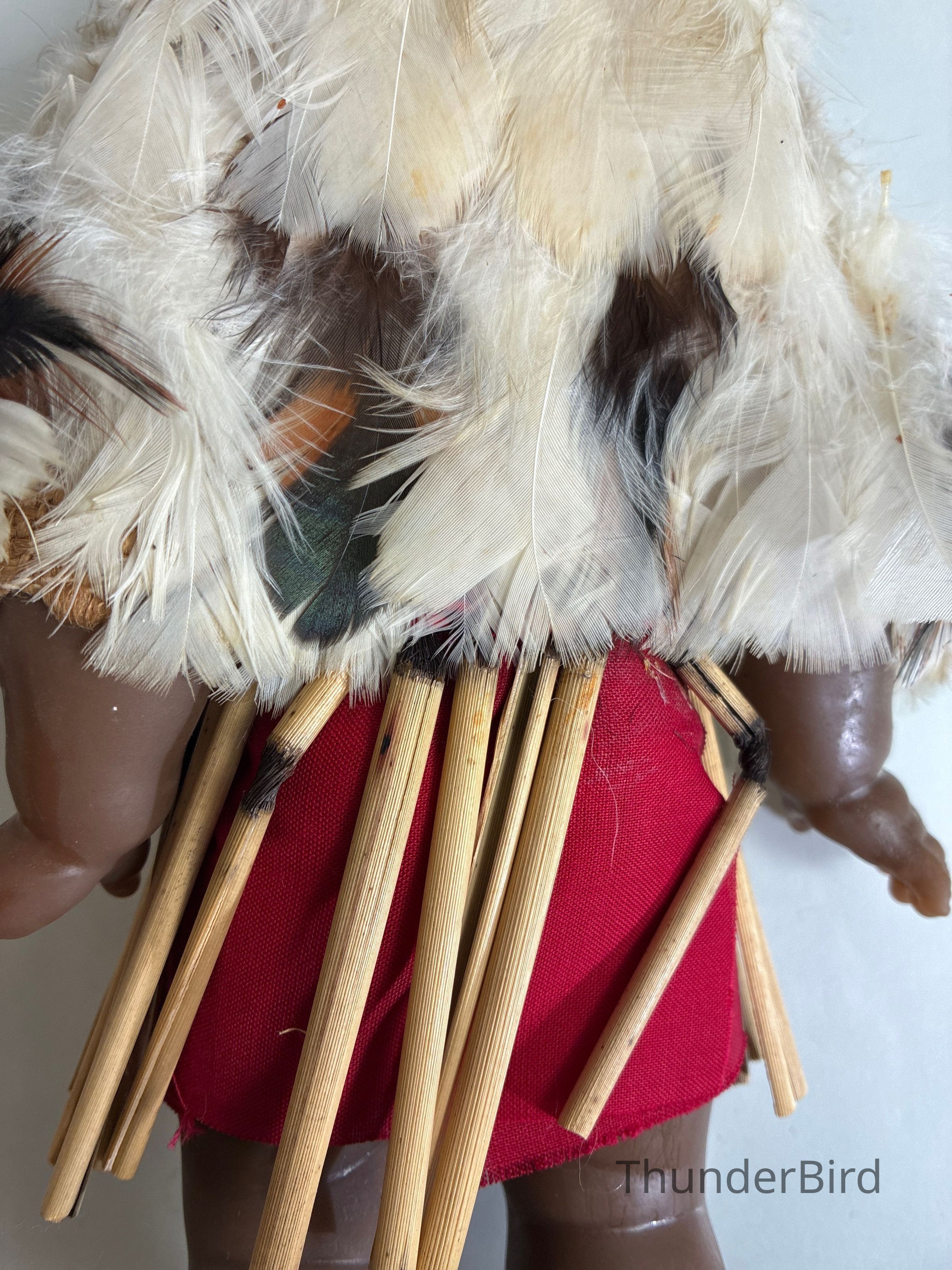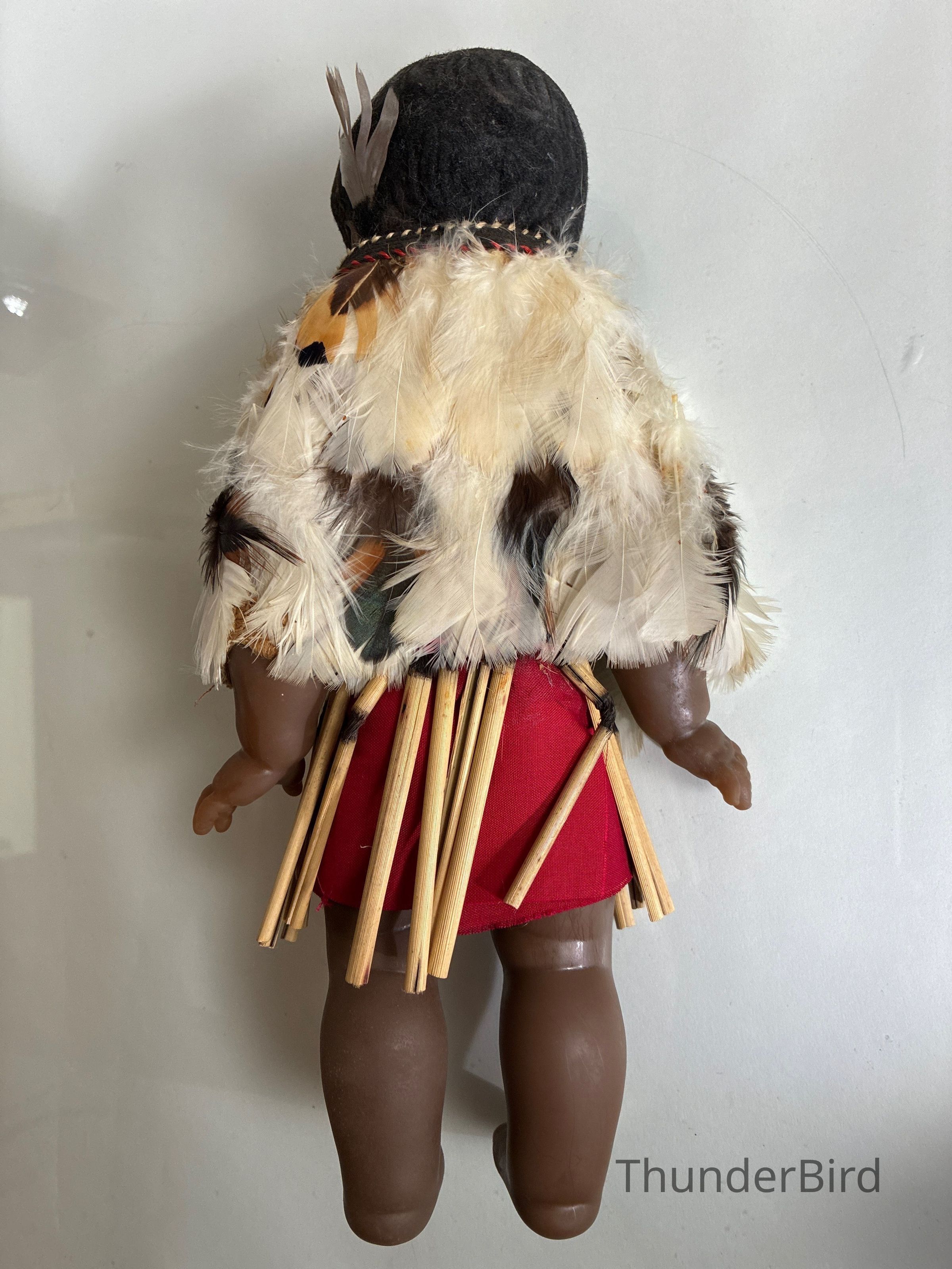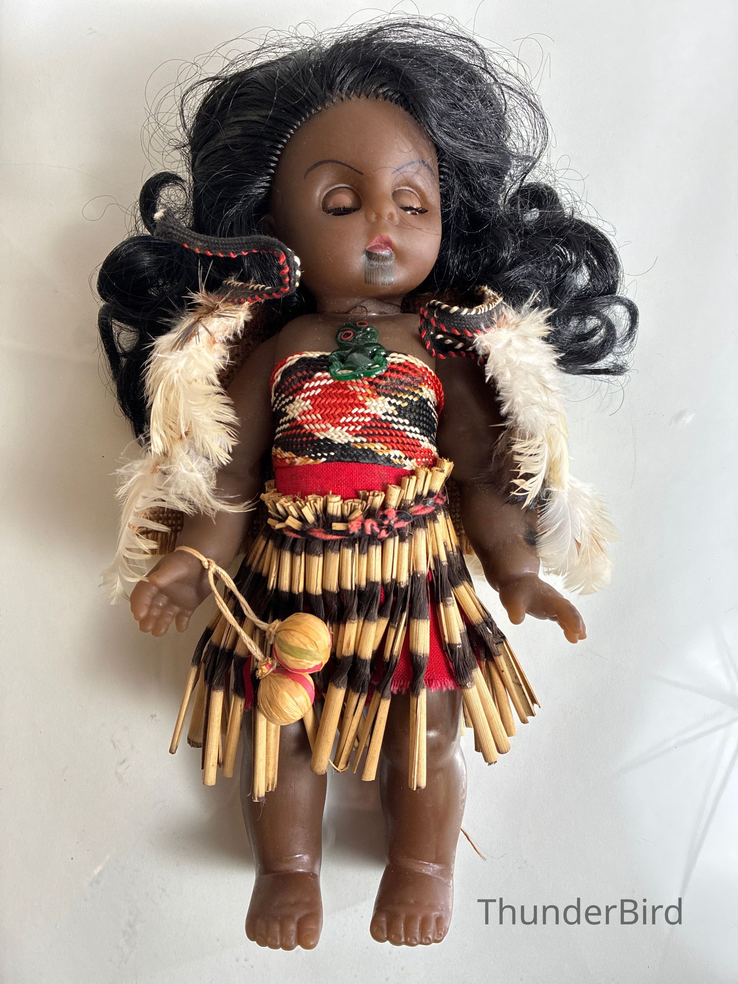 Good vintage condition overall. Both dolls show minor signs of age-related wear. Hair is intact and clothing is well-preserved with original detailing, though slight fraying to fabric edges is noted. Facial paintwork, especially moko and lips, remains clear. Please refer closely to photos for condition specifics.
