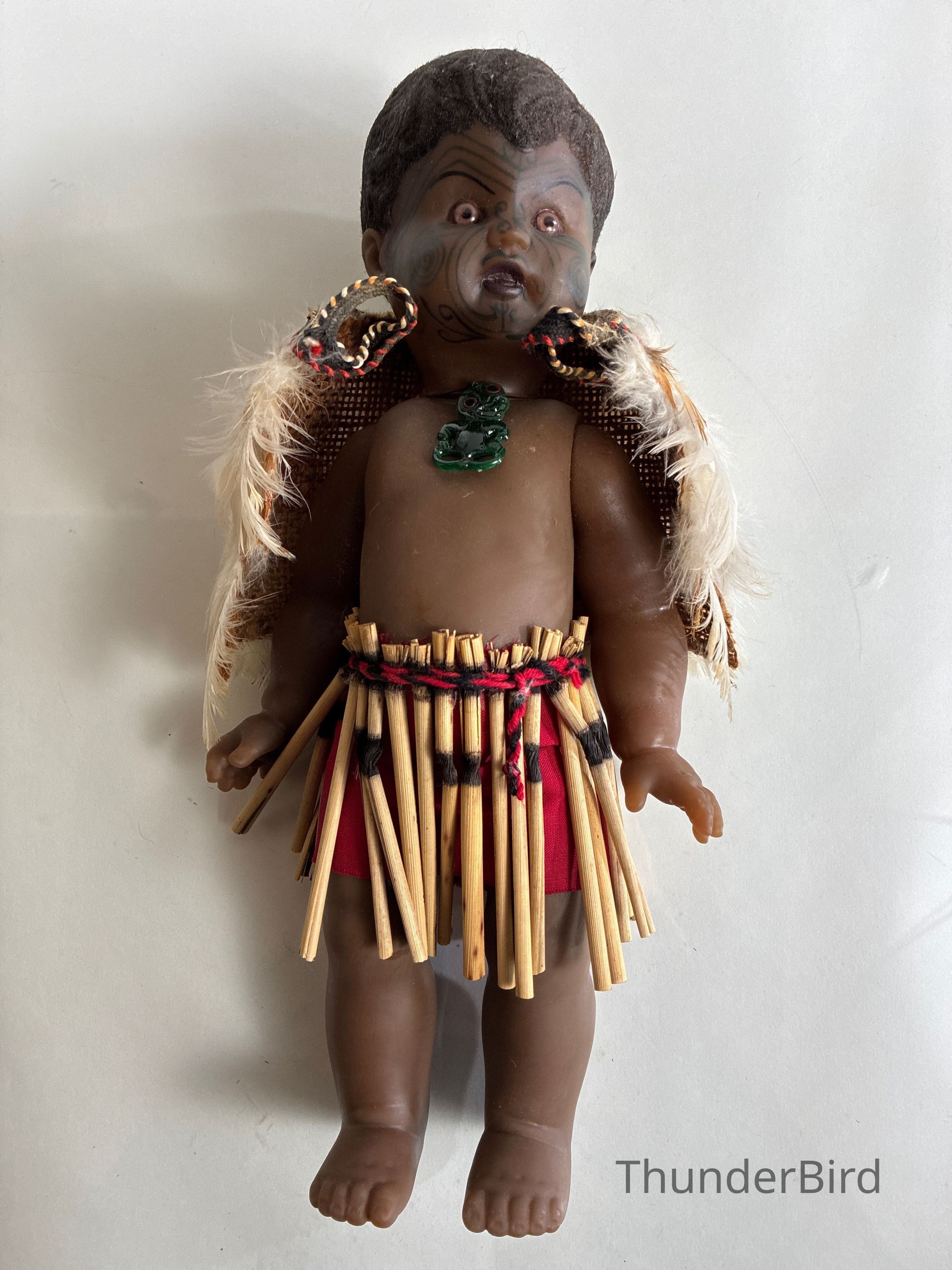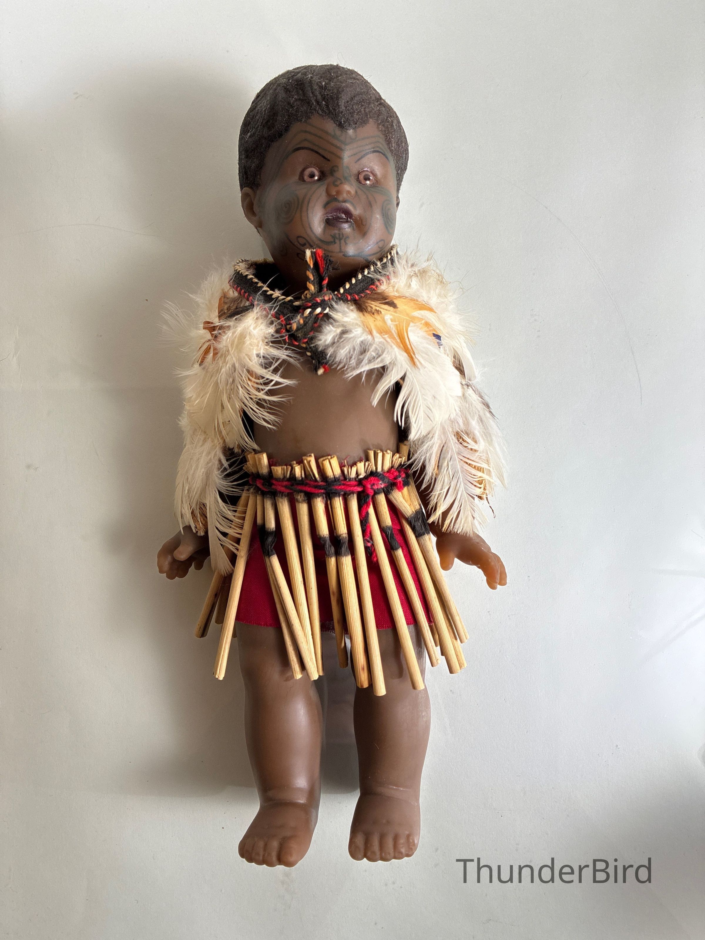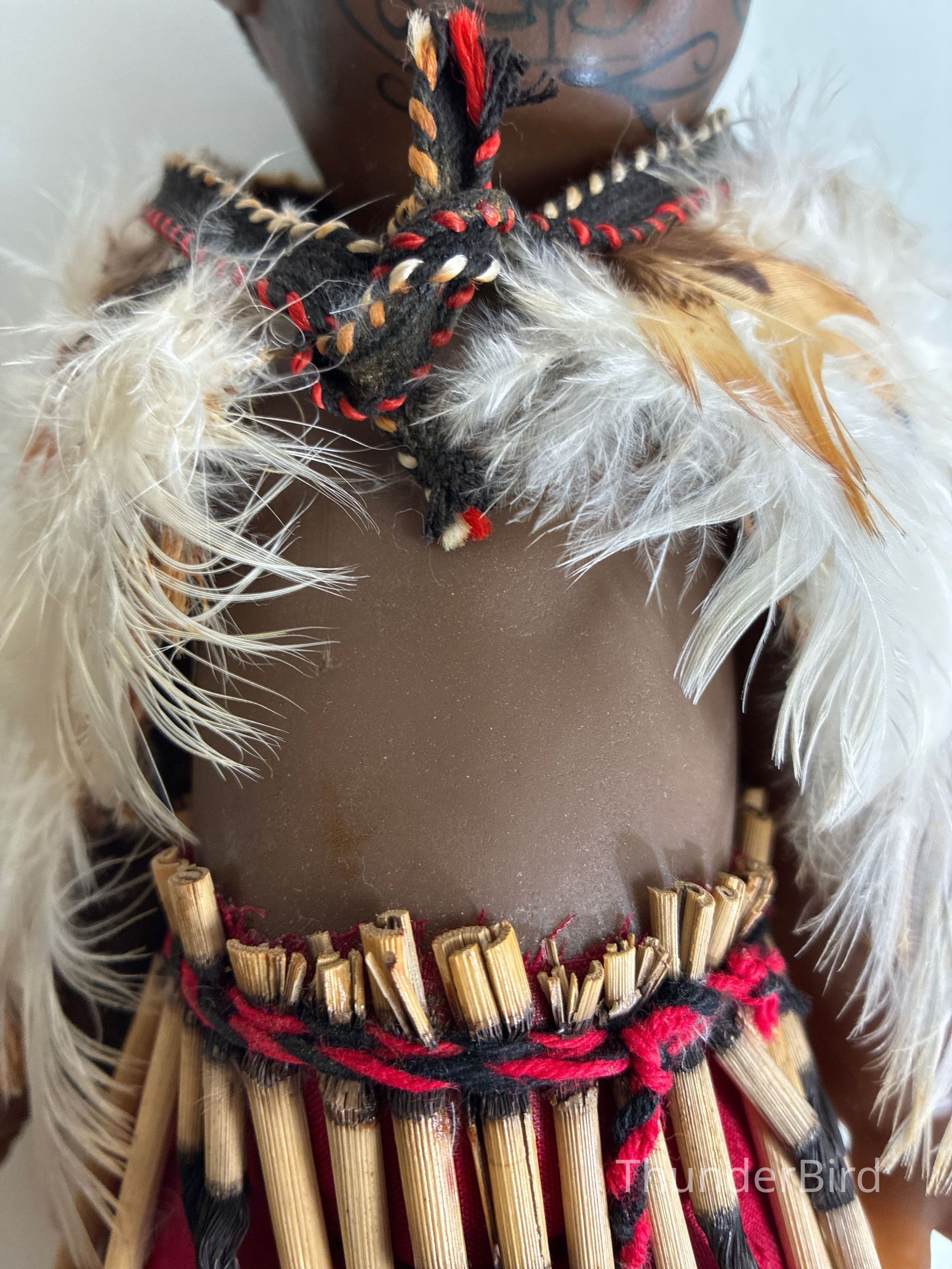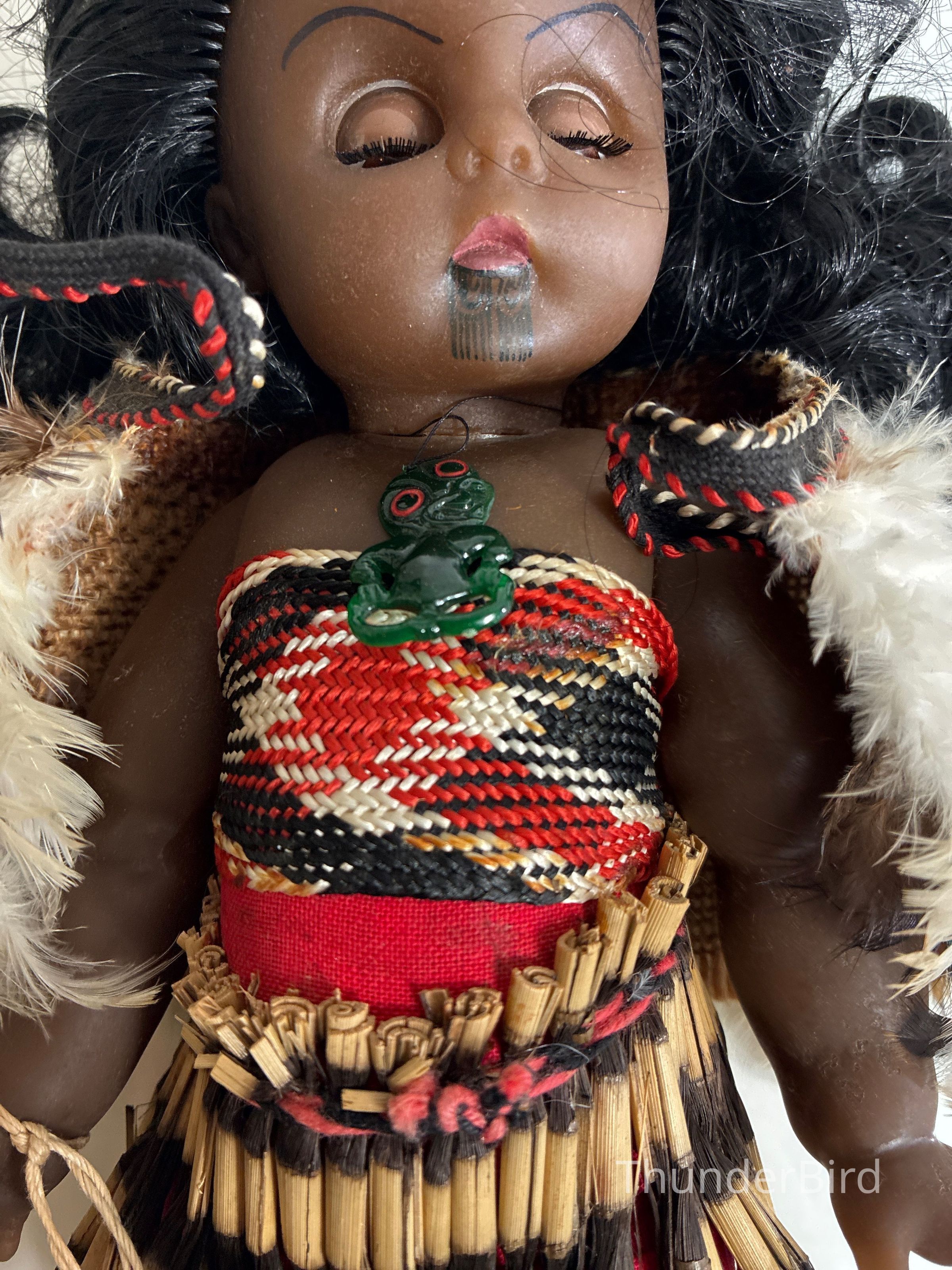 A matched pair of mid-20th-century Maori dolls dressed in traditional kapa haka attire. These collectible dolls [the male being extremely rare] feature intricately detailed feather cloaks (kakahu), woven bodices, flax piupiu skirts, and traditional accessories, including the female doll’s poi and both figures’ hei tiki-style pendants. They both have male facial moko (tattoo) markings, and the female has sleep eyes. These were likely made for the tourist market or as cultural display pieces during a time of growing international interest in Maori heritage and craftsmanship.