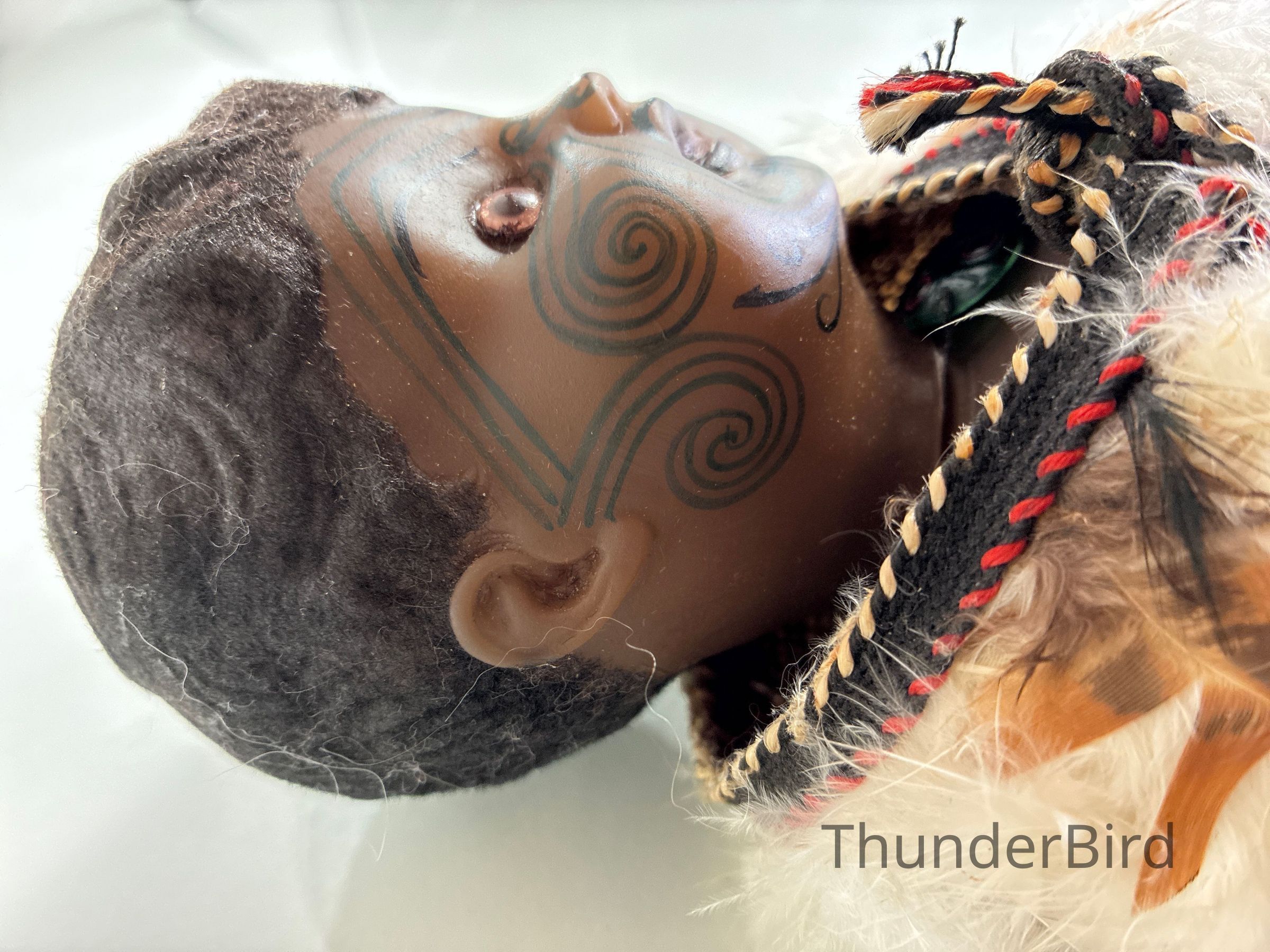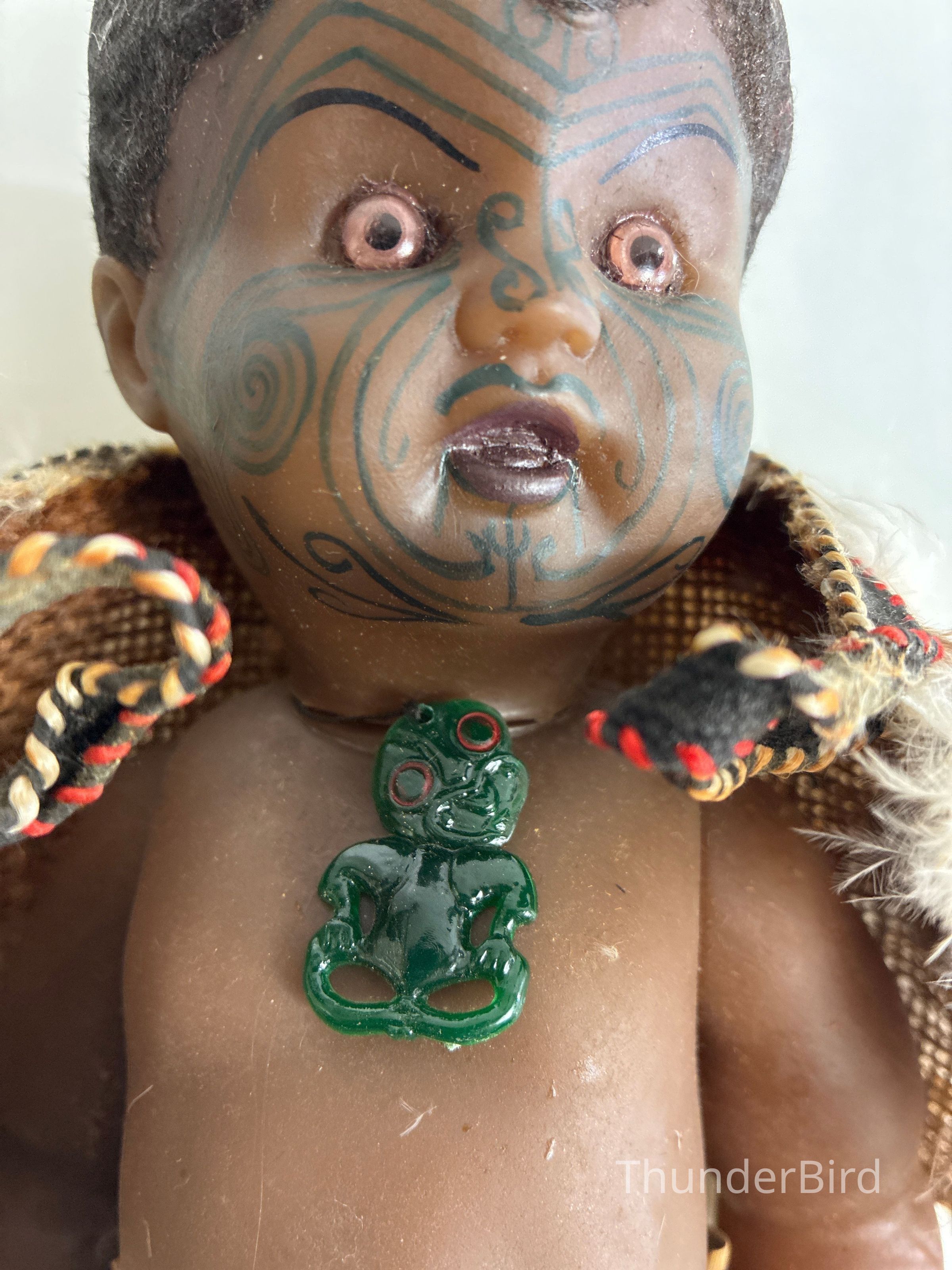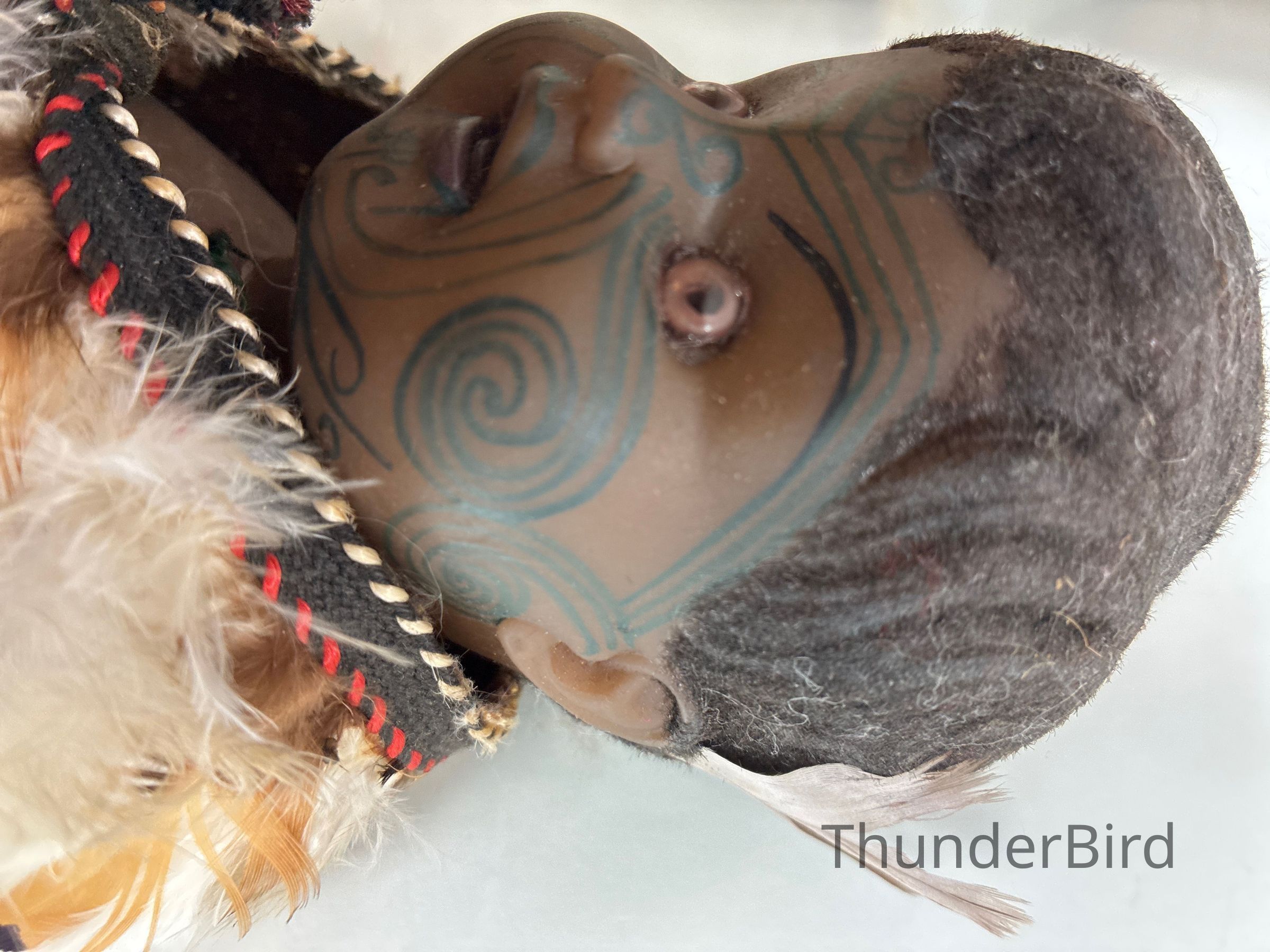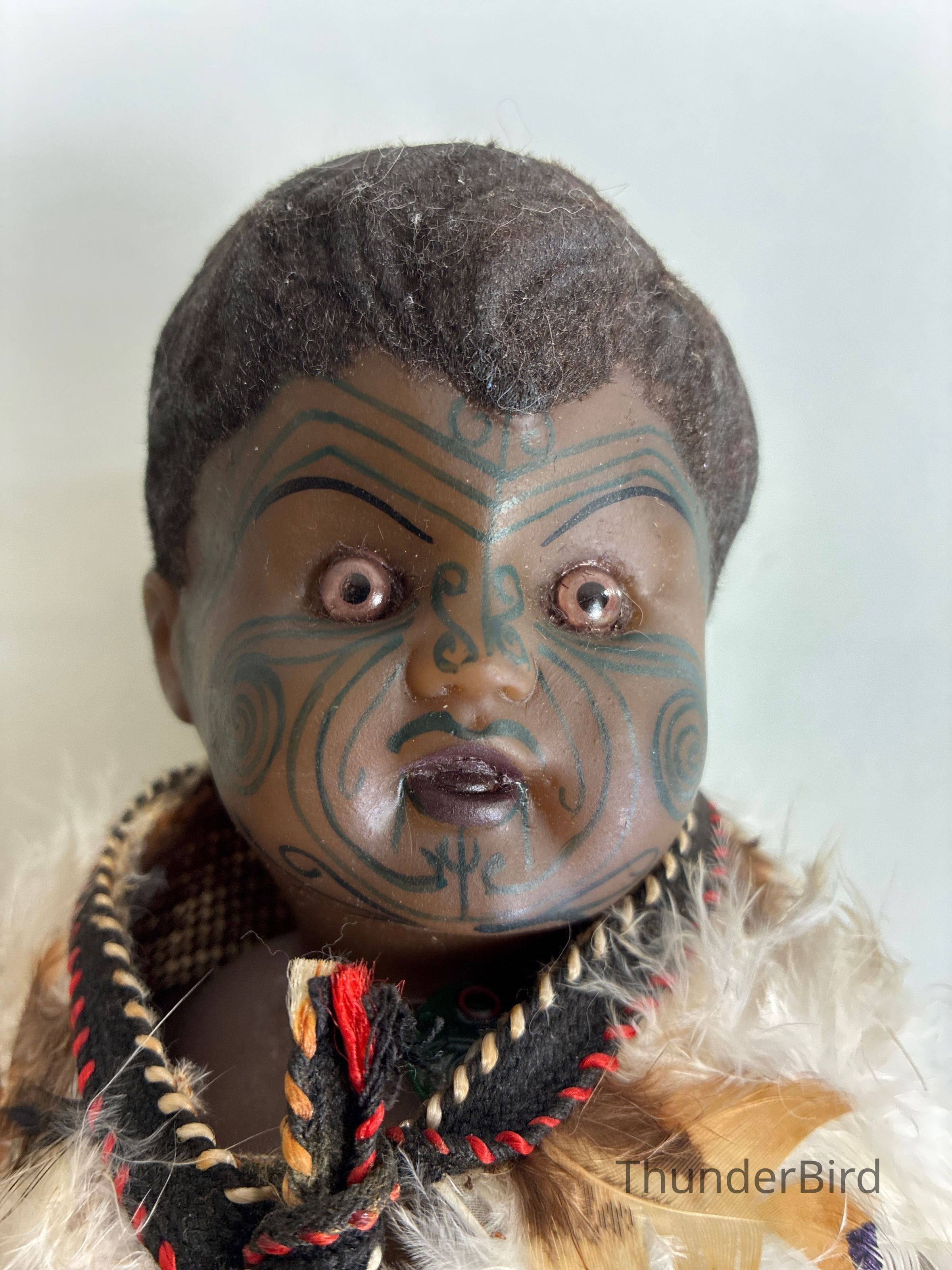 A matched pair of mid-20th-century Maori dolls dressed in traditional kapa haka attire. These collectible dolls [the male being extremely rare] feature intricately detailed feather cloaks (kakahu), woven bodices, flax piupiu skirts, and traditional accessories, including the female doll’s poi and both figures’ hei tiki-style pendants. They both have male facial moko (tattoo) markings, and the female has sleep eyes. These were likely made for the tourist market or as cultural display pieces during a time of growing international interest in Maori heritage and craftsmanship.