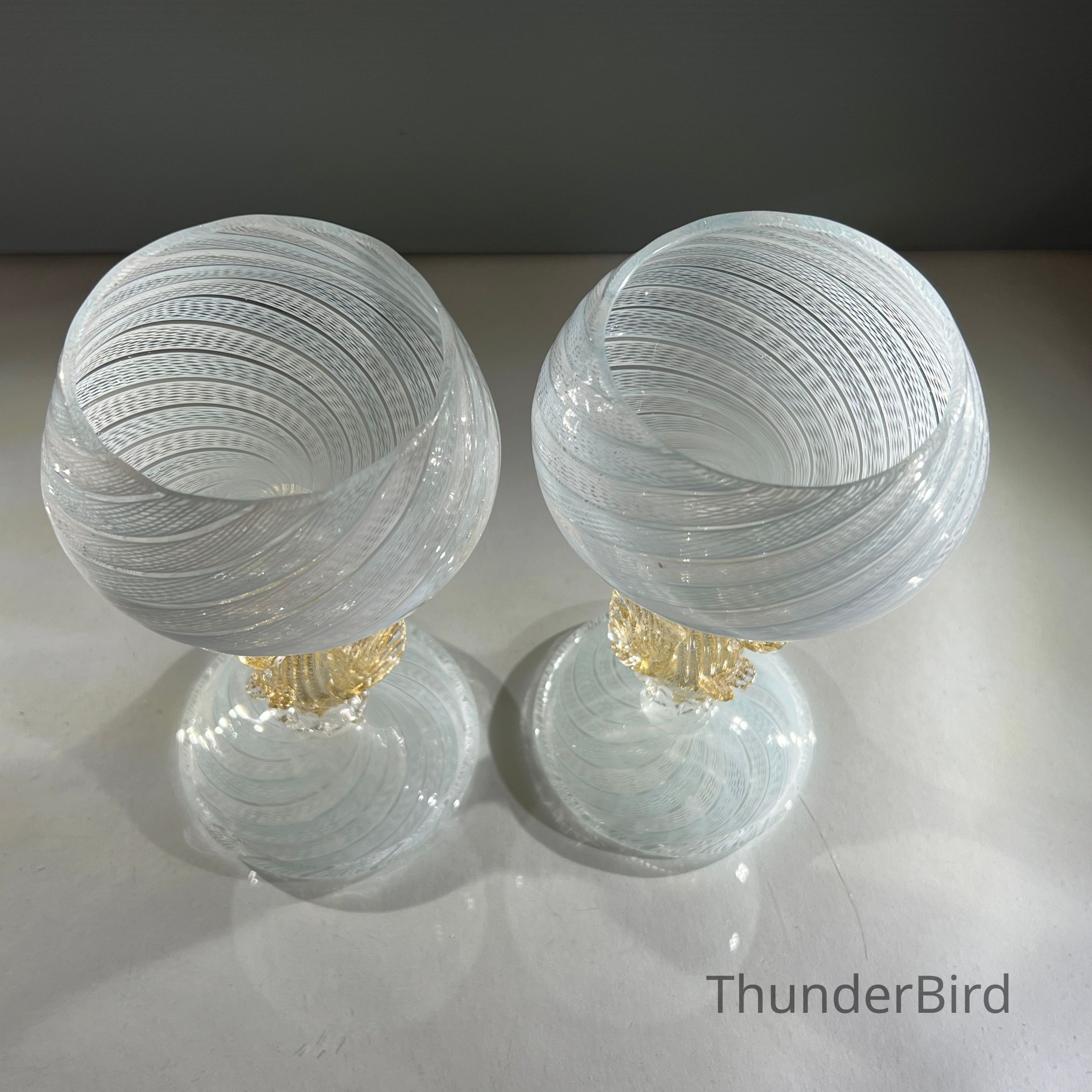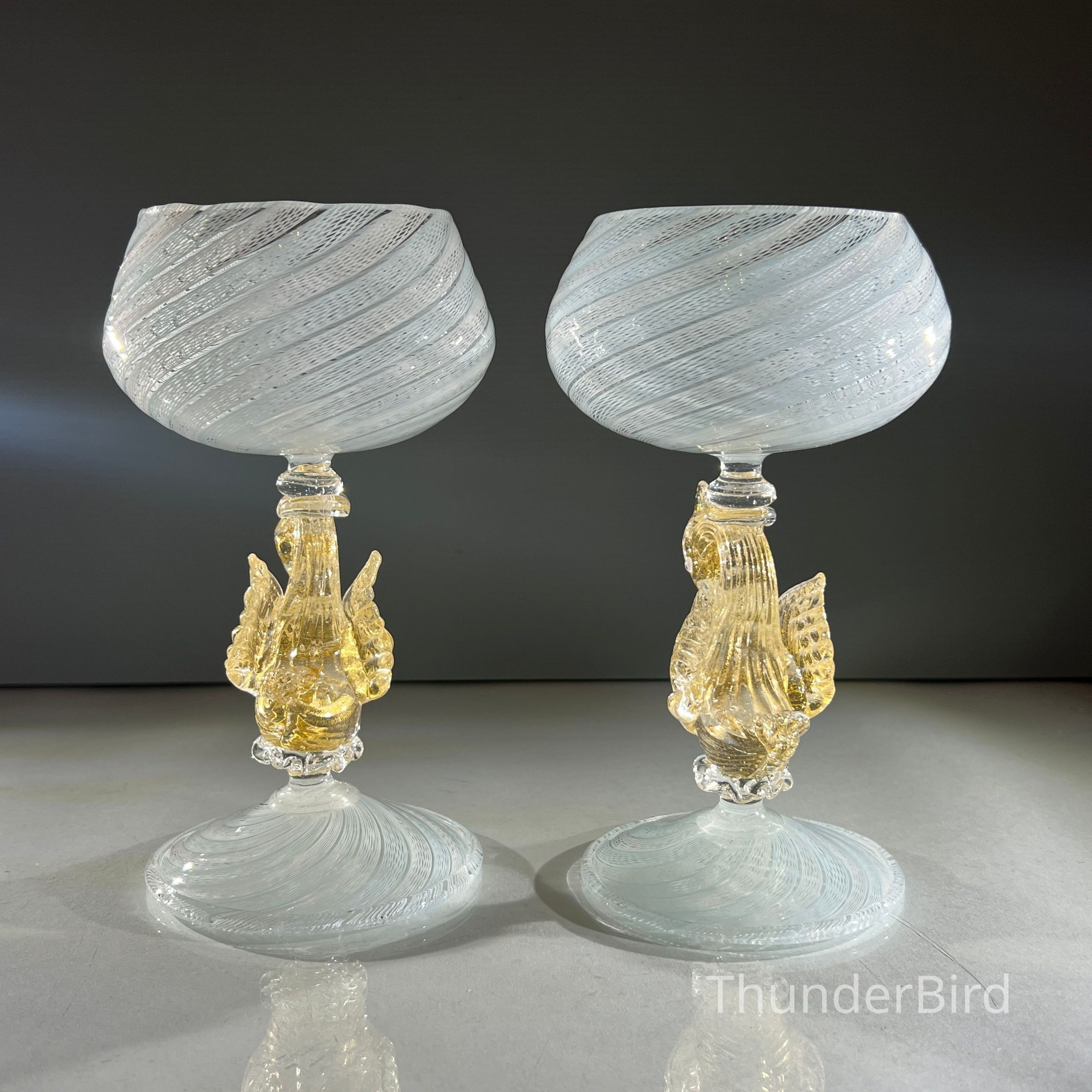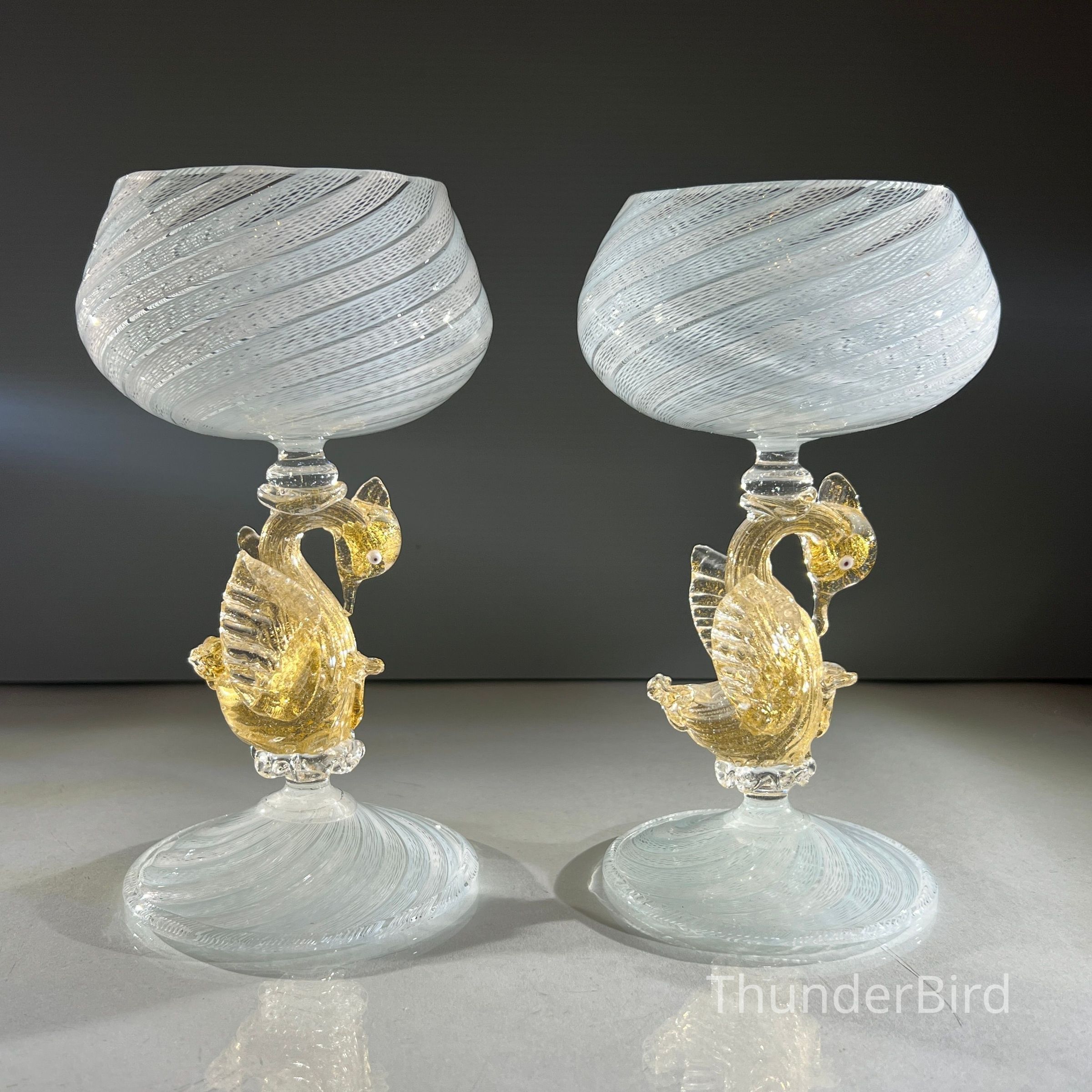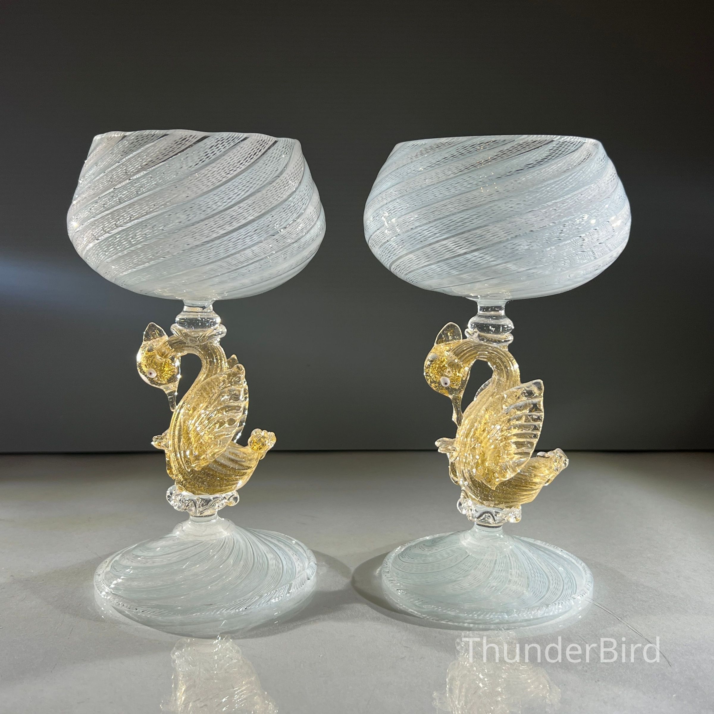 A very special vintage pair of Italian Murano art glass wine goblets featuring sculptural swan form stems enriched with gold. The generously proportioned bowls are crafted using Garza filigrana cane work, a fine gauze like lattice technique, in white with pale blue tones arranged in an elegant spiral. Each stem is individually hand formed with applied wings, curved neck and detailed eyes, demonstrating the skilled hot worked glass techniques of mid century Murano. With their rounded bowl shape and open rim by period standards, these were intended as true wine goblets, suitable for white wines, rosé and lighter reds, as well as traditional European table wines. Dating to circa 1950s to 1960s, they would originally have formed part of a larger matched set and remain both functional and highly decorative. [I am listing 2 pairs of these goblets].